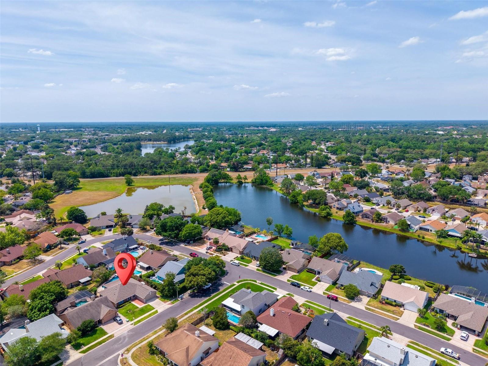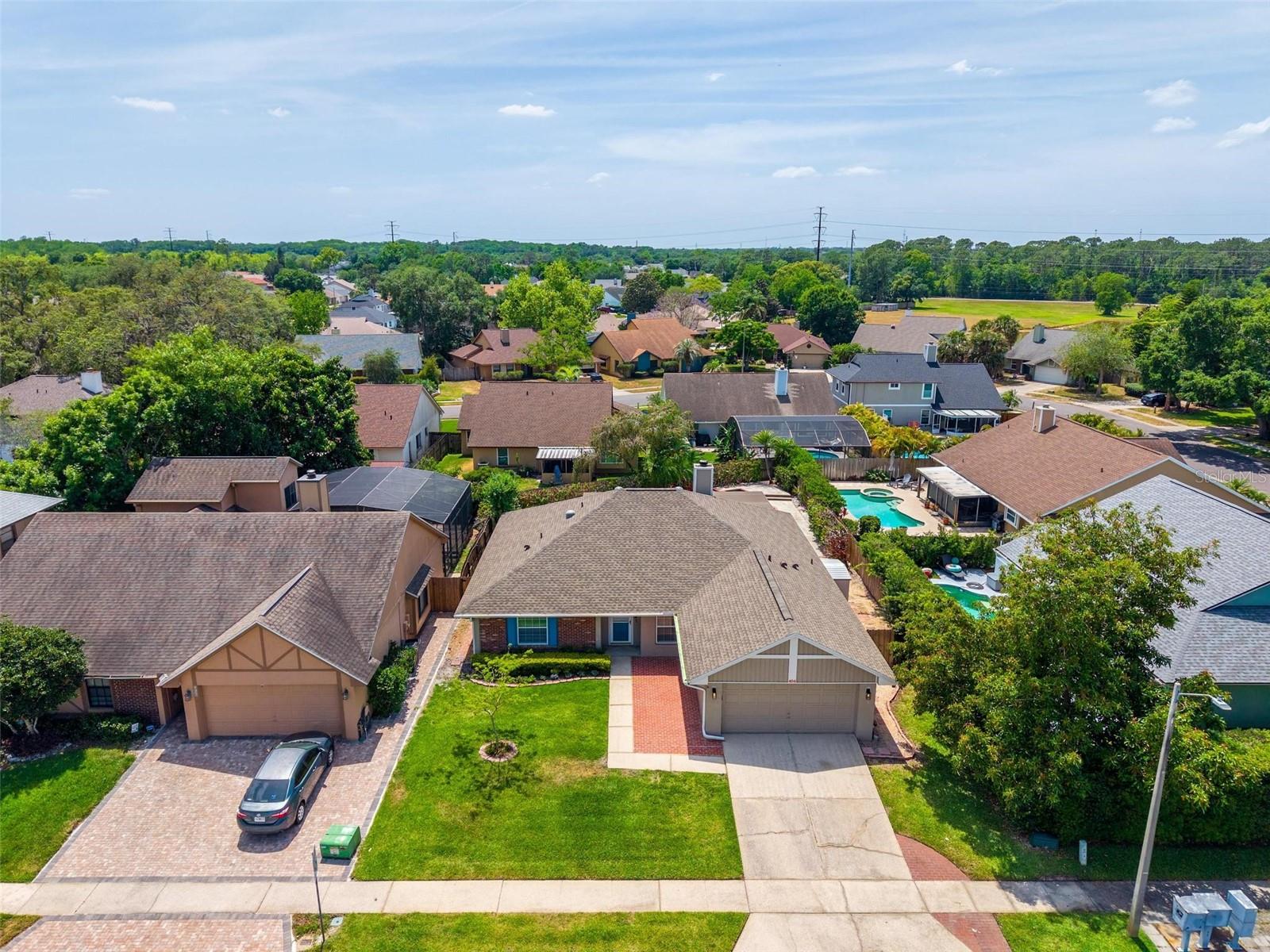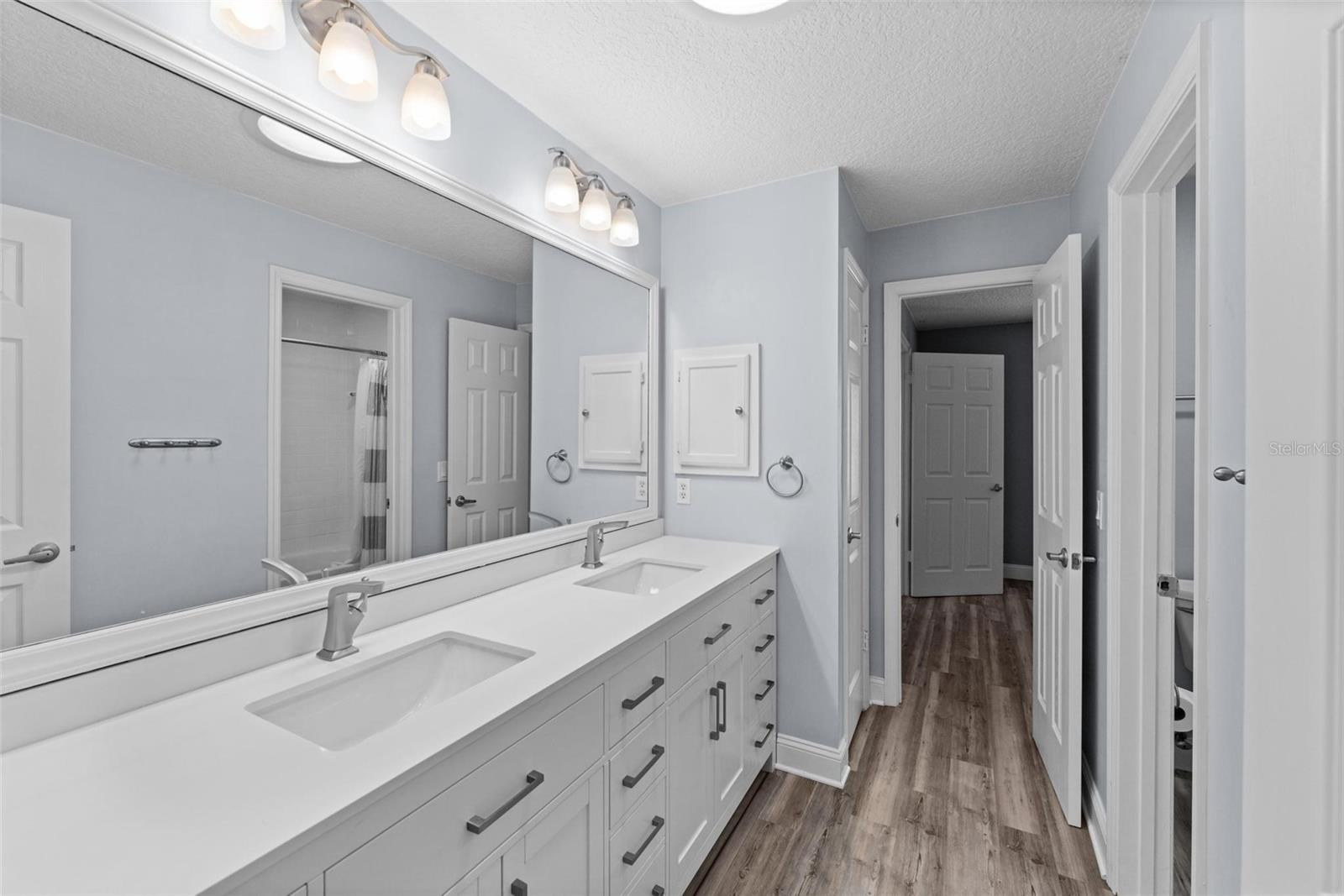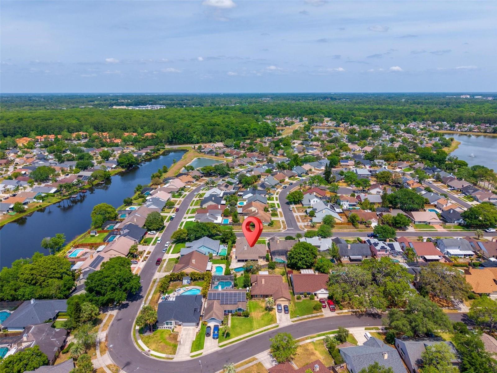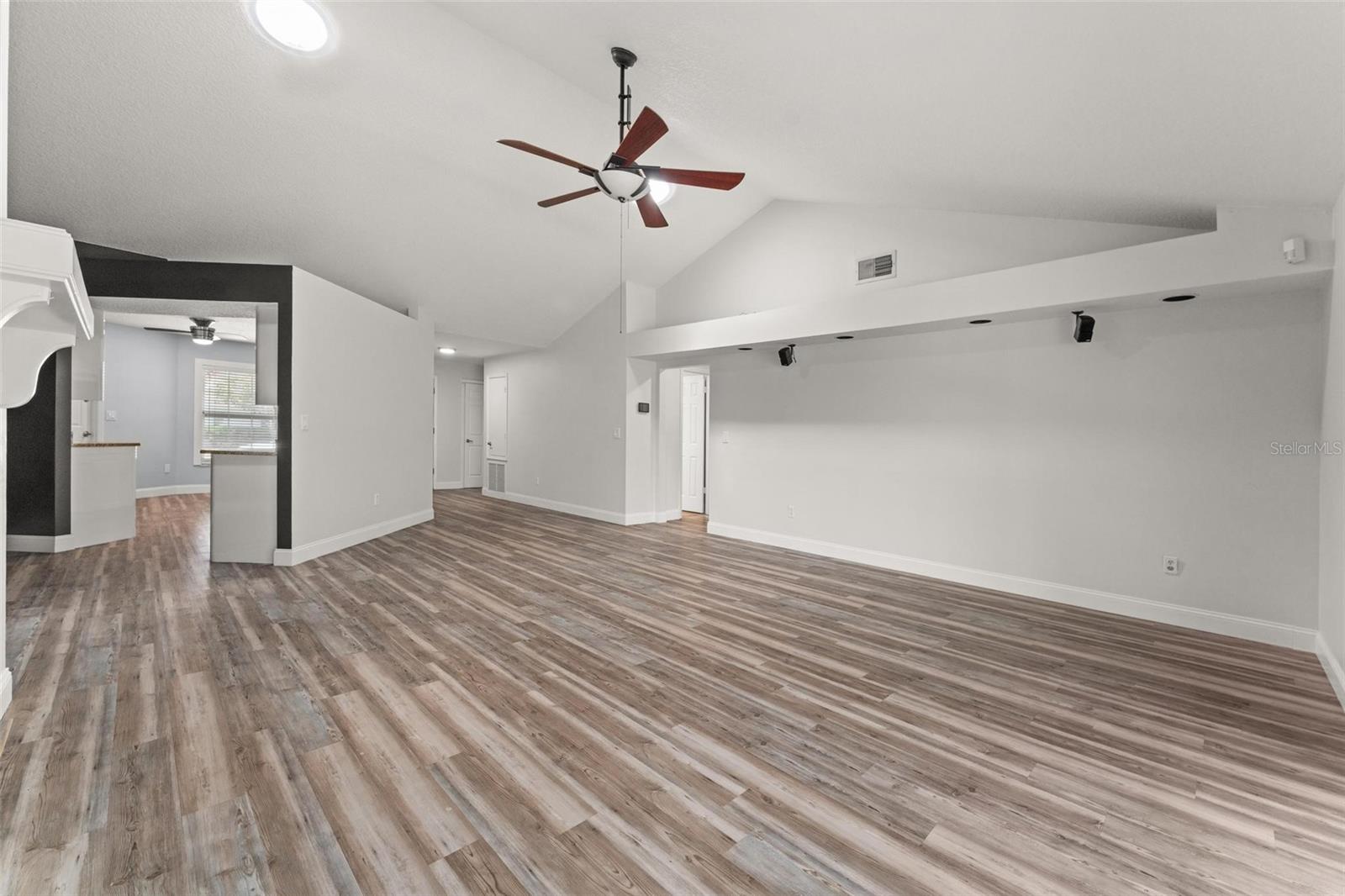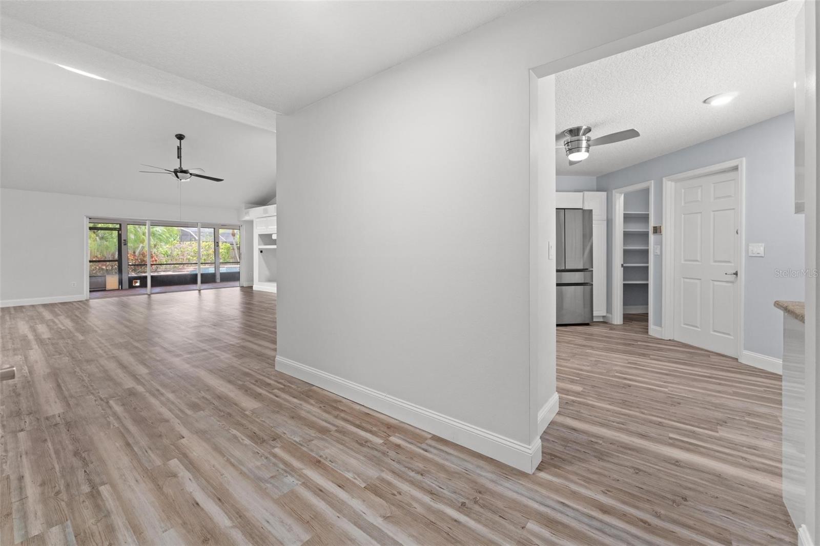 One or more photo(s) has been virtually staged. Nestled in the desirable Lakewood at the Crossings community, this meticulously maintained 4-bedroom, 2-bathroom pool home offers a serene retreat with modern amenities. The home features a split floor plan, providing privacy and comfort for all residents. The expansive living room boasts high ceilings, a wood-burning fireplace, and built-in surround sound, creating an inviting atmosphere. Sliding doors lead to an enclosed patio that overlooks a lush, tropical pool area, perfect for relaxation and entertaining. The spacious primary suite features French doors that open to the enclosed patio, offering pool views. The ensuite bathroom is a spa-like haven, complete with an upgraded double vanity with granite counters, modern lighting, and faucets. Two separate step-in closets provide generous storage, and the updated step-in shower includes a rain shower head and multiple shower options for a luxurious experience. NEWER ROOF (April 2022) HVAC (2015) with newer compressor, blower & A frame coil (2017), Water softener (2019), Exterior paint Sherwin Williams (2017), Dual Pane Low E windows (2006). Conveniently located just minutes from top rated schools,