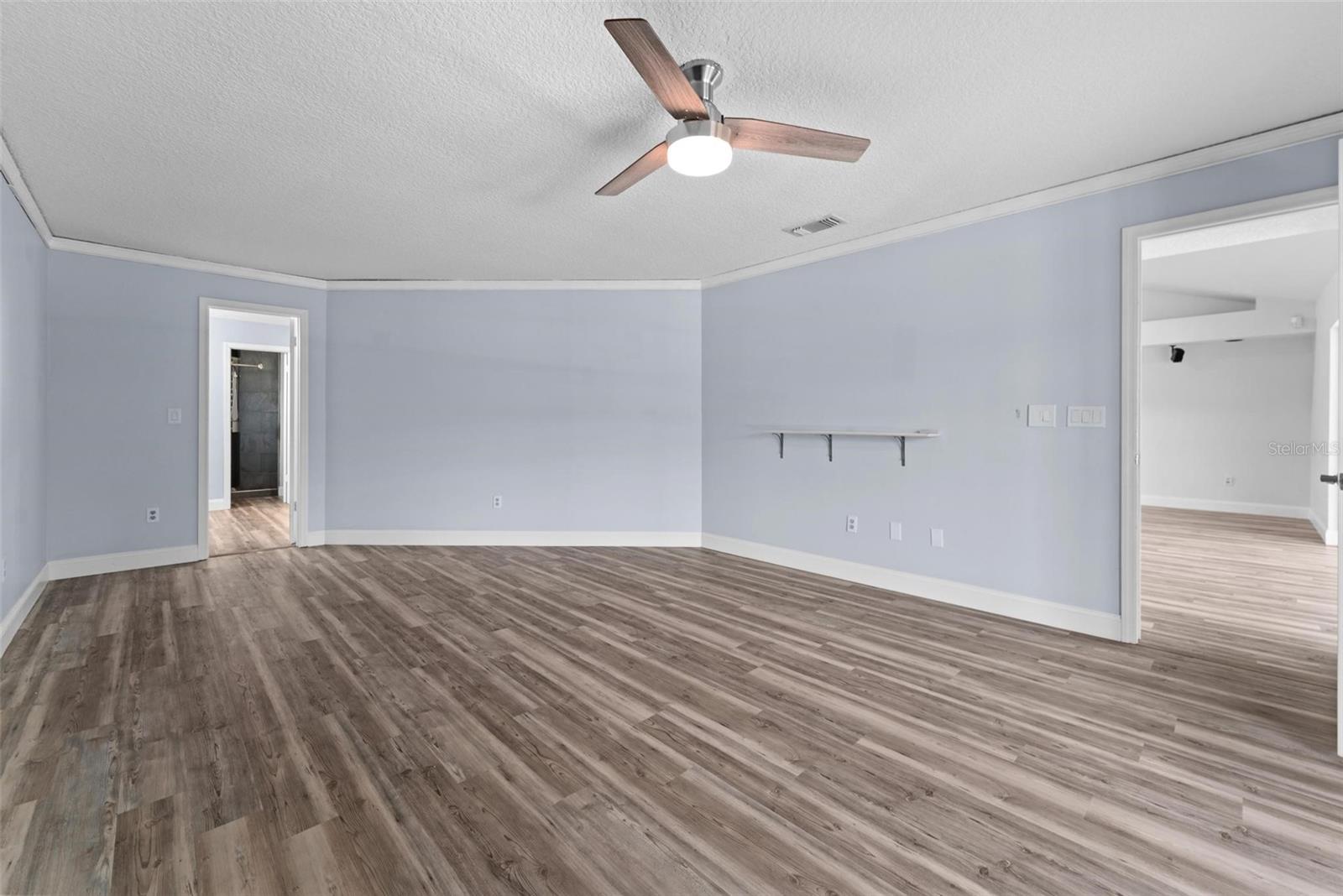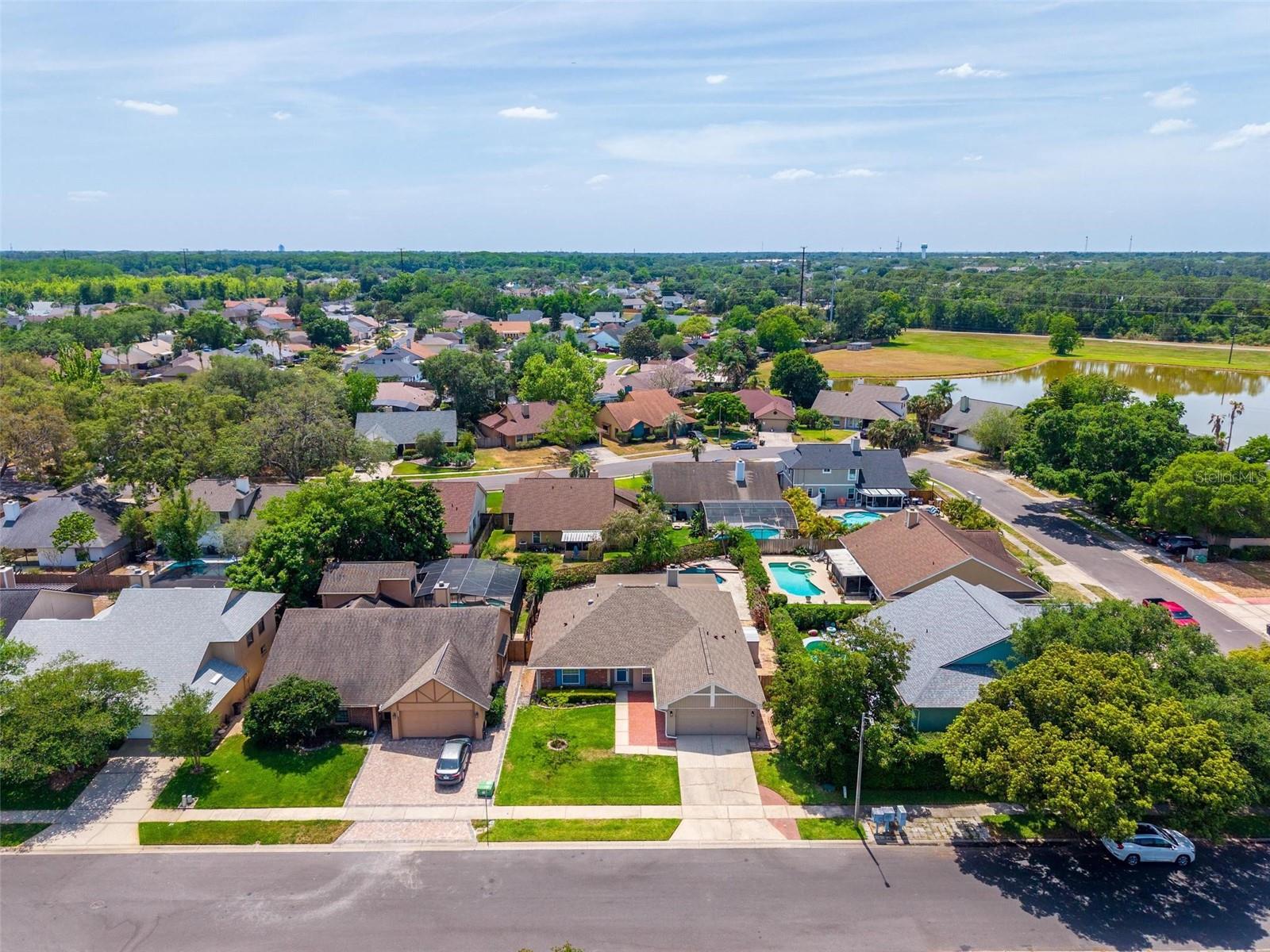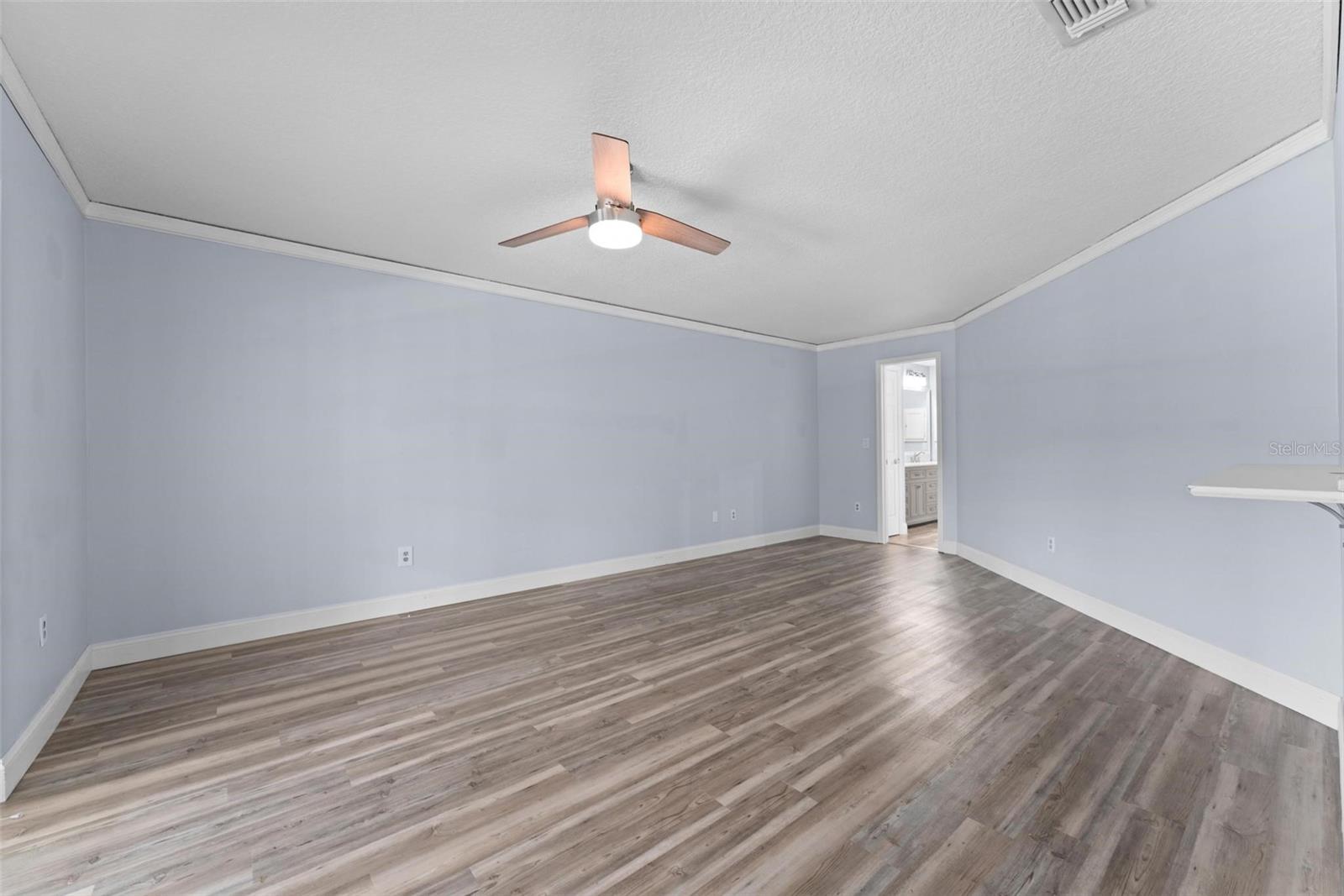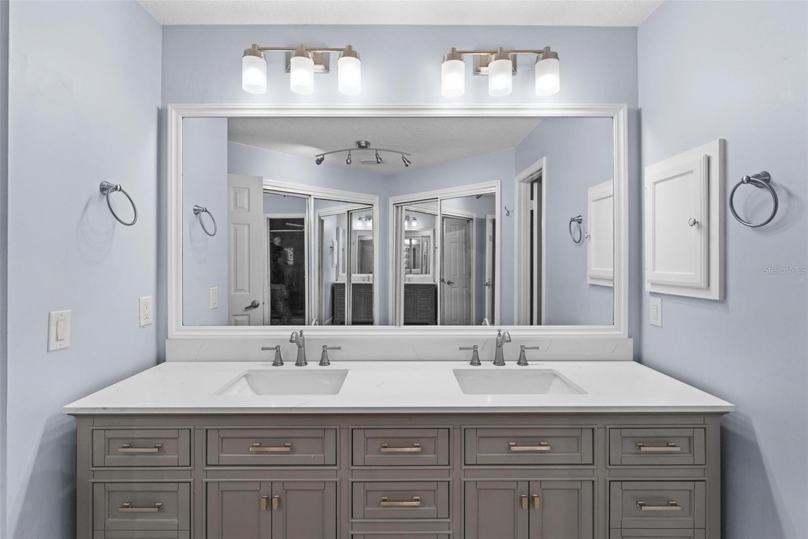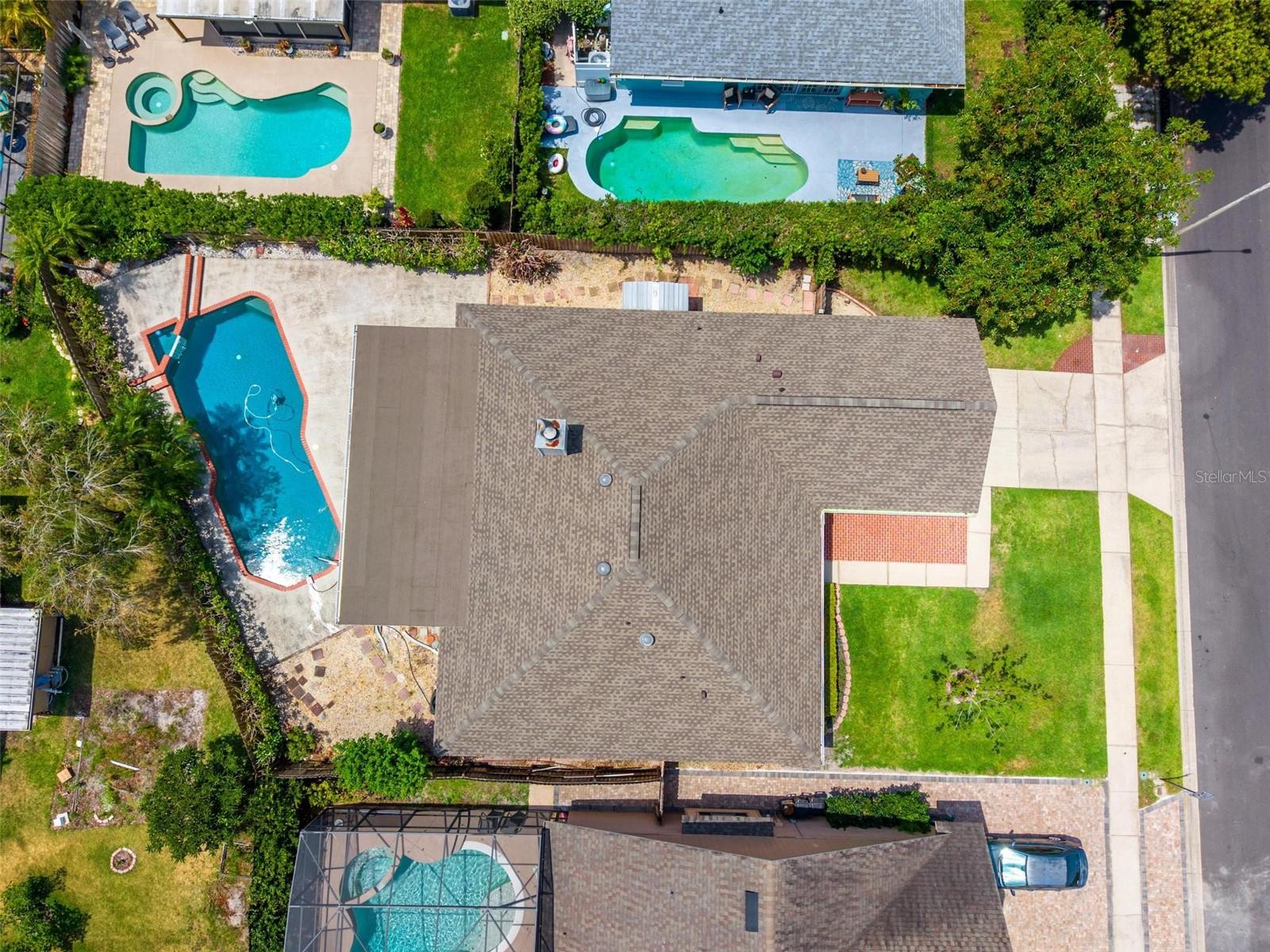 One or more photo(s) has been virtually staged. Nestled in the desirable Lakewood at the Crossings community, this meticulously maintained 4-bedroom, 2-bathroom pool home offers a serene retreat with modern amenities. The home features a split floor plan, providing privacy and comfort for all residents. The expansive living room boasts high ceilings, a wood-burning fireplace, and built-in surround sound, creating an inviting atmosphere. Sliding doors lead to an enclosed patio that overlooks a lush, tropical pool area, perfect for relaxation and entertaining. The spacious primary suite features French doors that open to the enclosed patio, offering pool views. The ensuite bathroom is a spa-like haven, complete with an upgraded double vanity with granite counters, modern lighting, and faucets. Two separate step-in closets provide generous storage, and the updated step-in shower includes a rain shower head and multiple shower options for a luxurious experience. NEWER ROOF (April 2022) HVAC (2015) with newer compressor, blower & A frame coil (2017), Water softener (2019), Exterior paint Sherwin Williams (2017), Dual Pane Low E windows (2006). Conveniently located just minutes from top rated schools,