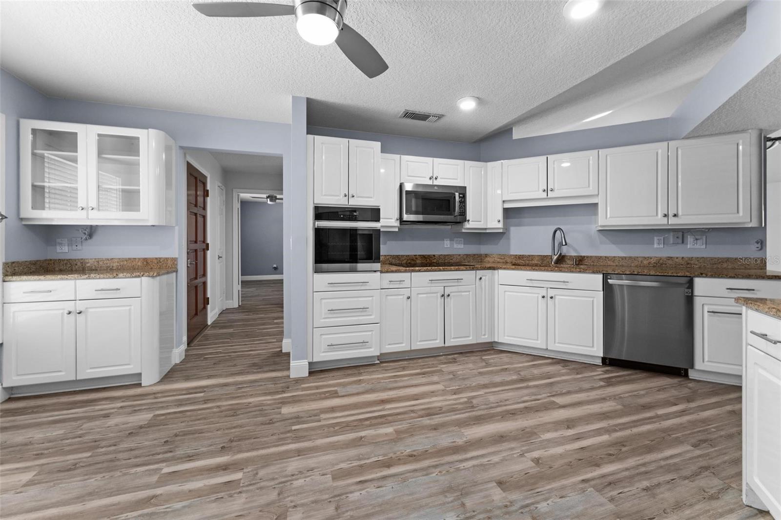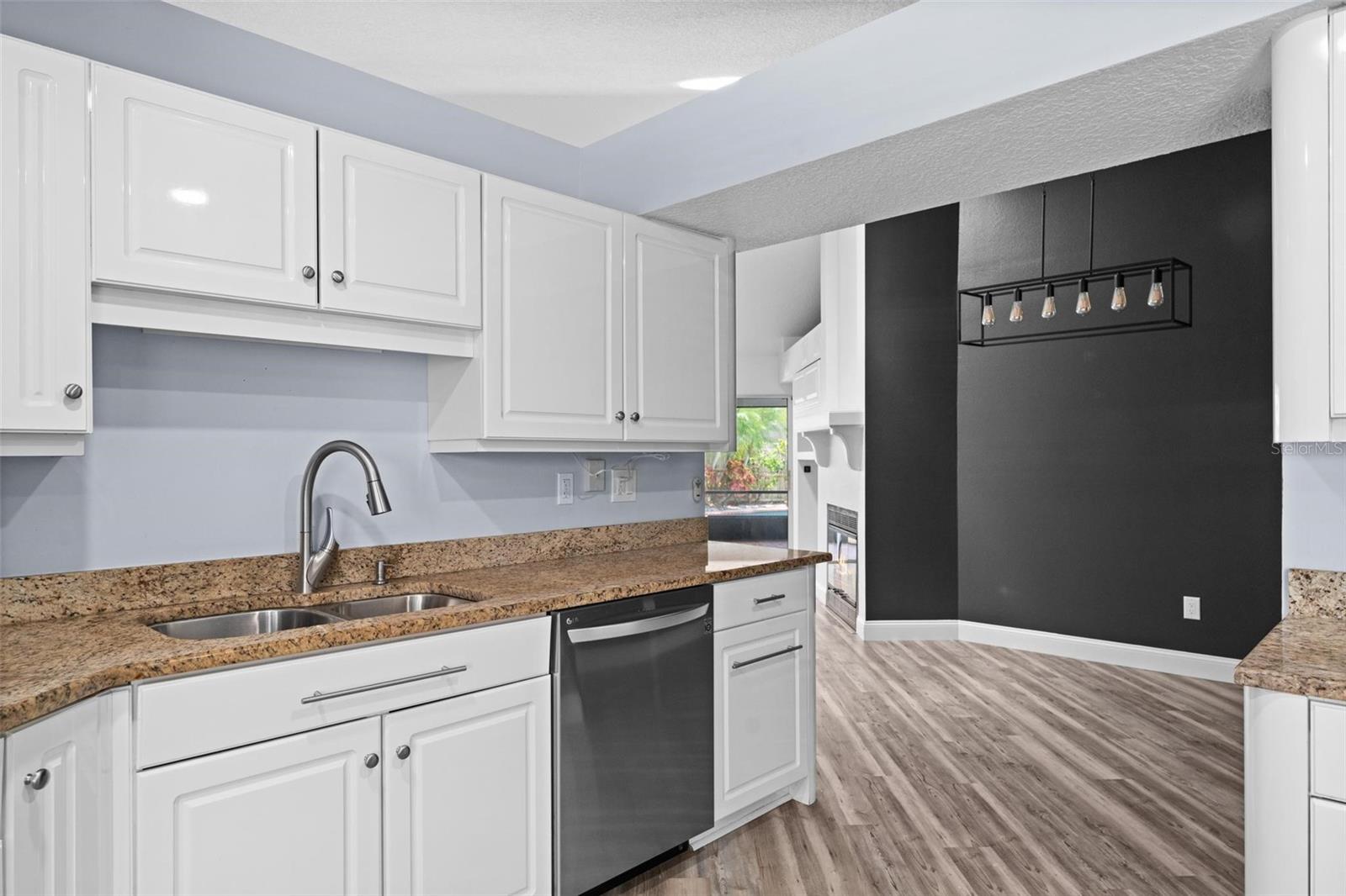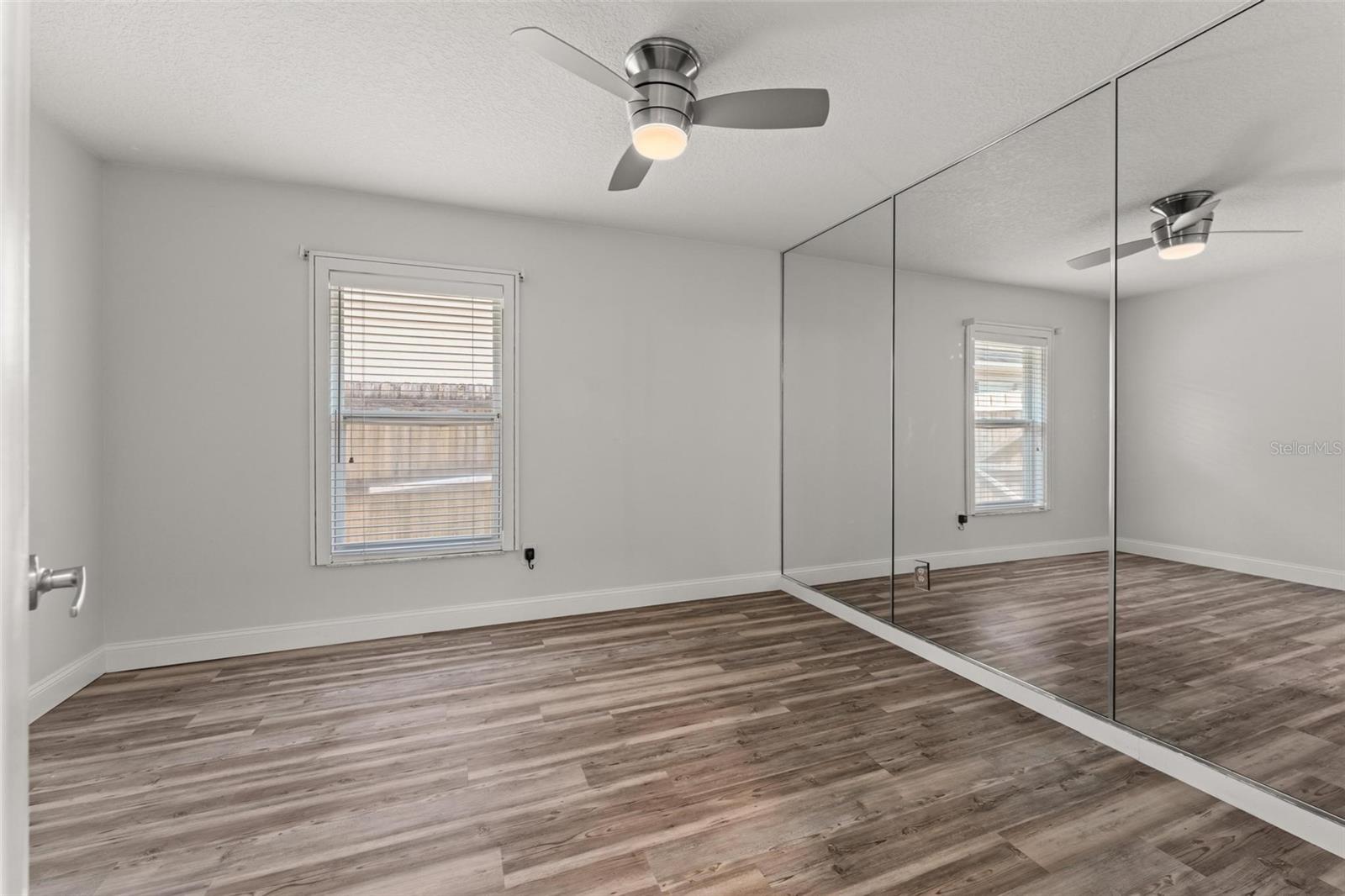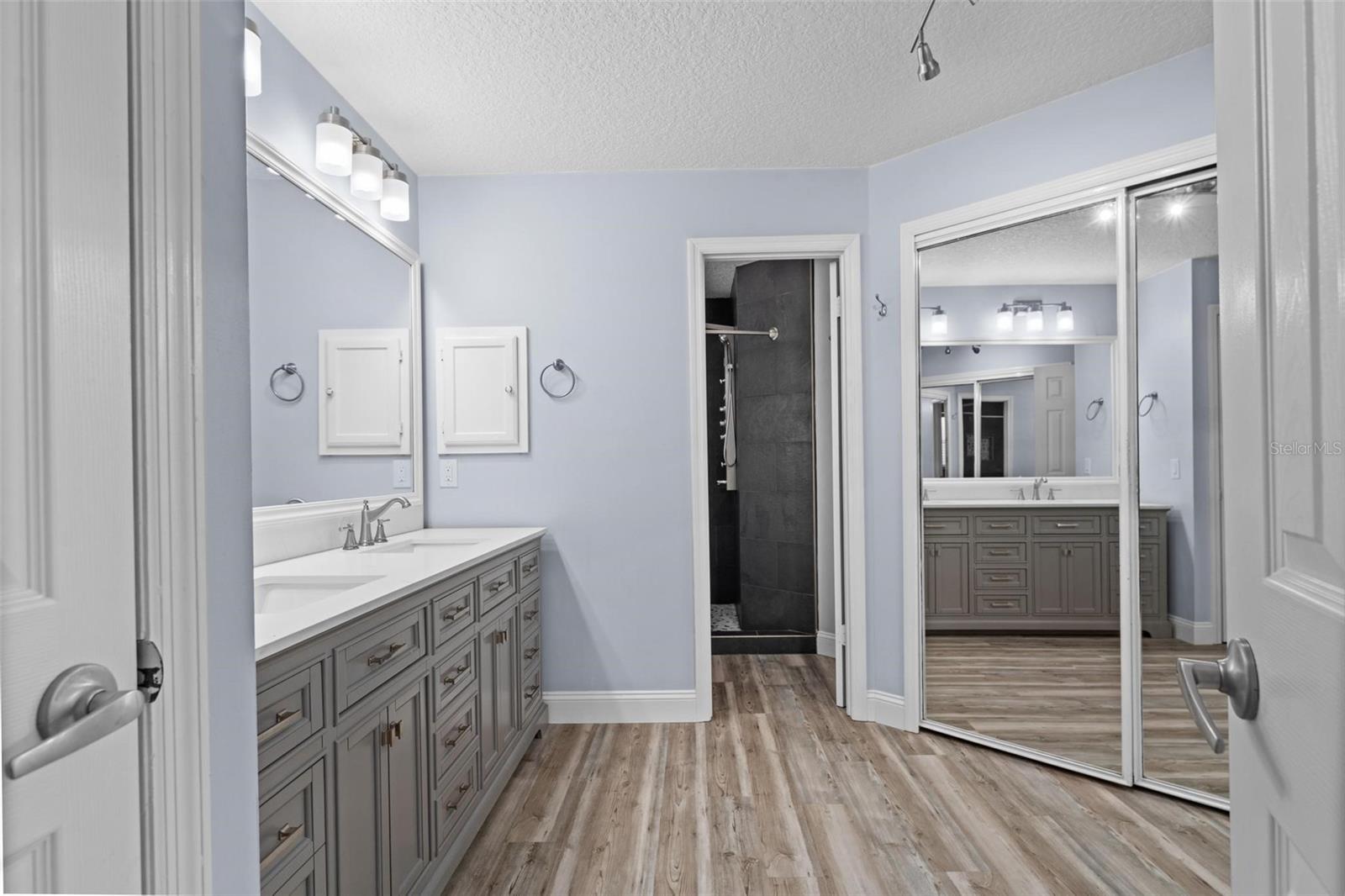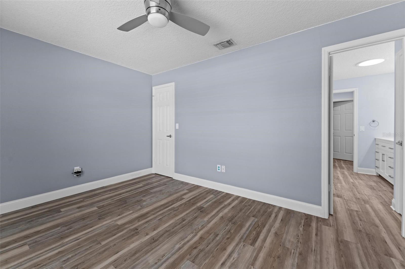 One or more photo(s) has been virtually staged. Nestled in the desirable Lakewood at the Crossings community, this meticulously maintained 4-bedroom, 2-bathroom pool home offers a serene retreat with modern amenities. The home features a split floor plan, providing privacy and comfort for all residents. The expansive living room boasts high ceilings, a wood-burning fireplace, and built-in surround sound, creating an inviting atmosphere. Sliding doors lead to an enclosed patio that overlooks a lush, tropical pool area, perfect for relaxation and entertaining. The spacious primary suite features French doors that open to the enclosed patio, offering pool views. The ensuite bathroom is a spa-like haven, complete with an upgraded double vanity with granite counters, modern lighting, and faucets. Two separate step-in closets provide generous storage, and the updated step-in shower includes a rain shower head and multiple shower options for a luxurious experience. NEWER ROOF (April 2022) HVAC (2015) with newer compressor, blower & A frame coil (2017), Water softener (2019), Exterior paint Sherwin Williams (2017), Dual Pane Low E windows (2006). Conveniently located just minutes from top rated schools,