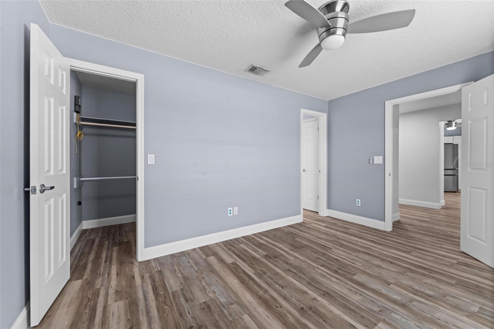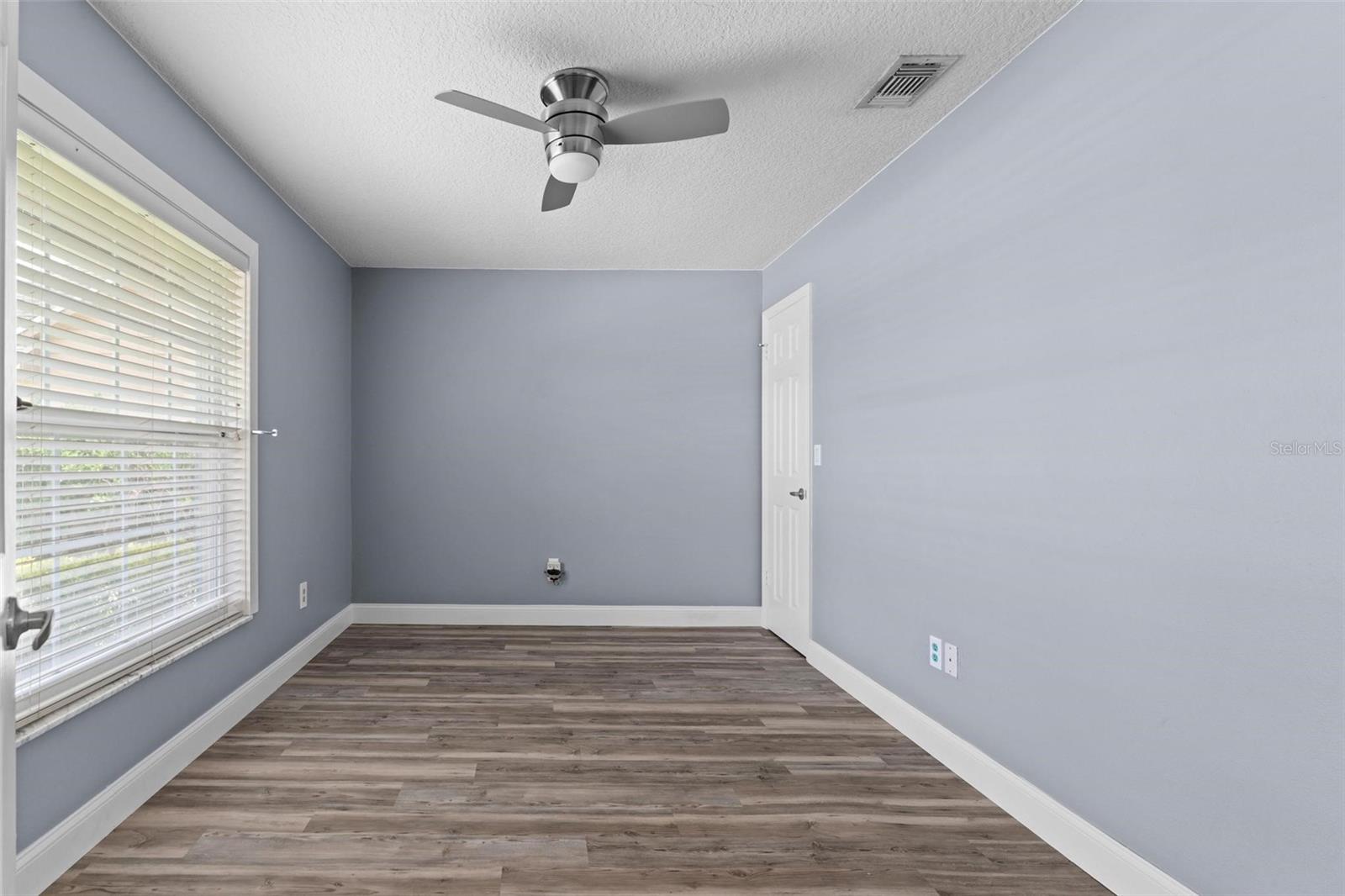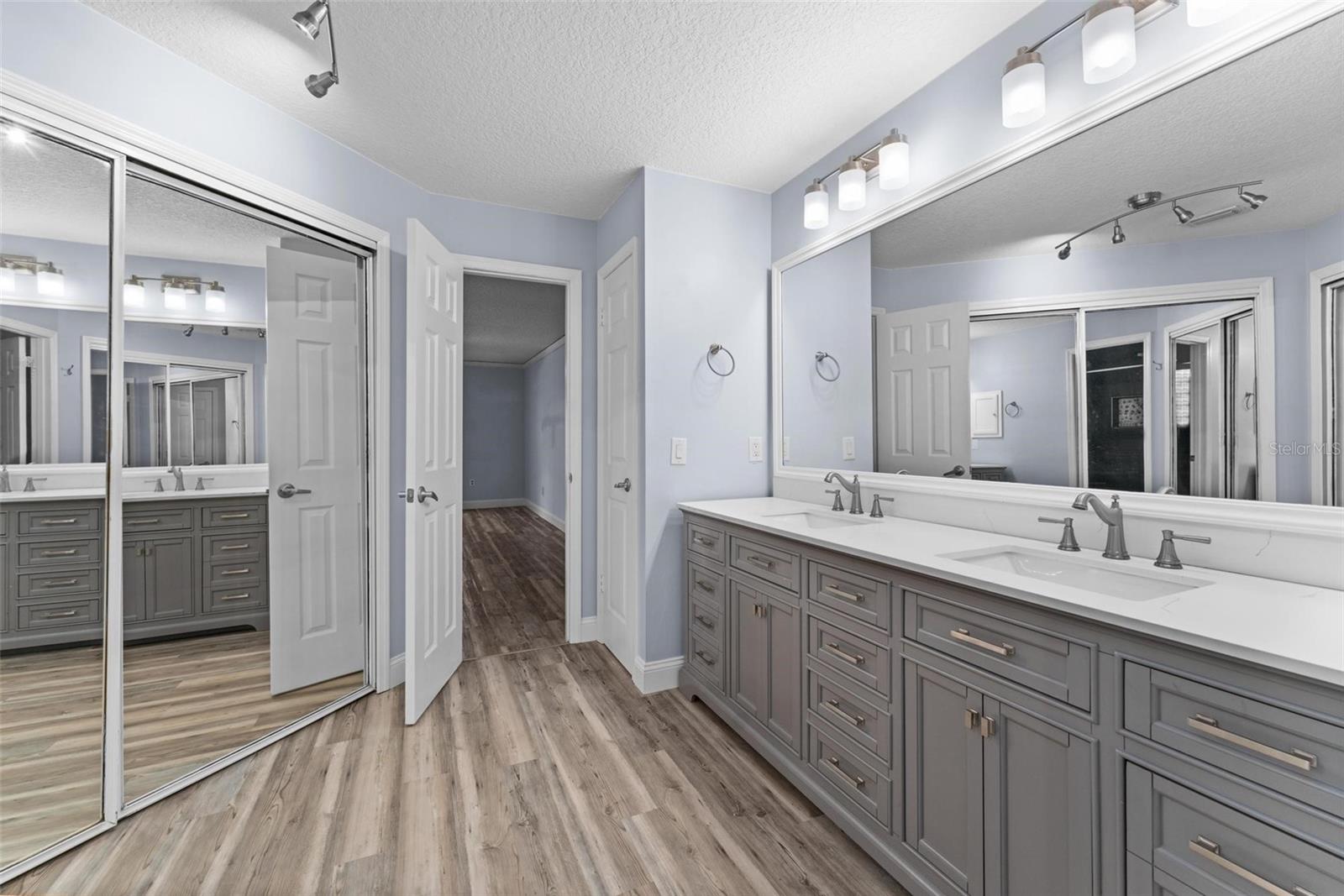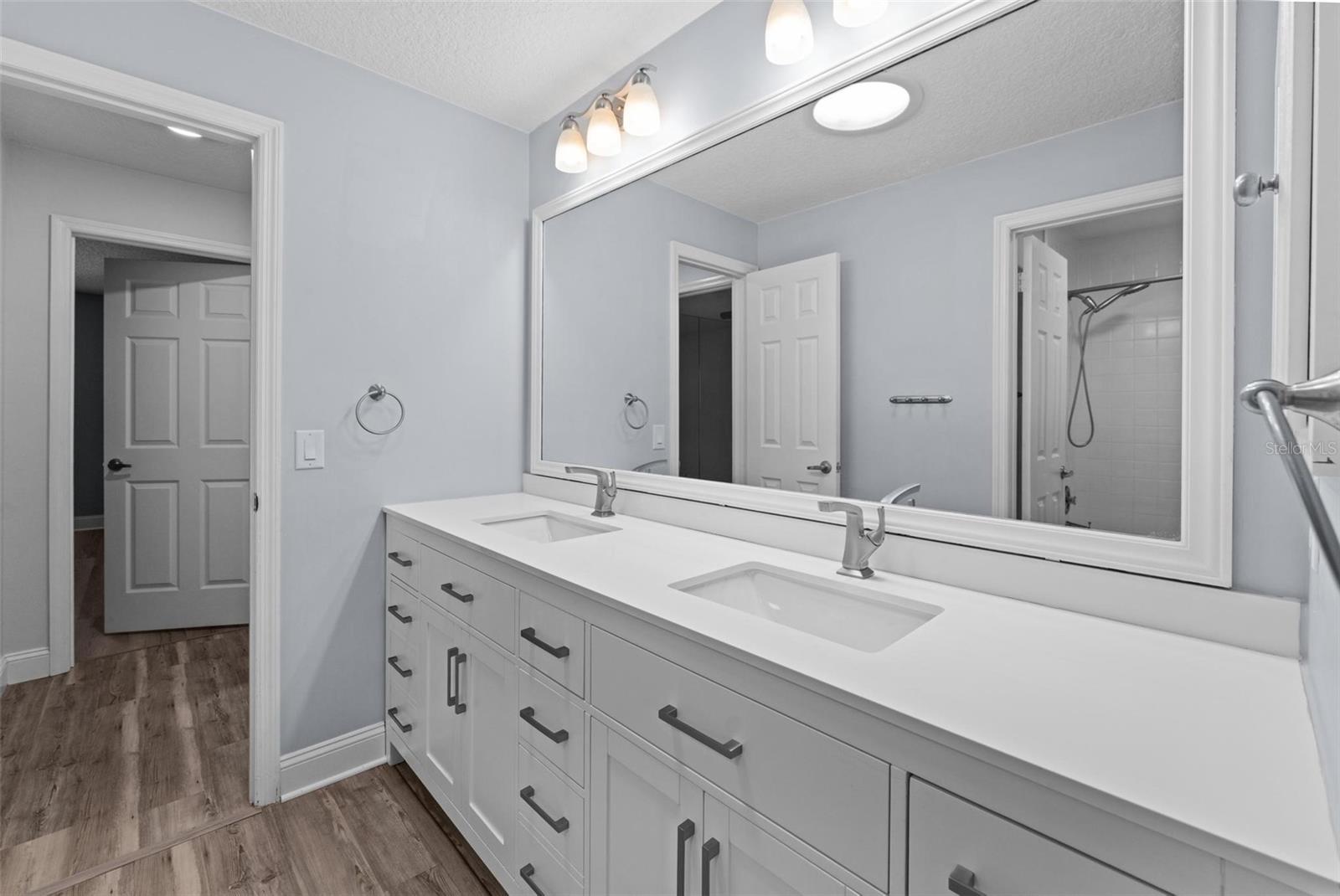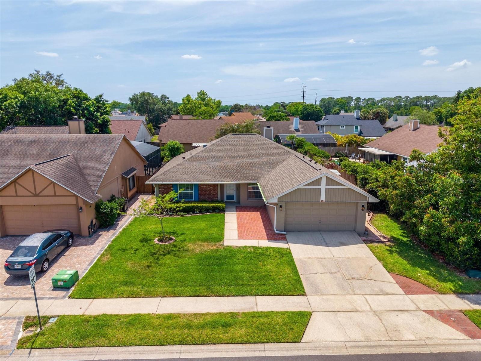 One or more photo(s) has been virtually staged. Nestled in the desirable Lakewood at the Crossings community, this meticulously maintained 4-bedroom, 2-bathroom pool home offers a serene retreat with modern amenities. The home features a split floor plan, providing privacy and comfort for all residents. The expansive living room boasts high ceilings, a wood-burning fireplace, and built-in surround sound, creating an inviting atmosphere. Sliding doors lead to an enclosed patio that overlooks a lush, tropical pool area, perfect for relaxation and entertaining. The spacious primary suite features French doors that open to the enclosed patio, offering pool views. The ensuite bathroom is a spa-like haven, complete with an upgraded double vanity with granite counters, modern lighting, and faucets. Two separate step-in closets provide generous storage, and the updated step-in shower includes a rain shower head and multiple shower options for a luxurious experience. NEWER ROOF (April 2022) HVAC (2015) with newer compressor, blower & A frame coil (2017), Water softener (2019), Exterior paint Sherwin Williams (2017), Dual Pane Low E windows (2006). Conveniently located just minutes from top rated schools,