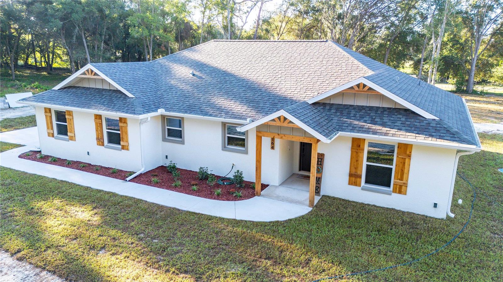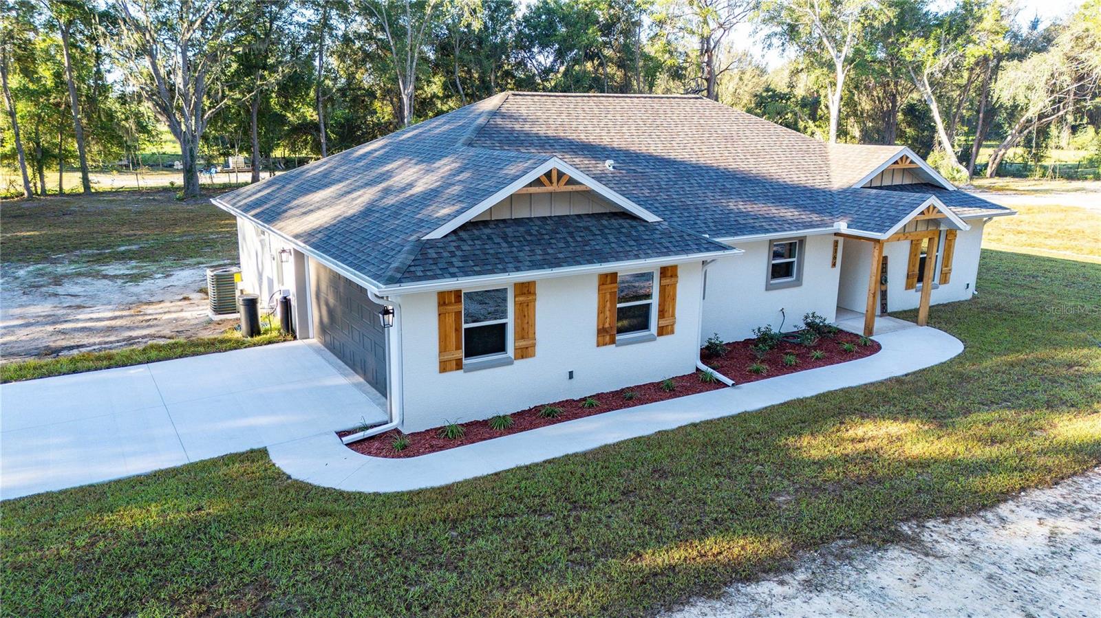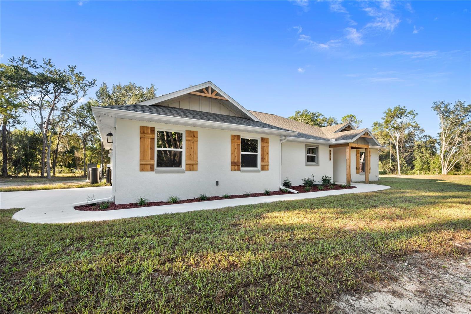 Custom-Built New Construction on 1.1 Acres Welcome to your brand-new dream home, tucked away at the peaceful end of the road. This custom home was thoughtfully designed and beautifully staged by AS Collective Homes LLC, offering a perfect blend of charm, comfort, and functionality. From the moment you arrive, you’ll notice the rough-cut cedar shutters and cedar-wrapped pillars, setting the tone for the craftsmanship throughout. Be greeted in the foyer by an open great room anchored by a quartz kitchen bar, ideal for entertaining. The kitchen shines with sage green cabinets - well-appointed cabinets for a variety of storage solutions, a stylish tile backsplash, and a full suite of Samsung appliances (fridge, range, dishwasher, and microwave hood) — all covered by a transferrable warranty. Inside, you’ll find waterproof wooden laminate flooring, Sherwin Williams paint finishes, and thoughtful touches in every corner. A massive pantry could double as a desk/study nook, while the dedicated laundry room is conveniently located near the garage entry. A true split floorplan the right side of the home features two identical bedrooms with upgraded closet doors and fans that are actually a feature. The bathroom is centered in this space with abundant cabinetry. The tub shower combo will wow with this on-trend tile. The private primary suite or secluded sanctuary is one of a kind. Enjoy a spa-inspired en suite with a standalone soaking tub, walk-in shower, private water closet, dual-sink vanity, and a spacious 10’ x 5.8’ walk-in closet. Step outside to the lanai off the great room, where you can unwind while overlooking peaceful pasture views. Built with comfort and efficiency in mind, all windows are double paned with Low E, R-30 attic insulation, R-5 wall insulation, a salt system, well water, and septic tank. Don’t miss your chance to own this one-of-a-kind custom build on over an acre of land — a perfect mix of country living with modern design.