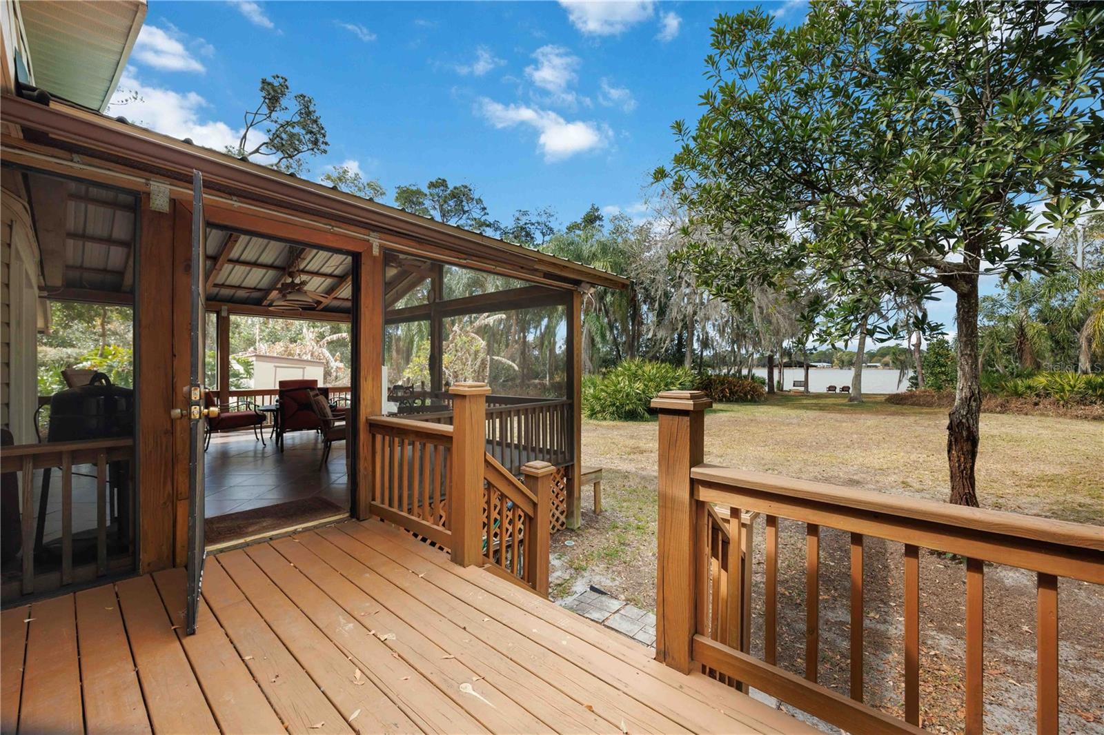 WONDERFUL LAKEFRONT SETTING for this lovely Lake Persimmon home offering panoramic western views that bring gorgeous sunsets across the lake! This well-maintained home offers spacious open concept living, split-plan for 3 BD/ 3 BA, while situated on a large .71 acre lot! The view of Lake Persimmon is immediate after entering the large foyer and stepping into the impressive living room where four French doors give view and direct access to the beautiful lakefront porch. The living room offers cathedral ceiling, recessed lighting and a pass-thru to kitchen with seating. A large picture window gives the dining room a stunning lake view and warm wood wainscot with chair railing adorn the space while linking to the beautiful wood cabinetry of the large kitchen outfitted with a gas range, center island, abundance of drawer space and large windows that bring a flood of natural light. Terrific tile flooring begins in the foyer continuing throughout the living area and onto the screen lanai, additionally, the home is well equipped with ceiling fans. The primary owners’ suite has crown moulding, shuttered window dressing, dual closets and a sleek bathroom with walk-in shower and lengthy vanity with make-up desk. The second bedroom is en-suite with pedestal sink and tub with shower; the third sleeping quarters has easy access to a full-bathroom. The indoor laundry room has built-in cabinets and a dual stainless sink. Take in fresh air and relax on the well-designed lakefront lanai where lake breezes and sunsets are endless, plus it’s a great place when entertaining family and friends; an outside deck stands alongside for grilling or soaking in the sun. At the lake shore is a covered dock for a calm retreat and close-up sunset experience. Don’t miss out on this prime property, the lakefront living opportunities don’t happen often! Great location, easy access to shopping, schools and major US Hwy. 27.