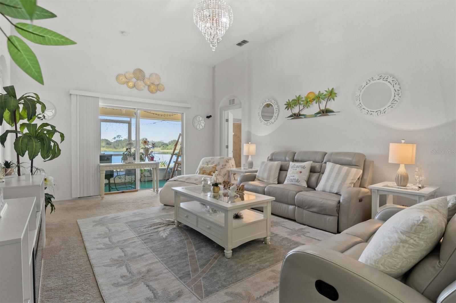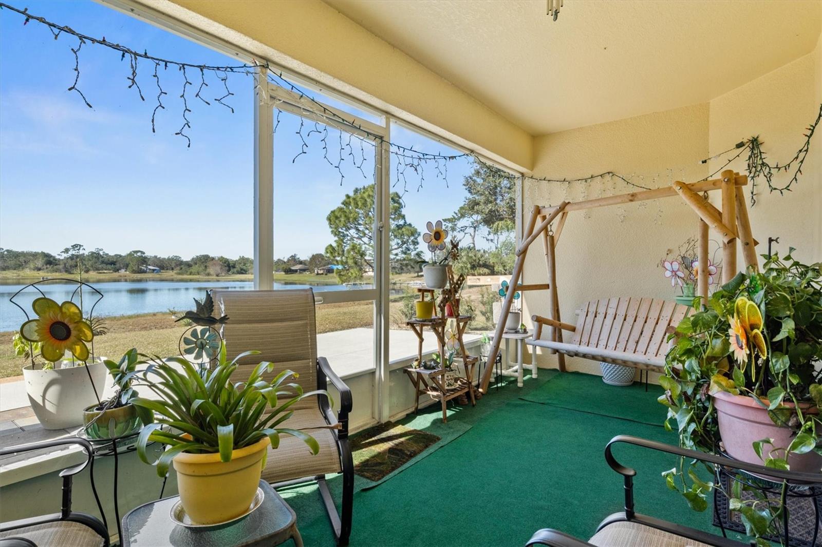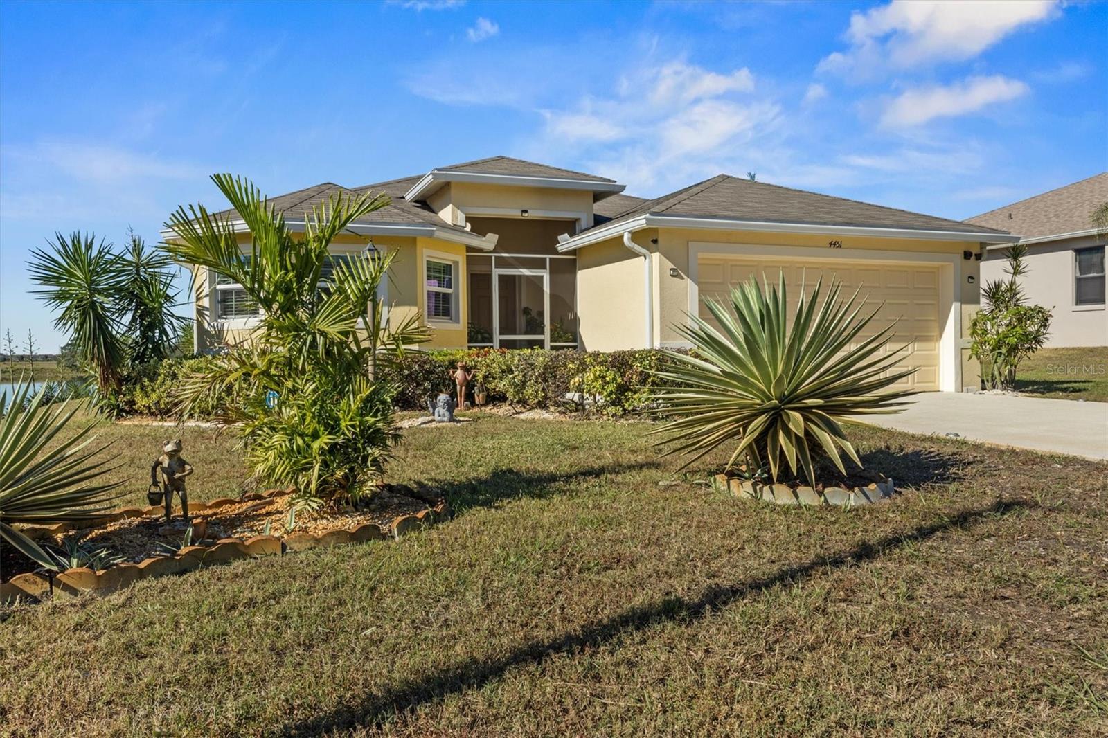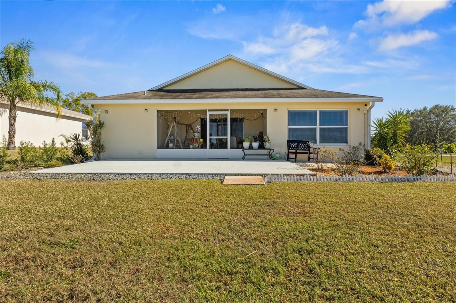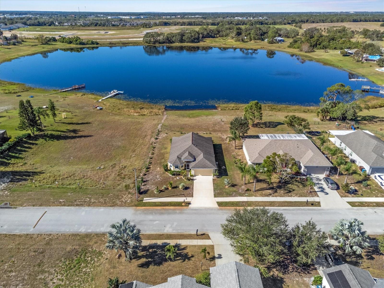 Imagine waking up to the gentle glow of the sun rising over the pristine waters of Dinner Lake. This 4-bedroom, 3-bathroom Southern Homes Belmont Series residence, built in 2018, offers the perfect blend of modern design and lakeside charm. As you step into the grand entryway, soaring 12-foot ceilings and an open layout greet you, creating a warm and inviting space for both relaxing and entertaining. Start your mornings sipping coffee in the chef’s kitchen, complete with stainless steel Frigidaire appliances and reverse osmosis water filtration. The natural light pours into the living area, leading you effortlessly to your private screened-in lanai. Here, you’ll find yourself lingering at sunset, captivated by the golden hues reflecting off the serene lake, or hosting friends on the extended 15x20 concrete patio. Retreat to the spacious primary suite, where dual walk-in closets and a spa-inspired bathroom with a garden tub and double vanity await. Three additional bedrooms provide flexibility for guests, family, or a home office. This home is set on over an acre in a gated community, offering not only privacy but also shared amenities like a community playground. With lake access, the possibility to build your own dock, and a dedicated irrigation well keeping the landscaped yard lush year-round, this home truly has it all. Whether you’re seeking peaceful mornings, vibrant gatherings, or the serenity of lakeside living, this property is your perfect match. Schedule a private showing and don't miss the chance to call this beautiful home your own!