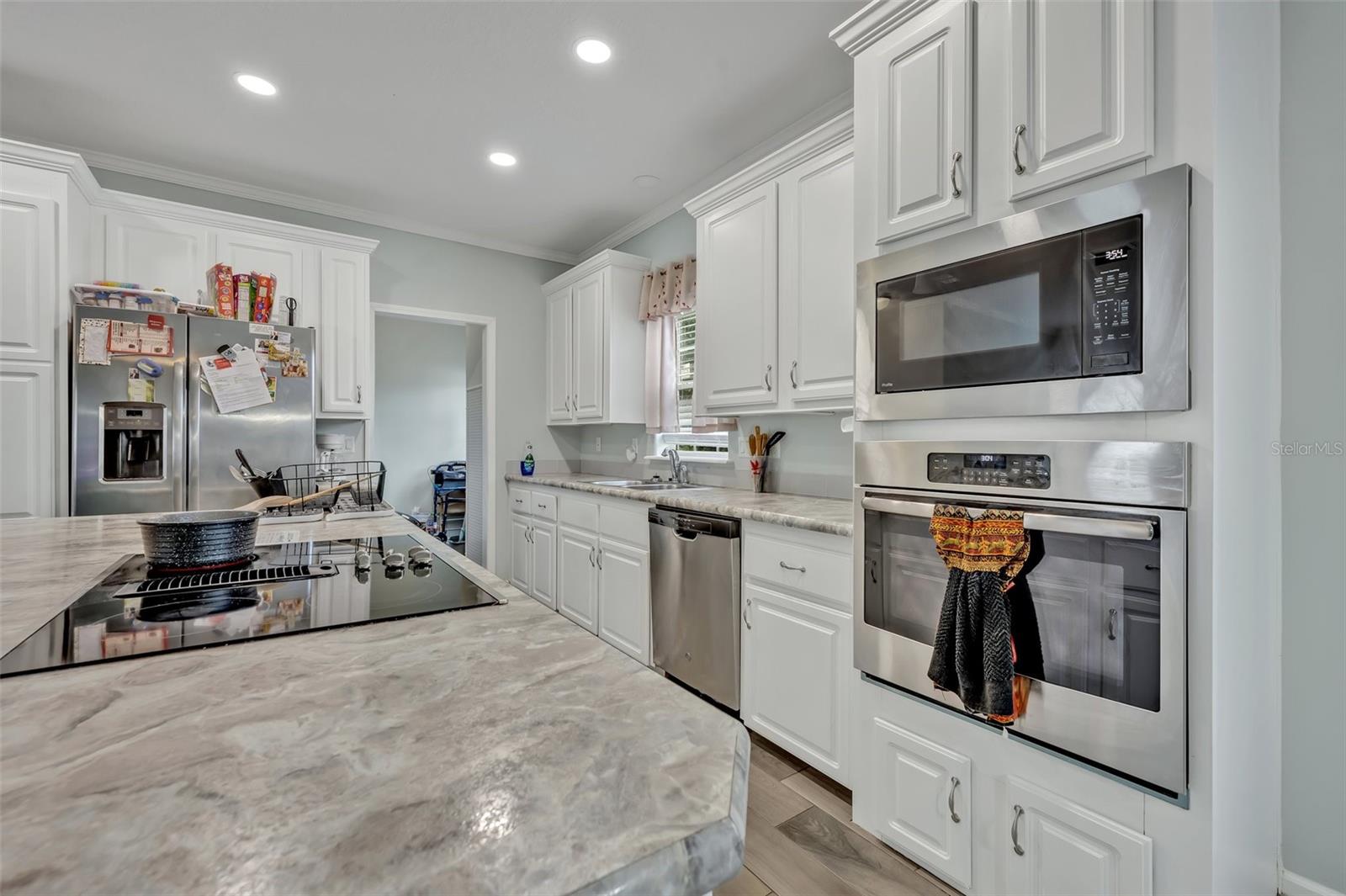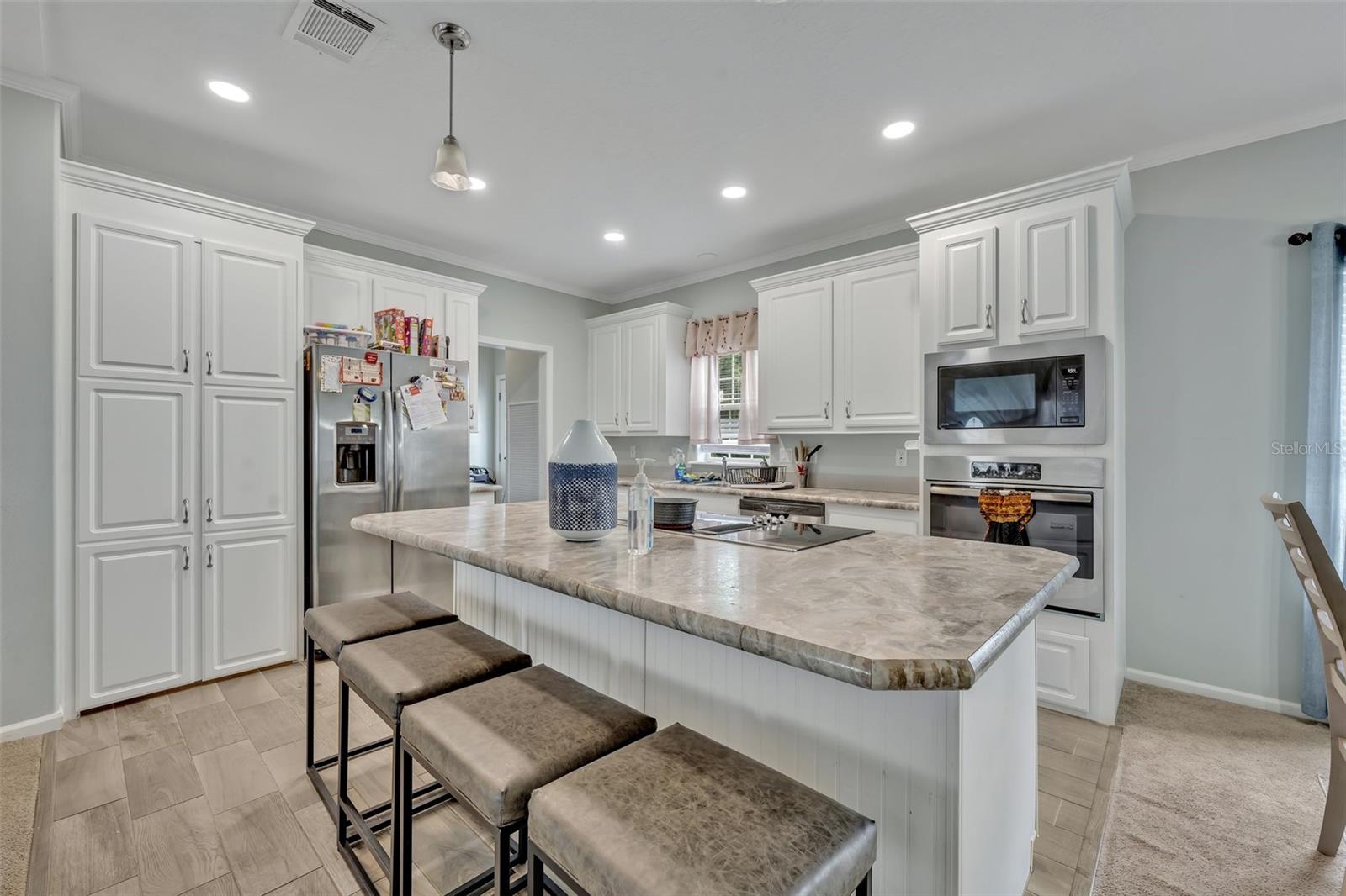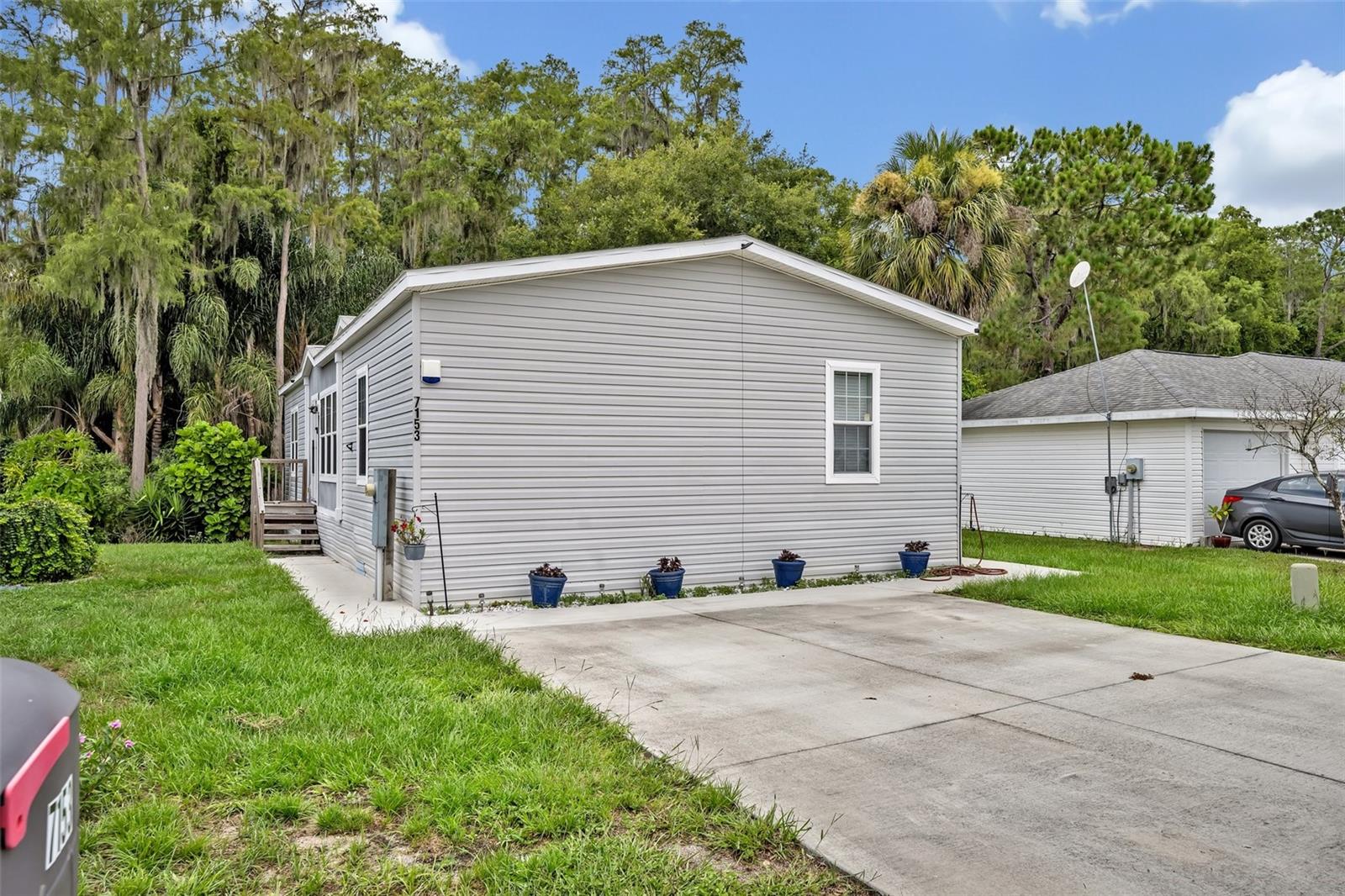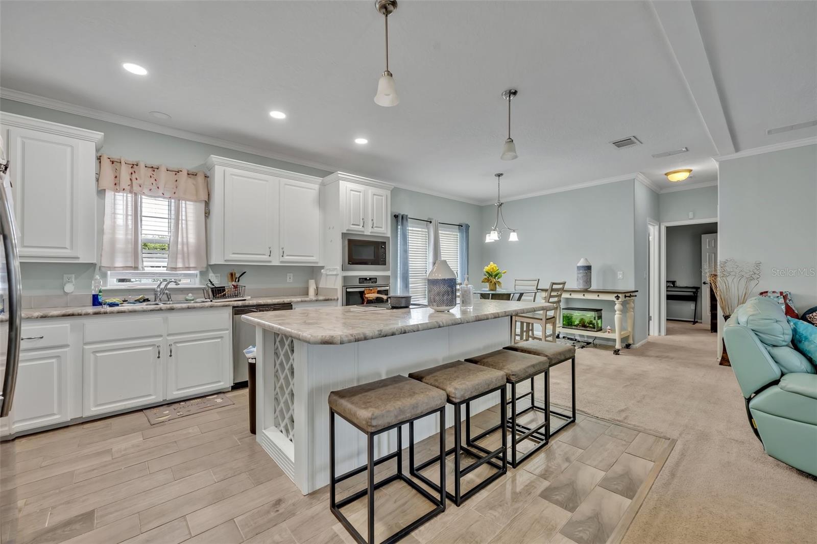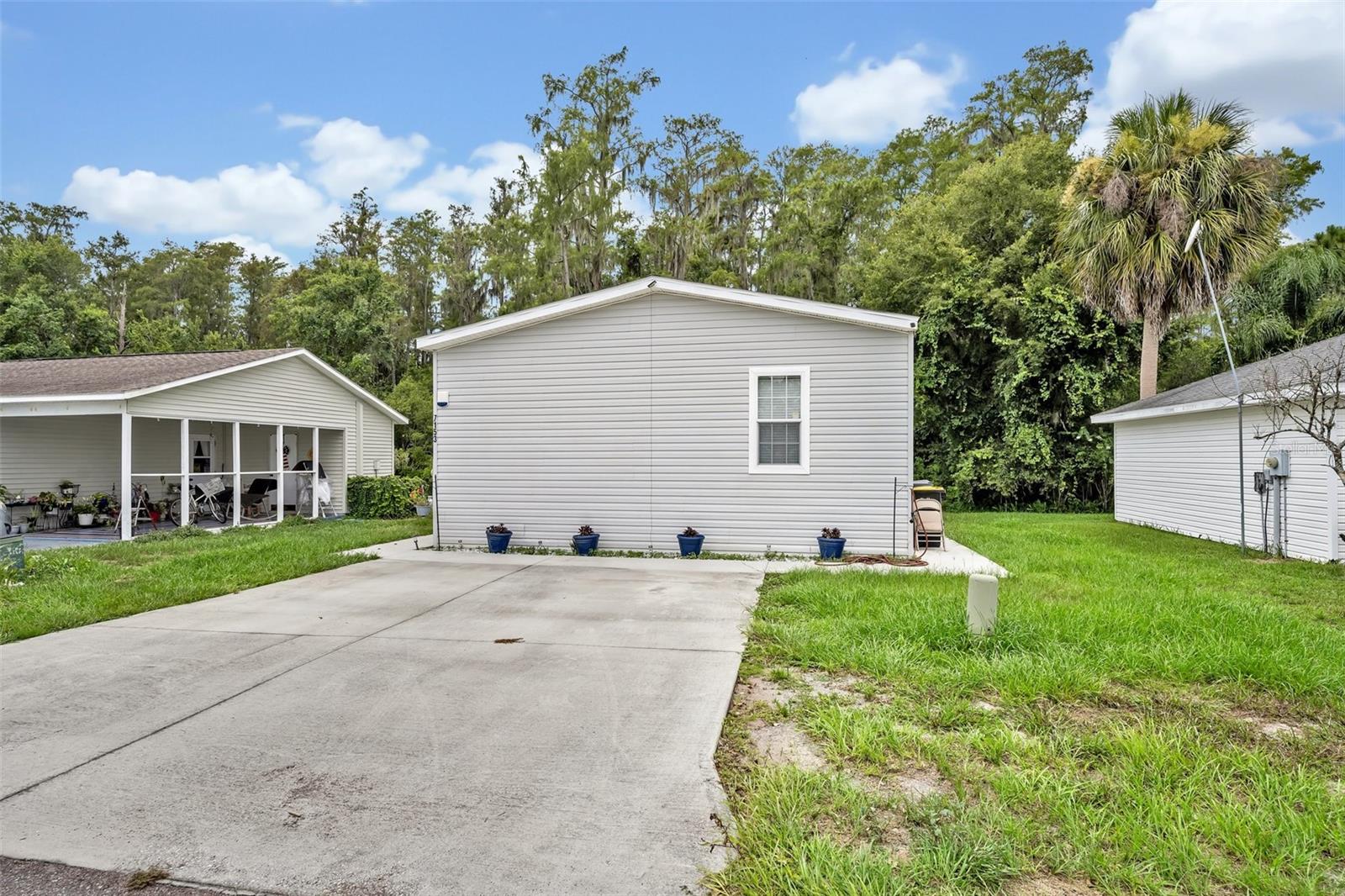 This beautiful, well-maintained Manufactured Home is only 5 years old and is located in the beautiful community of Nature’s Edge Resort. This desirable 55+ community offers peace and tranquility while still being conveniently located. The home features an Open Floorplan with a spacious Living Room which connects seamlessly to the large, well-appointed Kitchen. The Kitchen boasts Stainless Steel Appliances, including a Built-In Oven and Microwave, as well as a large Island complete with Built In Cooktop and Bar Seating. With ample cabinet space, a walk-in Pantry, and beautiful Stone Countertops, this Gourmet Kitchen is a Chef’s Delight! The Primary Bedroom includes a Walk-In Closet and a large Bathroom with separate Garden Tub and Glass Door & Tile Shower, as well as Dual Vanities. Two additional Bedrooms are also on hand along with a fully equipped Guest Bathroom. Both Bedrooms have comfy carpet floors and roomy, Walk-In Closets. The Laundry Room is easy to reach just beside the Kitchen and comes complete with almost new Samsung Washer & Dryer. Additional details like Crown Molding throughout the home and the built in Wine Rack located in the Island add even more charm and character to this lovely home. The Community includes a Clubhouse, Shuffleboard, and more. This sought-after 55+ community is conveniently situated between Tampa and Orlando and close to all central Florida Theme Parks and Attraction in a quiet country setting with shopping and medical facilities nearby. This home is perfect for year-round or seasonal residents.