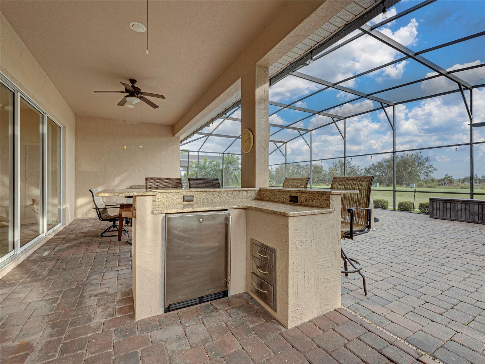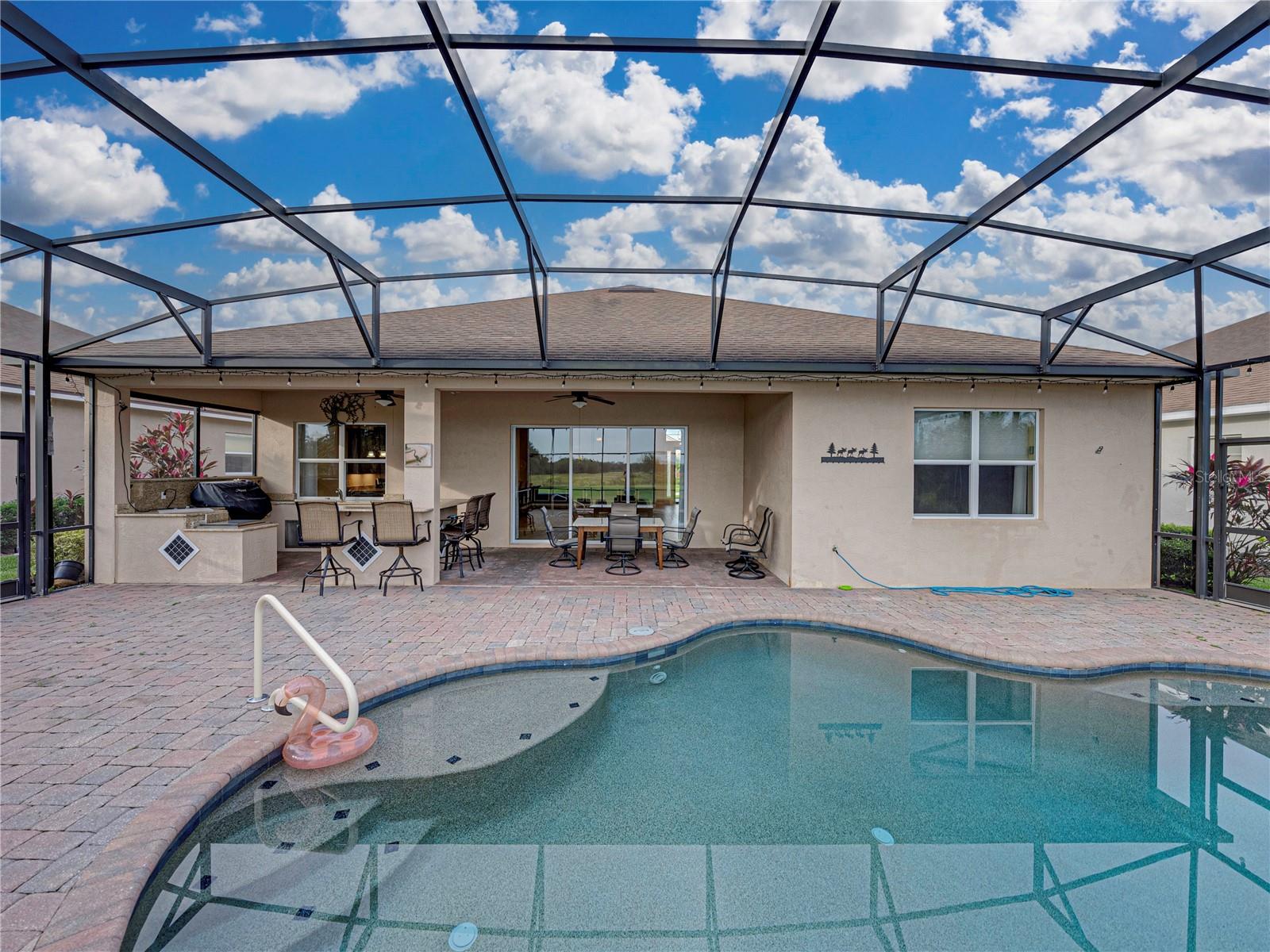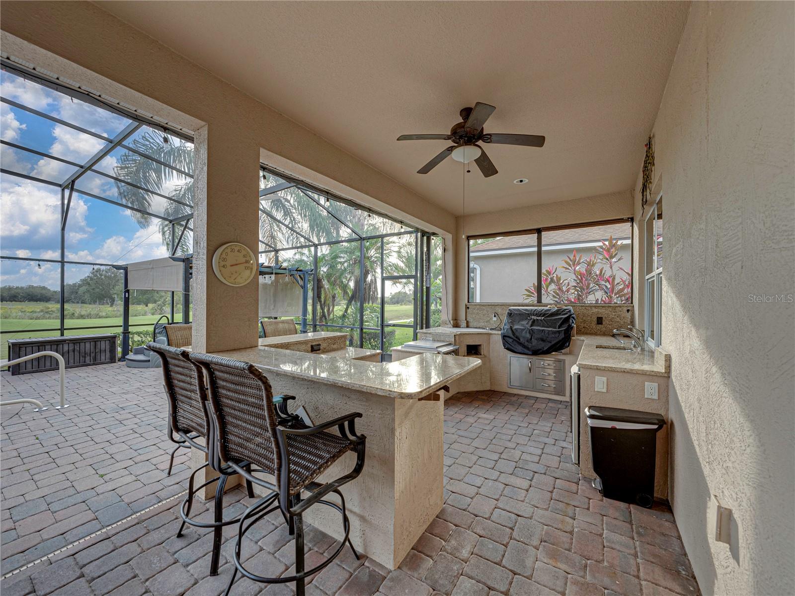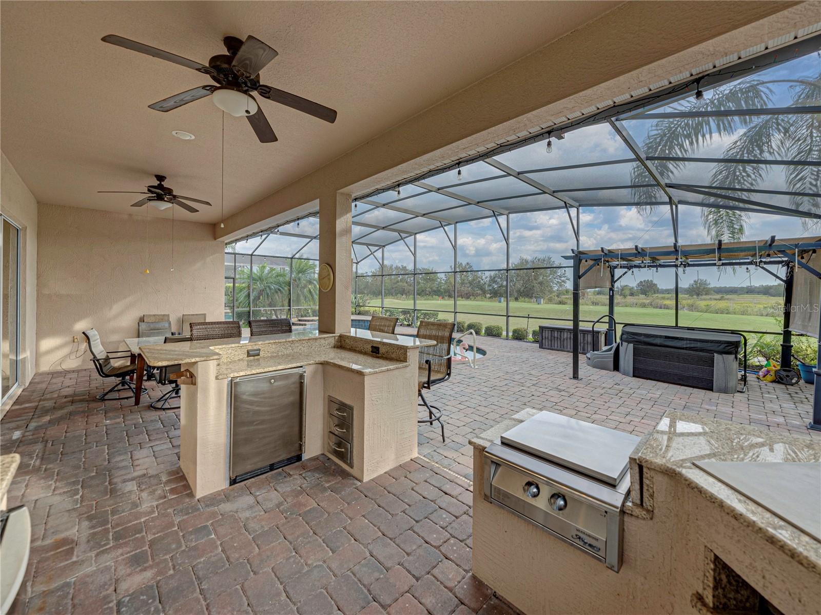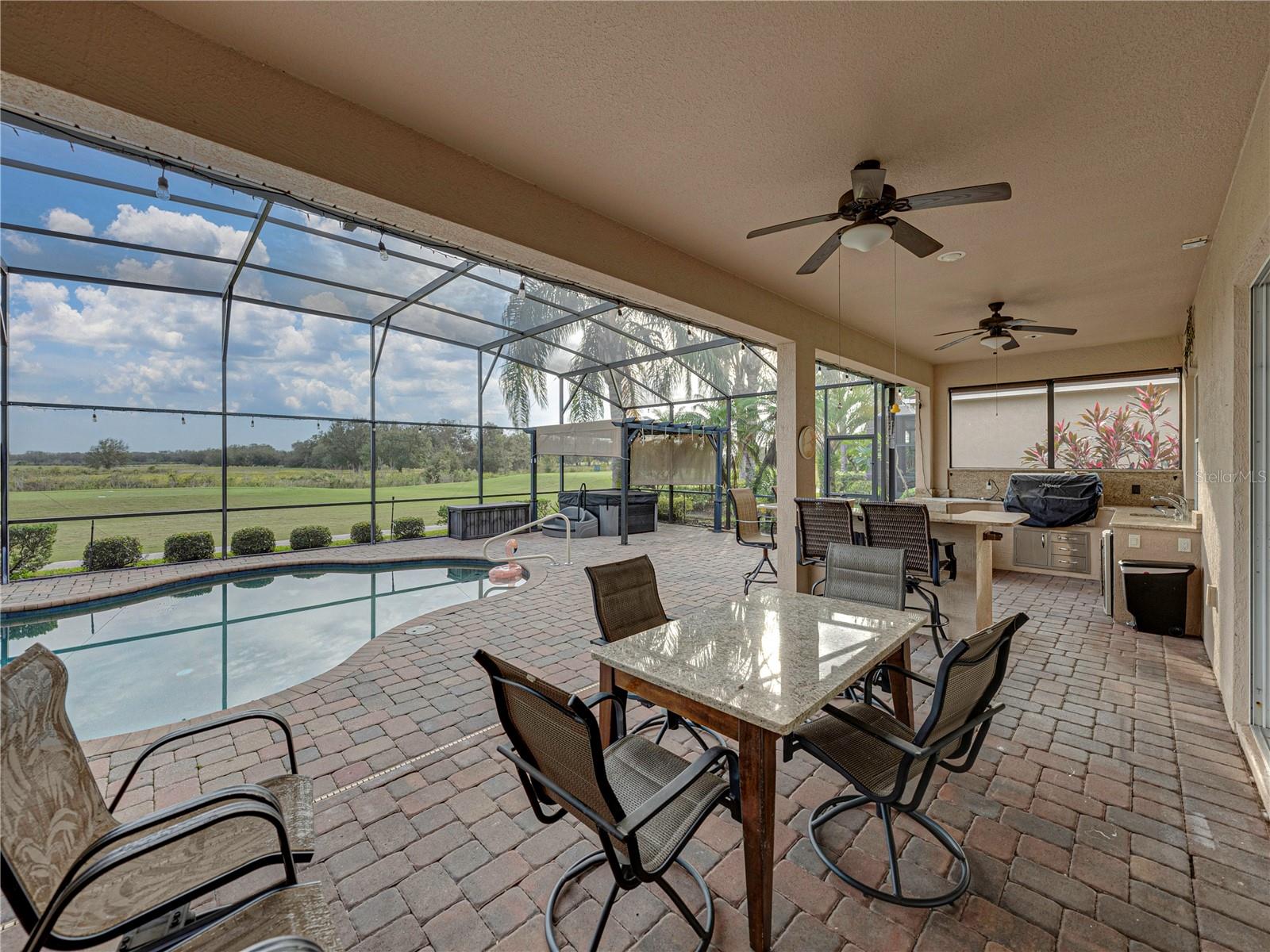 REDUCED PRICE!!! MOTIVATED SELLER!!! Beautiful Pool Home on the Golf Course. This 3 bedroom, 2 bath open floor plan has an attached 2 car garage with golf cart garage AND THE GOLF CART CONVEYS WITH HOME. Come see this salt water pool, with a separate Newer hot tub, an Amazing Outdoor kitchen featuring a charcoal grille, a gas grille, a large gas cooking burner, tons of counter space with beautiful granite countertops, refrigerator, storage drawers, wine refrigerator, bar stools and an outdoor table with chairs (all convey with home). On the inside of the home you will find a large open concept living room/dining room/kitchen which is great for entertaining and has triple sliding doors that gives easy access to the great outdoor pool area. The primary bedroom has an en suite with two walk in closets featuring built in custom storage organizers, dual vanities, walk in shower with glass doors, full tile to ceiling and linen closet. The second bedroom features a built in desk, built in murphy bed with storage on each side and ceiling fan. The third bedroom is a crafter/sewing person's dream room with built in storage and counterspace along with closet and a built in desk or sewing machine area. Golf Cart stays with the sale of home!! Make your appointment today and take a tour of Lake Ashton to see all the amenities such as; Two clubhouses, two 18 hole golf courses, two restaurants, bars, bowling alley, movie theatre, pickle ball, bocce ball, tennis, card rooms, billiard rooms, media centers and so much more!!!