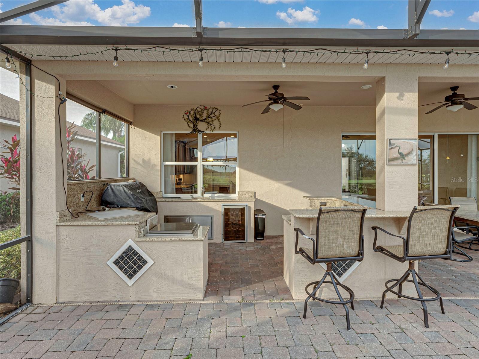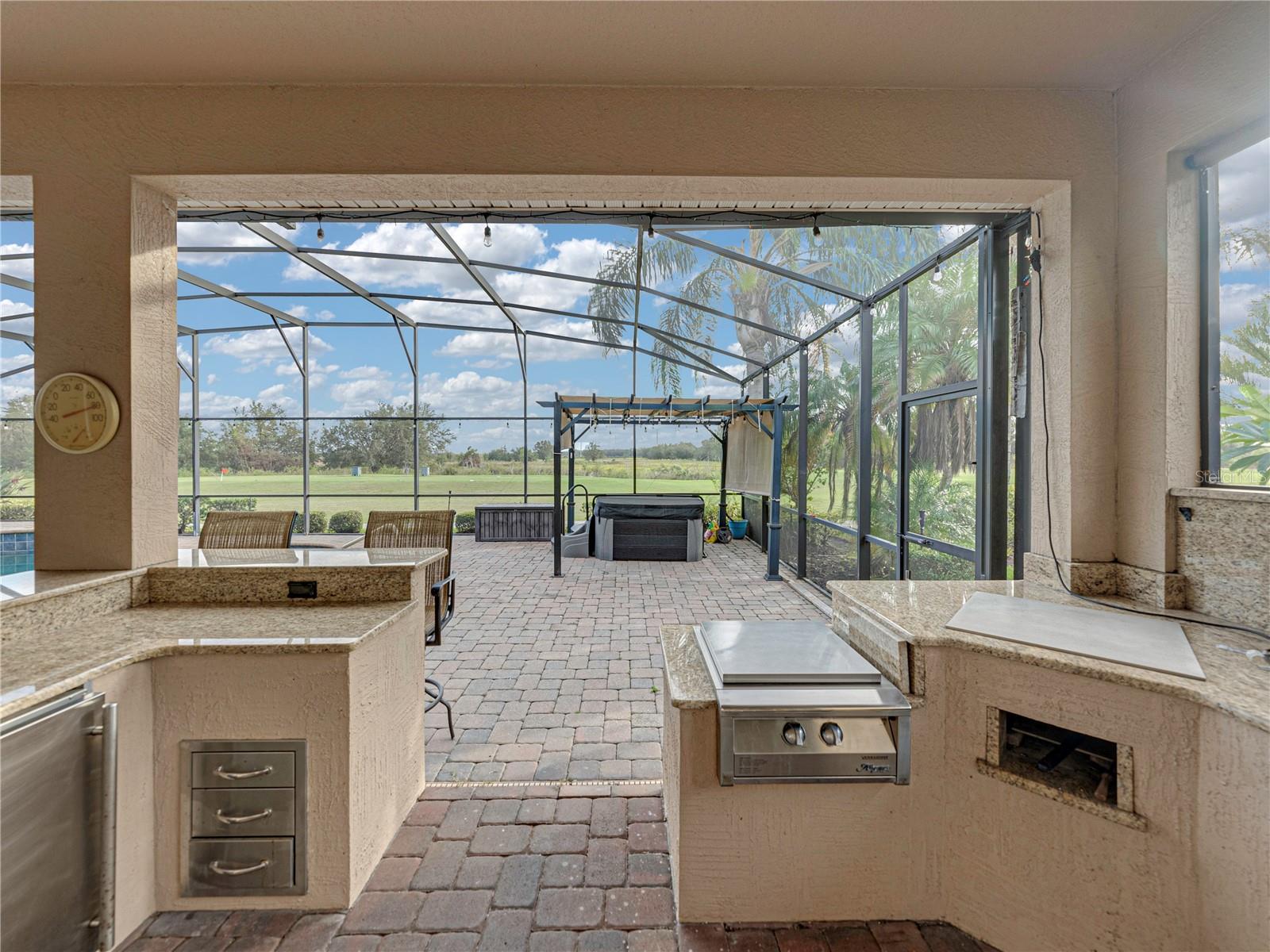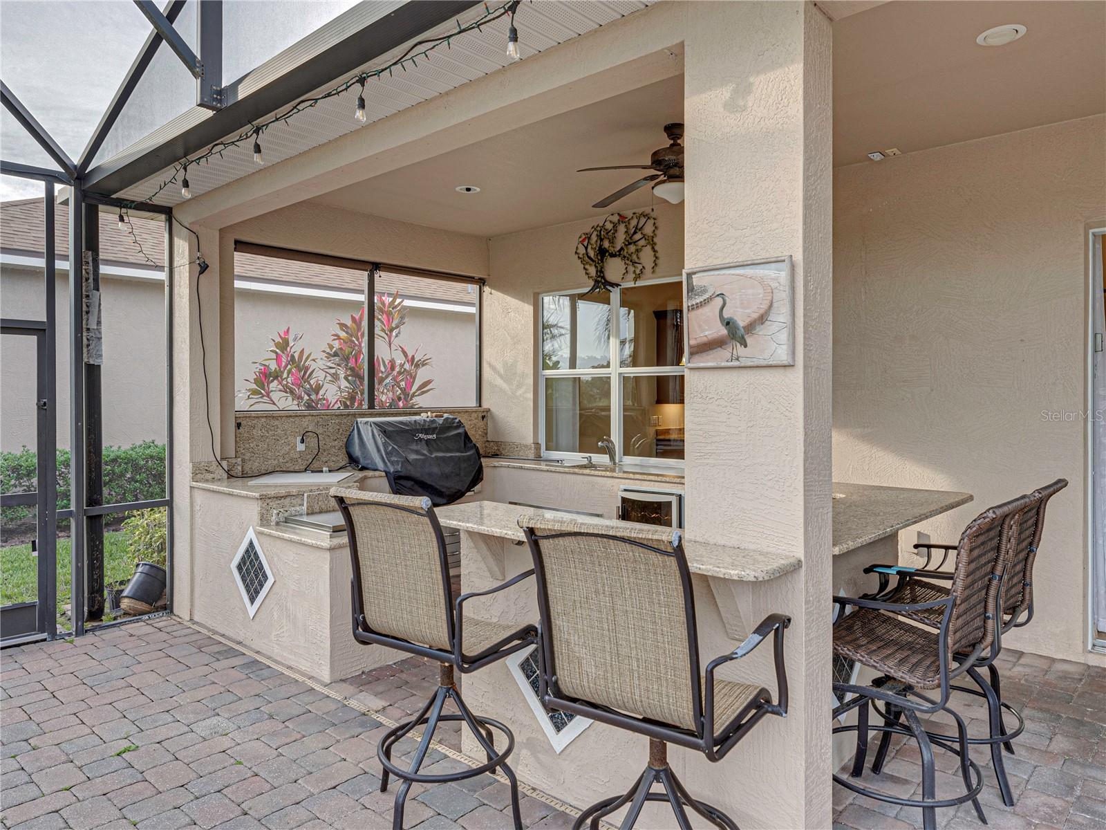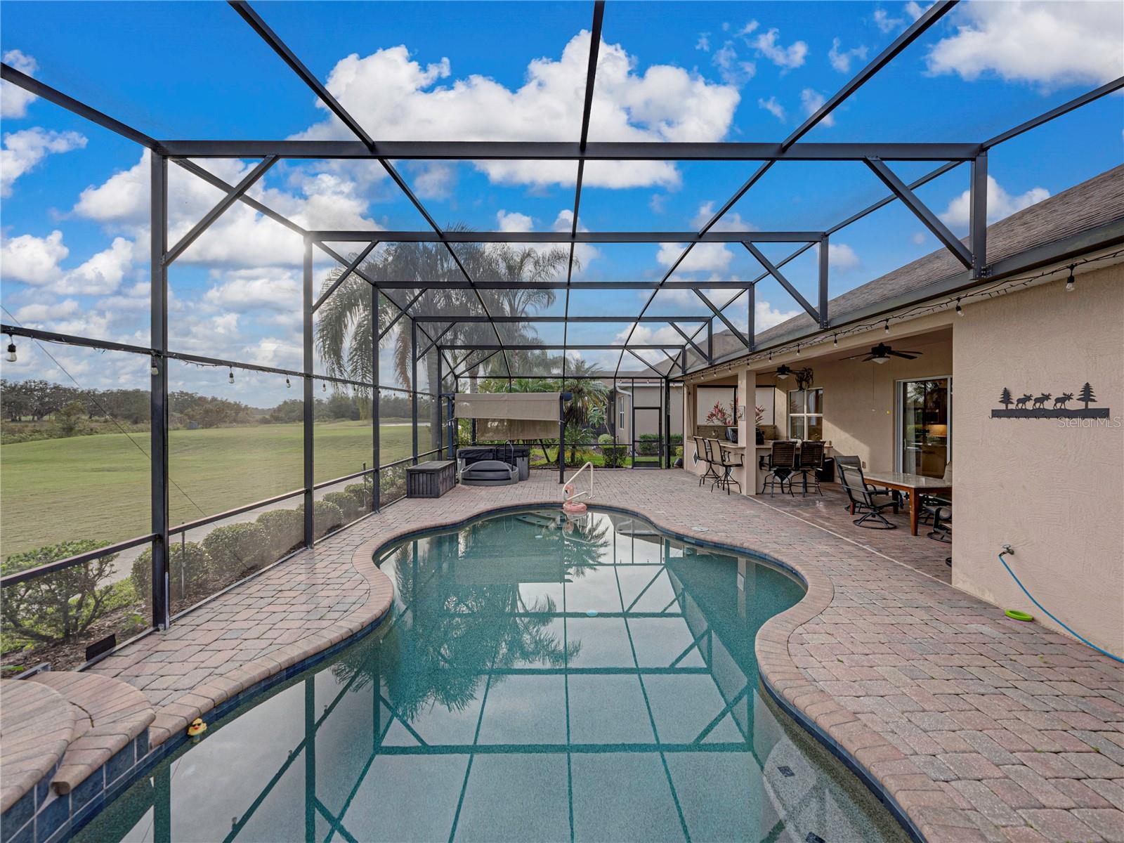 REDUCED PRICE!!! MOTIVATED SELLER!!! Beautiful Pool Home on the Golf Course. This 3 bedroom, 2 bath open floor plan has an attached 2 car garage with golf cart garage AND THE GOLF CART CONVEYS WITH HOME. Come see this salt water pool, with a separate Newer hot tub, an Amazing Outdoor kitchen featuring a charcoal grille, a gas grille, a large gas cooking burner, tons of counter space with beautiful granite countertops, refrigerator, storage drawers, wine refrigerator, bar stools and an outdoor table with chairs (all convey with home). On the inside of the home you will find a large open concept living room/dining room/kitchen which is great for entertaining and has triple sliding doors that gives easy access to the great outdoor pool area. The primary bedroom has an en suite with two walk in closets featuring built in custom storage organizers, dual vanities, walk in shower with glass doors, full tile to ceiling and linen closet. The second bedroom features a built in desk, built in murphy bed with storage on each side and ceiling fan. The third bedroom is a crafter/sewing person's dream room with built in storage and counterspace along with closet and a built in desk or sewing machine area. Golf Cart stays with the sale of home!! Make your appointment today and take a tour of Lake Ashton to see all the amenities such as; Two clubhouses, two 18 hole golf courses, two restaurants, bars, bowling alley, movie theatre, pickle ball, bocce ball, tennis, card rooms, billiard rooms, media centers and so much more!!!