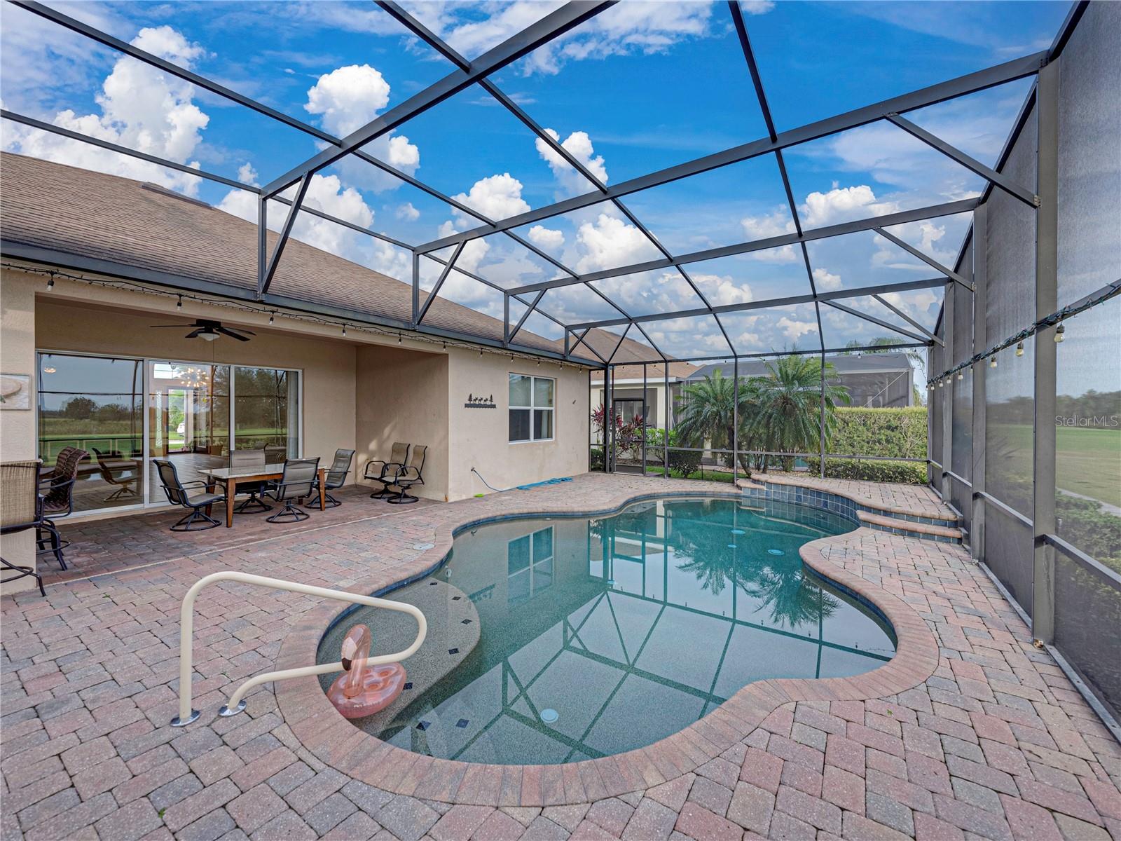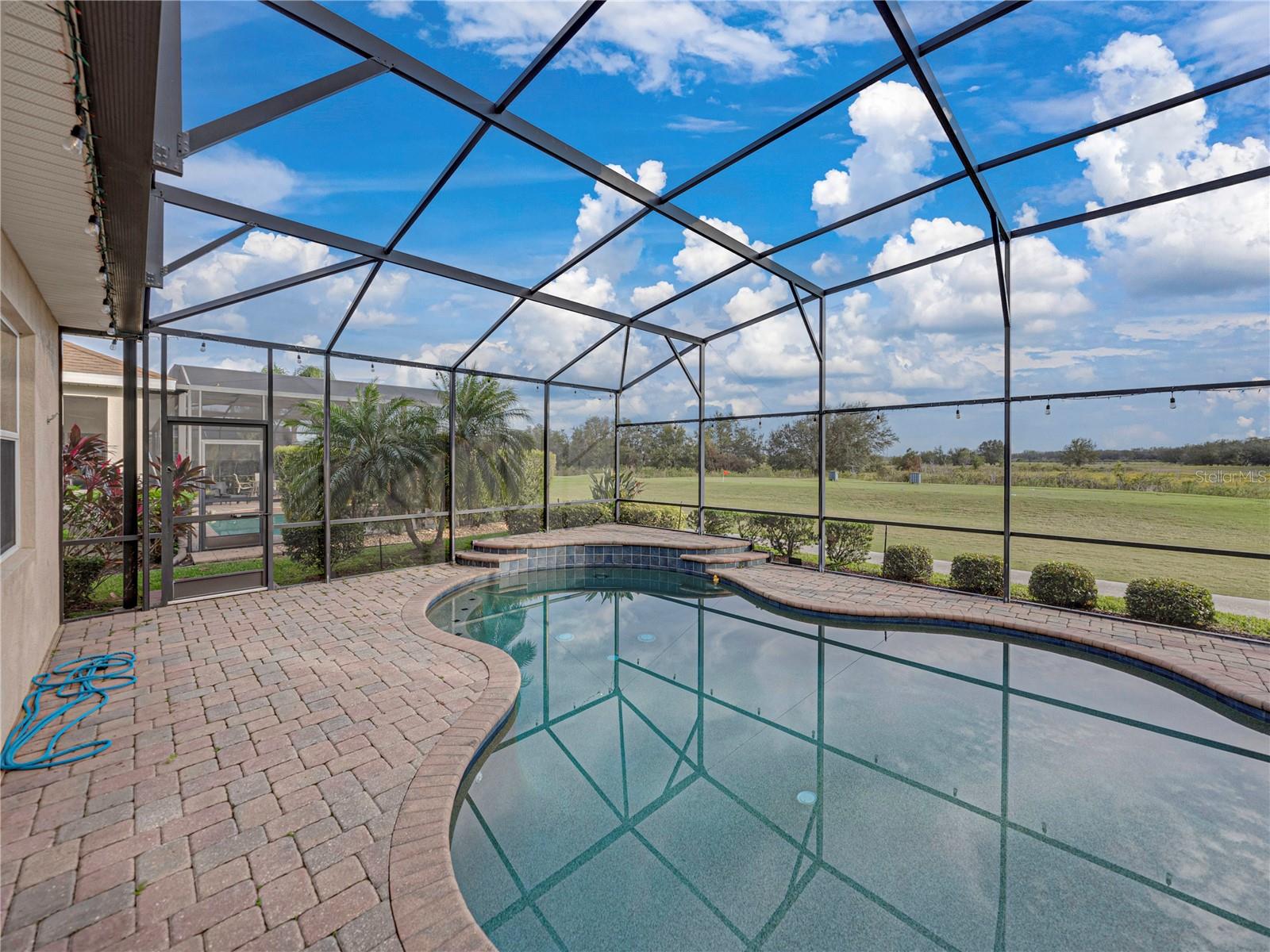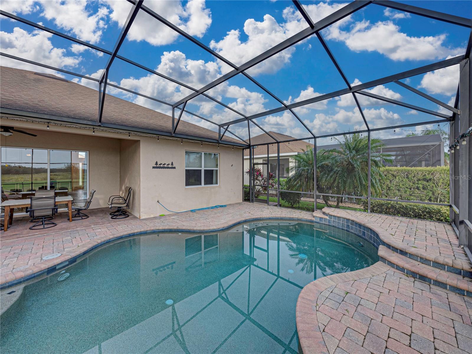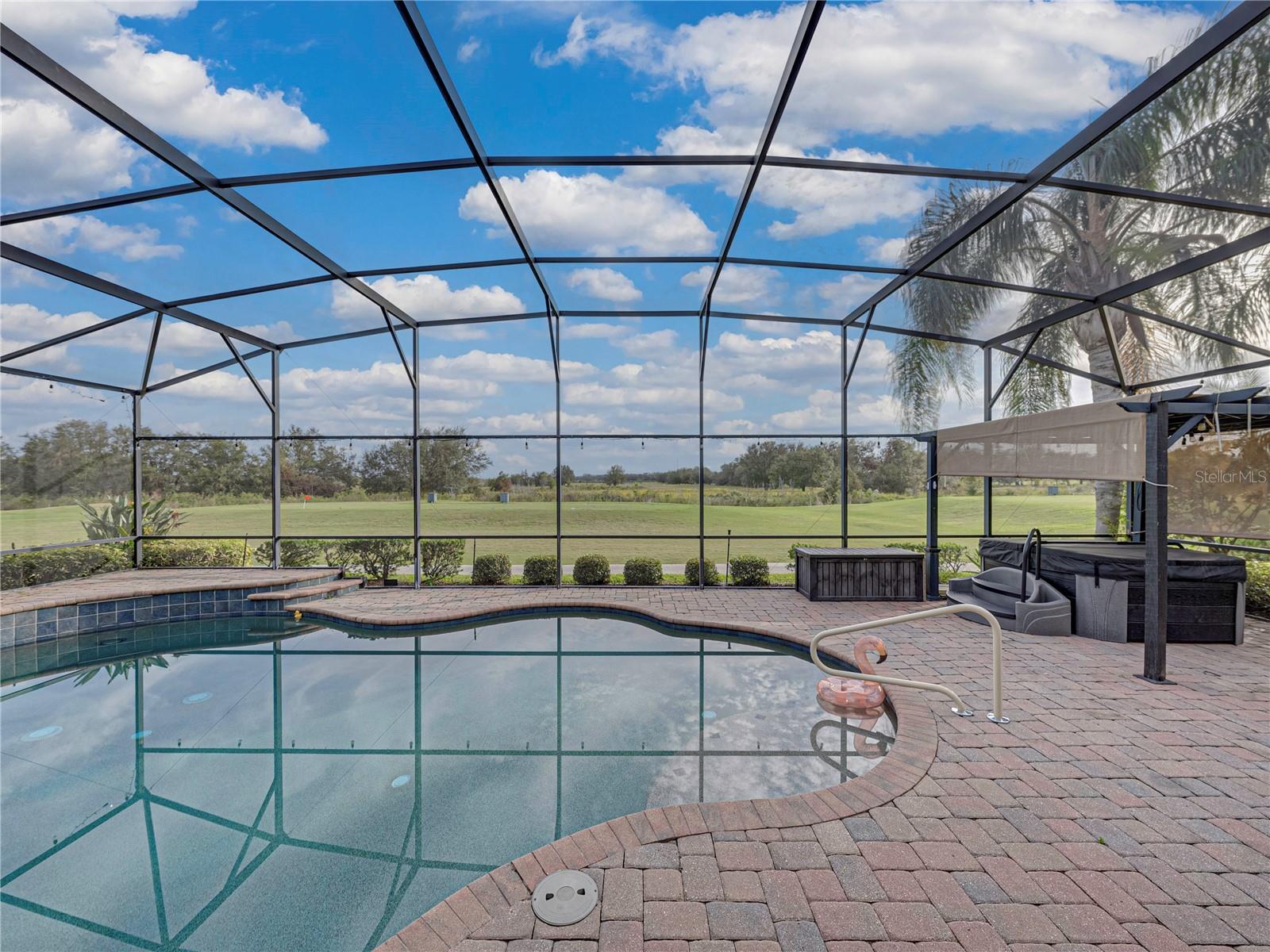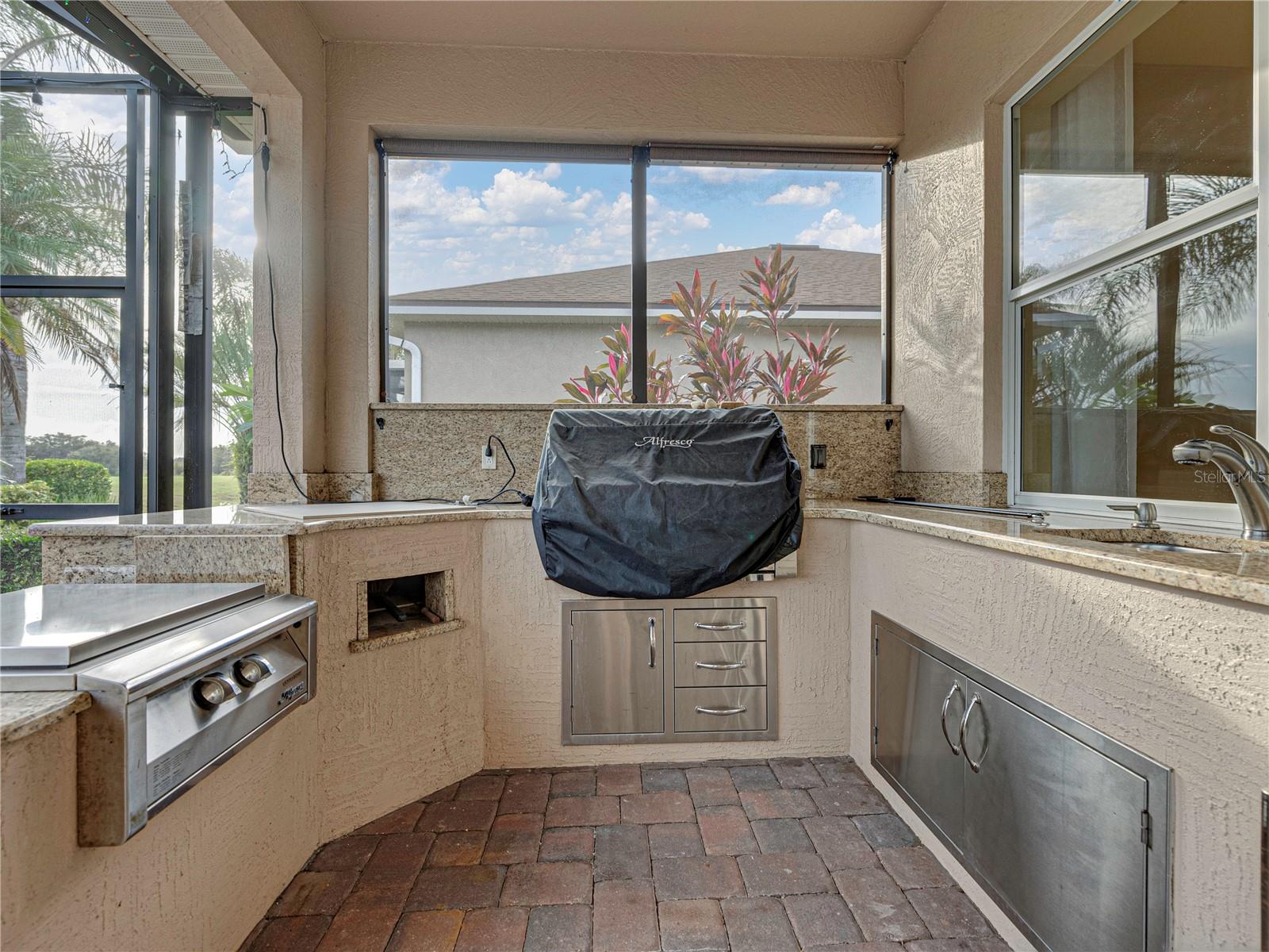 REDUCED PRICE!!! MOTIVATED SELLER!!! Beautiful Pool Home on the Golf Course. This 3 bedroom, 2 bath open floor plan has an attached 2 car garage with golf cart garage AND THE GOLF CART CONVEYS WITH HOME. Come see this salt water pool, with a separate Newer hot tub, an Amazing Outdoor kitchen featuring a charcoal grille, a gas grille, a large gas cooking burner, tons of counter space with beautiful granite countertops, refrigerator, storage drawers, wine refrigerator, bar stools and an outdoor table with chairs (all convey with home). On the inside of the home you will find a large open concept living room/dining room/kitchen which is great for entertaining and has triple sliding doors that gives easy access to the great outdoor pool area. The primary bedroom has an en suite with two walk in closets featuring built in custom storage organizers, dual vanities, walk in shower with glass doors, full tile to ceiling and linen closet. The second bedroom features a built in desk, built in murphy bed with storage on each side and ceiling fan. The third bedroom is a crafter/sewing person's dream room with built in storage and counterspace along with closet and a built in desk or sewing machine area. Golf Cart stays with the sale of home!! Make your appointment today and take a tour of Lake Ashton to see all the amenities such as; Two clubhouses, two 18 hole golf courses, two restaurants, bars, bowling alley, movie theatre, pickle ball, bocce ball, tennis, card rooms, billiard rooms, media centers and so much more!!!