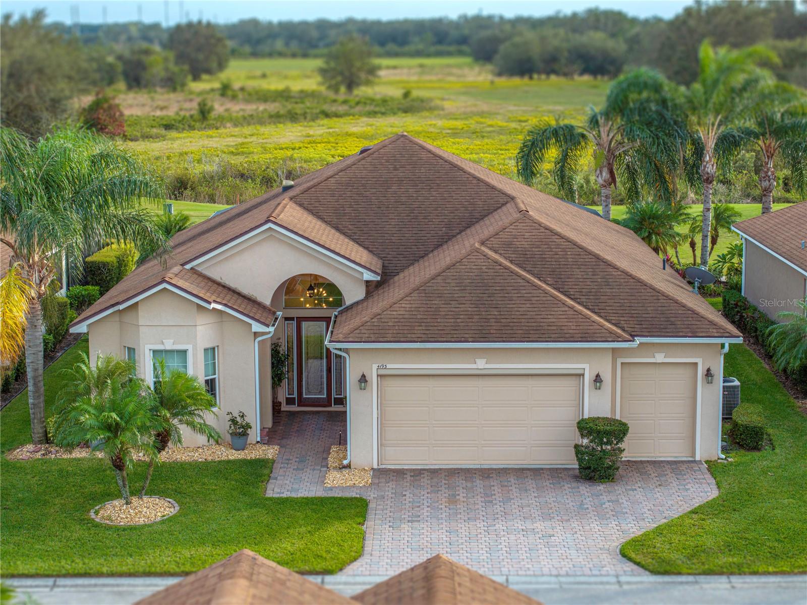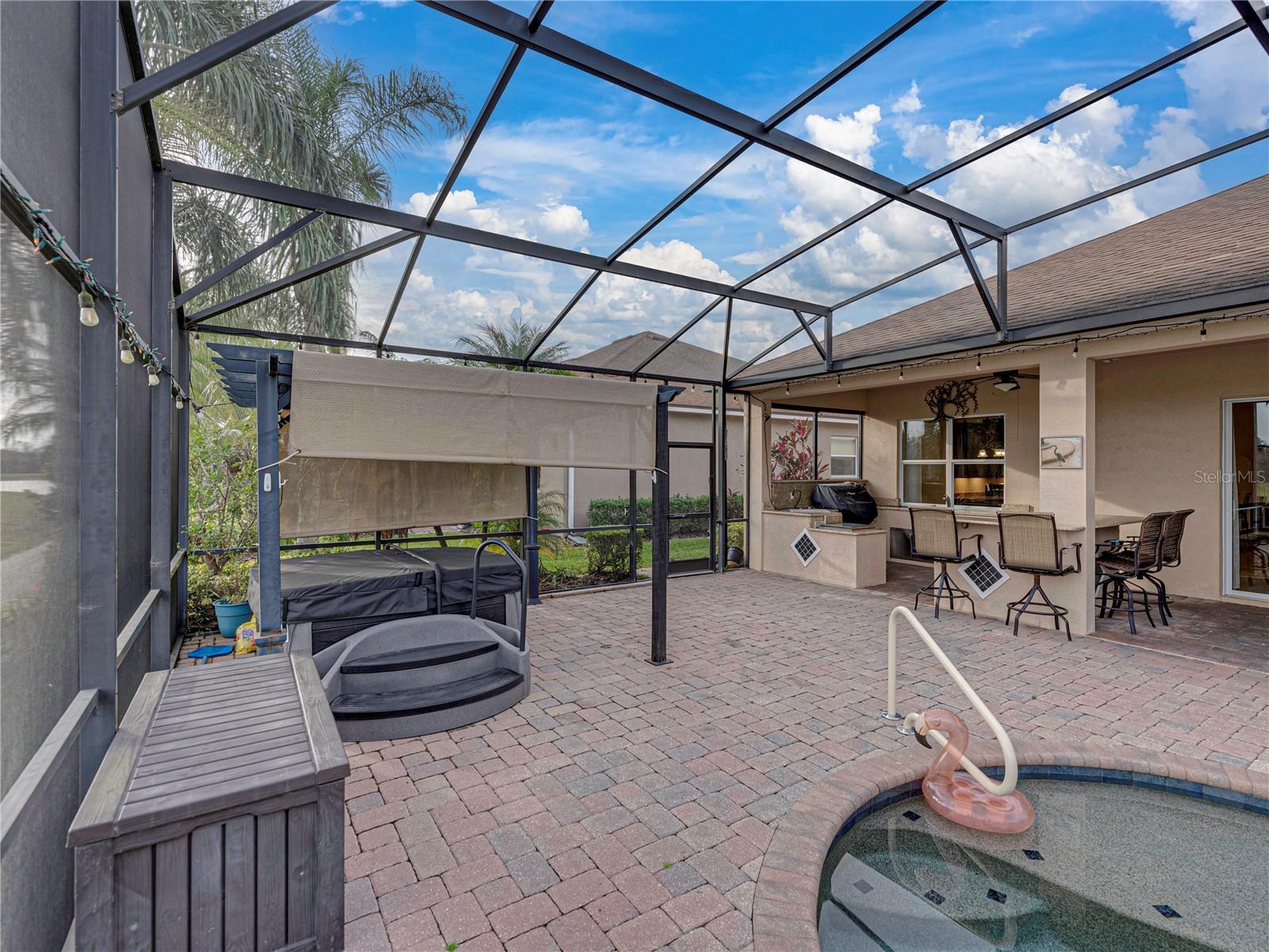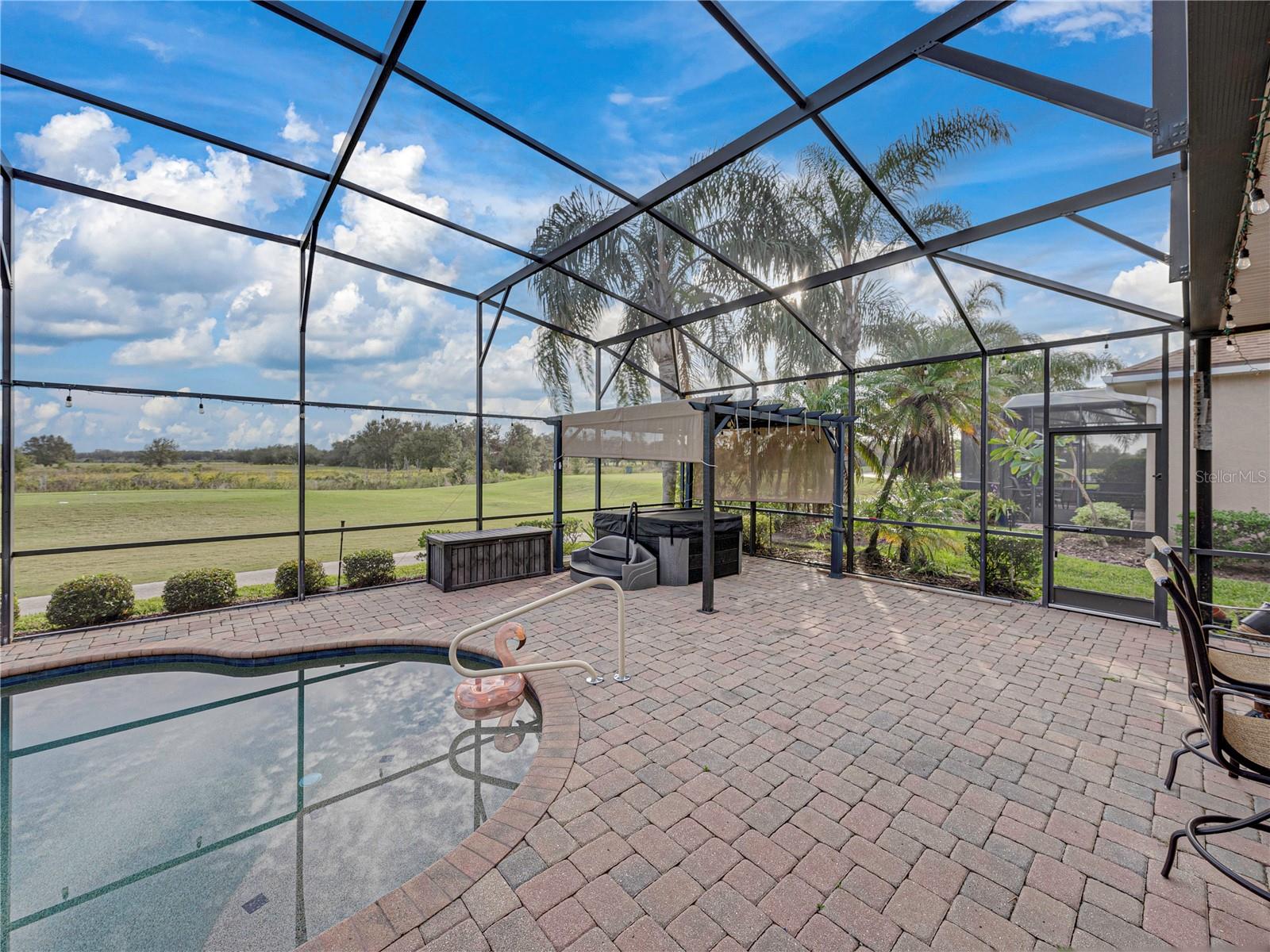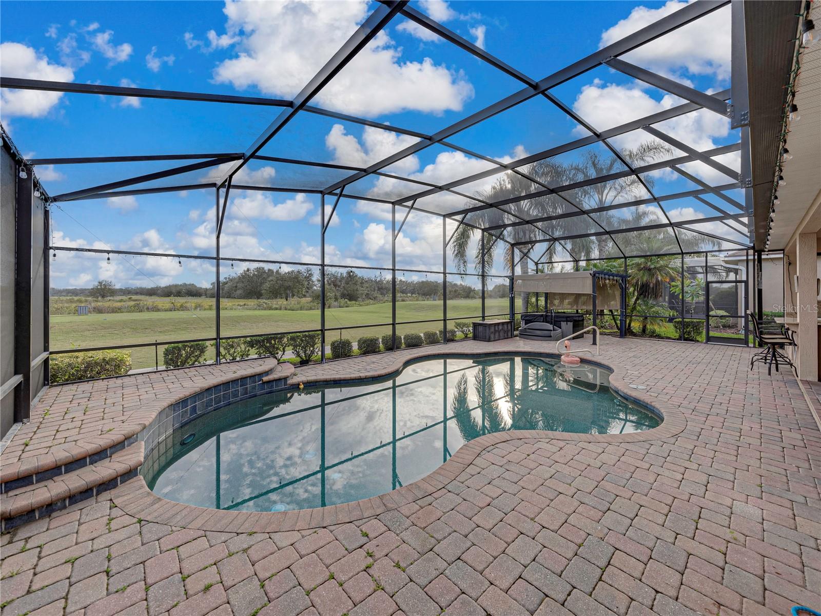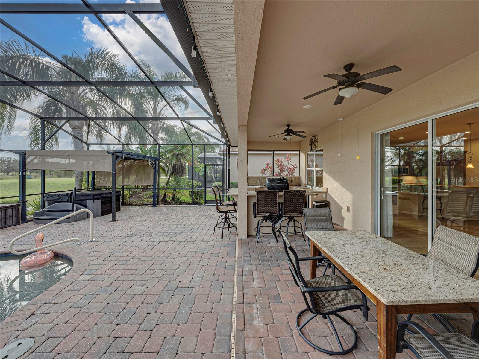 REDUCED PRICE!!! MOTIVATED SELLER!!! Beautiful Pool Home on the Golf Course. This 3 bedroom, 2 bath open floor plan has an attached 2 car garage with golf cart garage AND THE GOLF CART CONVEYS WITH HOME. Come see this salt water pool, with a separate Newer hot tub, an Amazing Outdoor kitchen featuring a charcoal grille, a gas grille, a large gas cooking burner, tons of counter space with beautiful granite countertops, refrigerator, storage drawers, wine refrigerator, bar stools and an outdoor table with chairs (all convey with home). On the inside of the home you will find a large open concept living room/dining room/kitchen which is great for entertaining and has triple sliding doors that gives easy access to the great outdoor pool area. The primary bedroom has an en suite with two walk in closets featuring built in custom storage organizers, dual vanities, walk in shower with glass doors, full tile to ceiling and linen closet. The second bedroom features a built in desk, built in murphy bed with storage on each side and ceiling fan. The third bedroom is a crafter/sewing person's dream room with built in storage and counterspace along with closet and a built in desk or sewing machine area. Golf Cart stays with the sale of home!! Make your appointment today and take a tour of Lake Ashton to see all the amenities such as; Two clubhouses, two 18 hole golf courses, two restaurants, bars, bowling alley, movie theatre, pickle ball, bocce ball, tennis, card rooms, billiard rooms, media centers and so much more!!!