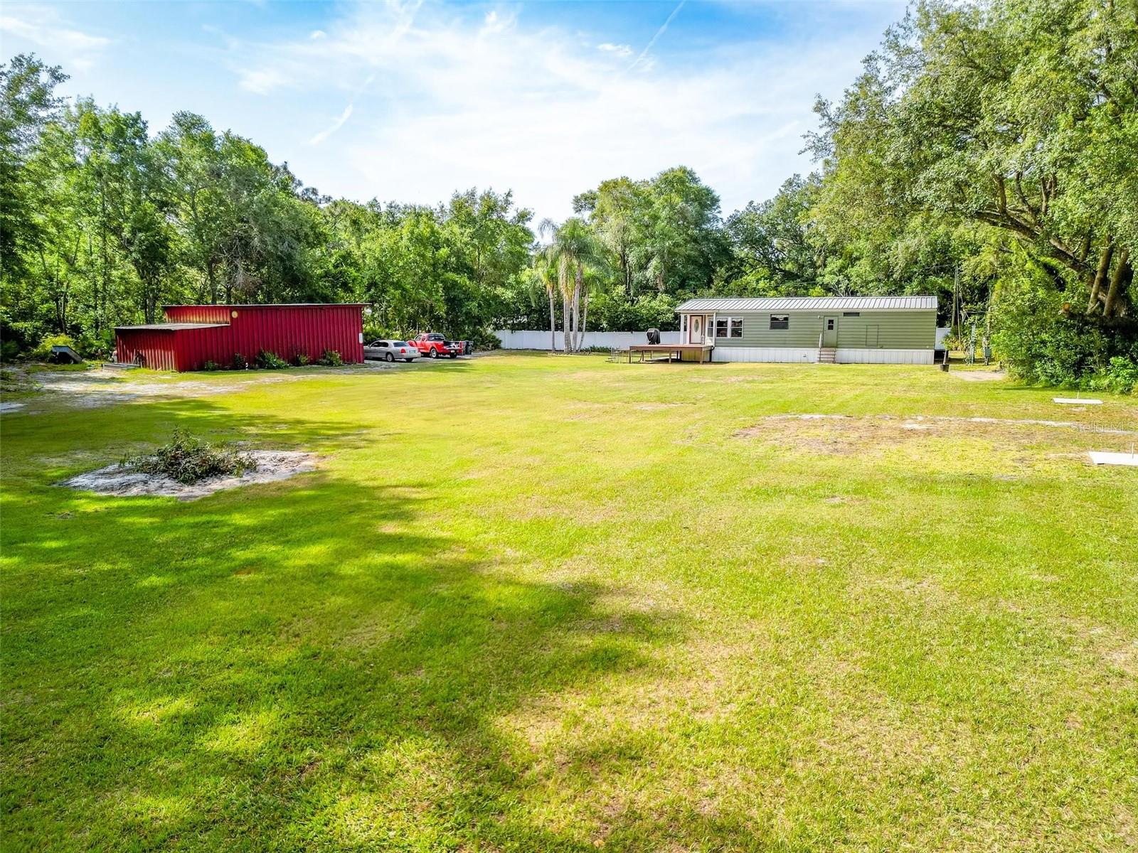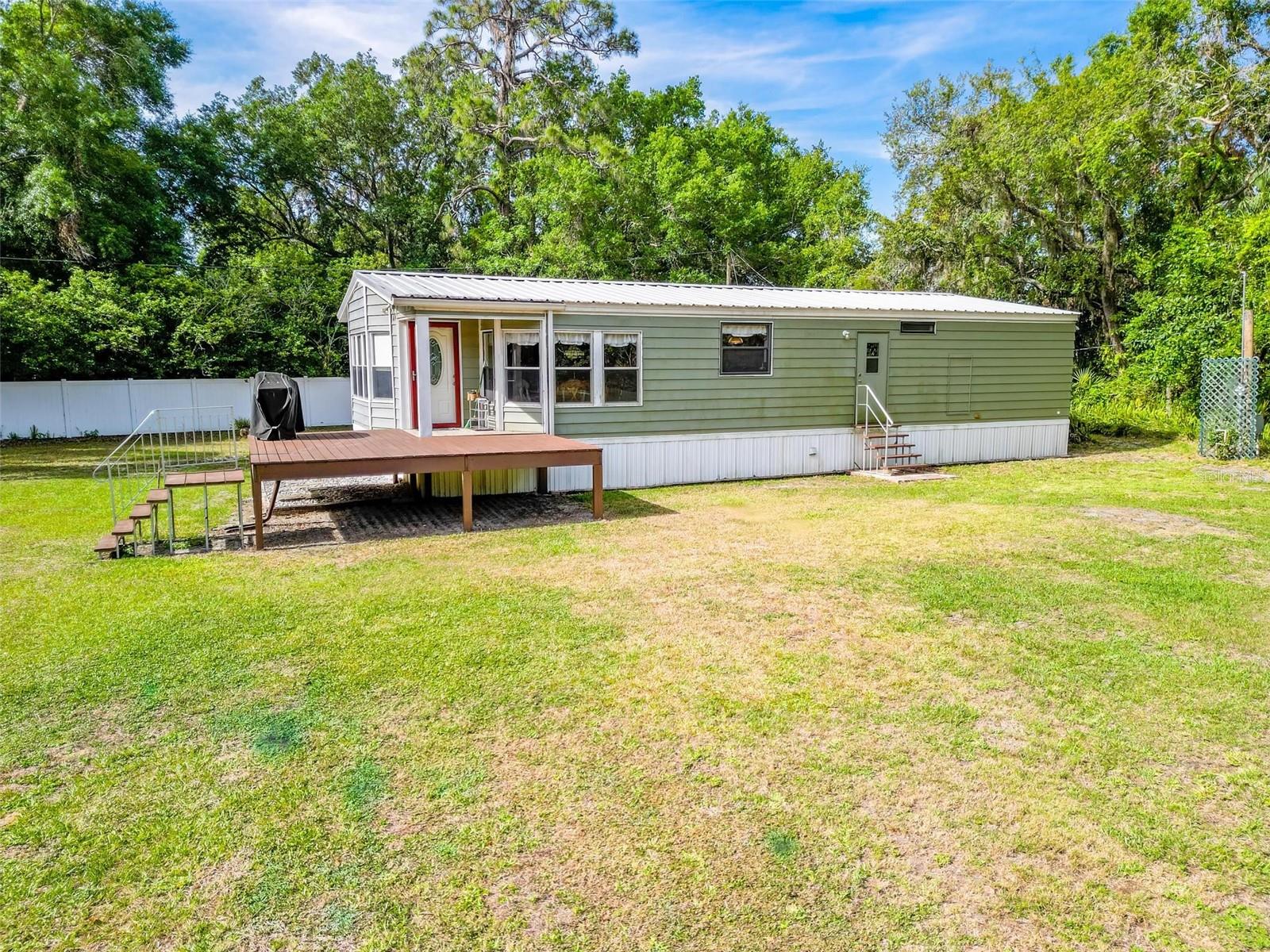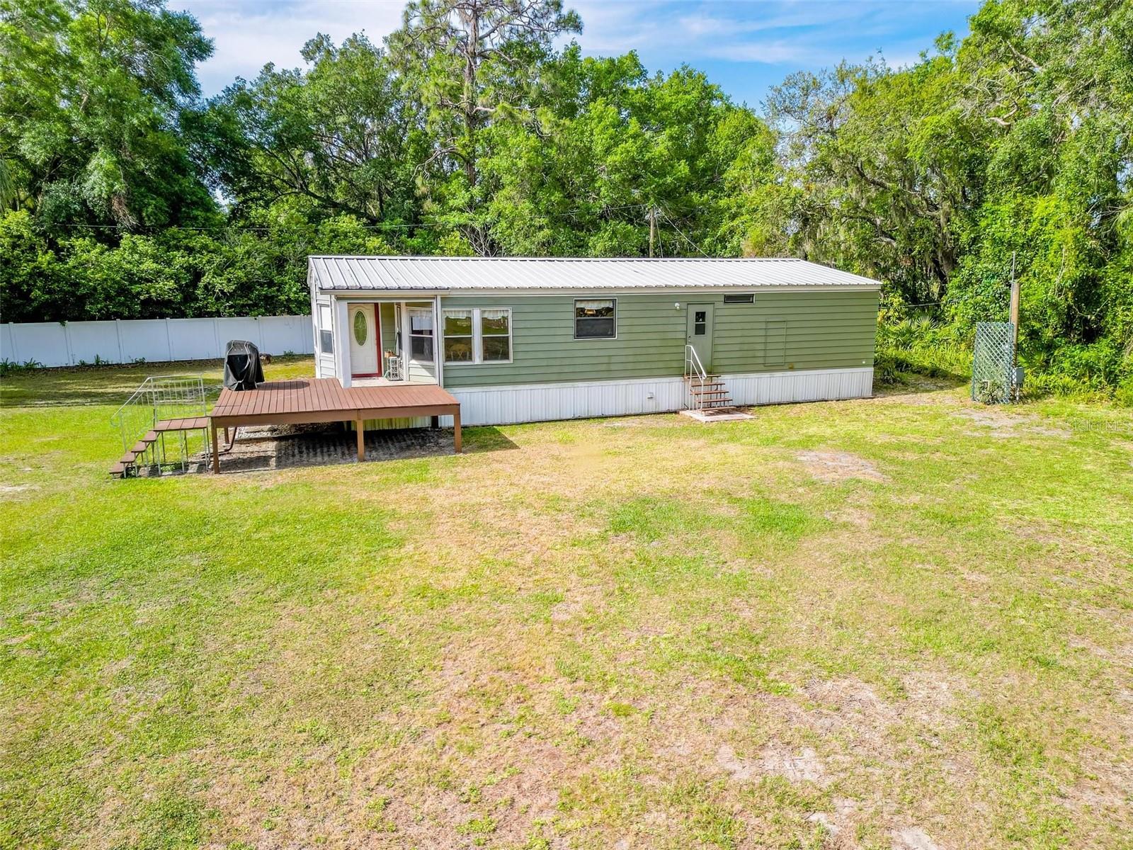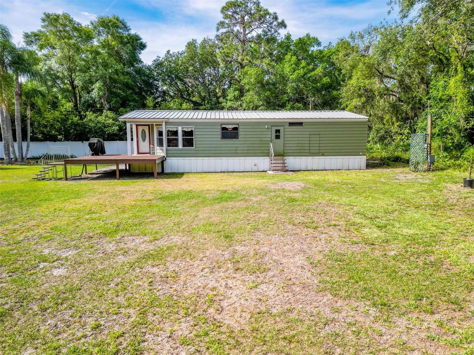 Welcome to your enchanting retreat, nestled on a sprawling 3.3 acres of vibrant greenery and surrounded by a picturesque landscape that provides both tranquility and privacy. This charming double-wide home boasts two bedrooms and two baths, making it an ideal escape for families or outdoor lovers alike. As you step inside, you are greeted by an inviting open-concept layout that seamlessly integrates the living, dining, and kitchen areas. Elegant solid bamboo flooring flows throughout the home, while cozy carpeting in the bedrooms ensures a comforting haven for rest. Large bay windows invite sunlight to dance across the space, framing delightful views of the lush surroundings. One of the standout features of this property is the expansive cleared area, offering a vast canvas for your outdoor dreams, whether it be gardening, recreation, or simply enjoying the serenity of nature. This cleared space is enveloped by a beautiful array of trees, providing a natural barrier for ultimate privacy. Step outside onto the large sun deck—perfect for soaking up the sun, hosting barbecues, or simply enjoying your morning coffee while basking in the beauty of your surroundings. This outdoor oasis will be your go-to spot for relaxation and gatherings with friends and family. For those who require extra storage or have a penchant for hobbies, this property comes equipped with both a storage building and a barn building—ideal for storing tools, equipment, using as a 4 car garage or even transforming into your dream workshop! Embrace the great outdoors with Lake Pierce just a stone's throw away, complete with a convenient boat ramp for all your water sports adventures. And when you need a taste of city life, you’re only 10 minutes from all essential amenities. Don’t let this unique opportunity slip away! Schedule your private tour today and step into a lifestyle where comfort meets nature. Your dream home awaits!