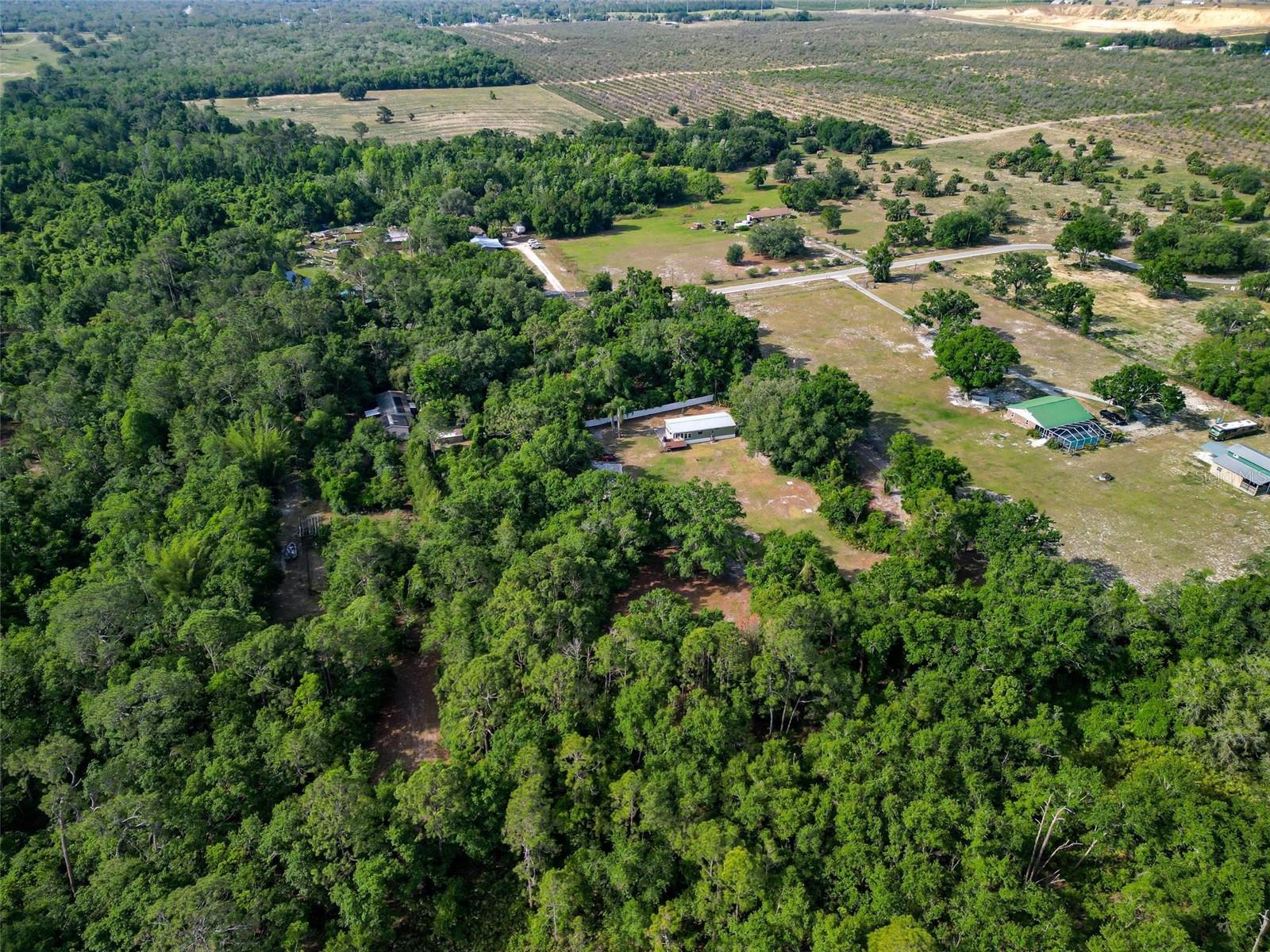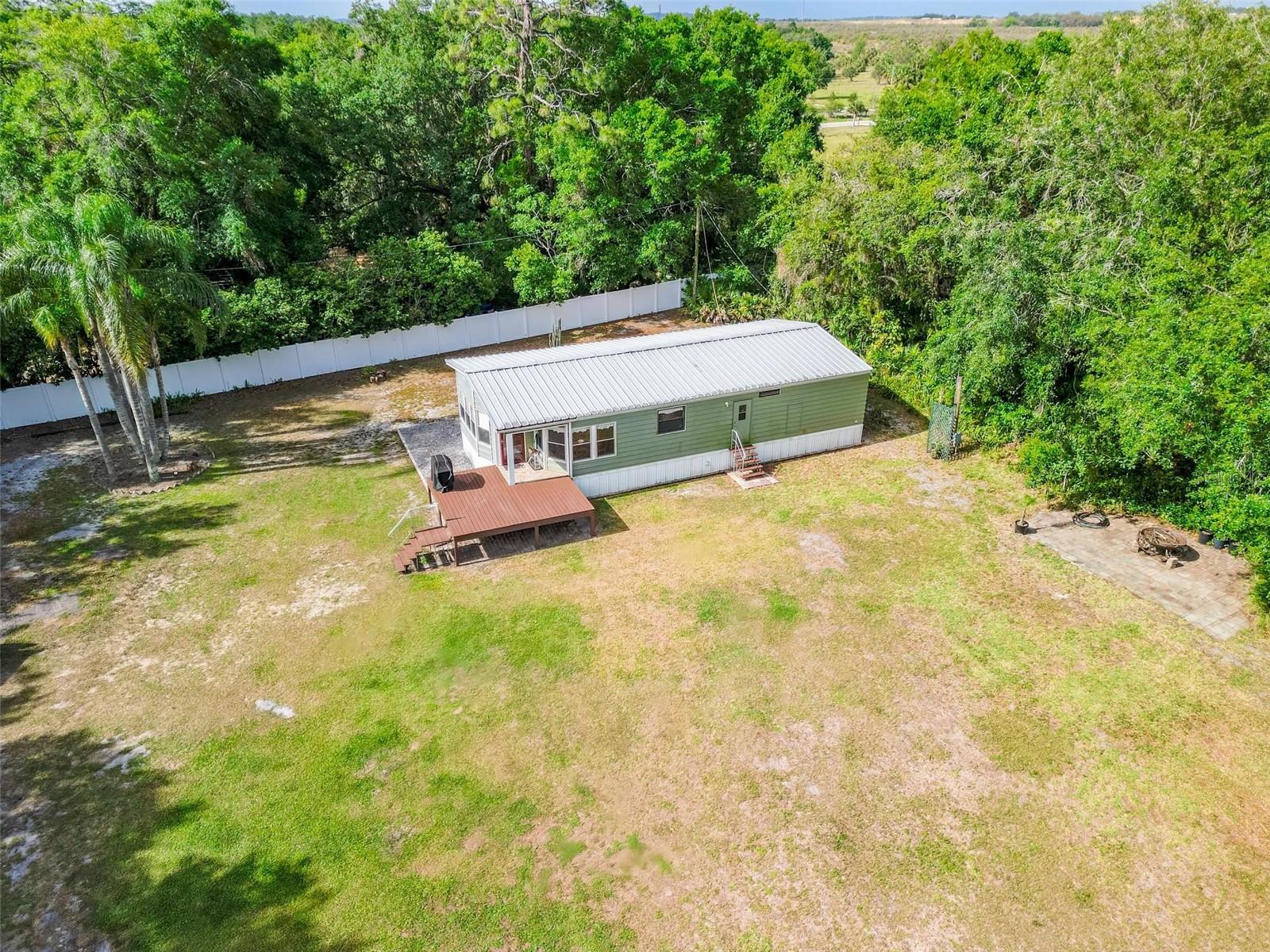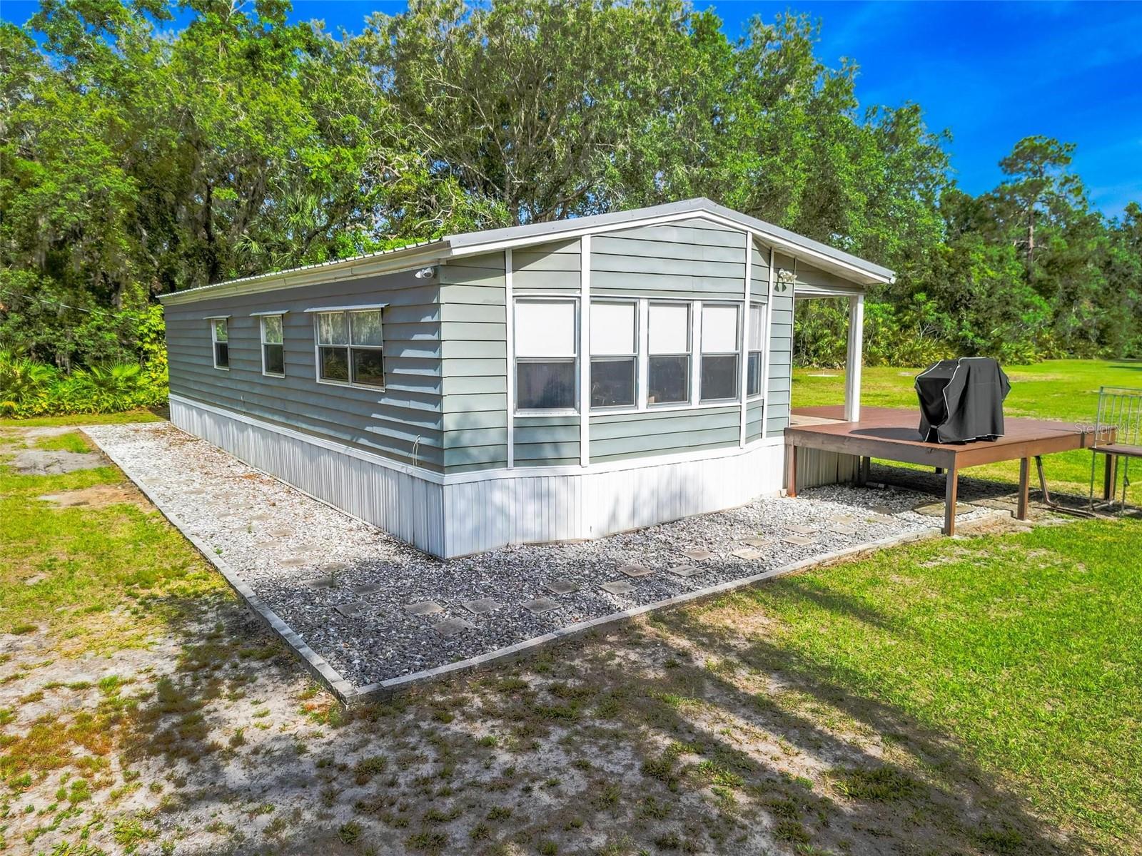 Welcome to your enchanting retreat, nestled on a sprawling 3.3 acres of vibrant greenery and surrounded by a picturesque landscape that provides both tranquility and privacy. This charming double-wide home boasts two bedrooms and two baths, making it an ideal escape for families or outdoor lovers alike. As you step inside, you are greeted by an inviting open-concept layout that seamlessly integrates the living, dining, and kitchen areas. Elegant solid bamboo flooring flows throughout the home, while cozy carpeting in the bedrooms ensures a comforting haven for rest. Large bay windows invite sunlight to dance across the space, framing delightful views of the lush surroundings. One of the standout features of this property is the expansive cleared area, offering a vast canvas for your outdoor dreams, whether it be gardening, recreation, or simply enjoying the serenity of nature. This cleared space is enveloped by a beautiful array of trees, providing a natural barrier for ultimate privacy. Step outside onto the large sun deck—perfect for soaking up the sun, hosting barbecues, or simply enjoying your morning coffee while basking in the beauty of your surroundings. This outdoor oasis will be your go-to spot for relaxation and gatherings with friends and family. For those who require extra storage or have a penchant for hobbies, this property comes equipped with both a storage building and a barn building—ideal for storing tools, equipment, using as a 4 car garage or even transforming into your dream workshop! Embrace the great outdoors with Lake Pierce just a stone's throw away, complete with a convenient boat ramp for all your water sports adventures. And when you need a taste of city life, you’re only 10 minutes from all essential amenities. Don’t let this unique opportunity slip away! Schedule your private tour today and step into a lifestyle where comfort meets nature. Your dream home awaits!