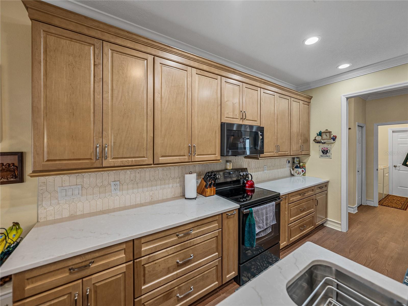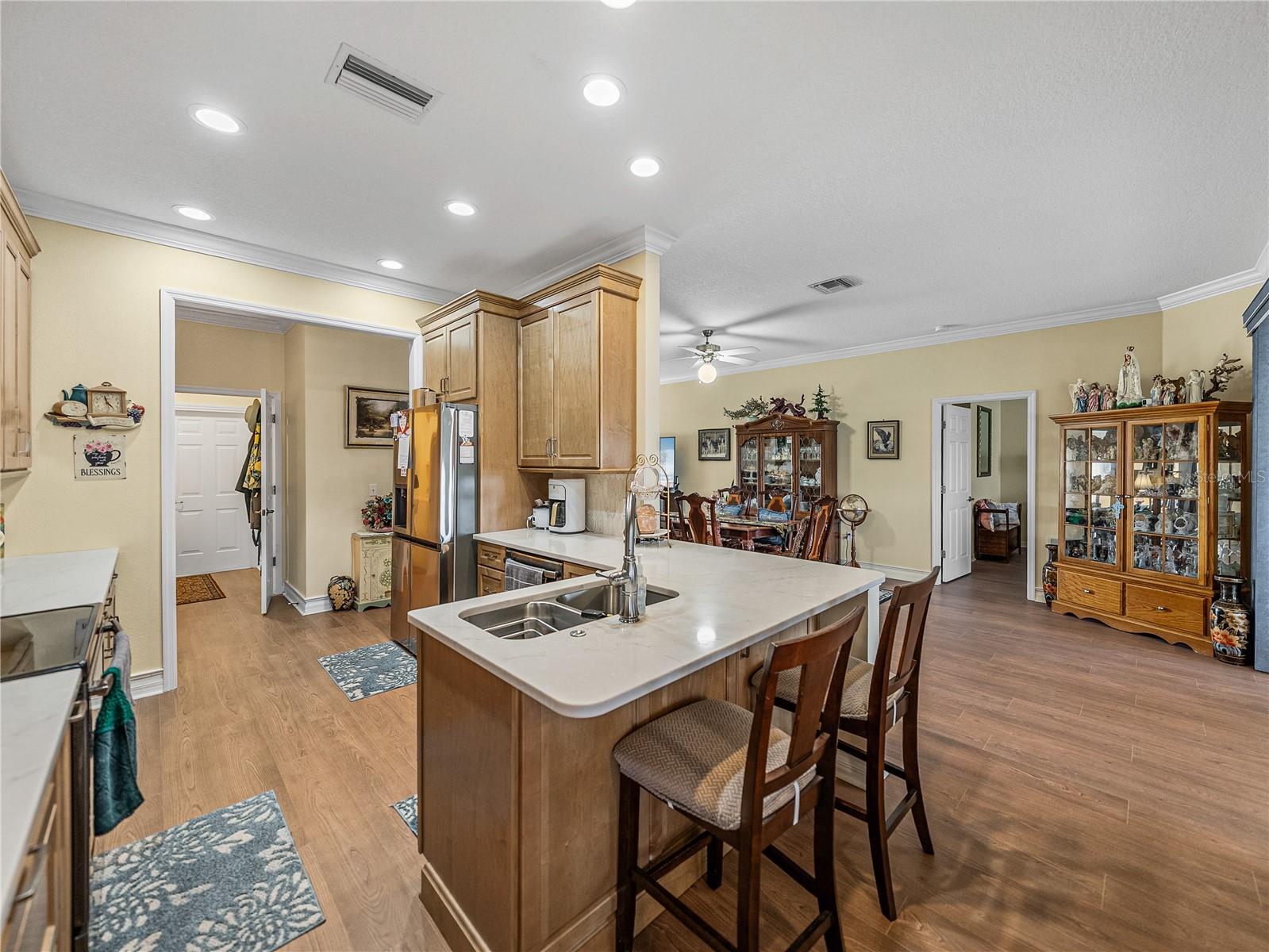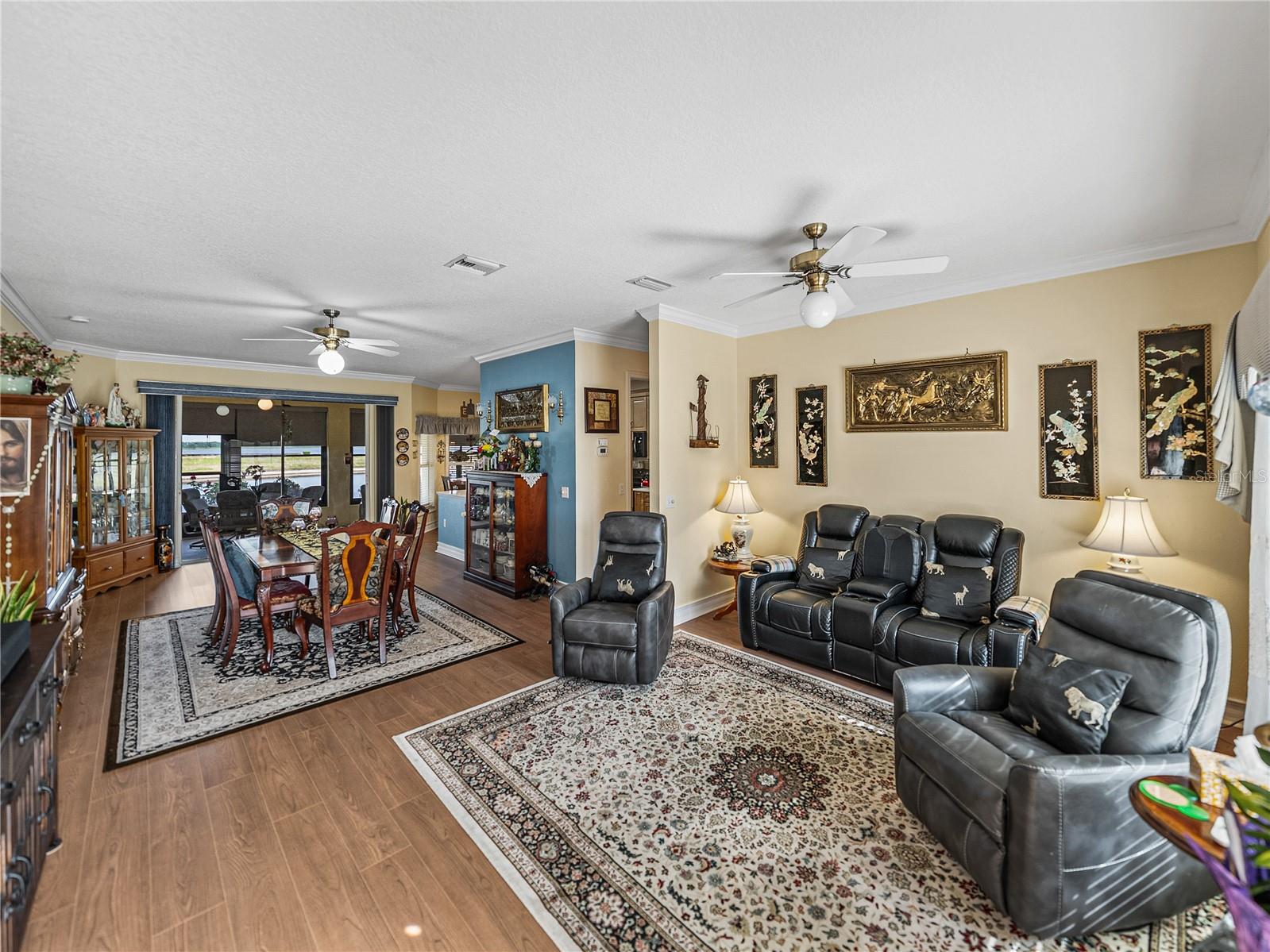 New Price! Stunning waterfront home with amazing views, 2.5/2.599APR assumable VA loan, and CDD bond paid in full! Enjoy breathtaking views of Lake Ashton, golf course greens, and serene ponds from this beautifully updated Provence split floor plan, ideally situated in the heart of Lake Ashton with convenient access to both clubhouses and the golf pro shop. Featuring 3 spacious bedrooms plus a large den or office, this split floor plan offers both functionality and style. Major updates completed in 2023 include: Brand-new kitchen with 42” cabinets, quartz countertops, updated sink and faucet, and new refrigerator. New luxury vinyl plank flooring throughout the entire home, fresh interior paint and added crown molding in the den/office, new split A/C unit in the enclosed lanai, whole-house insulation upgrade, including the garage, and solar panel system for energy savings. Additional 2024 updates include a freshly painted exterior, refreshed landscaping, and several replaced acrylic windows in the lanai. The roof is approximately 7 years old, and the HVAC system and appliances are about 6 years old, including the washer and dryer, which convey with the home. Other features include crown molding throughout, a whole-house water filtration system, and grid-loc style flooring in the garage. This move-in ready home is a true gem in an active and amenity-rich 55+ golf community. Lake Ashton offers two 18-hole golf courses, two clubhouses, card rooms, fitness centers, craft rooms, a bowling alley, movie theatre, pickleball, tennis, bocce ball, and more. Best of all, this home offers a low-interest assumable VA loan, making it an exceptional opportunity for qualified buyers! Don’t miss your chance to own this exceptional home with an assumable VA loan and no CDD bond debt. Call today to schedule your private tour of both the home and the community!
