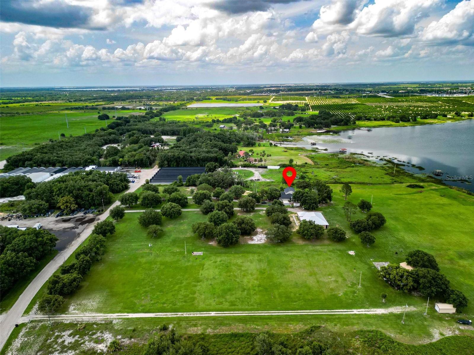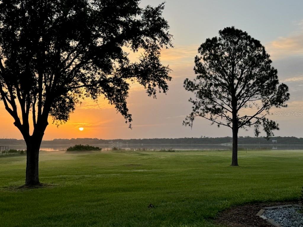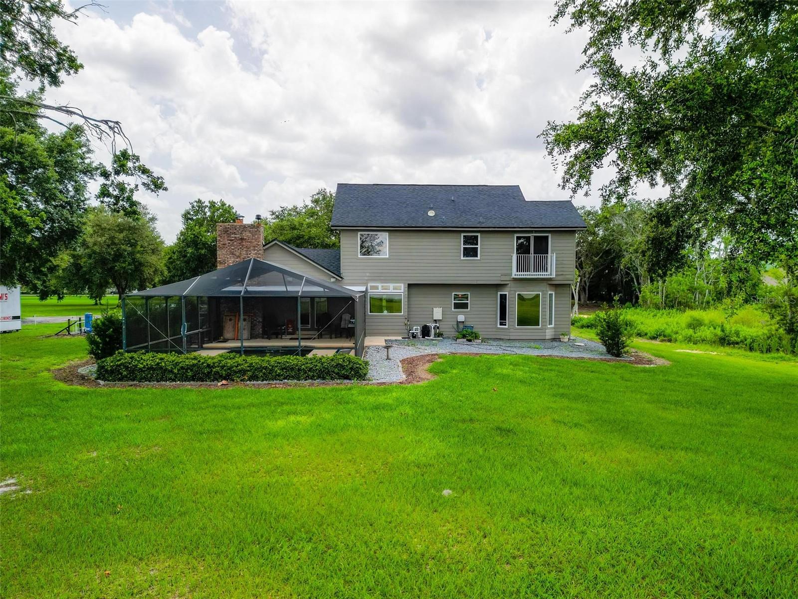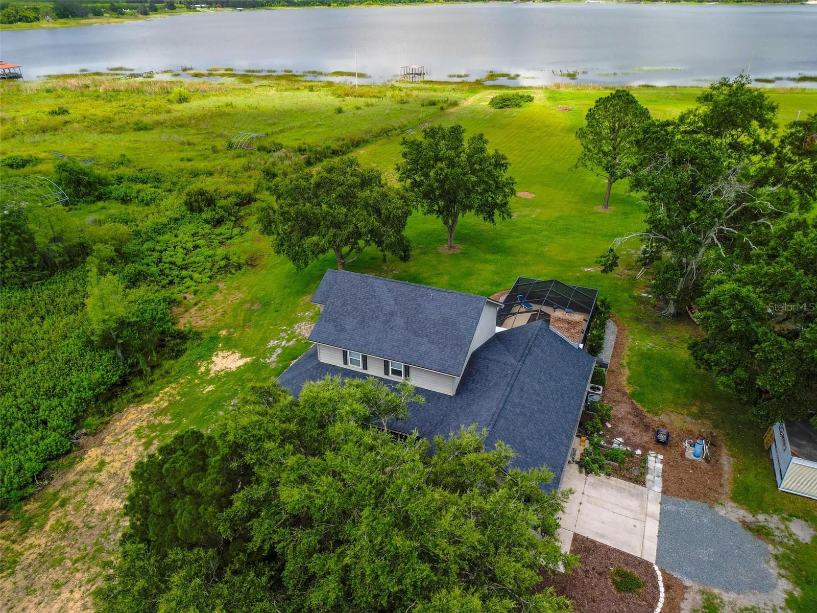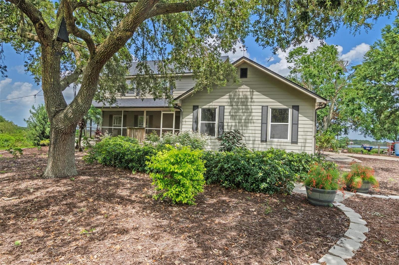 One or more photo(s) has been virtually staged. Discover your dream lakefront oasis on Lake Annie, where breathtaking sunrises greet you each morning and the world feels a million miles away. Situated on a private road, this stunning property boasts 5 acres of lakefront beauty adorned with mature trees, plus an additional fenced and gated 3.5 acres across the road, offering ample space and privacy with room for livestock. As you drive down the winding path, you’ll truly leave the world behind. The home features a natural color PebbleTec pool that seamlessly blends into the landscape, creating a perfect retreat for relaxation. The screen-enclosed pool area allows you to enjoy the crisp autumn breezes without the annoyance of bugs, while the screened front porch invites you to open the doors and let refreshing air flow through the home. Inside, the spacious open floor plan is accentuated by elegant travertine floors and Silestone engineered quartz countertops in the kitchen, complemented by huge windows that flood the space with natural light. The formal living room showcases engineered hardwood flooring, and the family room boasts a charming brick fireplace, creating a cozy atmosphere for gatherings. A formal dining room provides an ideal setting for entertaining. Ascend the extra-wide wood stairway to find an inviting open area crowned with a picture window that frames stunning lake views, where you can also catch glimpses of rocket launches in the distance. The upstairs area features luxury vinyl plank flooring throughout, including an en-suite bath in the master bedroom. This home is equipped with a generator transfer switch and generator for peace of mind, as well as a water filtration system for clean, refreshing water. With tons of storage and three interior rooms that can serve as protective shelters during hurricane season, this property is not just a home; it’s a sanctuary waiting for you to make it your own. Conveniently located just 2 miles from Highway 27, shops, and restaurants, this is the perfect blend of seclusion and accessibility.