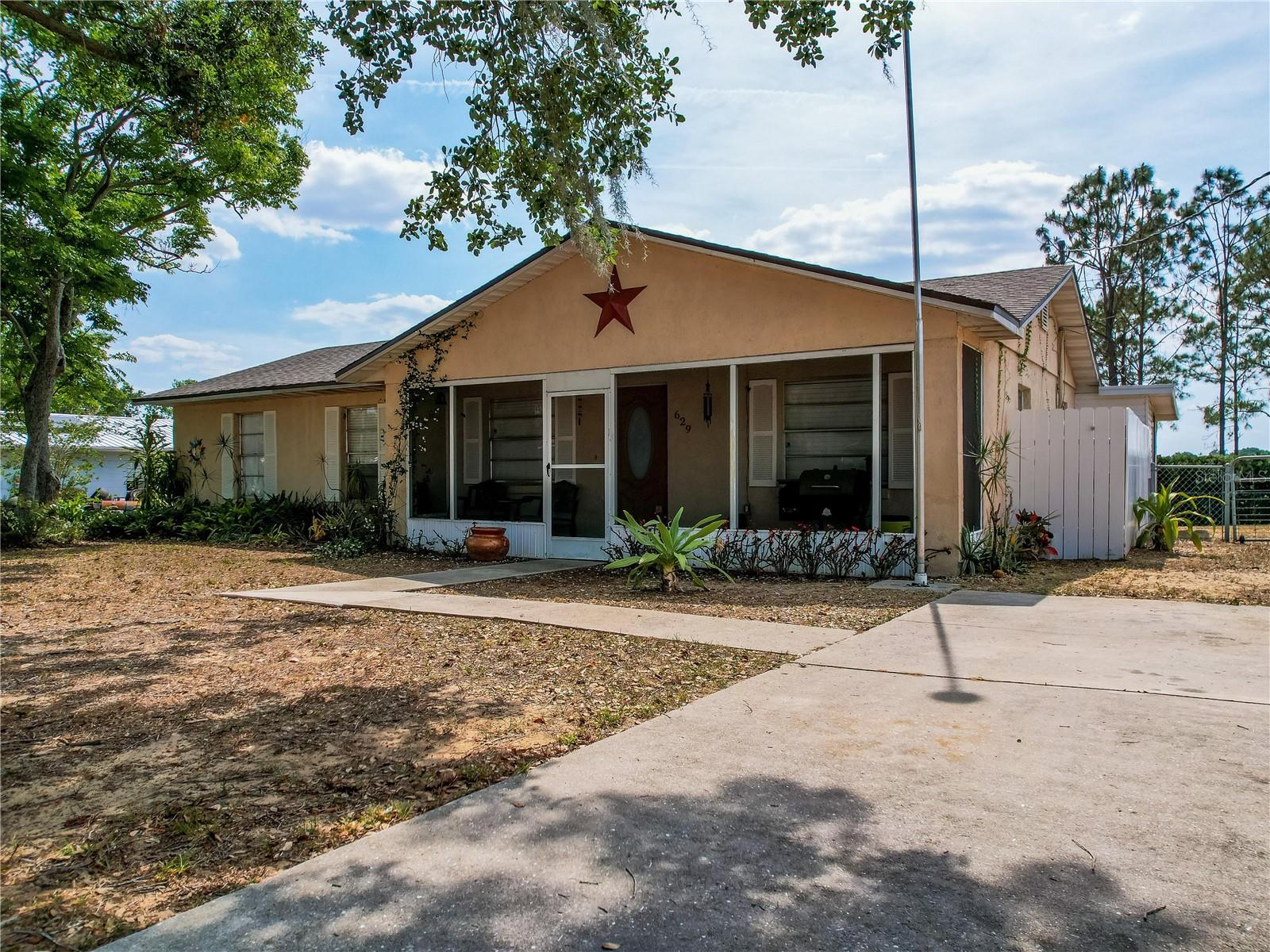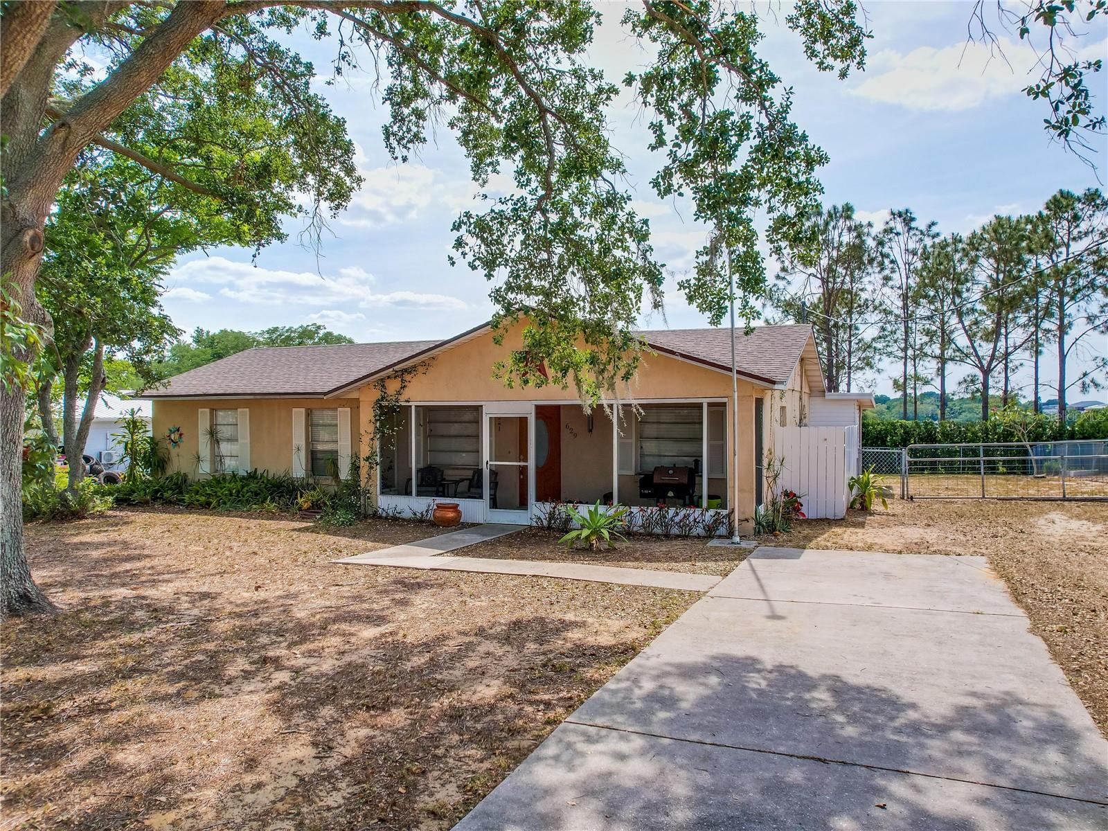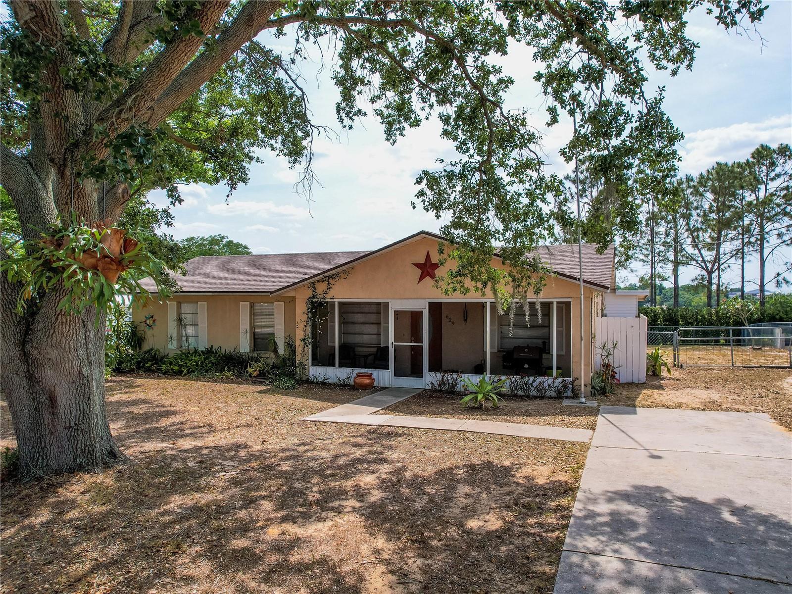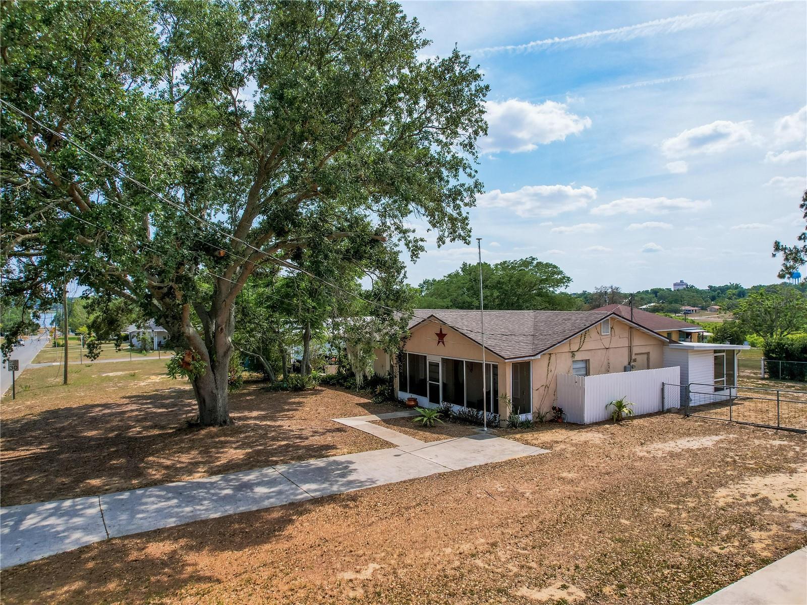 Welcome to your dream home! Featuring a brand-new roof installed in 2023, this beautifully maintained 3-bedroom, 2-bathroom property sits on over a quarter-acre of fully fenced land, offering 1,250 square feet of comfort, style, and peace of mind. Enjoy stunning sunset views over Spook Hill and North Lake Wales Lake—all with no HOA and no CDD restrictions. Step inside from the charming screened-in front porch to discover a spacious family room highlighted by a shiplap accent wall and gleaming laminate floors throughout. Tile flooring in the kitchen and bonus room makes for easy maintenance—perfect for busy households and pet owners. The large kitchen offers plenty of space and scenic views, while the separate formal dining room is ideal for family meals and entertaining. The primary bedroom comfortably fits a king-sized bed and features a private en-suite bathroom with a large walk-in shower and an updated vanity. The second full bathroom also includes an updated vanity and a convenient tub-shower combo. Attractive wall accent trim throughout the bedrooms adds a polished, custom touch. Outdoor living is a dream with both a front screened porch and an extended rear screened porch, complete with an external TV hookup—perfect for relaxing or hosting gatherings. Three exterior storage sheds provide ample space for tools, toys, and equipment. Additional updates, including the upgraded electrical panel, ensure this move-in ready home checks all the boxes. Homes offering this level of value, updates, and freedom are rare—schedule your private showing today!
