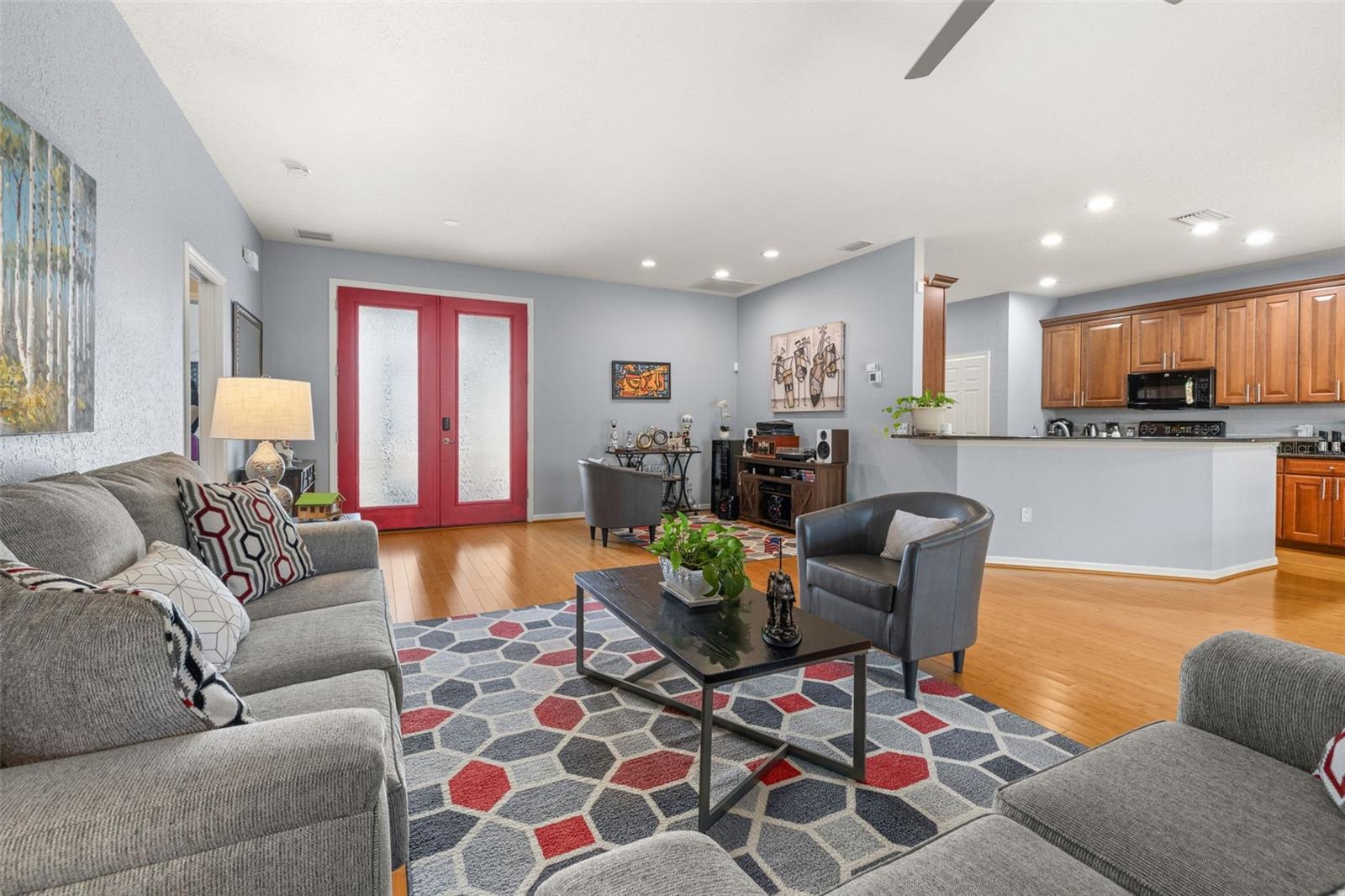 Welcome to this stunning, move-in-ready home located in one of Lake Wales’ most desirable 55+ communities. Featuring 2 bedrooms and 2 bathrooms, this property has been meticulously maintained and thoughtfully upgraded for comfort and style. Step through the screened entryway and into the home through elegant French doors, where you’ll find a spacious open layout with bamboo flooring throughout the main living areas. The oversized living room offers ample space for relaxing or entertaining, flowing seamlessly into a customized kitchen complete with 42” all-wood cabinets, granite countertops, and a modern design ideal for any home chef. The master suite includes dual closets and an ensuite bath featuring an updated walk-in tile shower and matching granite vanity. The second bedroom is generously sized with convenient access to a full guest bathroom. Enjoy the Florida lifestyle year-round in your beautifully extended screened lanai, surrounded by lush greenery, mature plants, and trees—creating a peaceful, private outdoor retreat. The roof is just 2 years old, adding extra peace of mind. Located in a vibrant, amenity-rich community that spans over 1,200 scenic acres and is nestled among three spectacular lakes and nature preserves, you’ll enjoy a serene environment with opportunities for walking, biking, and wildlife viewing.