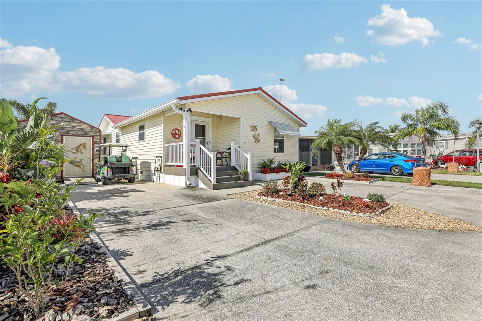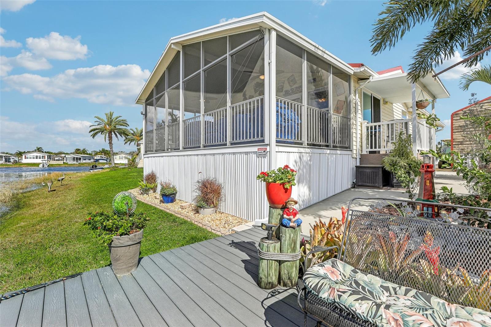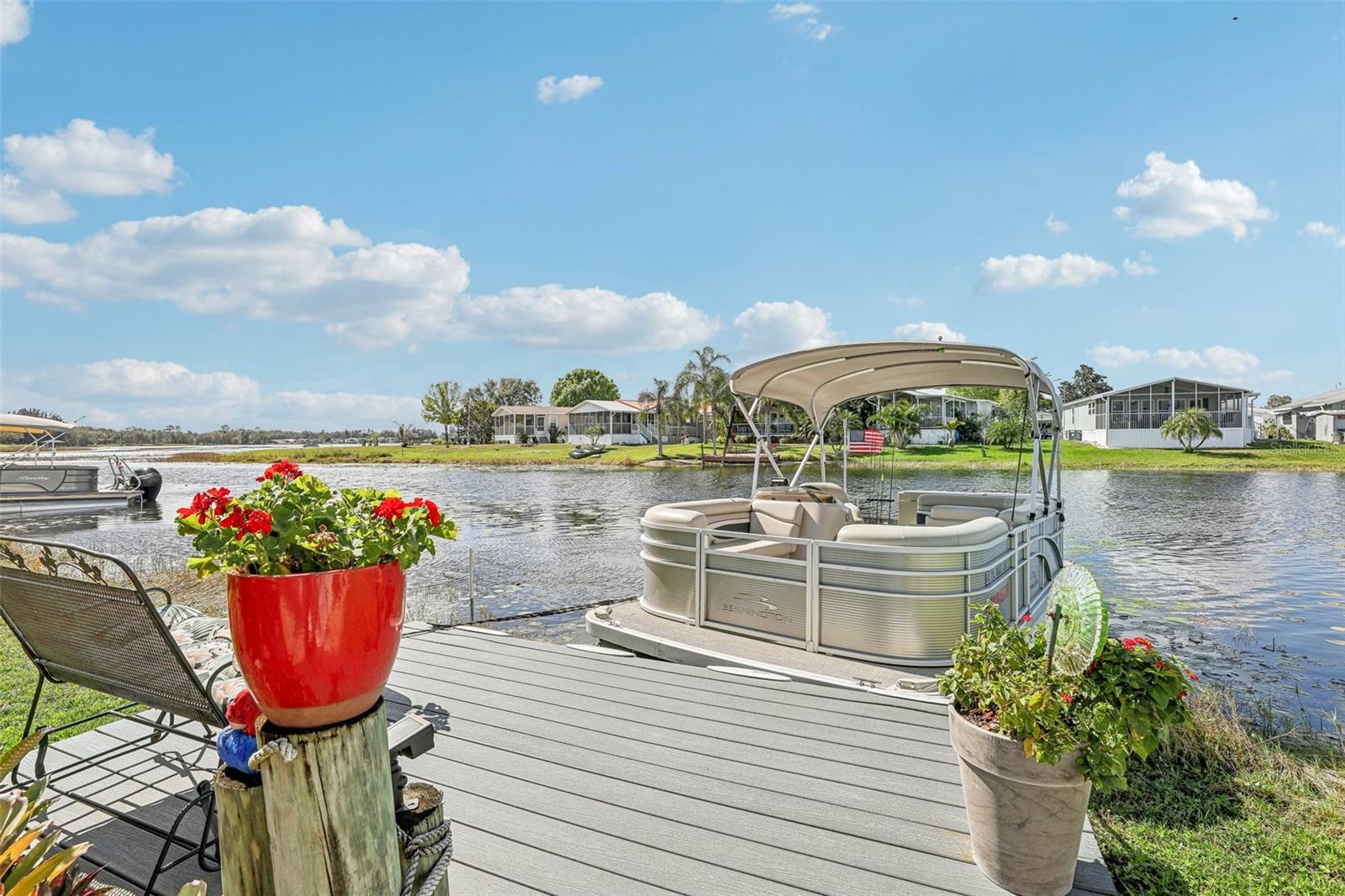 55+ Private Waterfront Home! Welcome to Saddlebag Lake Resort, a premier 55+ gated community where you can enjoy private waterfront living with your own pier and direct lake access! Whether you love boating, fishing, or simply relaxing by the water, this home offers the ultimate Florida lifestyle. Sit back and take in the serene views from your spacious 12x24 screened lanai, complete with ceiling fans with lights and roller shades for added comfort. A double driveway provides ample parking, and a 10x10x10 Smithbilt shed with AC makes a great workshop, man cave, or she-shed. This home is being sold turnkey and mostly furnished —just bring your suitcase and start enjoying life at the lake! (Please note: Lanai and front porch furniture does not stay.) Inside, the bright and open living room is filled with natural light, thanks to large windows showcasing water views. The sunny dining area offers picturesque scenery from multiple angles, while the roomy kitchen is designed for both style and function, featuring a snack bar for extra seating, a closet pantry, and wood cabinets with pull-out lower shelves to keep everything organized. The primary suite includes a private bath with Safe Step jetted walk-in tub with two showerheads. A dedicated laundry room provides additional storage space too. Recent upgrades ensure peace of mind, including a metal roof installed in 2023 and a Carrier brand HVAC system installed in 2020. Bonus! Boat & Golf Cart for Sale! For those who love exploring the water, a 2019 18ft Bennington boat with a 60HP Yamaha motor and trailer (2023) is available for purchase. A golf cart with new Trojan batteries is also for sale, perfect for getting around the neighborhood and enjoying everything the community has to offer. Beyond your private retreat, Saddlebag Lake Resort offers an unparalleled lifestyle with an incredible range of clubs, activities, and amenities. Residents enjoy: Clubhouse with full kitchen & planned activities, Swimming pool, hot tub, and sauna, Tennis & pickleball courts, Shuffleboard & horseshoe pits, Golf range, Billiards & game room, Library & exercise building, Dog park & dog wash station, Boat launch & community dock. Keep your calendar full with community events like Bingo, craft groups, potlucks, card games (euchre, rummy, bridge, etc.), block parties, and Canada Day celebrations. One of the highlights of the year is the Christmas boat parade and golf cart parade, where residents decorate their boats and carts with festive lights and music, creating a magical holiday experience! Whether you're looking for an active lifestyle or a peaceful retreat, this home and community offer the best of both worlds. Schedule your private tour today and experience the Saddlebag Lake lifestyle for yourself!