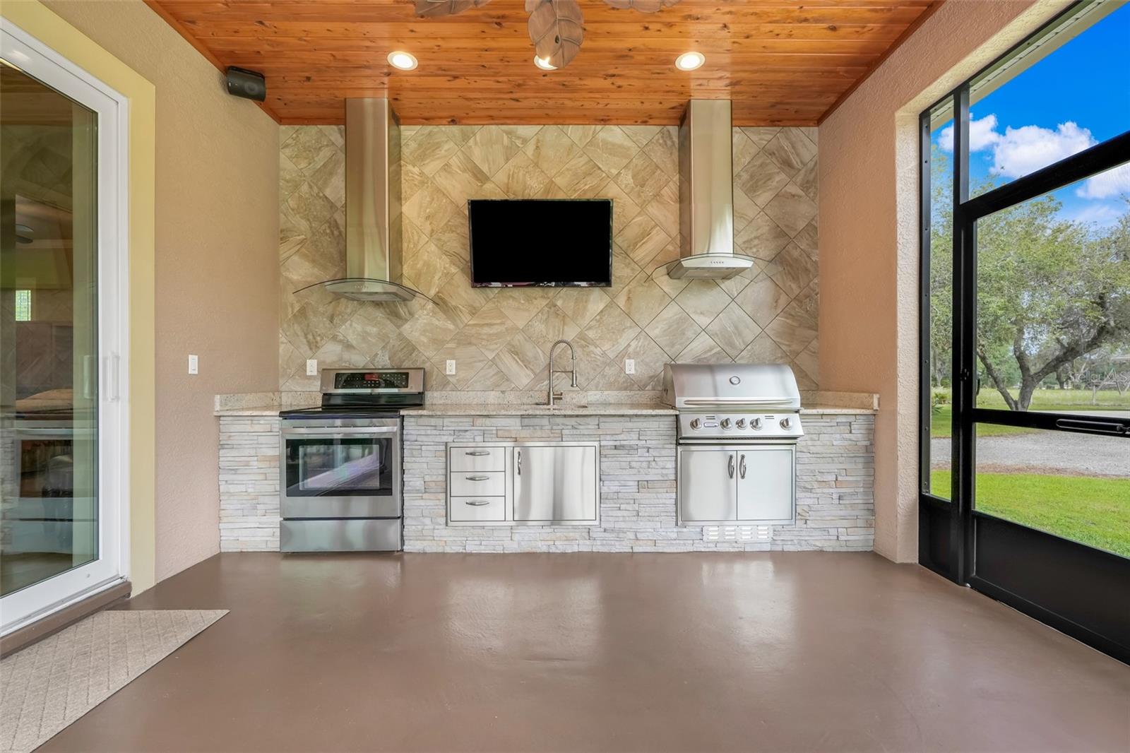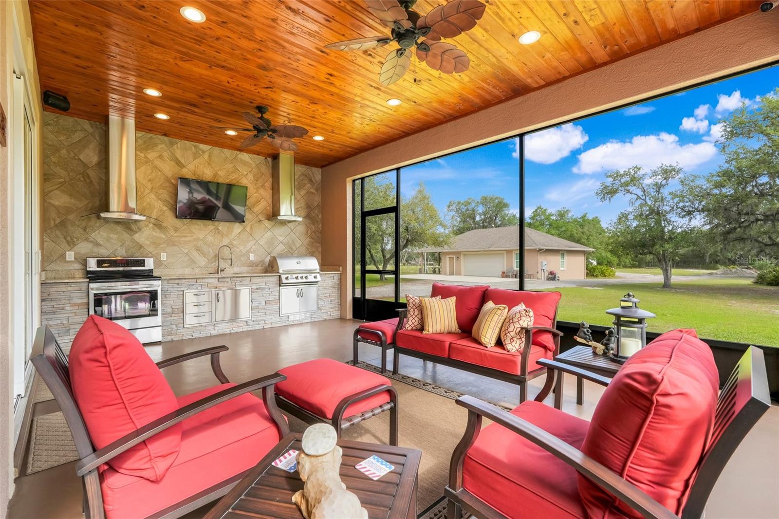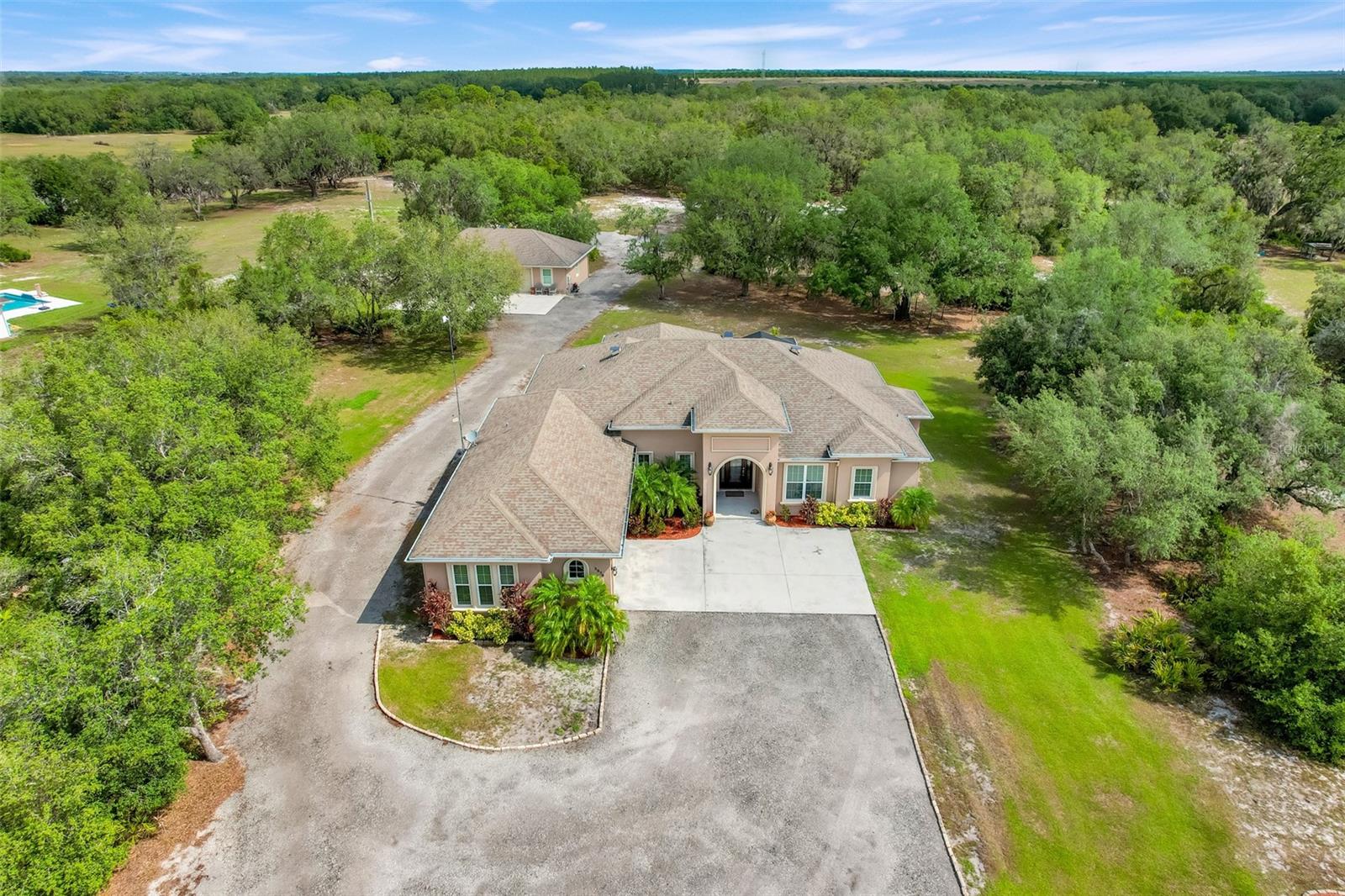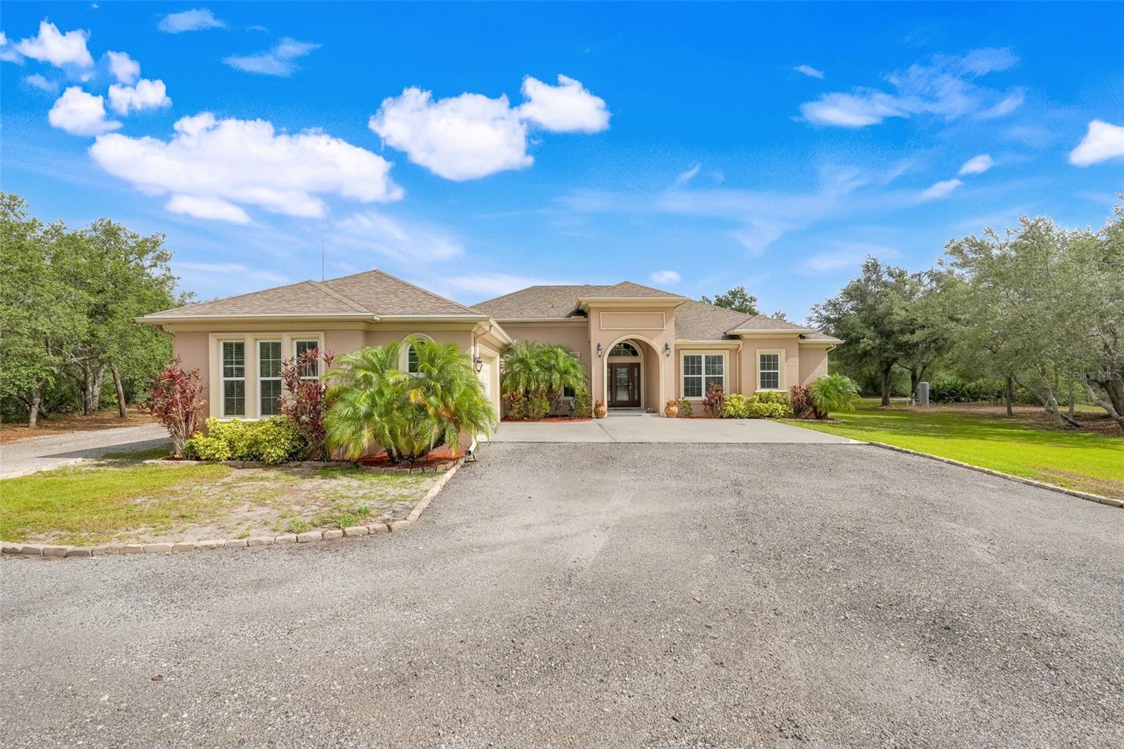 Welcome to a One-of-a-Kind Energy-Efficient Custom Home with Workshop & Outdoor Kitchen in Lake Wales, FL! This is ‘A MUST SEE!’ Make this custom-built, energy-efficient gem your forever home! Nestled on a private, gated 4.79-acre oasis in Lake Wales FL, this stunning 3-bedroom, 3-bathroom home boasts 2,999 sq ft of luxury living with unmatched craftsmanship and efficiency. Step through a solar-powered gate and into elegance via a solid mahogany front door with patina leaded glass. Inside, soaring 10’–14’ ceilings and oversized crown and base molding set the tone, complemented by ambient rope lighting in the great room, primary suite, and above the custom Knotty Alder kitchen cabinetry. This kitchen boasts top of the line stainless steel appliances, Bosch induction cooktop, oven, microwave, LG French Door Refrigerator and an Electrolux 45 Bottle Wine Cooler. Designed with energy performance in mind, this 2016-built home features, Dual Trane 17 SEER HVAC units with hard cast ductwork and individual room return vents. The R-56 insulated attic with foil-backed decking has three solar vents for air circulation. All exterior block walls are Foam-filled with polystyrene board insulation, enjoy the Argon-filled Low-E insulated windows with wood casings, Two Rinnai tankless water heaters, Porcelain tile flooring (reinforced with Schluter DITRA underlayment) extends through high-traffic areas, while both primary suites has custom closet systems. For peace of mind, a reinforced safe room with concrete block walls, 5/8” rebar, and a steel door is built to withstand extreme weather. Perfect for entertaining, the home opens to an 18’ x 12’ screened lanai with a knotty wood ceiling, four ceiling fans, and built-in audio. The adjacent outdoor kitchen includes a Built-In gas grill and LG range with stainless steel vent hoods, granite countertops, faux rock finishes, and ample cabinetry. Bonus features include, a 1,560 sq ft fully serviced, insulated, and AC-cooled workshop with 200-amp electrical service and a 1,300 sq ft front pad—ideal for conversion to living space, Oversized insulated garage doors (18’ x 8’) with R-56-rated insulation, Zoned sprinkler system with raised garden beds and a dedicated water line, 8 security cameras, LED lighting, abundant electrical outlets, Generator-ready electrical/propane hookup, Finished RV pad with underground electric. Located just 15 miles from Legoland and under an hour from Disney World, this exceptional property offers luxury, sustainability, and privacy, making it a true hidden gem in Central Florida. Schedule your private showing today and fall in love with your forever home!