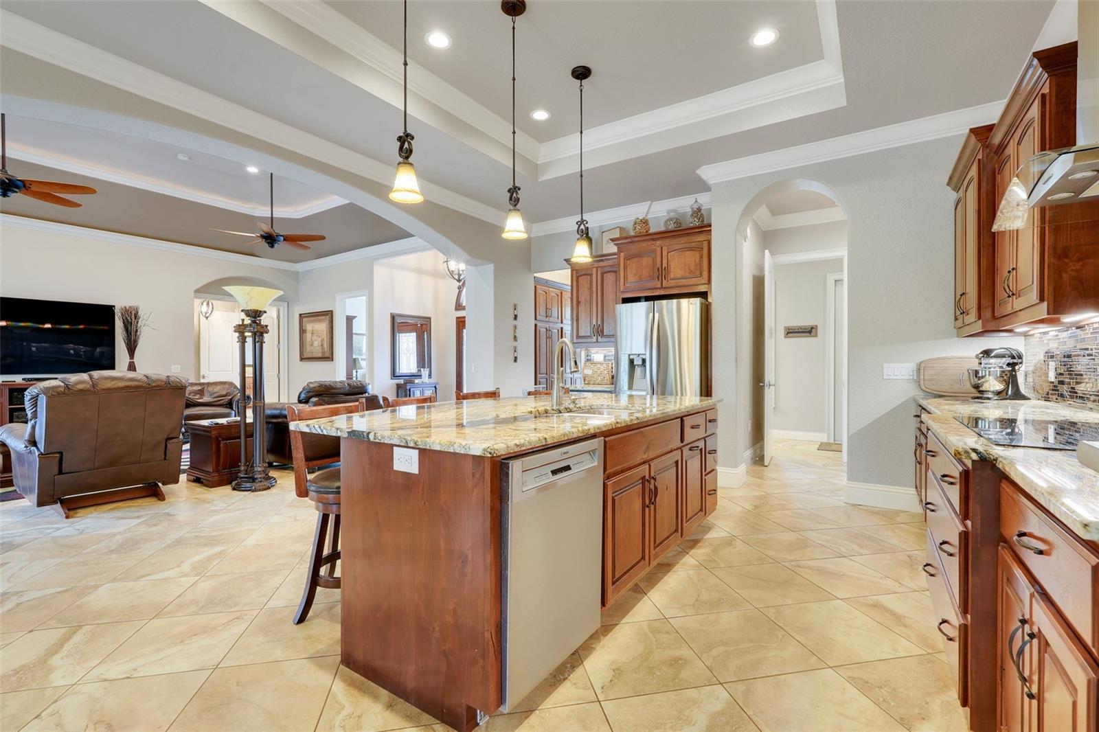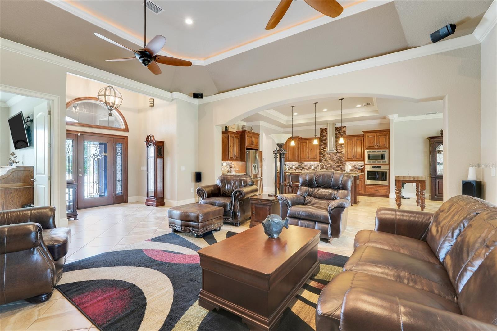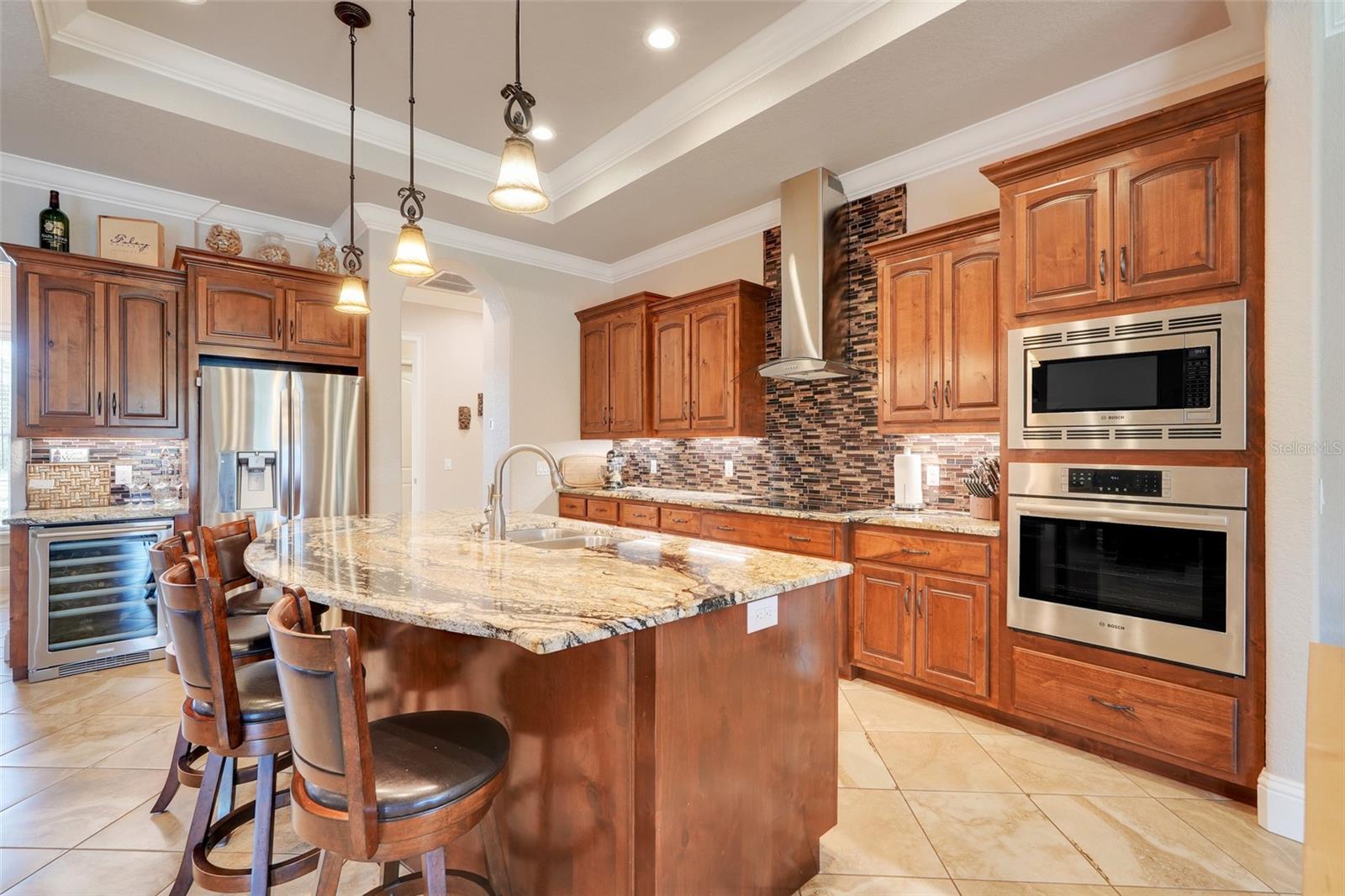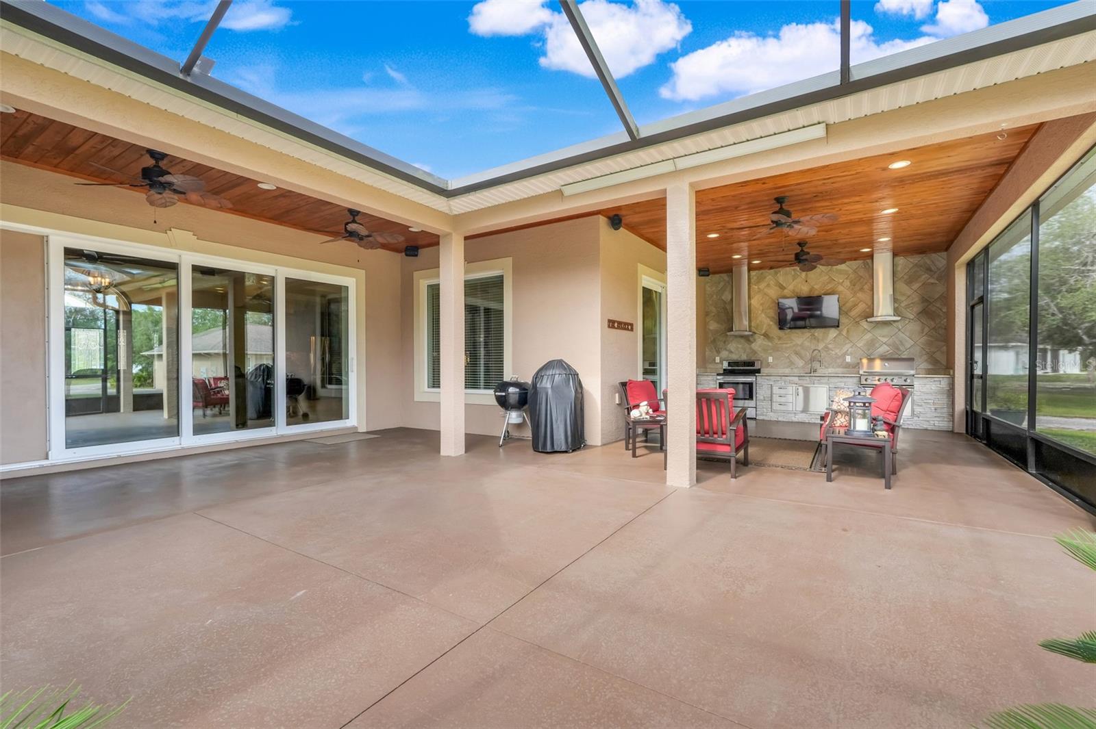 Welcome to a One-of-a-Kind Energy-Efficient Custom Home with Workshop & Outdoor Kitchen in Lake Wales, FL! This is ‘A MUST SEE!’ Make this custom-built, energy-efficient gem your forever home! Nestled on a private, gated 4.79-acre oasis in Lake Wales FL, this stunning 3-bedroom, 3-bathroom home boasts 2,999 sq ft of luxury living with unmatched craftsmanship and efficiency. Step through a solar-powered gate and into elegance via a solid mahogany front door with patina leaded glass. Inside, soaring 10’–14’ ceilings and oversized crown and base molding set the tone, complemented by ambient rope lighting in the great room, primary suite, and above the custom Knotty Alder kitchen cabinetry. This kitchen boasts top of the line stainless steel appliances, Bosch induction cooktop, oven, microwave, LG French Door Refrigerator and an Electrolux 45 Bottle Wine Cooler. Designed with energy performance in mind, this 2016-built home features, Dual Trane 17 SEER HVAC units with hard cast ductwork and individual room return vents. The R-56 insulated attic with foil-backed decking has three solar vents for air circulation. All exterior block walls are Foam-filled with polystyrene board insulation, enjoy the Argon-filled Low-E insulated windows with wood casings, Two Rinnai tankless water heaters, Porcelain tile flooring (reinforced with Schluter DITRA underlayment) extends through high-traffic areas, while both primary suites has custom closet systems. For peace of mind, a reinforced safe room with concrete block walls, 5/8” rebar, and a steel door is built to withstand extreme weather. Perfect for entertaining, the home opens to an 18’ x 12’ screened lanai with a knotty wood ceiling, four ceiling fans, and built-in audio. The adjacent outdoor kitchen includes a Built-In gas grill and LG range with stainless steel vent hoods, granite countertops, faux rock finishes, and ample cabinetry. Bonus features include, a 1,560 sq ft fully serviced, insulated, and AC-cooled workshop with 200-amp electrical service and a 1,300 sq ft front pad—ideal for conversion to living space, Oversized insulated garage doors (18’ x 8’) with R-56-rated insulation, Zoned sprinkler system with raised garden beds and a dedicated water line, 8 security cameras, LED lighting, abundant electrical outlets, Generator-ready electrical/propane hookup, Finished RV pad with underground electric. Located just 15 miles from Legoland and under an hour from Disney World, this exceptional property offers luxury, sustainability, and privacy, making it a true hidden gem in Central Florida. Schedule your private showing today and fall in love with your forever home!