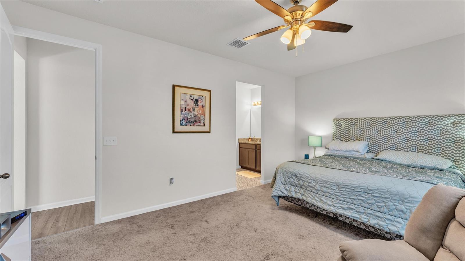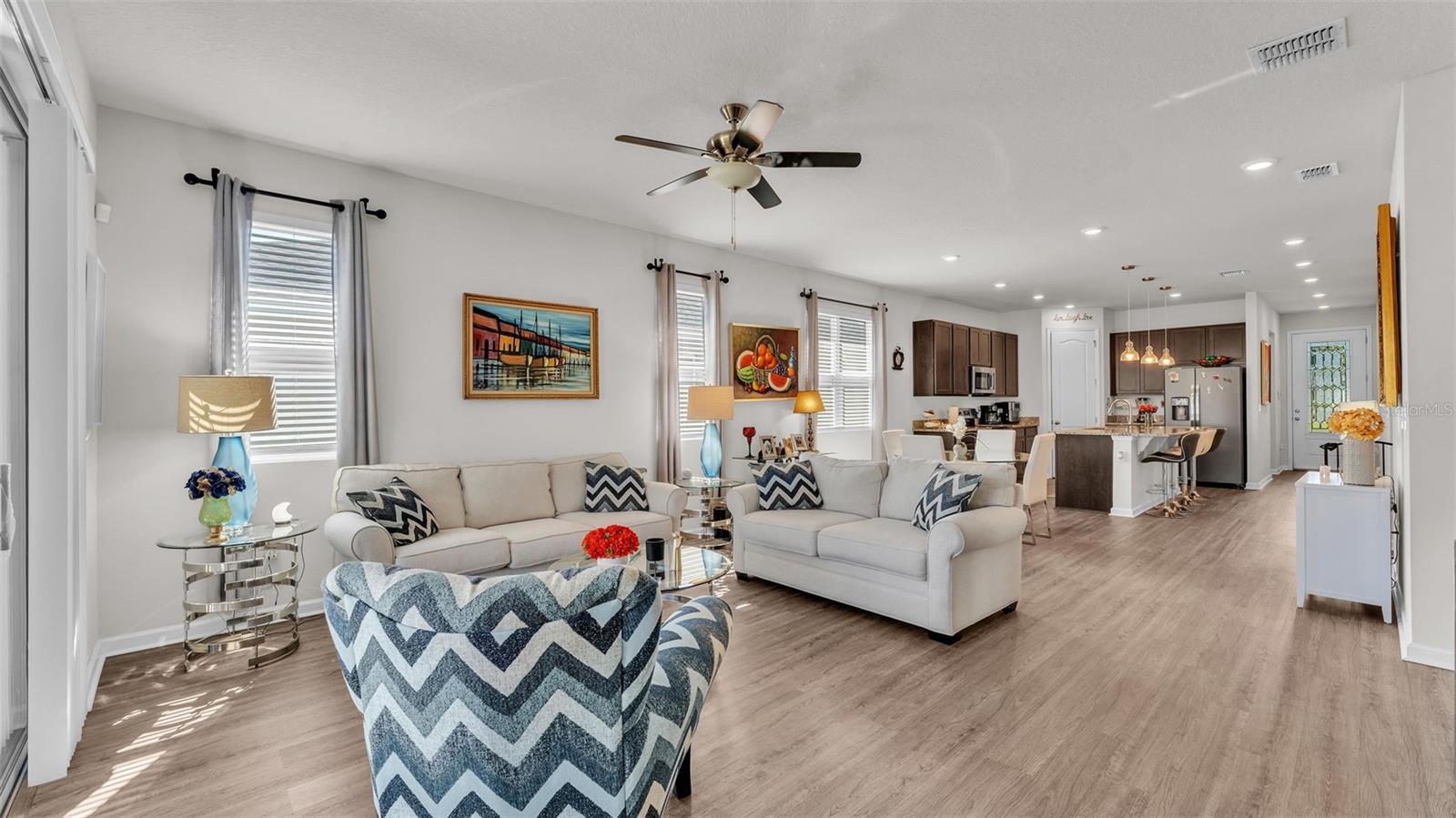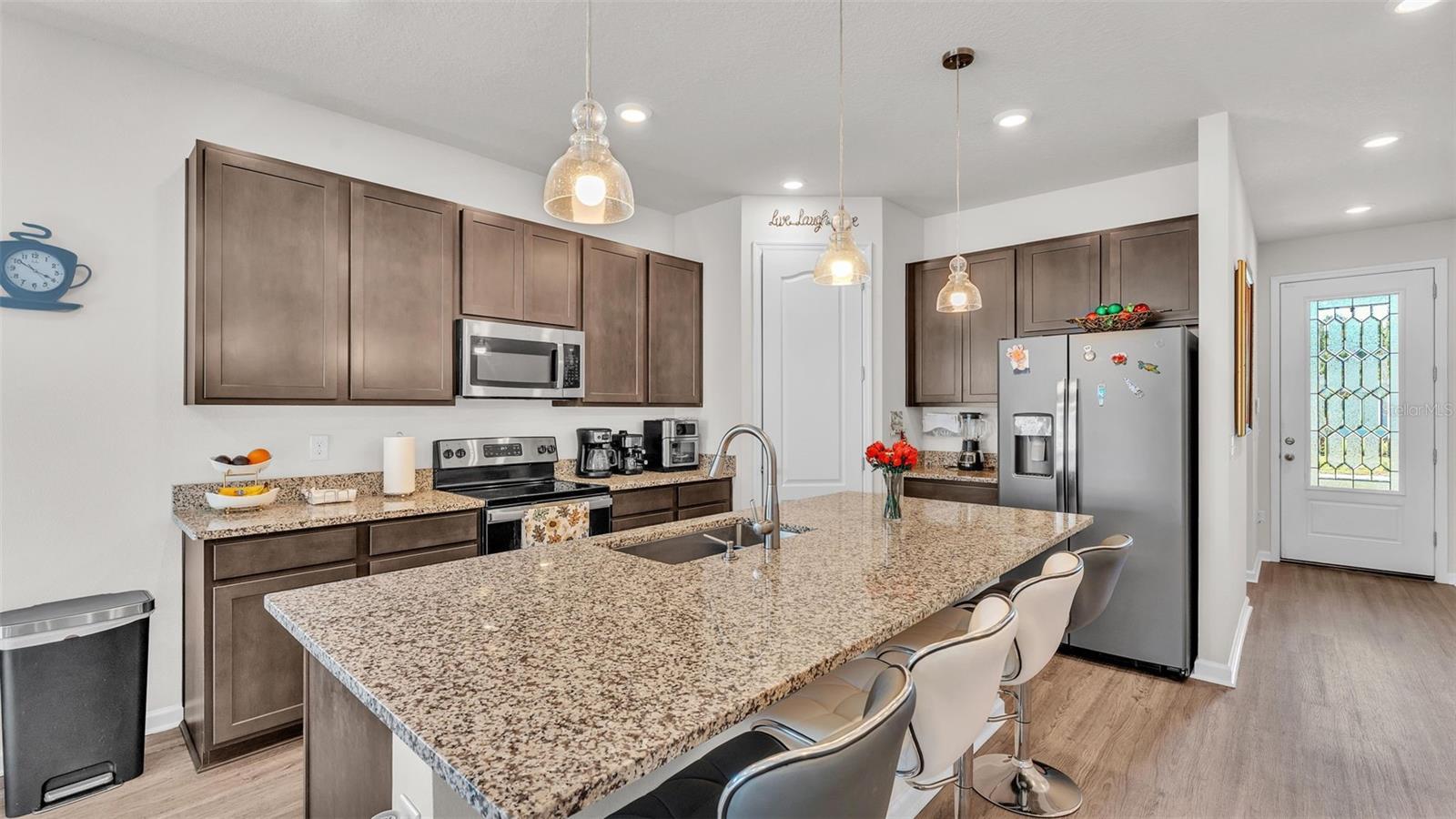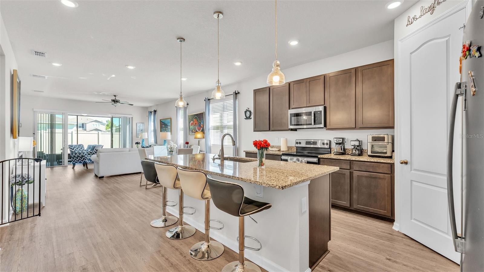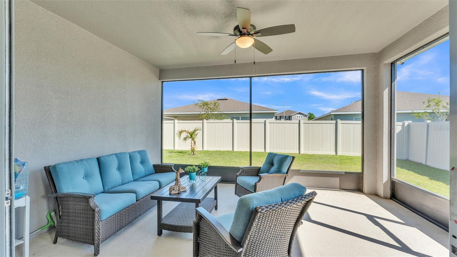 Welcome to this stunning four-bedroom, two-bathroom home in the Riverstone community of South Lakeland. Built by Richmond American Homes in 2021, this home boasts a perfect blend of modern upgrades and comfortable living. As you enter, you'll be greeted by an open floor plan that seamlessly connects the living spaces, perfect for entertaining family and friends. The home features 8-foot doors throughout, adding a touch of sophistication to every room. The kitchen is equipped with beautiful 42-inch cabinets, stainless steel appliances, and an oversized island with bar seating- ideal for casual dining. Pendant lighting adds a warm ambience, while the deep sink and walk-in pantry provide functionality for all your culinary needs. Retreat to the spacious master bedroom where you'll find a luxurious en-suite bathroom featuring double sink vanities, a modern shower, and a beautiful geometric floral ceramic tile design. The generous walk-in closet offers ample storage space, making this master suite a true oasis. The additional three bedrooms are well-appointed, providing plenty of space for family or guests, or a home office. An indoor laundry room adds convenience to your daily routine. Step outside to discover a large screened-in patio, complete with four-panel sliding glass doors, creating a seamless transition between indoor and outdoor living. The backyard is fully fenced with vinyl fencing, offering privacy, and a safe play area. Living in Riverstone means enjoying community amenities that enhance your lifestyle. Take advantage of the community pool on hot days, stay active in the fitness center, or enjoy the playground with the family. With plenty of sidewalks throughout the neighborhood, it's perfect for leisurely walks with your pet. Don't miss your chance to own this beautiful, like-new home without the wait of building! Schedule your private showing and experience this Riverstone gem in person!