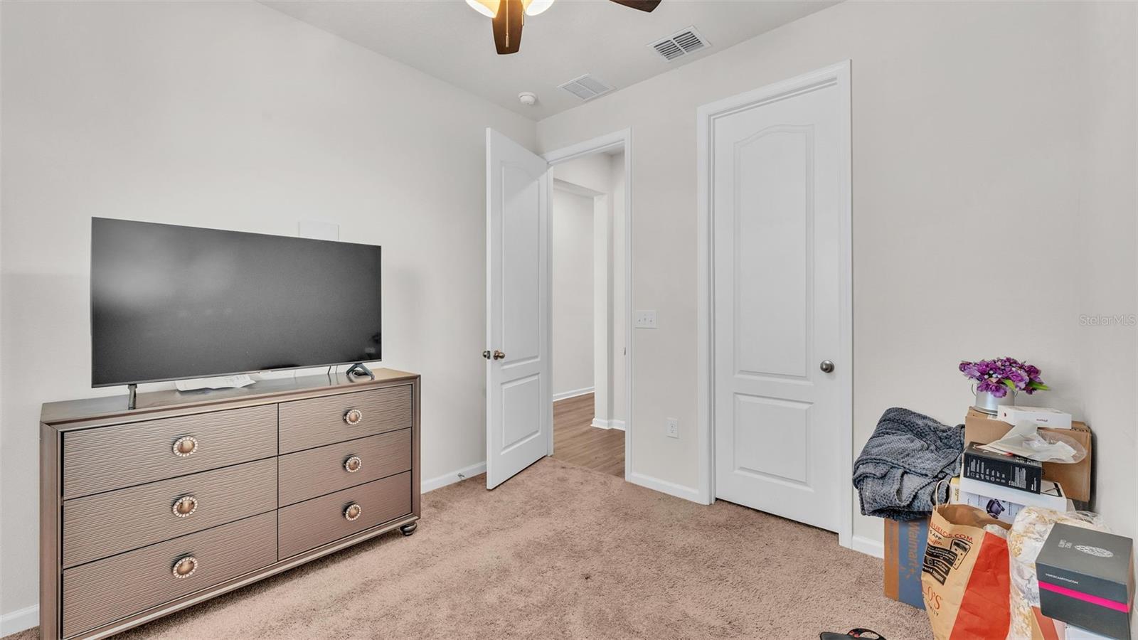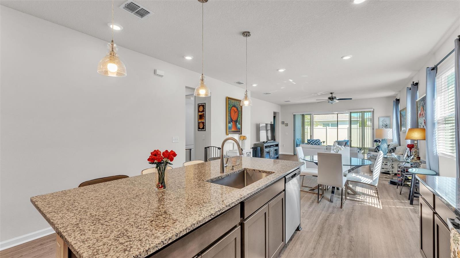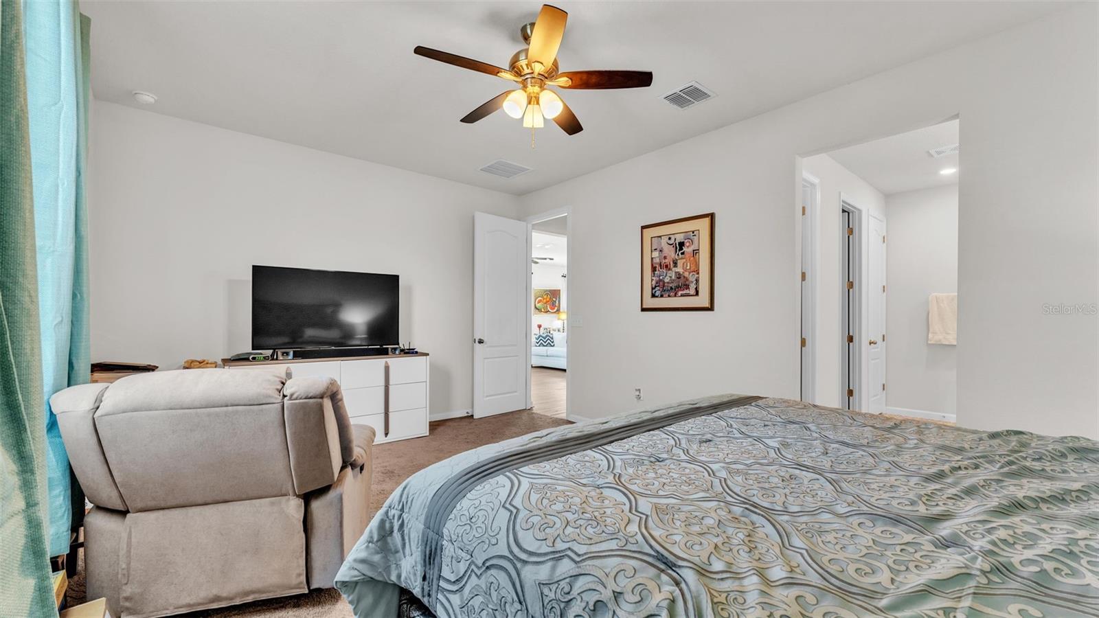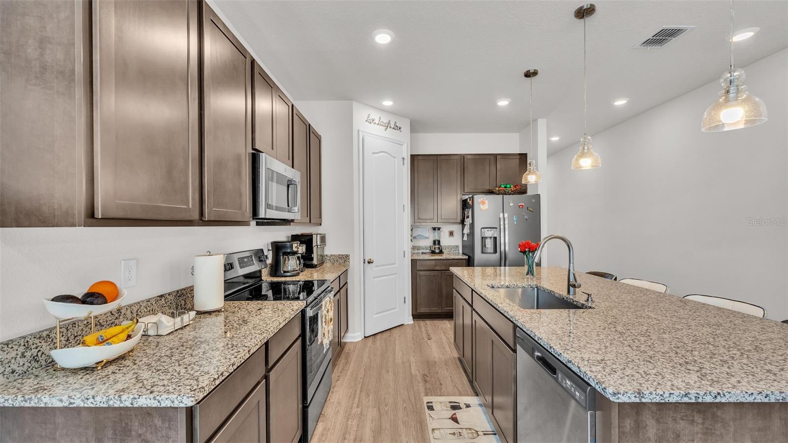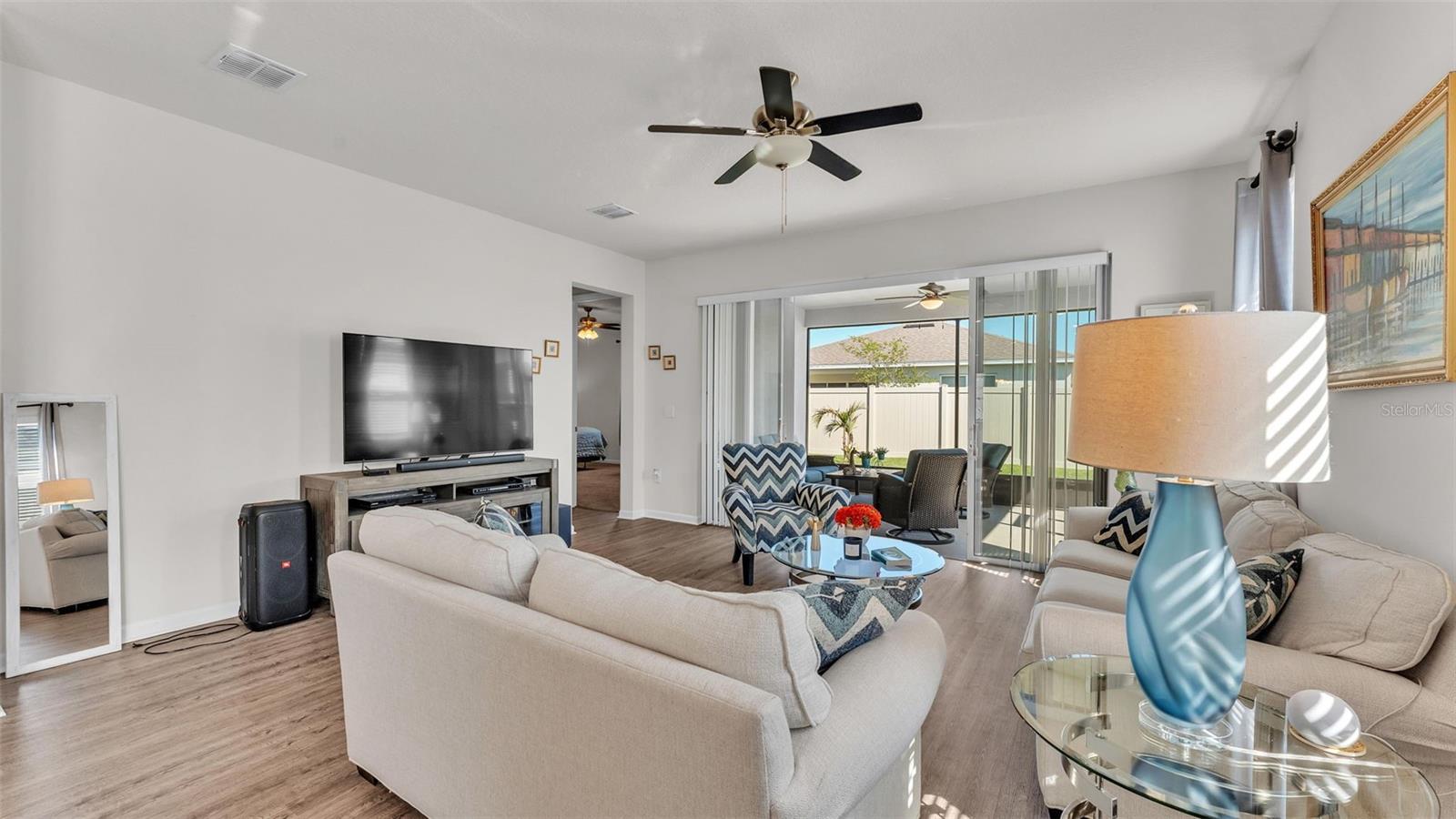 Welcome to this stunning four-bedroom, two-bathroom home in the Riverstone community of South Lakeland. Built by Richmond American Homes in 2021, this home boasts a perfect blend of modern upgrades and comfortable living. As you enter, you'll be greeted by an open floor plan that seamlessly connects the living spaces, perfect for entertaining family and friends. The home features 8-foot doors throughout, adding a touch of sophistication to every room. The kitchen is equipped with beautiful 42-inch cabinets, stainless steel appliances, and an oversized island with bar seating- ideal for casual dining. Pendant lighting adds a warm ambience, while the deep sink and walk-in pantry provide functionality for all your culinary needs. Retreat to the spacious master bedroom where you'll find a luxurious en-suite bathroom featuring double sink vanities, a modern shower, and a beautiful geometric floral ceramic tile design. The generous walk-in closet offers ample storage space, making this master suite a true oasis. The additional three bedrooms are well-appointed, providing plenty of space for family or guests, or a home office. An indoor laundry room adds convenience to your daily routine. Step outside to discover a large screened-in patio, complete with four-panel sliding glass doors, creating a seamless transition between indoor and outdoor living. The backyard is fully fenced with vinyl fencing, offering privacy, and a safe play area. Living in Riverstone means enjoying community amenities that enhance your lifestyle. Take advantage of the community pool on hot days, stay active in the fitness center, or enjoy the playground with the family. With plenty of sidewalks throughout the neighborhood, it's perfect for leisurely walks with your pet. Don't miss your chance to own this beautiful, like-new home without the wait of building! Schedule your private showing and experience this Riverstone gem in person!
