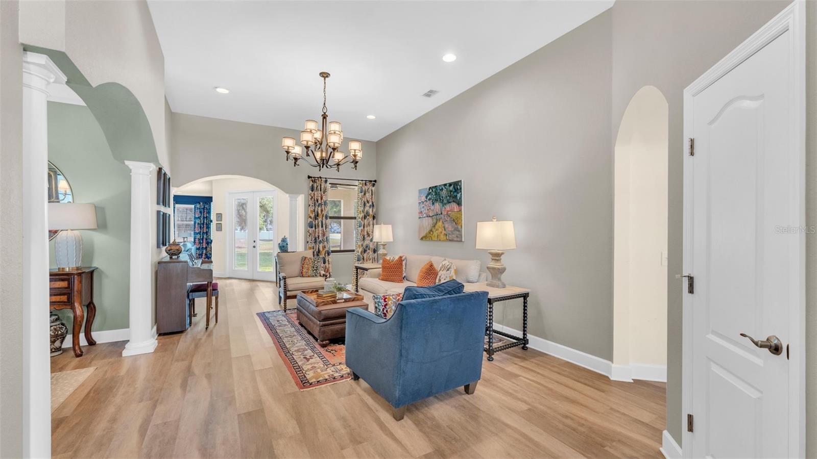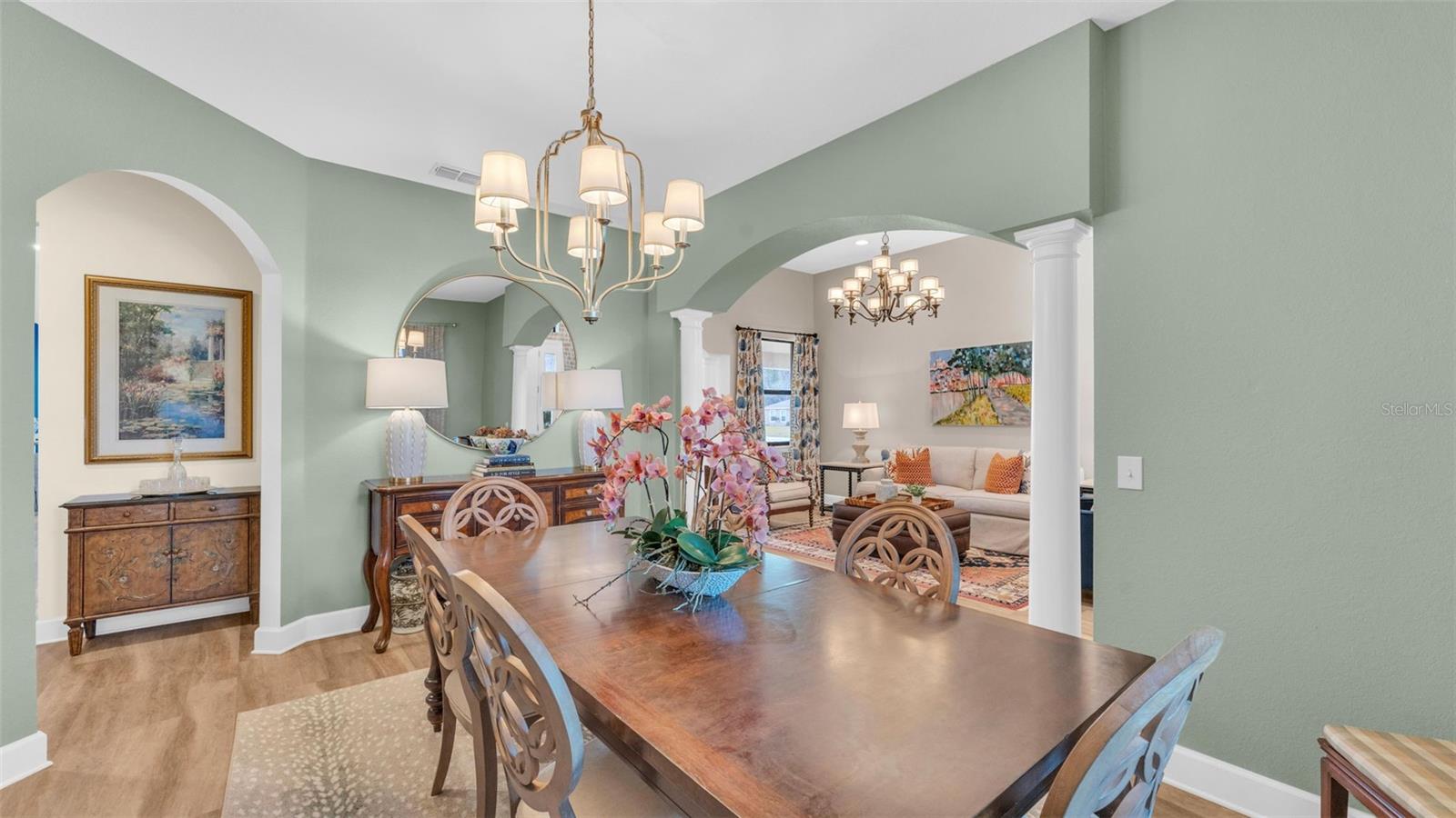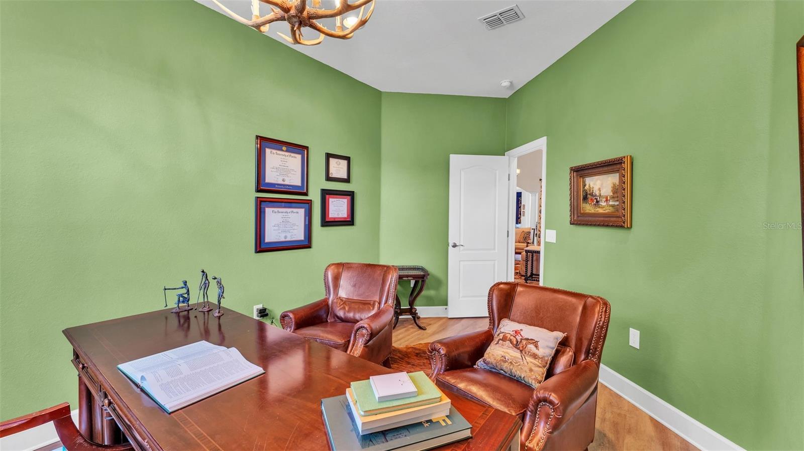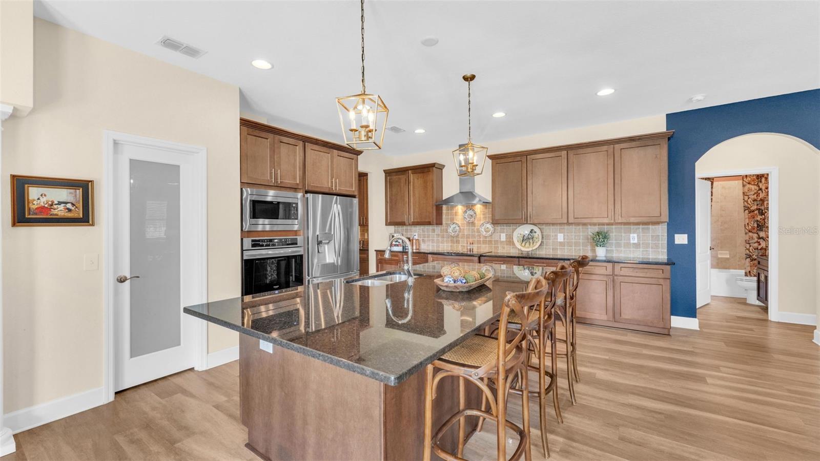 Nestled on approximately one acre of land within the desirable gated community of English Creek in South Lakeland, this exquisite four-bedroom dream home presents an unparalleled opportunity to indulge in luxurious living amidst a tranquil and private setting. Elegant design elements and upgraded finishes elevate the home’s presentation, creating an impressive, yet inviting ambiance for both daily life and entertaining. The corner lot provides ample green space, while the curb appeal is further enhanced by stone accents, meticulously manicured landscaping, a side-loading two-car garage with an extended driveway, and a beautiful fountain at the entryway. Upon entering the home, you will immediately take note of the attractive wallpaper and color palette, the trim details and stylish fixtures, and the seamless blend of classic charm and transitional design throughout. The welcoming foyers lead to a lovely formal living area, with an adjacent dining room offering plenty of space for formal meals with loved ones. The heart of the home is comprised of a large and open chef’s kitchen, overlooking the family room with wainscotting trim, plantation shutters, and a wood-burning fireplace as the focal point. From a functional standpoint, you will appreciate the preparation and serving space provided by the granite countertops, a butler’s pantry, and an expansive island-style breakfast bar in the kitchen, as well as the storage available in the wood cabinetry and closet pantry. Stainless steel appliances and backsplash add additional style, as well. The primary wing of the home includes a private office with French doors, as well as an oversized bedroom, two walk-in closets, and an en-suite bathroom with water closet, dual sinks, water closet, soaking tub, and shower. This triple-split floor plan includes two additional bedrooms with a guest bathroom, as well as a fourth bedroom with an en-suite bathroom, perfect for long-term guests or multi-generational needs. A covered back porch leads to the huge back yard, which offers space for a pool, play, gardening, and more – the options are truly endless in this space, and the opportunity to live in a gated community with a lot this size in South Lakeland is quite rare! All of this, plus the convenience of being just minutes away from the Polk Parkway, Highway 60, I-4, and the Lakeland International Airport.