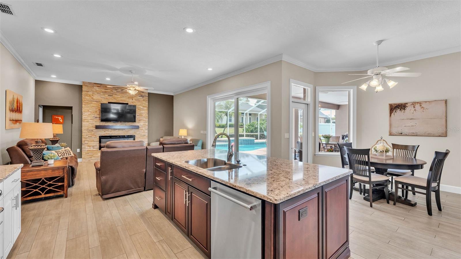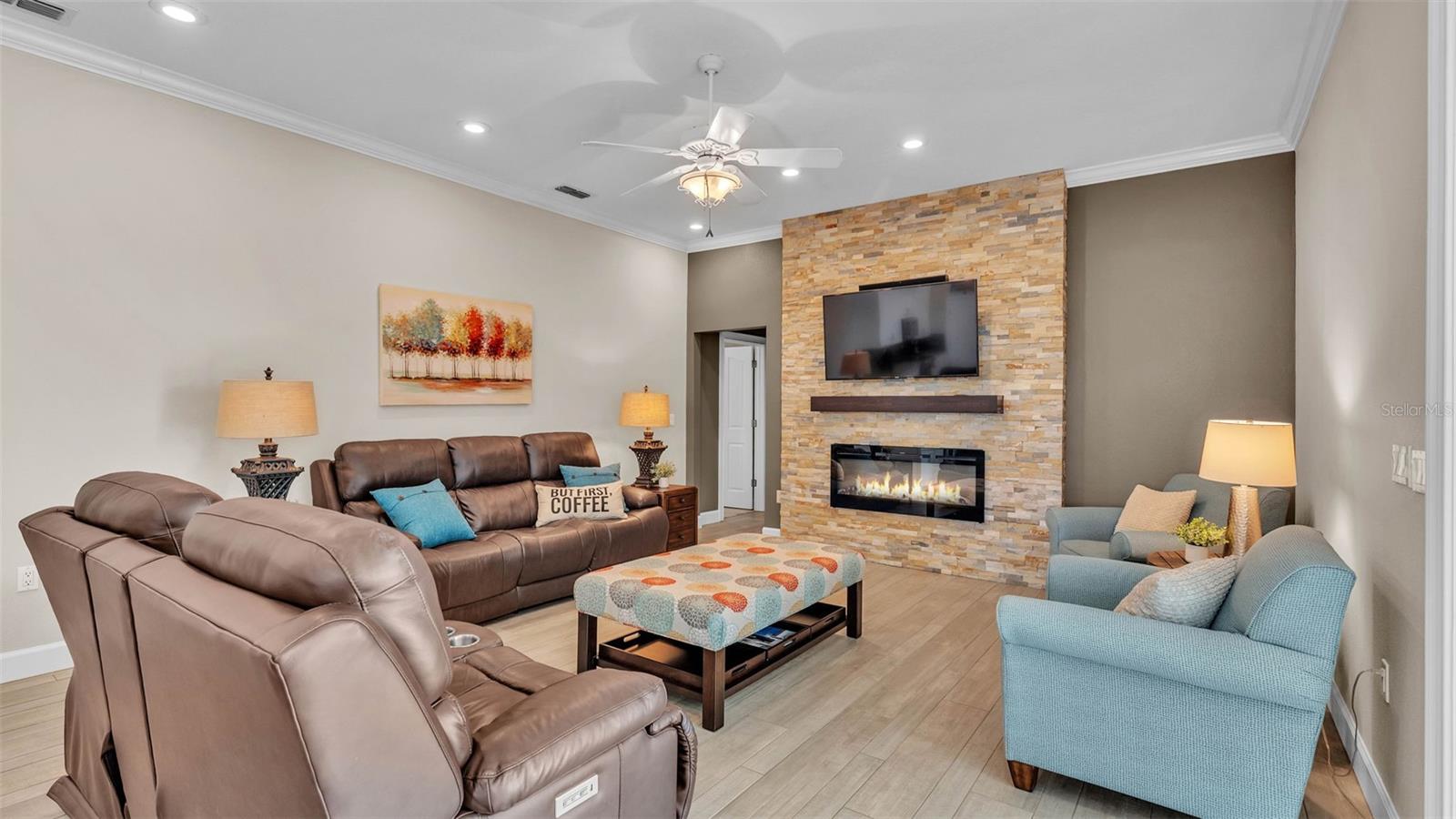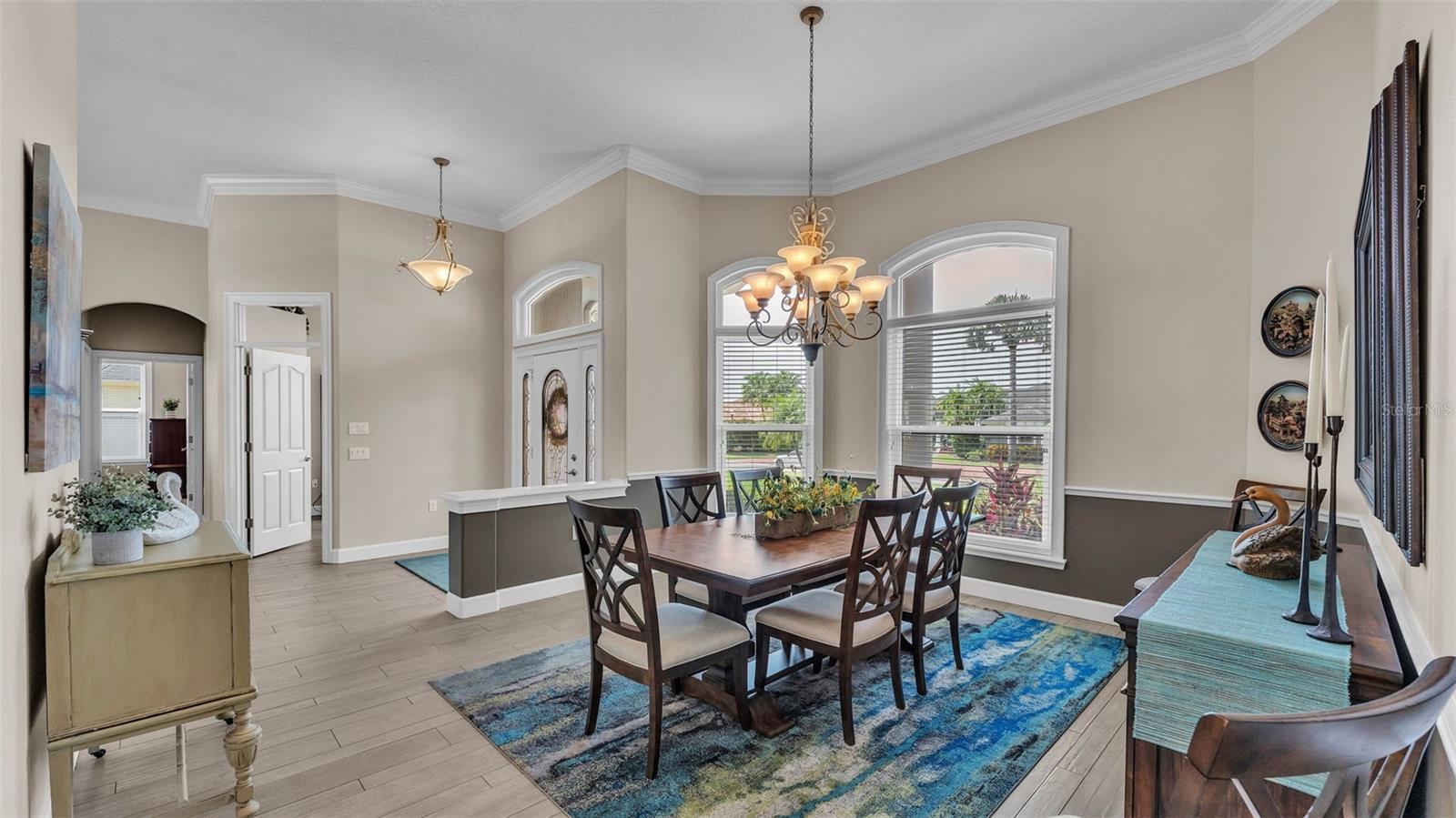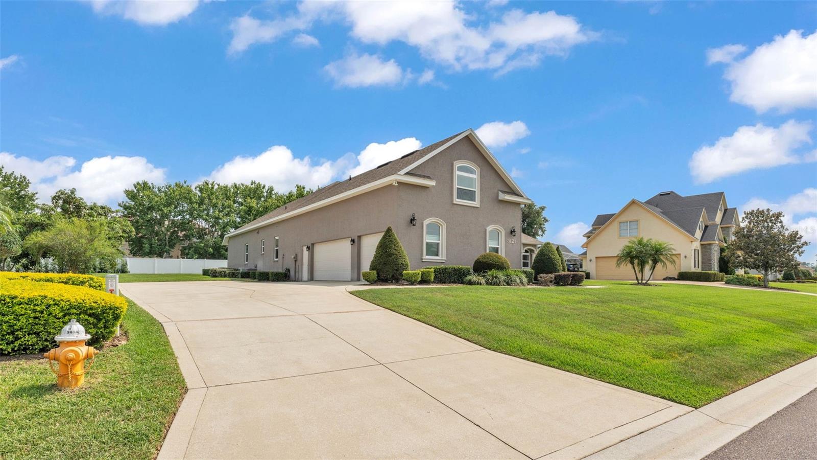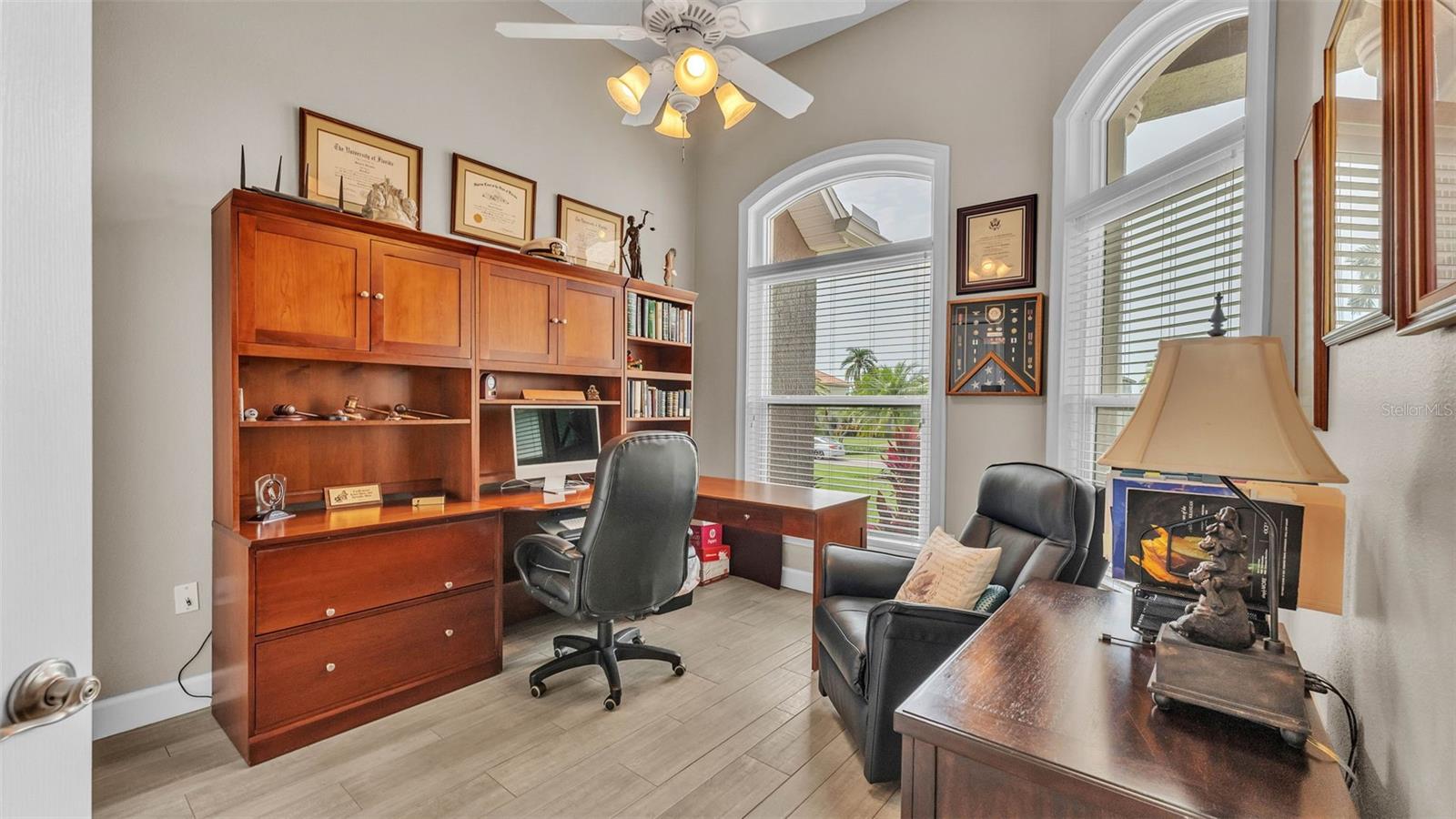 This exceptional, executive-style, custom-built pool home is located in the highly sought-after Highlands by the Lake neighborhood in South Lakeland, offering luxurious living in a prime location. Enjoy peaceful views of Banana Lake right across the street, a tranquil cul-de-sac setting, and the added privacy and security of a gated community featuring a clubhouse, pool, tennis and pickleball courts. You’ll be proud to call both this home and neighborhood your own. From the moment you arrive, you will appreciate the meticulous attention to detail that defines this home— from its impressive curb appeal, manicured lawn, and landscaping to the soaring, stately entryway. Inside, discover a pristine interior adorned with elegant design upgrades such as crown molding, plank-style tile flooring, transom windows, and high ceilings. The triple-split floor plan offers generous living spaces, abundant storage, and a layout perfect for both entertaining and everyday living. The first floor includes formal and informal living and dining areas, a spacious open kitchen, four bedrooms, and a dedicated office (with a closet, easily used as a fifth bedroom). The primary suite is comprised of a large bedroom with double-tray ceilings and French doors leading to the pool, plus a spa-like en-suite bathroom with two walk-in closets, separate vanities, a large tiled shower, soaking tub and water closet. Upstairs, you will find an oversized bonus room with a dry bar, half bathroom and an additional flex room for a second office, hobby area or storage. At the heart of the home lies the remodeled chef’s kitchen, featuring quartz countertops with a flush-mount sink, high-end stainless steel appliances, and a large island overlooking the family room. Custom cabinetry with pull-out shelves, two pantries (closet and cabinet), and built-in storage in the dinette area provide excellent functionality. The stone-accented fireplace adds cozy charm year-round in the Family room, which also features peaceful views and easy access to the pool area. Outdoor living is a true highlight of this home, with a paver-style porch surrounding the recently resurfaced private pool. A half "pool" bathroom and storage closet offer additional convenience, and the covered porch space provides shade and comfort. No detail was overlooked in the floor plan of this home — even the laundry room offers wonderful storage space and includes a washer, dryer, and freezer. The side-loading 3-car garage has a workshop area and added depth, offering ample parking space and an extended driveway for guests. Additional upgrades include energy-efficient double-pane windows, a central vacuum system, and tastefully updated bathrooms throughout the home. Conveniently located just minutes from top-rated schools, shopping, dining, and the upcoming hospital, with easy access to the Polk Parkway, this home offers an elevated lifestyle in a prime location, with a perfect blend of comfort, convenience, function and style.