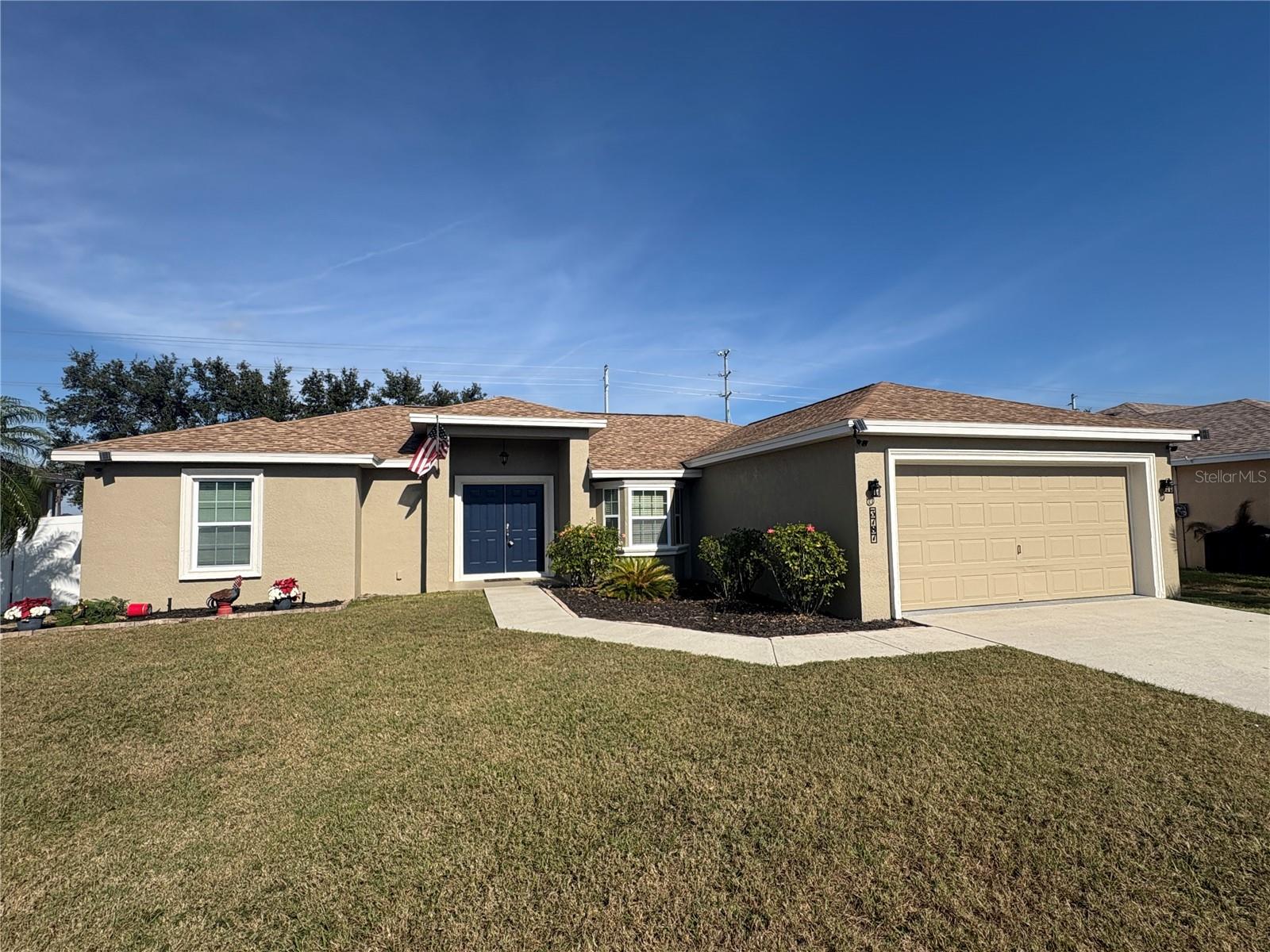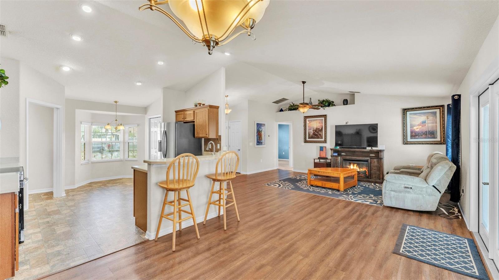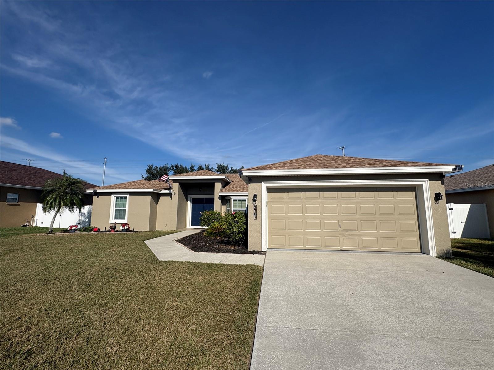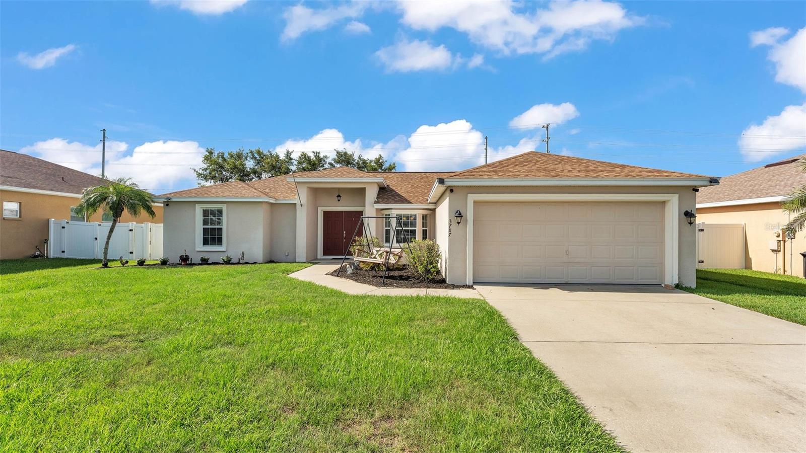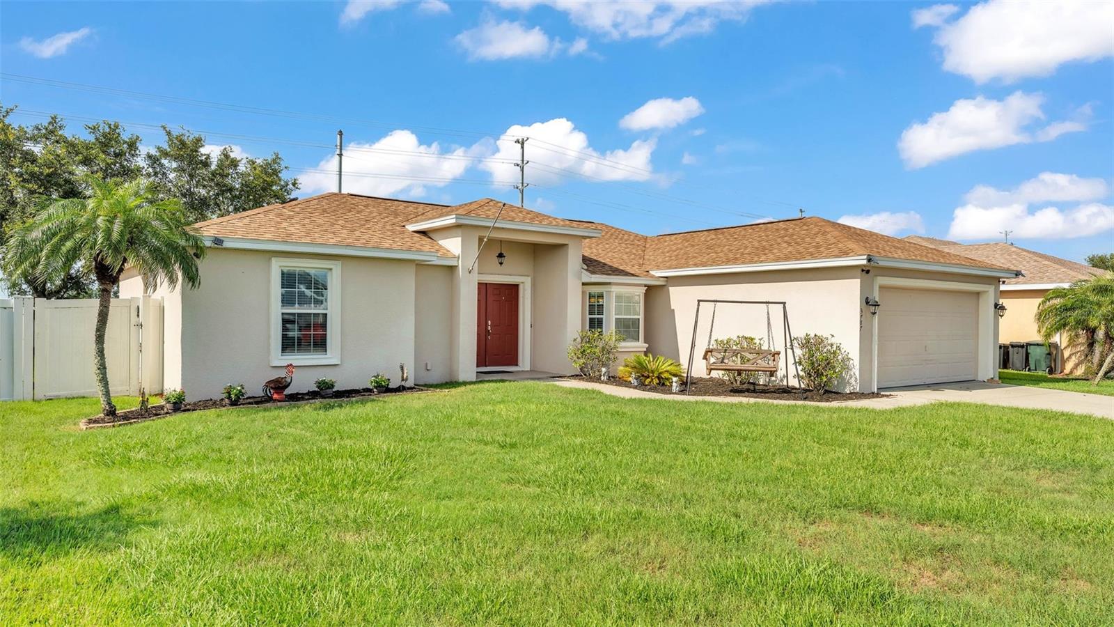 NEW UPDATES, and this SOLAR-HEATED SALTWATER POOL HOME has a NEW LOOK!!! Pool screen has been re-screened, and the exterior and interior of the home has been FRESHLY PAINTED as well as the pool deck! Upon entry through the elegant double door entry, you'll find a bright and welcoming atmosphere that features a vaulted ceiling and wood-look laminate flooring that extends from the living space to the dining area. The kitchen is a chef's dream and features a breakfast bar with plenty of seating space, decorative tile backsplash, ample cabinet and counter space for preparing meals, a pantry, and a breakfast nook which makes for a convenient eating area while you enjoy the bright views through the bay windows. This home offers a split bedroom open floorplan, perfect for entertaining and everyday living. The primary bedroom is a true retreat, and is complete with a spacious walk-in closet and luxurious en-suite bathroom featuring a garden tub, separate shower, and dual vanity. Enjoy peace and relaxation in this space every day. The other bedrooms are generously sized, each with already installed ceiling fans. The bedroom located in the front of the house also has a spacious walk-in closet. Through the french doors leads to the beautiful solar heated saltwater pool with a screen enclosure, perfect for year-round enjoyment. The backyard is fully fenced and offers both privacy and peace of mind, while providing breathtaking views of the annual SUN 'n FUN Air Show- all from the comfort of your own backyard! Some other note-worthy features of the home include: ROOF replaced in 2021, irrigation system, backyard storage shed, blinds throughout the home, fingerprint/code lock on primary bedroom door, keypad for garage door, and epoxy garage floor. The Towne Park Estates community is wonderful. LOW HOA & NO CDD! There is a playground, pavilion, sidewalks, and walking trails. This community makes for the perfect location to enjoy scenic views around the lakes and ponds. Residents of the community also have the opportunity to go fishing here- a dream for any fishing enthusiast! Don't miss this opportunity to own a slice of sunshine in the Sunshine State with great features for entertainment and serene outdoor living!