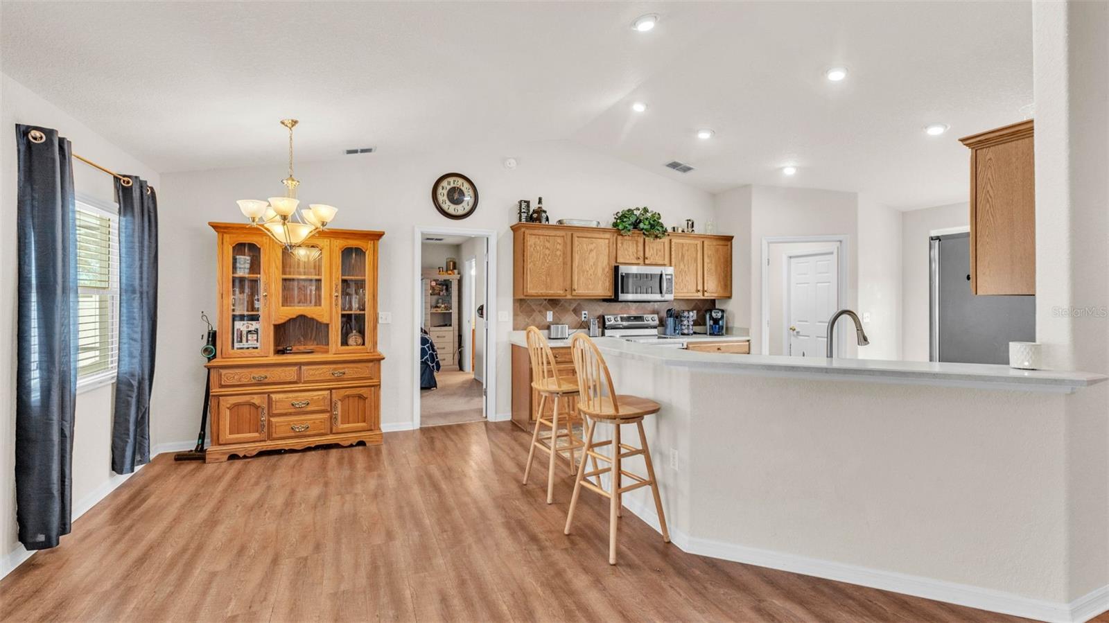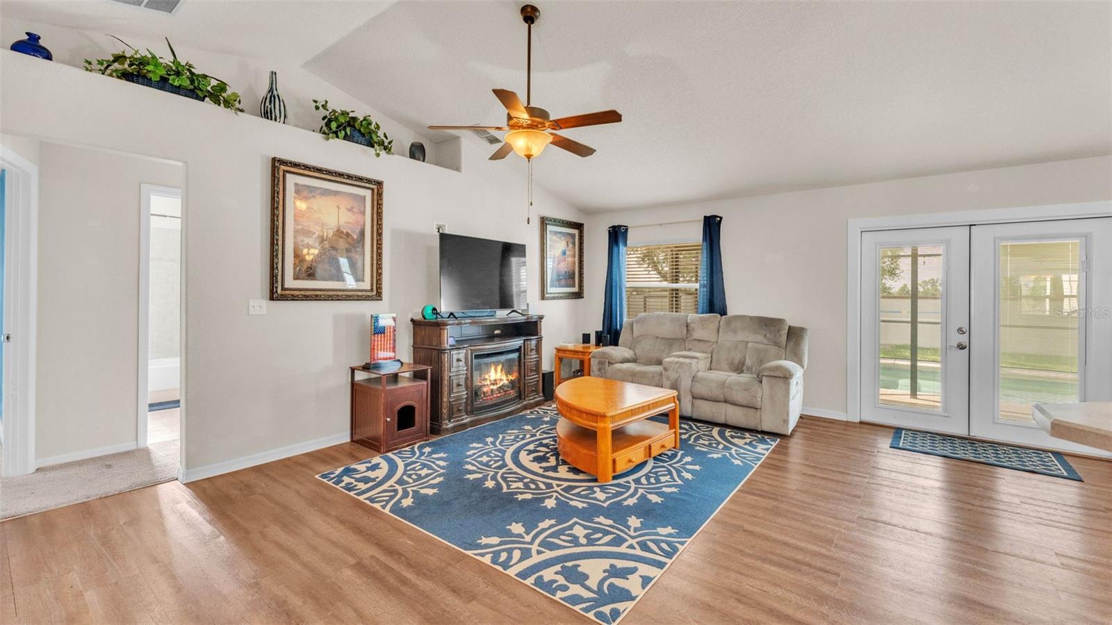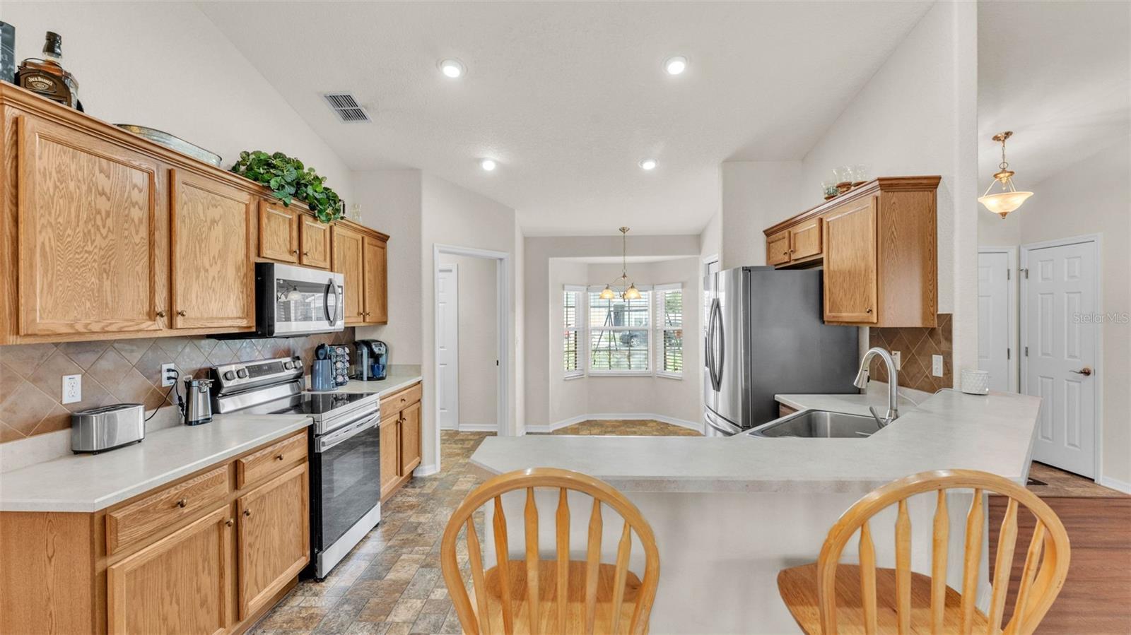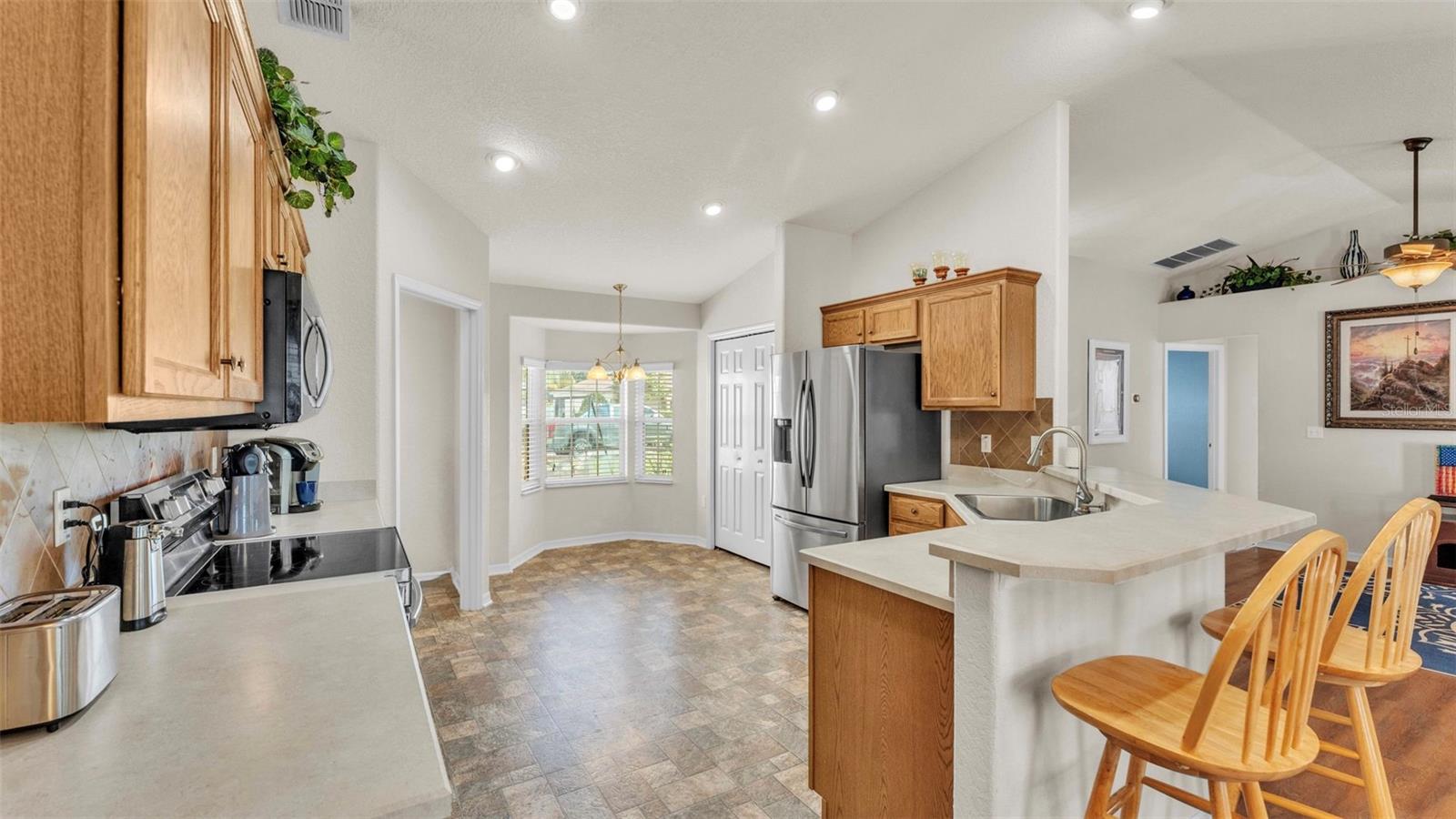 NEW UPDATES, and this SOLAR-HEATED SALTWATER POOL HOME has a NEW LOOK!!! Pool screen has been re-screened, and the exterior and interior of the home has been FRESHLY PAINTED as well as the pool deck! Upon entry through the elegant double door entry, you'll find a bright and welcoming atmosphere that features a vaulted ceiling and wood-look laminate flooring that extends from the living space to the dining area. The kitchen is a chef's dream and features a breakfast bar with plenty of seating space, decorative tile backsplash, ample cabinet and counter space for preparing meals, a pantry, and a breakfast nook which makes for a convenient eating area while you enjoy the bright views through the bay windows. This home offers a split bedroom open floorplan, perfect for entertaining and everyday living. The primary bedroom is a true retreat, and is complete with a spacious walk-in closet and luxurious en-suite bathroom featuring a garden tub, separate shower, and dual vanity. Enjoy peace and relaxation in this space every day. The other bedrooms are generously sized, each with already installed ceiling fans. The bedroom located in the front of the house also has a spacious walk-in closet. Through the french doors leads to the beautiful solar heated saltwater pool with a screen enclosure, perfect for year-round enjoyment. The backyard is fully fenced and offers both privacy and peace of mind, while providing breathtaking views of the annual SUN 'n FUN Air Show- all from the comfort of your own backyard! Some other note-worthy features of the home include: ROOF replaced in 2021, irrigation system, backyard storage shed, blinds throughout the home, fingerprint/code lock on primary bedroom door, keypad for garage door, and epoxy garage floor. The Towne Park Estates community is wonderful. LOW HOA & NO CDD! There is a playground, pavilion, sidewalks, and walking trails. This community makes for the perfect location to enjoy scenic views around the lakes and ponds. Residents of the community also have the opportunity to go fishing here- a dream for any fishing enthusiast! Don't miss this opportunity to own a slice of sunshine in the Sunshine State with great features for entertainment and serene outdoor living!