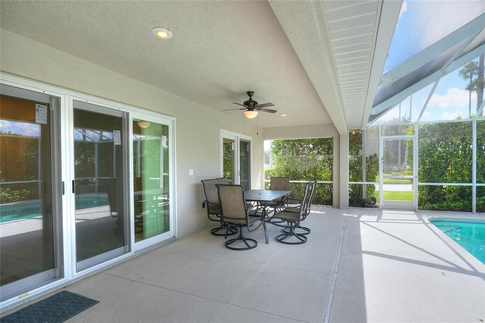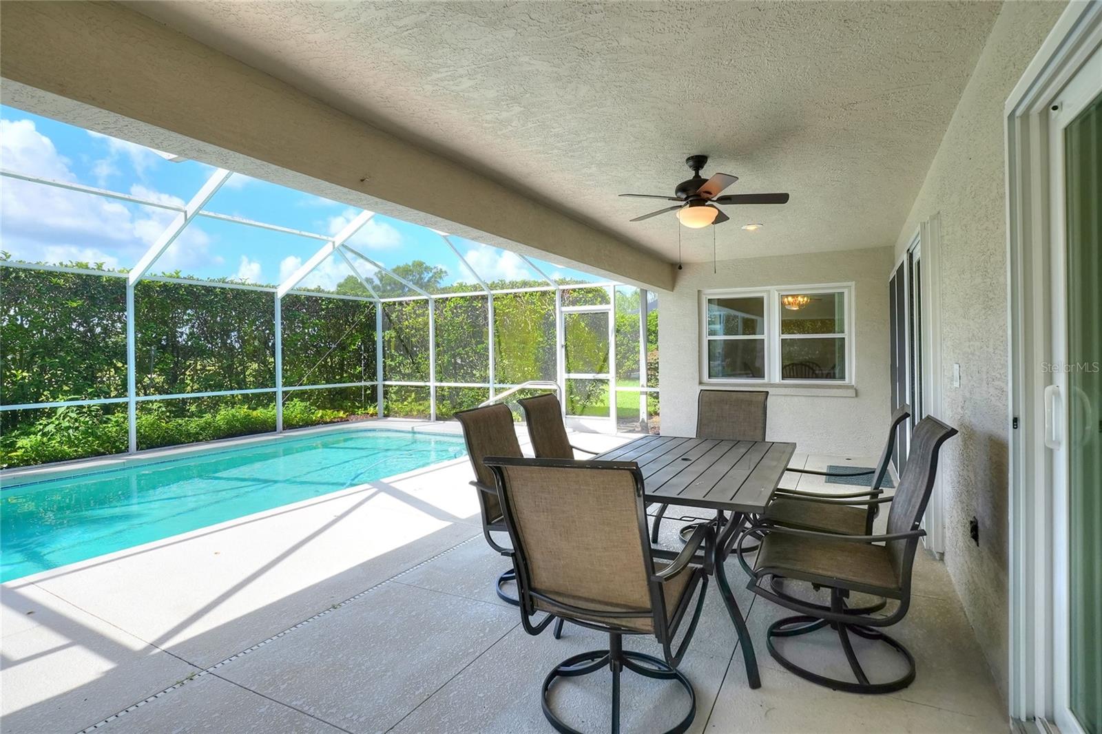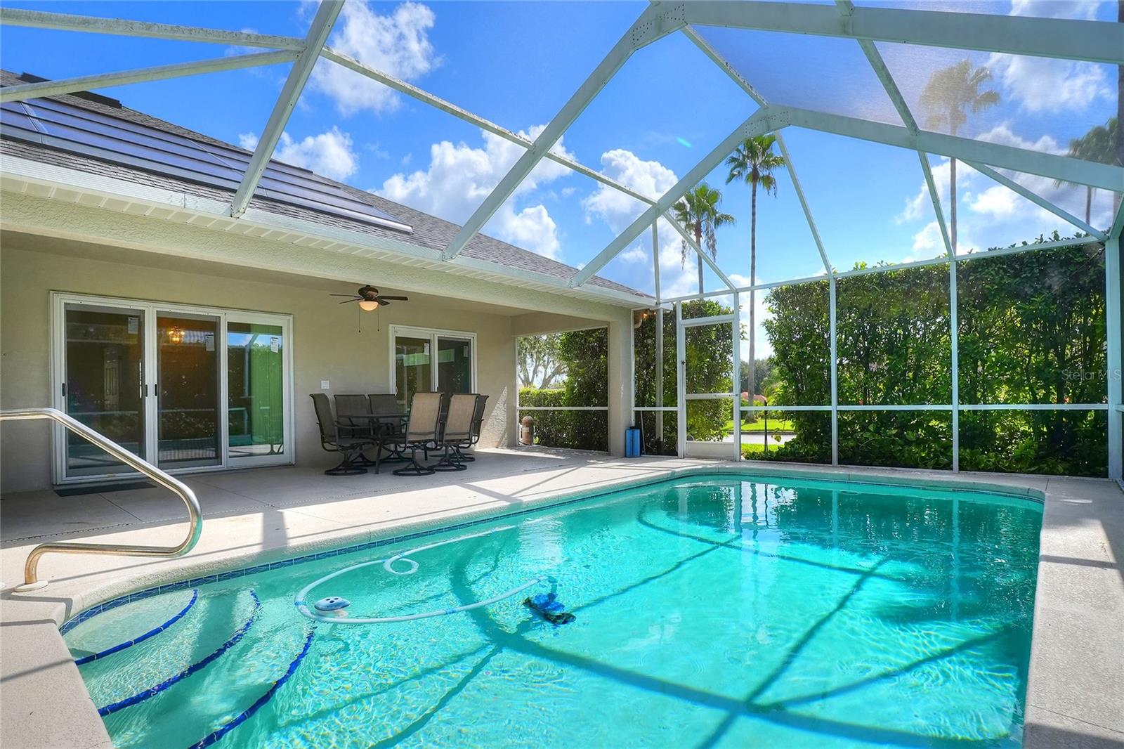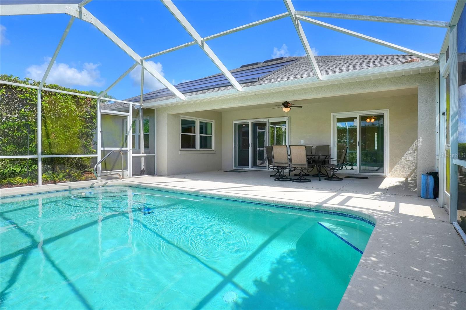 Beautifully maintained, this 4/2/2 pool home awaits! Lush, mature landscaping greets you upon arrival. From your entry point, you can see the sparkling pool through the brand new triple sliders. This pool is equipped with safety fence should you need, and the surface is in pristine condition. The pool screen helps maintain the crystal clear appearance of the pool. The vast open space of the living area separates living in three directions, making this floorpan conducive to multi-gen use, or designation of an office. The primary suite sports an ensuite with a soaking tub begging to sooth your soul at the end of a long day! New, modern sliders open onto the pool deck, and provide a lovely view. On to the dining area, you have a large window overlooking the pool. The kitchen has newer appliances, and is spacious enough for more than one home chef at a time! bedrooms located off of the kitchen are separated by a spacious bathroom. Laundry is inside, located off the kitchen for convenience. Solar panels are in place and are owned, placed by the same company at the time of the roof in 2019. Reclaimed water is utilized for lawn irrigation and the Rainbird system can help you manage watering days! This is a beauty you don't want to miss! Make your appointment ASAP!