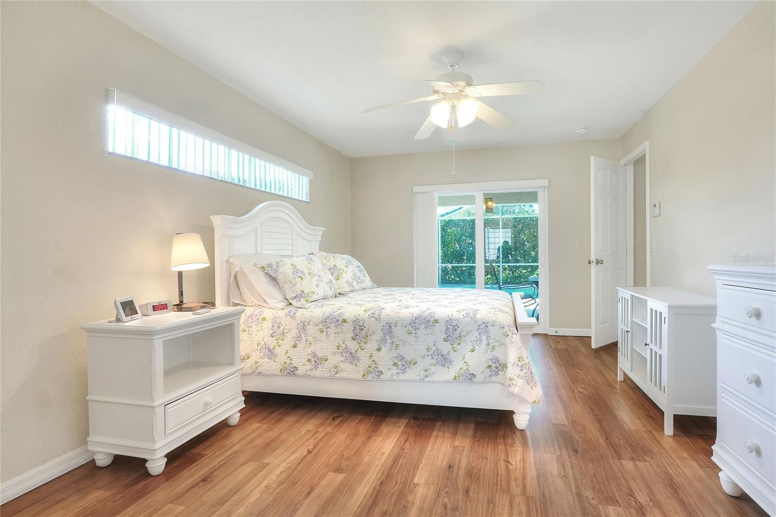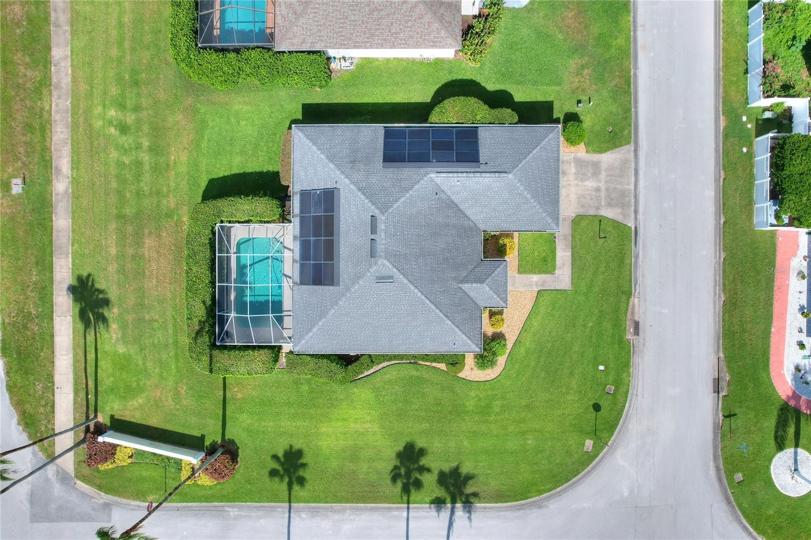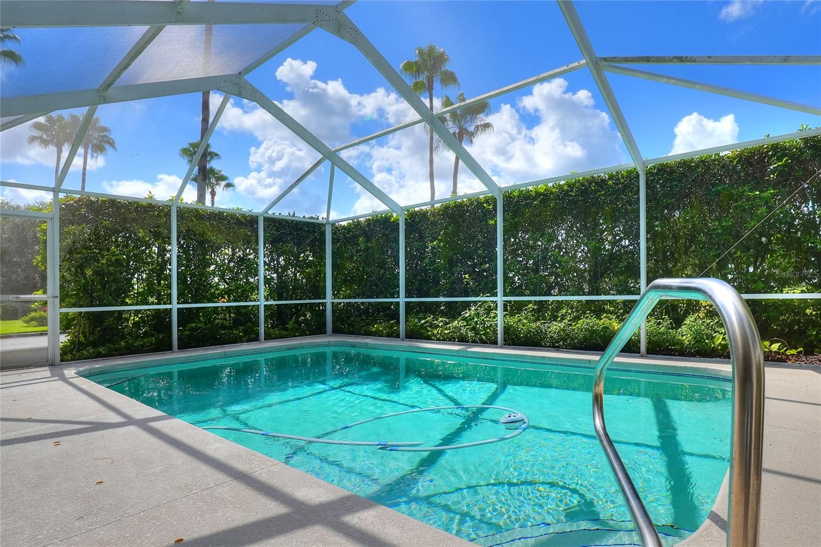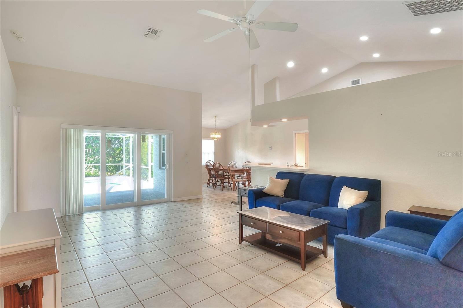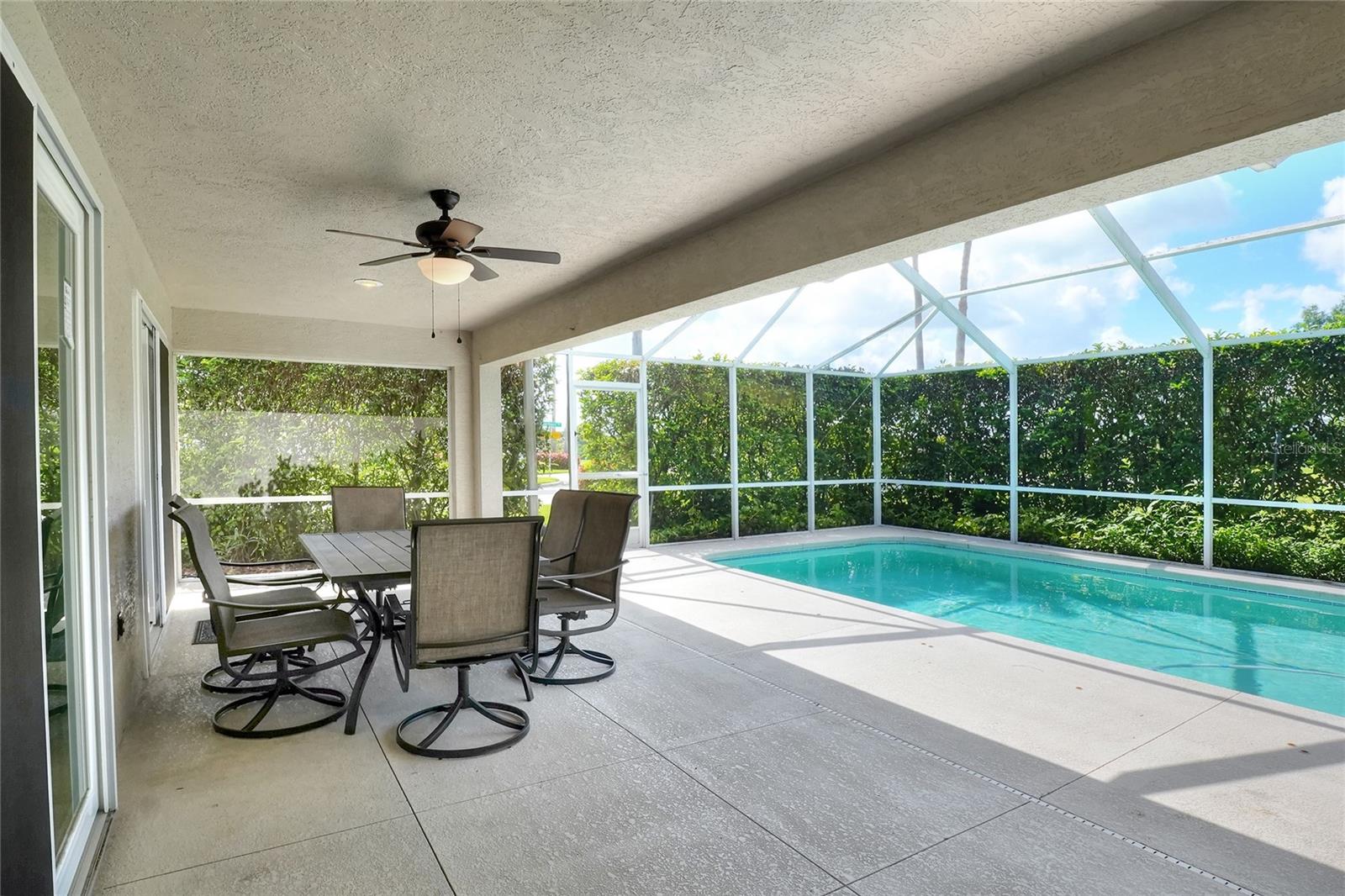 Beautifully maintained, this 4/2/2 pool home awaits! Lush, mature landscaping greets you upon arrival. From your entry point, you can see the sparkling pool through the brand new triple sliders. This pool is equipped with safety fence should you need, and the surface is in pristine condition. The pool screen helps maintain the crystal clear appearance of the pool. The vast open space of the living area separates living in three directions, making this floorpan conducive to multi-gen use, or designation of an office. The primary suite sports an ensuite with a soaking tub begging to sooth your soul at the end of a long day! New, modern sliders open onto the pool deck, and provide a lovely view. On to the dining area, you have a large window overlooking the pool. The kitchen has newer appliances, and is spacious enough for more than one home chef at a time! bedrooms located off of the kitchen are separated by a spacious bathroom. Laundry is inside, located off the kitchen for convenience. Solar panels are in place and are owned, placed by the same company at the time of the roof in 2019. Reclaimed water is utilized for lawn irrigation and the Rainbird system can help you manage watering days! This is a beauty you don't want to miss! Make your appointment ASAP!