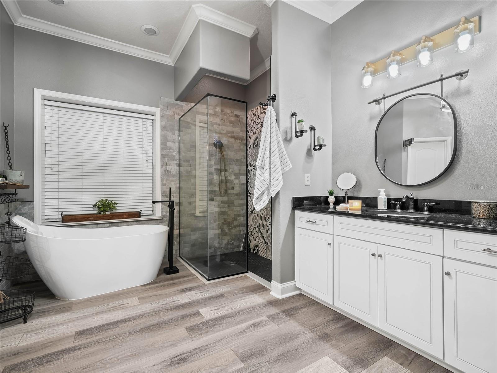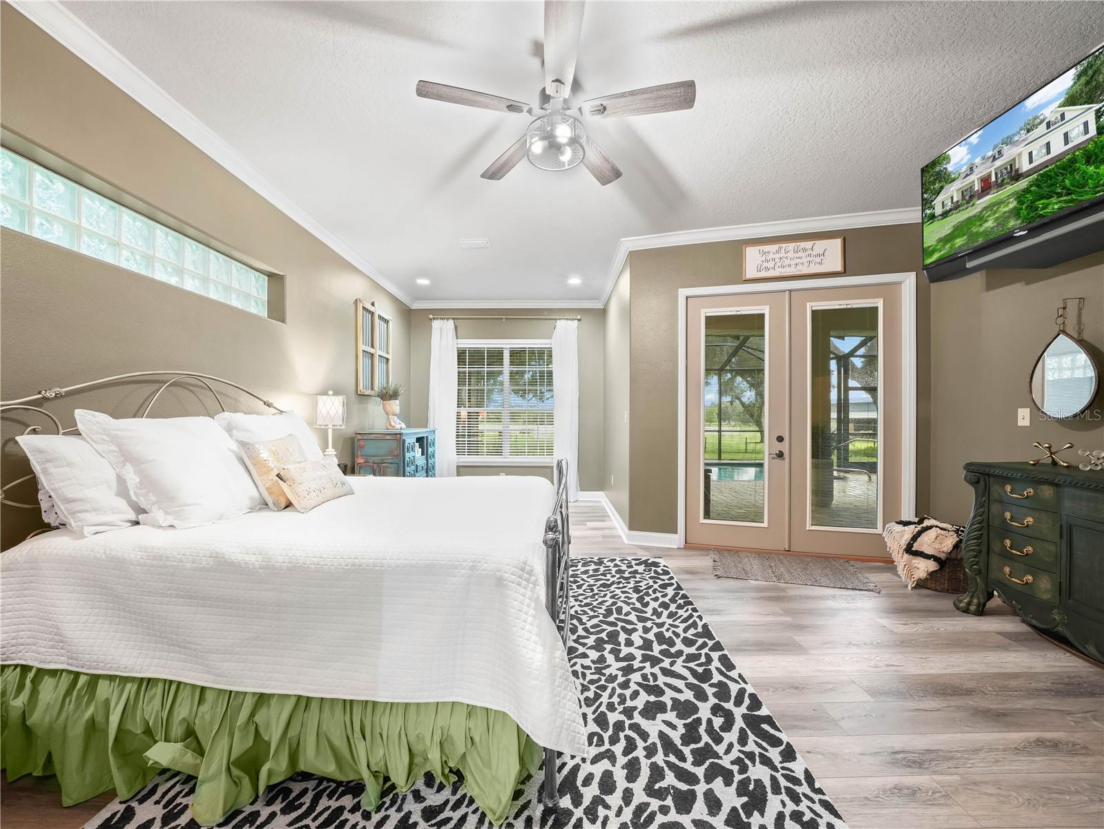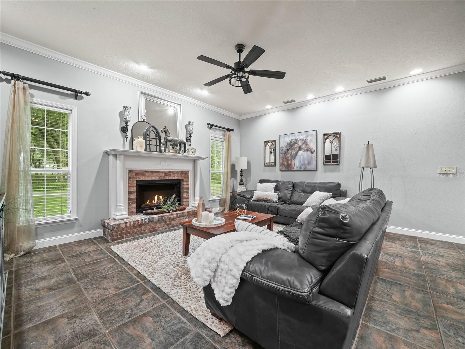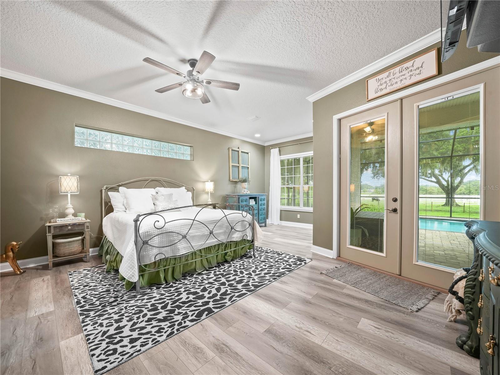 Nestled on a sprawling approximately 14.49-acre plot, this captivating house offers a peaceful and private retreat. The home features four bedrooms and three bathrooms, encompassing approximately 2,901 square feet of thoughtfully designed living space. BRAND NEW ROOF 4/2025. The majestic oaks lining the entrance create a charming and inviting atmosphere. Carefully designed with 6 courses of block and block foam filled walls. The window and sliding glass doors are double paned, the garage door insulated. Inside, the home boasts a double foyer that opens to the formal dining room and living room, featuring soaring ceilings, decorative niches, and crown molding. The private office, with its large window, provides an ideal setting for a home workspace. The kitchen showcases Kraftmaid cabinetry, black galaxy granite countertops, and brand-new appliances. The separate dinette area offers a private entry to the lanai through French doors, creating a serene and inviting space. The expansive family room, with its wood-burning fireplace, provides ample room for family gatherings and relaxation. The primary bedroom, a generously sized suite, features a private sitting area and French doors leading to a private entry to the pool area.The primary bathroom boasts a decorative tile shower, luxury vinyl plank floors, a soaking tub, double sinks, double walk-in closets, and a separate water closet. The inviting lanai overlooks the lush pasture, offering a calming environment. The property also boasts an impressive 1,300 feet of creek, 600' walk from creek with teeming with fish, and a 50-by-95-foot, 6-horse stall barn, equipped with automatic water and 100-amp service, allowing for future loft expansion and 12 x 12 tack/tool room. Horse lovers will love white vinyl fenced riding arena with round pen. The property also features an oversized 2.5-car side-entry garage and ample parking on the long concrete driveway.