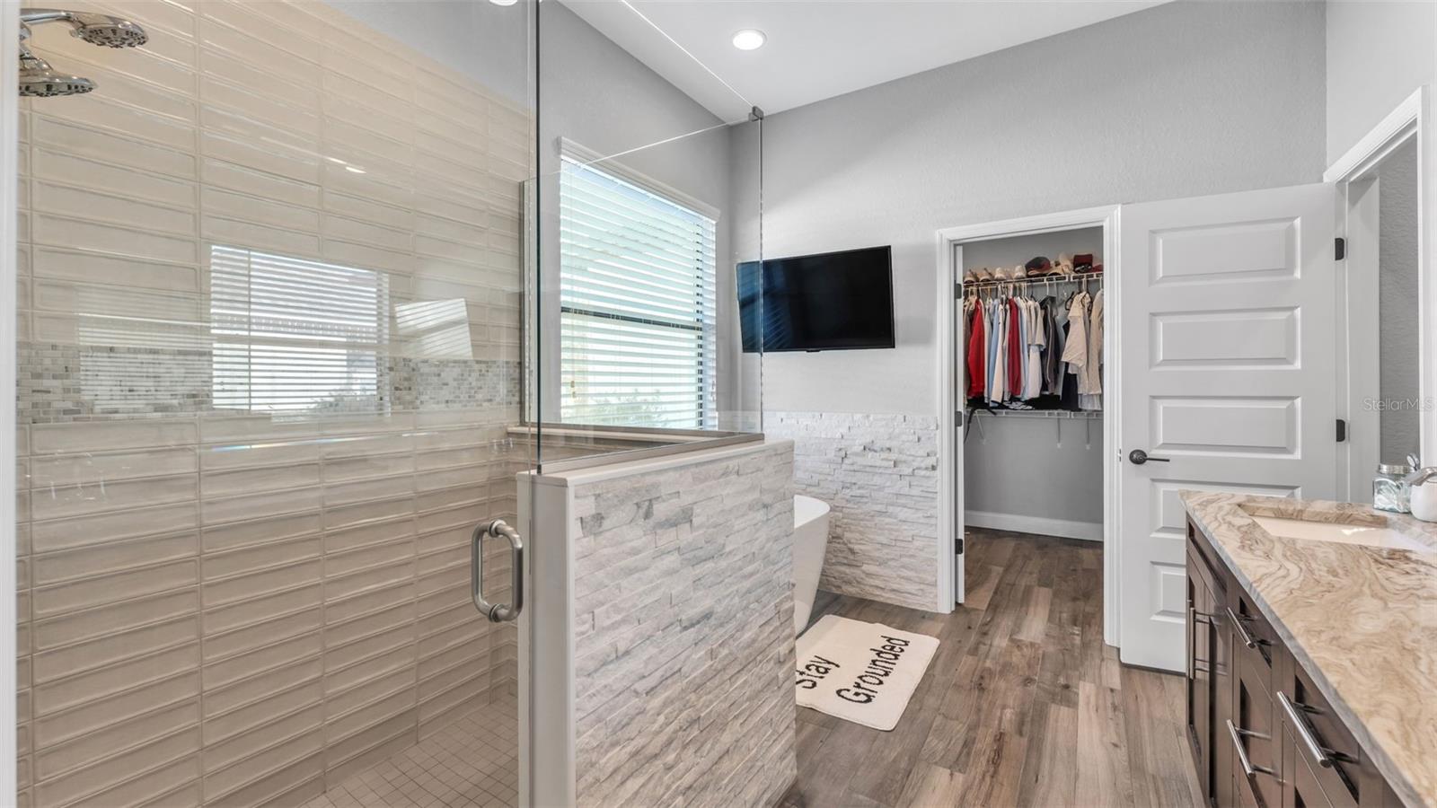 Welcome to this custom-built Tapia Homes residence located in the highly desirable Lakeside Heritage community. Thoughtfully designed and meticulously maintained, this 4-bedroom, 3-bath home with a screened saltwater pool offers an exceptional blend of luxury, comfort, and indoor-outdoor living. From the moment you arrive, the home impresses with beautiful curb appeal, upgraded landscaping, and a paver driveway leading to a striking five-panel glass front door. Inside, the open-concept layout is filled with natural light and showcases wood-look tile flooring throughout the main living areas, soaring tray ceilings with stained wood beams, crown molding, and designer finishes. The great room serves as the heart of the home, highlighted by a floor-to-ceiling stone electric fireplace flanked by custom-built-in shelving, adding both warmth and functionality. Expansive triple-panel sliding glass doors fully pocket to the exterior, seamlessly connecting the living space to the lanai and pool—perfect for entertaining or everyday Florida living. The chef’s kitchen features granite countertops, a large center island with seating, farmhouse sink, stainless steel appliances, a coffee bar, ample cabinetry, and a walk-in pantry, all flowing effortlessly into the dining and living areas. This desirable triple-split floor plan provides excellent privacy. The primary suite is a true retreat with tray ceilings, private lanai access, and a spa-inspired en-suite bath featuring a freestanding soaking tub, oversized walk-in shower, dual vanities with granite countertops, and a spacious walk-in closet. A second en-suite bedroom also offers direct pool access, ideal for guests or multi-generational living. Two additional bedrooms share a well-appointed guest bath, while a dedicated flex room with built-ins offers the perfect home office or study. The well-designed laundry room includes custom cabinetry, a utility sink, and upgraded backsplash tile, adding both style and practicality. Step outside to your private backyard oasis featuring a fully screened, pavered lanai and saltwater pool with sun shelf, ideal for relaxing, entertaining, or enjoying year-round outdoor living. The fully fenced yard provides added privacy and space. Additional highlights include a pocketing sliding glass door to the lanai, a spacious three-car garage with ample storage, and quality craftsmanship throughout. Conveniently located just minutes from the Banana Lake boat ramp, shopping, dining, medical facilities, and the Polk Parkway for easy commuting. This exceptional home offers luxury, flexibility, and lifestyle—no waiting to build, just move in and enjoy.