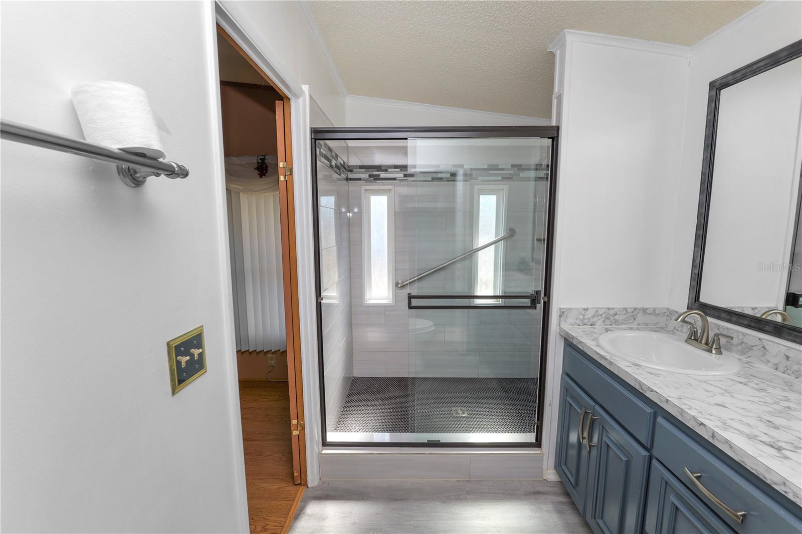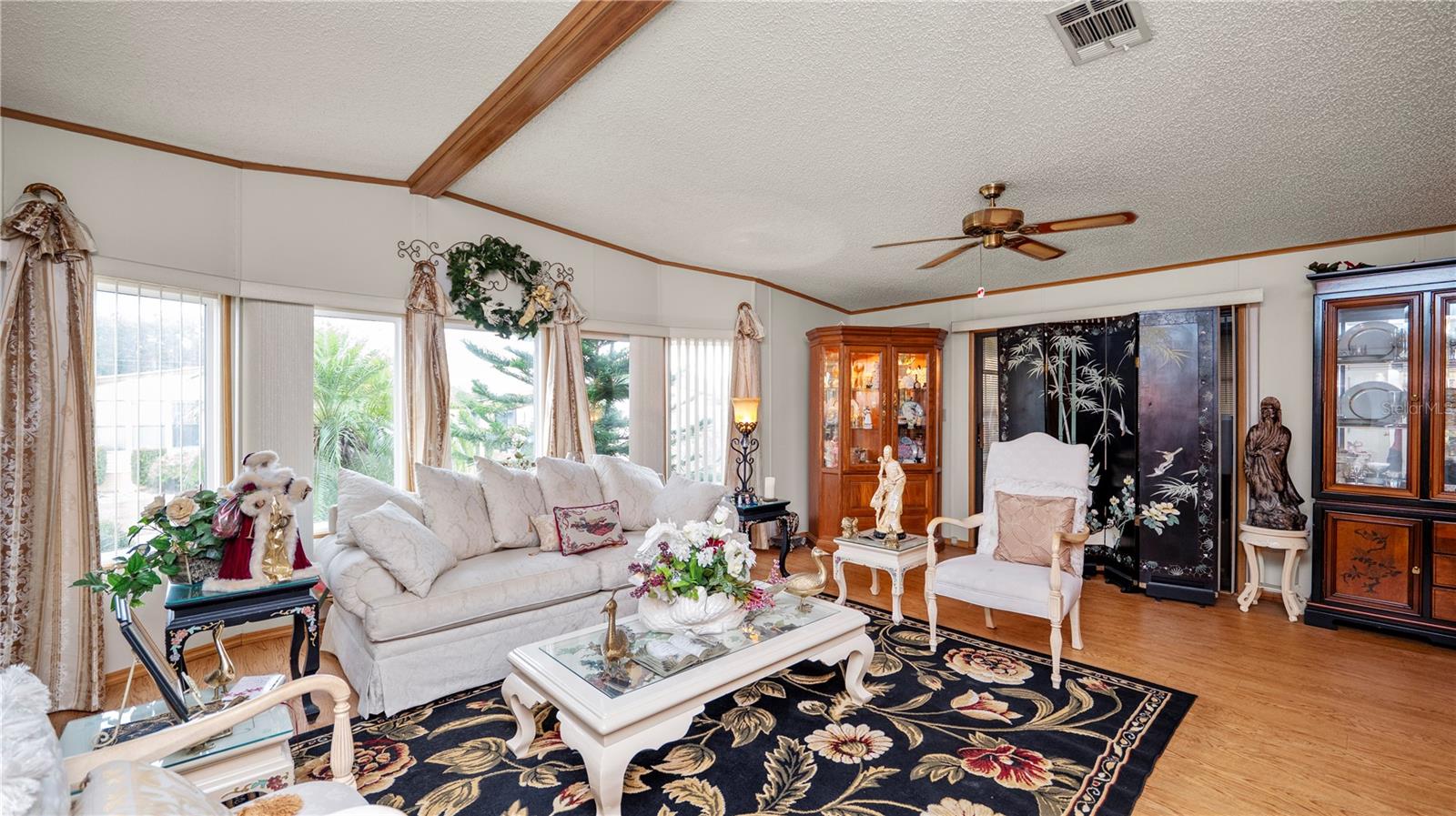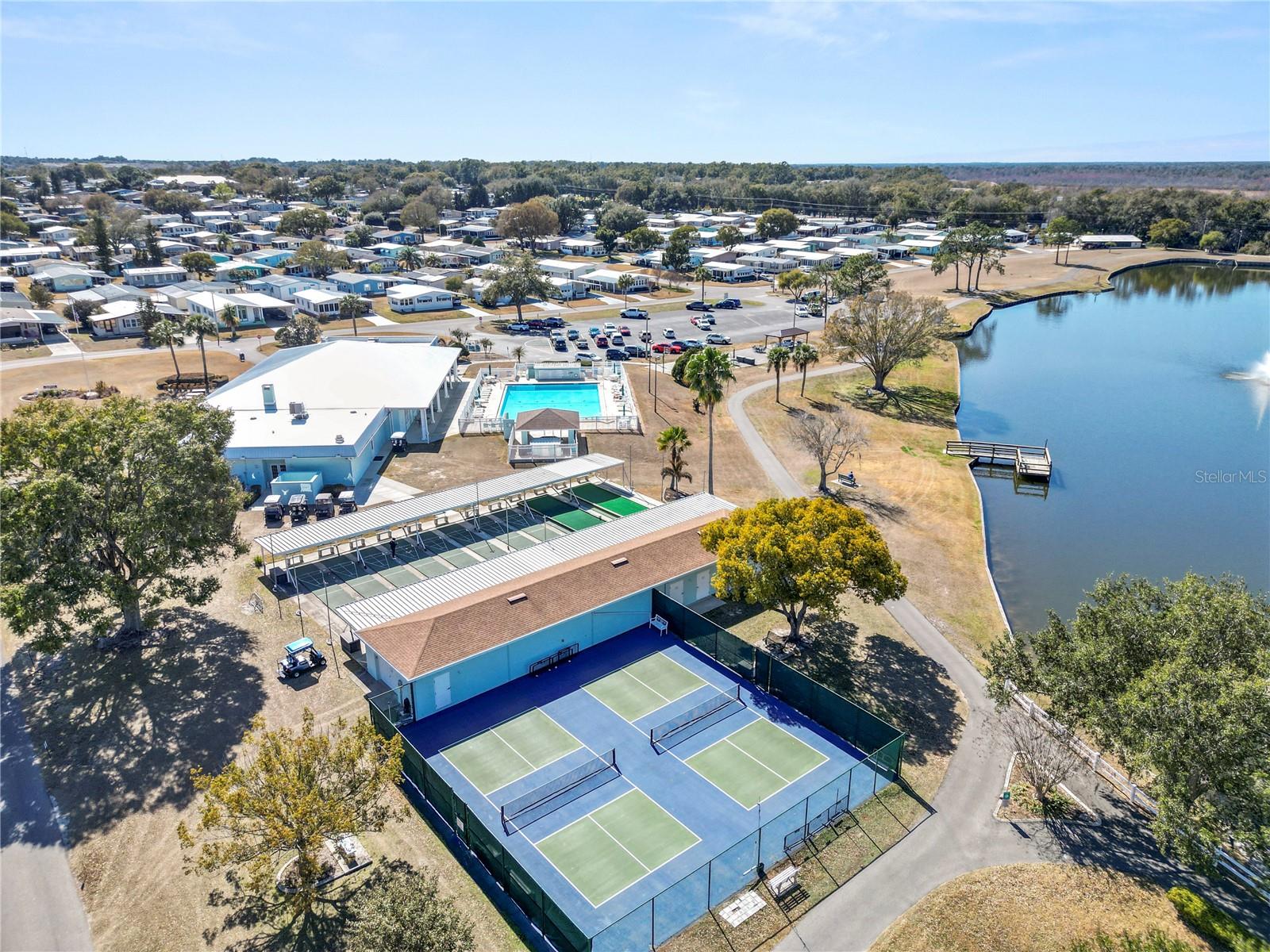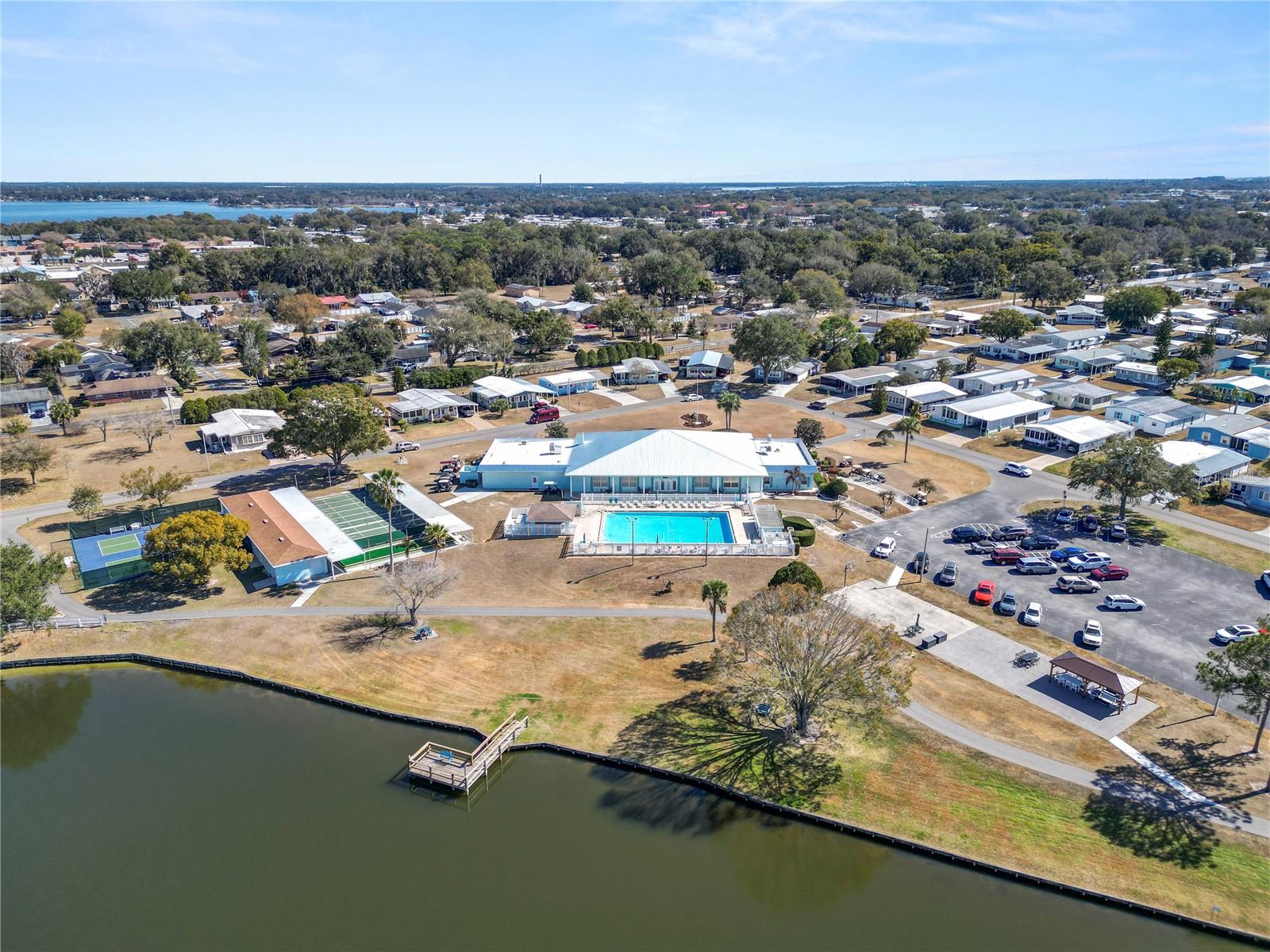 Located in the deed-restricted 55+ community of Foxwood Lake Estates, this beautiful land-owned (no lot rent) 2-bedroom, 2-bath manufactured home offers a straightforward, functional layout. Laminate flooring runs through most of the home, with tile in the bathrooms and carpet in the enclosed Florida room. The central living area includes a large bay window and connects to a living room and dining room space with a built-in buffet and an updated galley kitchen featuring stone countertops, ample cabinetry, and a lower eat-in island. The primary bedroom is well sized with a built-in closet and ceiling fan. The updated en suite bath includes dual sinks, stone countertops, tile flooring, a tiled walk-in shower with grab bars, updated lighting, and a linen closet. The second bedroom includes a ceiling fan and built-in closet and is served by an updated guest bath with a tub/shower combination. Additional space includes an enclosed Florida room with windows and a window A/C unit, plus an enclosed rear porch off the kitchen and carport with access to the attached laundry room. Foxwood Lake Estates offers gated entry, private security patrol, and 24/7 video surveillance at the clubhouse, pool, and parking areas. Community amenities include a clubhouse, heated pool, spa, sauna, fitness center, shuffleboard, bocce, pickleball courts, billiards, and a stocked lake with walking path. Conveniently located to shopping and dining.