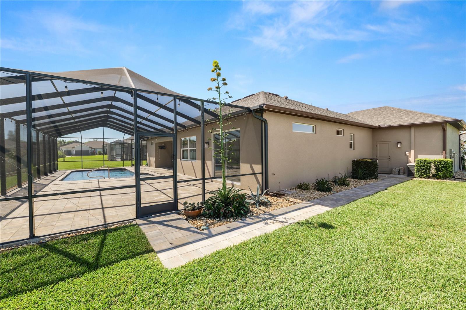 Welcome to this exceptional 2021-built residence in the well loved Lakeside Heritage community, where quality craftsmanship, thoughtful design, and elevated finishes come together seamlessly. Offering 4 bedrooms, 3 full bathrooms, and a dedicated office, this one-owner home was carefully designed for both everyday comfort and effortless entertaining. From the moment you enter, you’ll notice the abundance of natural light streaming through three separate sets of sliding glass doors, creating a true indoor-outdoor lifestyle. The open layout flows beautifully to the expansive pool area, making this home ideal for gatherings or quiet evenings at home. The primary suite is a private retreat featuring tray ceilings, an oversized walk-in closet, dual granite vanities, a spacious walk-in shower, and a private water closet. Direct access to the pool through elegant sliders enhances the resort-style feel. A second en-suite bedroom also offers private pool access and a California-style walk-in closet—perfect as a secondary primary suite or an upscale guest retreat. The additional bedrooms are smartly positioned with a pocket door and insulated walls to provide added privacy and sound reduction. Built with efficiency and long-term performance in mind, this home features a specialized HVAC system designed for simplified maintenance with a single filter change point. It also includes a high-efficiency Presley septic system with a specialized septic tank and advanced drainfield designed to never require routine pumping—providing exceptional convenience and reduced long-term maintenance. Step outside to your own backyard oasis featuring an oversized paver pool deck, heated saltwater pool with a sun shelf, and generous space for entertaining or relaxing under the Florida sky. Additional highlights include: • 3-car garage with insulated doors for temperature control • Marble and granite countertops throughout • Upgraded insulation and high-end finishes • Community setting with picturesque views of Banana Lake If you’re seeking modern construction, luxury upgrades, and a meticulously maintained home that truly stands apart, this Lakeside Heritage property delivers. Call today to schedule your private showing!