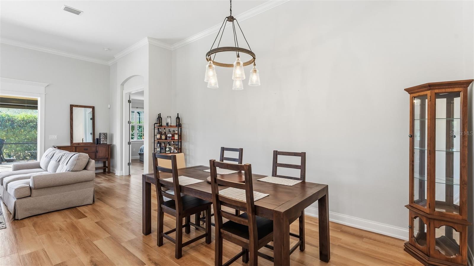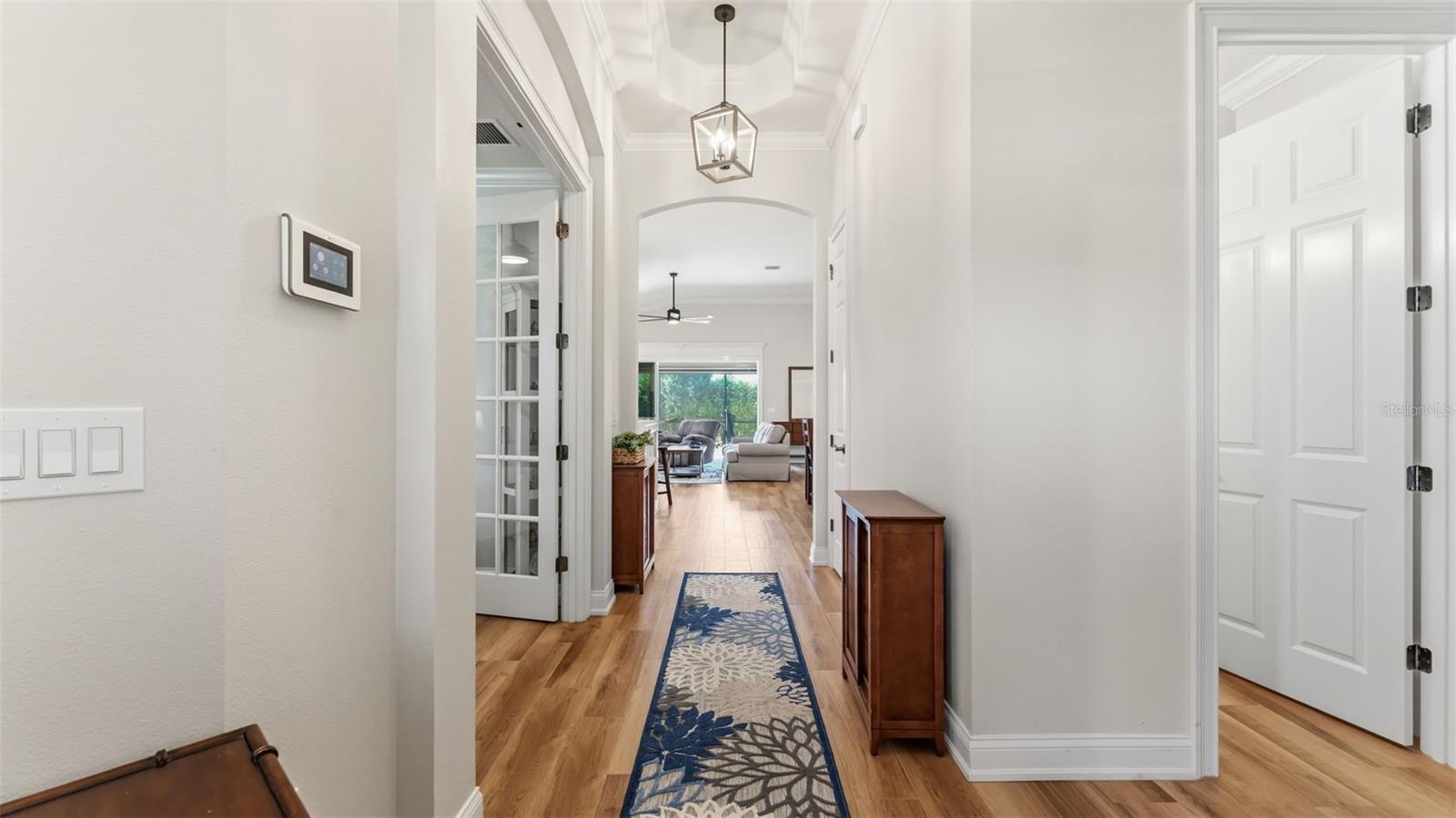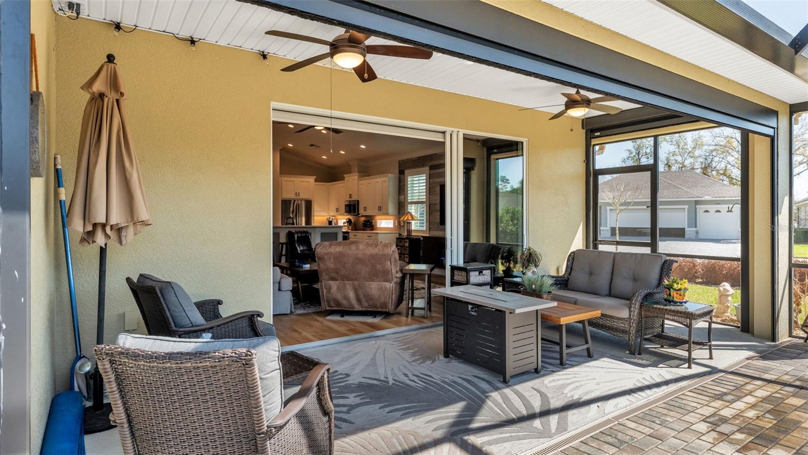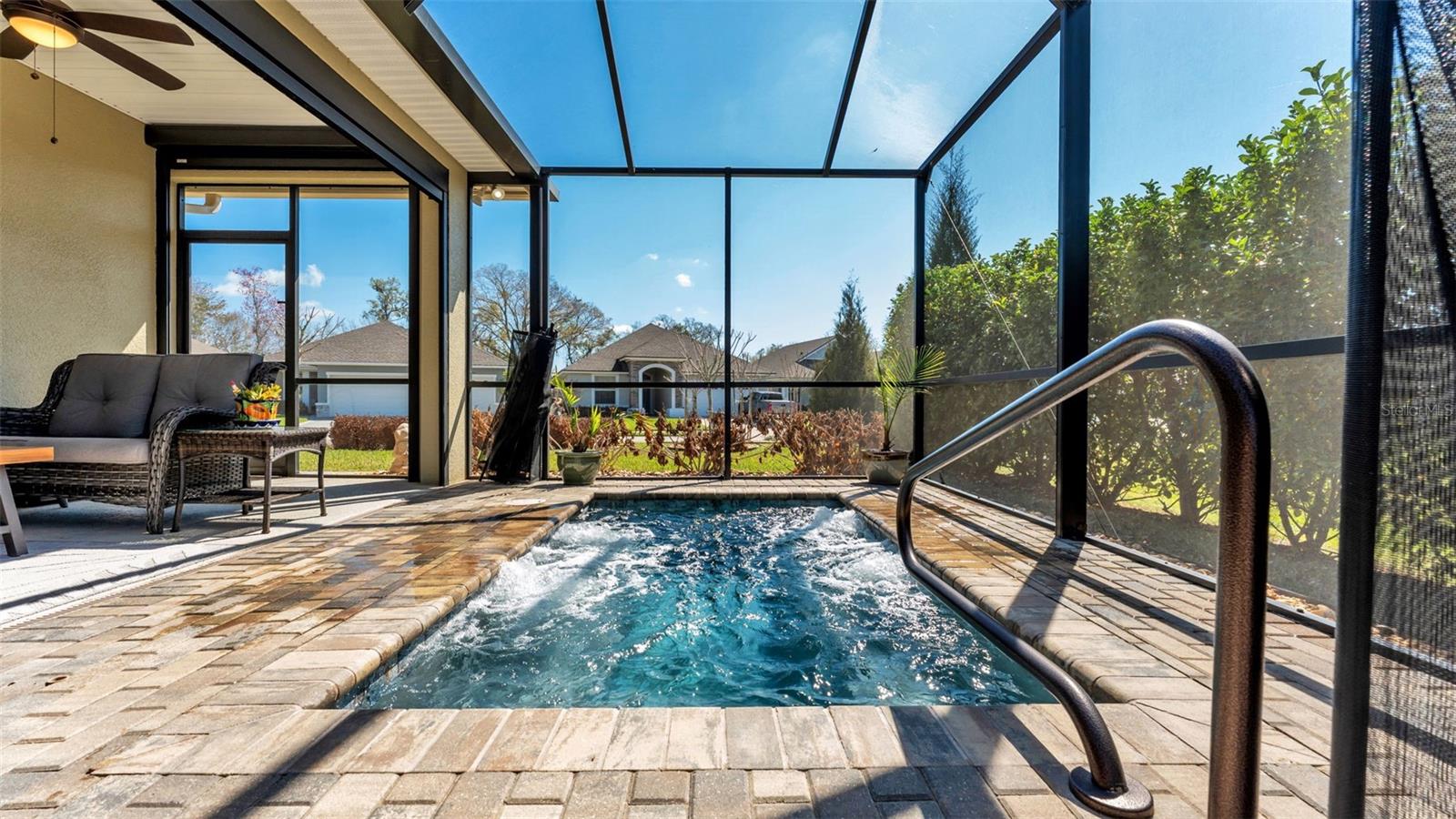 Positioned on a prime corner homesite within the exclusive 55+ gated community of Lake James Estates, this custom-built Ernie White “Miriam II” pool and spa residence blends refined design with effortless living. Thoughtfully customized for both elegance and function, this 2-bedroom, 2-bath home includes a versatile flex space ideal for a private office, third bedroom, or den. The open-concept floor plan is anchored by a chef-inspired kitchen that seamlessly connects to the dining and living areas — creating a sophisticated yet inviting atmosphere for entertaining and everyday comfort. Pocket sliding glass doors open to a beautifully extended screened brick paver lanai featuring a heated spa/spool and additional outdoor living space — the perfect setting for relaxation or hosting guests. Inside, a built-in electric fireplace enhances the living area while offering tranquil views of the pool. Luxury finishes and custom enhancements include: • Wood plank tile flooring throughout • Plantation shutters • Remote-controlled interior shades • Remote hurricane screens on lanai • Custom California Closets • Built-in drop zone • Dedicated garage laundry space • Expansive 3-car garage with golf cart storage Designed with accessibility and long-term livability in mind, the home offers widened entryways, a roll-in shower, modified primary bath counters, and automatic door openers — seamlessly integrated without compromising style. A Generac whole-house generator provides additional peace of mind. Residents of Lake James Estates enjoy maintenance-free living, with HOA services covering lawn care, landscaping, cable TV, internet, and common area maintenance — allowing you to focus on enjoying the lifestyle. This is a rare opportunity to own a highly customized, move-in-ready pool home in one of Lakeland’s premier active adult communities.