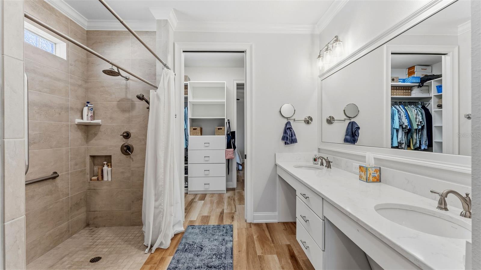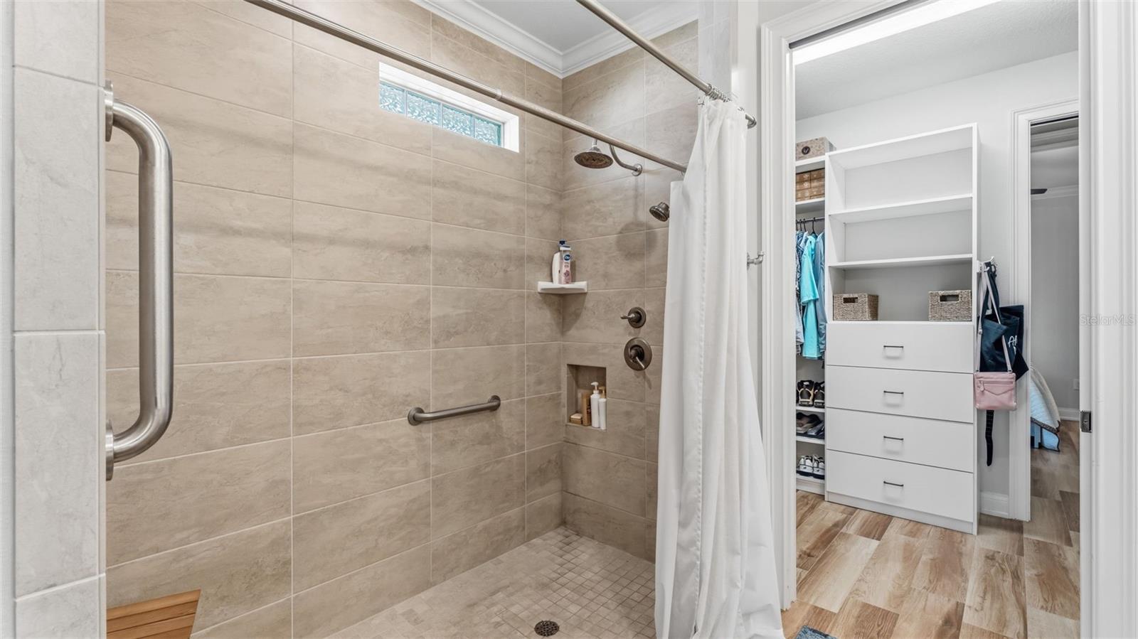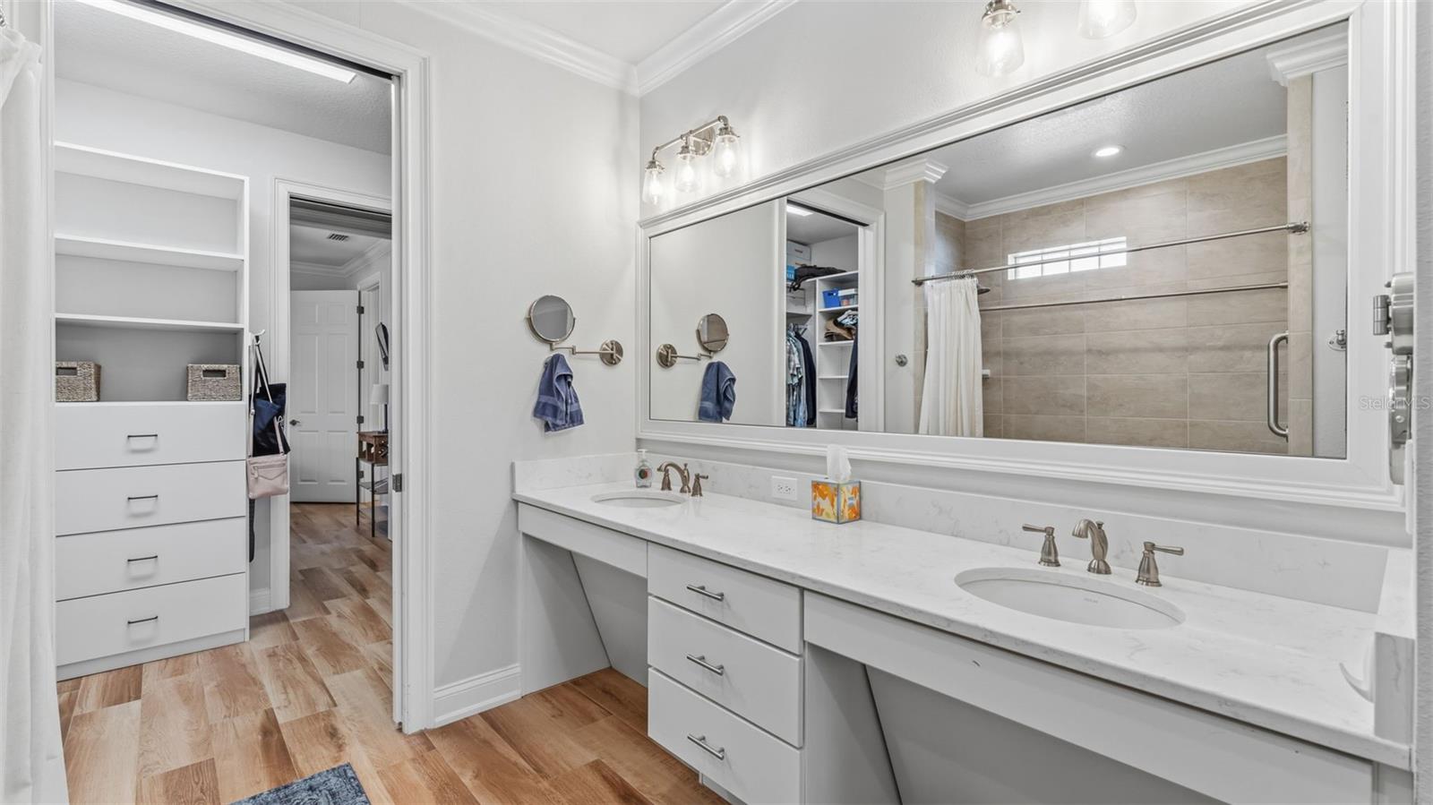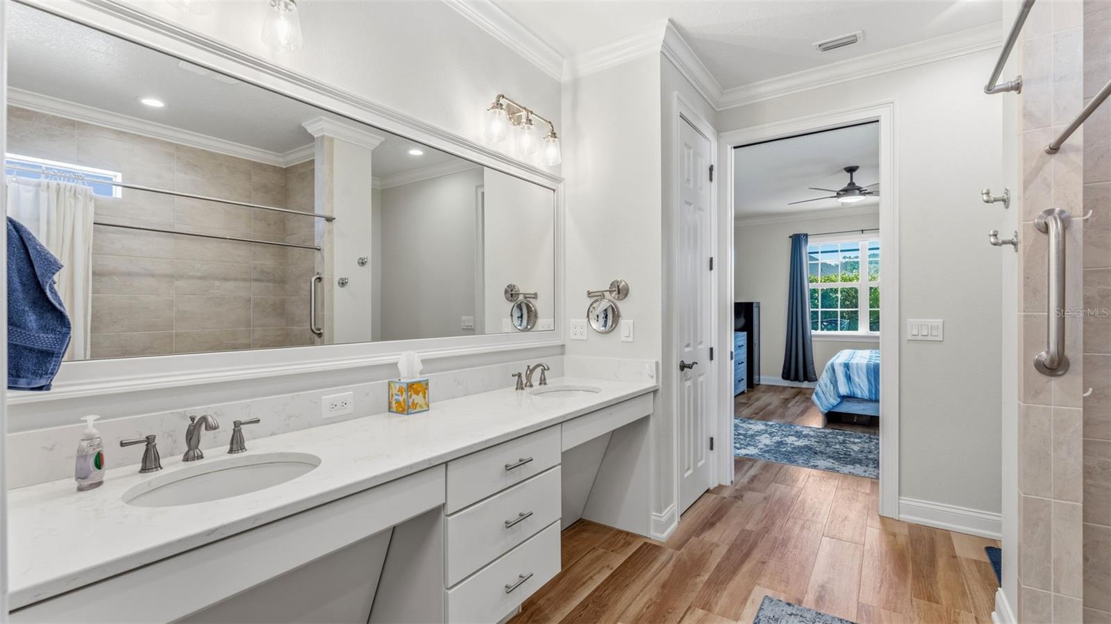 Positioned on a prime corner homesite within the exclusive 55+ gated community of Lake James Estates, this custom-built Ernie White “Miriam II” pool and spa residence blends refined design with effortless living. Thoughtfully customized for both elegance and function, this 2-bedroom, 2-bath home includes a versatile flex space ideal for a private office, third bedroom, or den. The open-concept floor plan is anchored by a chef-inspired kitchen that seamlessly connects to the dining and living areas — creating a sophisticated yet inviting atmosphere for entertaining and everyday comfort. Pocket sliding glass doors open to a beautifully extended screened brick paver lanai featuring a heated spa/spool and additional outdoor living space — the perfect setting for relaxation or hosting guests. Inside, a built-in electric fireplace enhances the living area while offering tranquil views of the pool. Luxury finishes and custom enhancements include: • Wood plank tile flooring throughout • Plantation shutters • Remote-controlled interior shades • Remote hurricane screens on lanai • Custom California Closets • Built-in drop zone • Dedicated garage laundry space • Expansive 3-car garage with golf cart storage Designed with accessibility and long-term livability in mind, the home offers widened entryways, a roll-in shower, modified primary bath counters, and automatic door openers — seamlessly integrated without compromising style. A Generac whole-house generator provides additional peace of mind. Residents of Lake James Estates enjoy maintenance-free living, with HOA services covering lawn care, landscaping, cable TV, internet, and common area maintenance — allowing you to focus on enjoying the lifestyle. This is a rare opportunity to own a highly customized, move-in-ready pool home in one of Lakeland’s premier active adult communities.