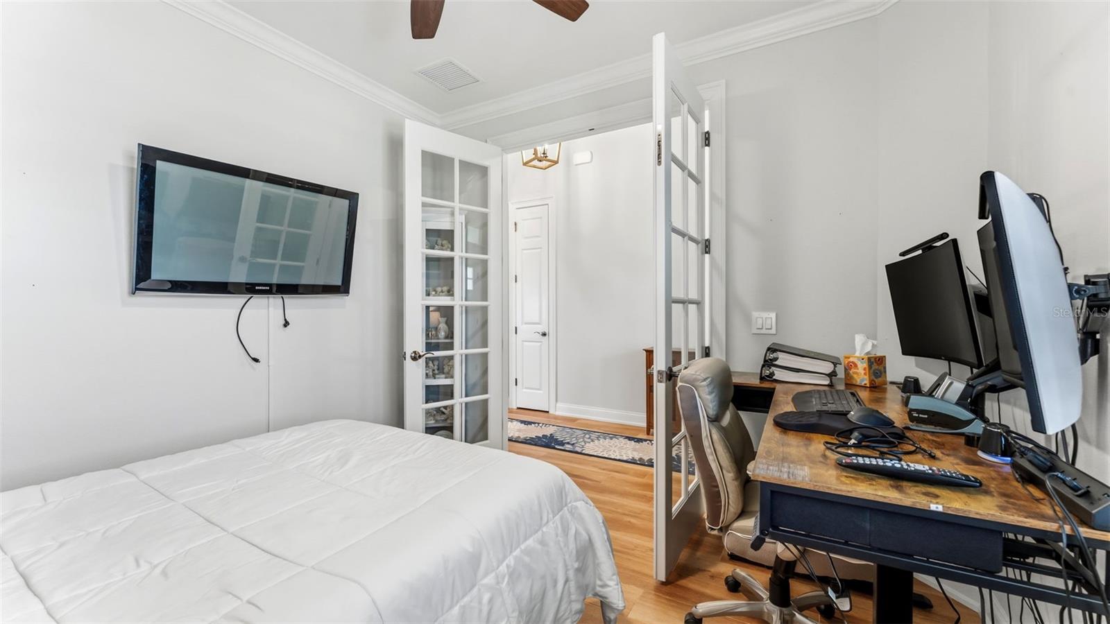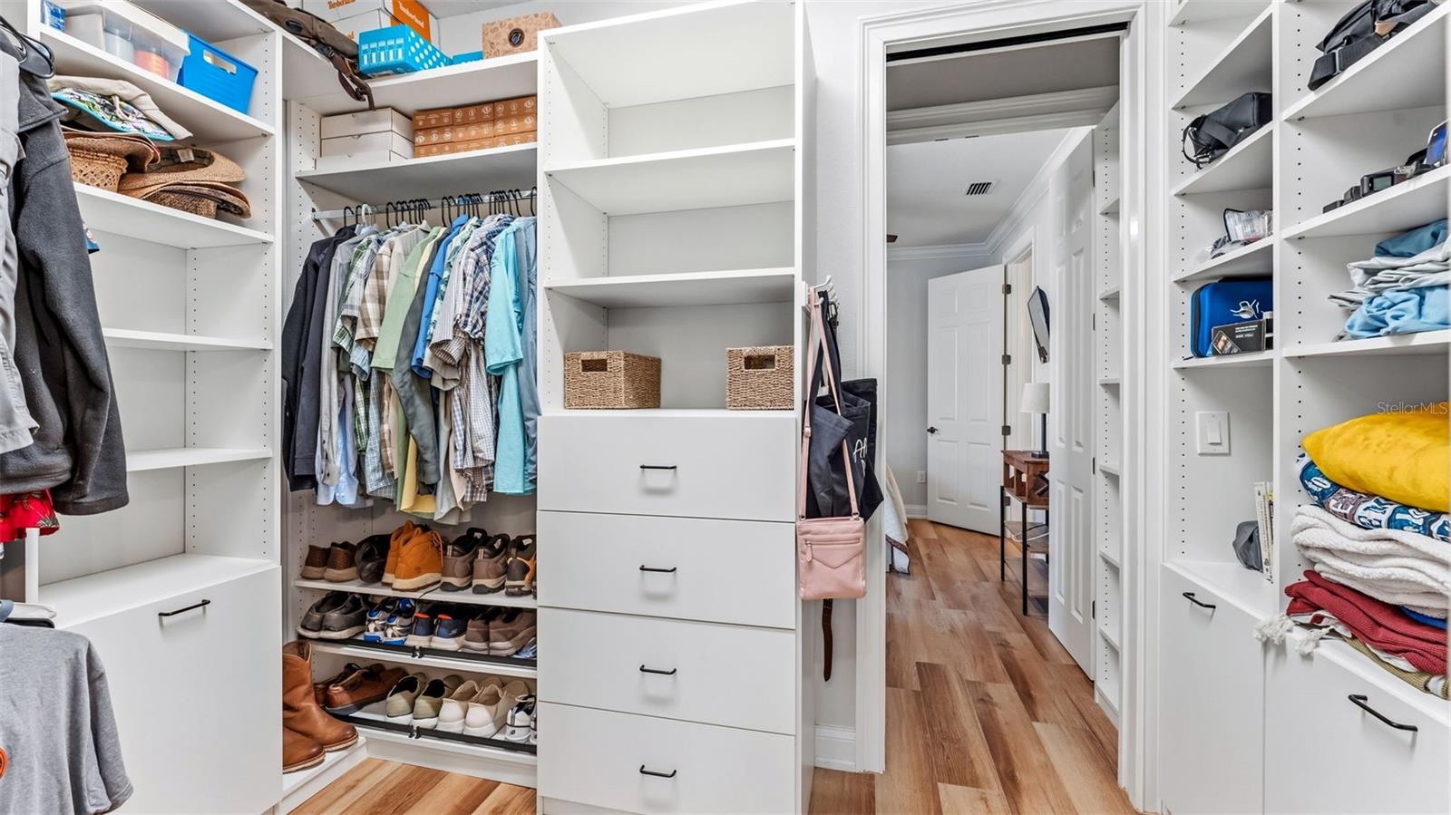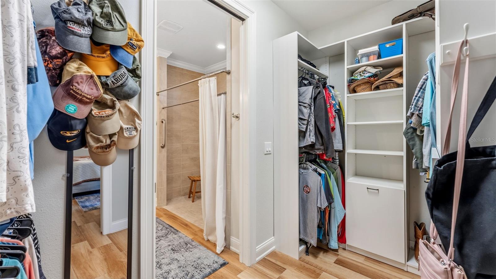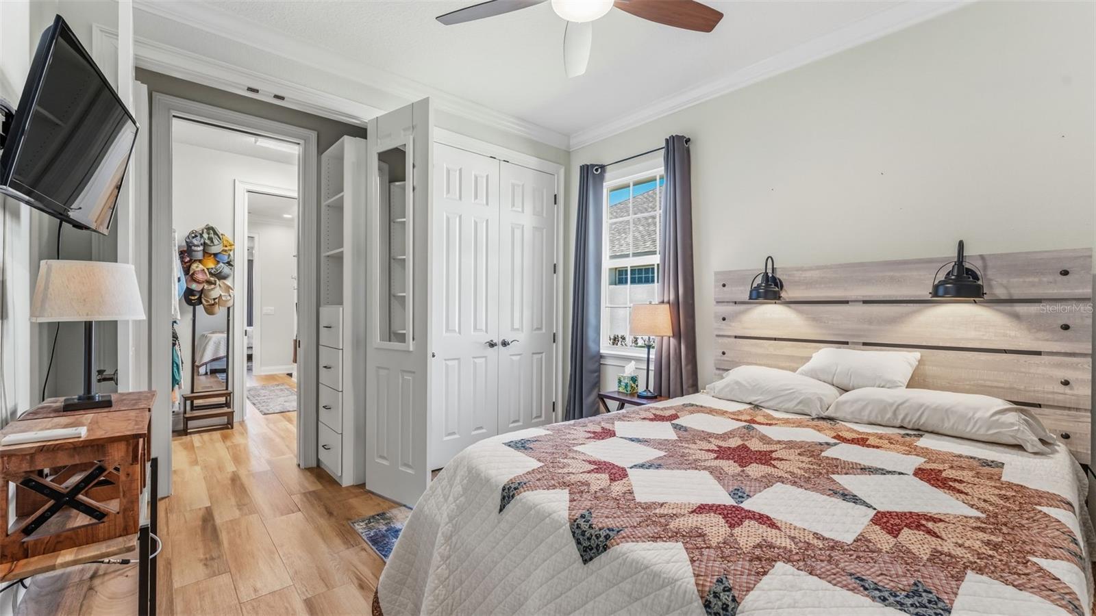 Positioned on a prime corner homesite within the exclusive 55+ gated community of Lake James Estates, this custom-built Ernie White “Miriam II” pool and spa residence blends refined design with effortless living. Thoughtfully customized for both elegance and function, this 2-bedroom, 2-bath home includes a versatile flex space ideal for a private office, third bedroom, or den. The open-concept floor plan is anchored by a chef-inspired kitchen that seamlessly connects to the dining and living areas — creating a sophisticated yet inviting atmosphere for entertaining and everyday comfort. Pocket sliding glass doors open to a beautifully extended screened brick paver lanai featuring a heated spa/spool and additional outdoor living space — the perfect setting for relaxation or hosting guests. Inside, a built-in electric fireplace enhances the living area while offering tranquil views of the pool. Luxury finishes and custom enhancements include: • Wood plank tile flooring throughout • Plantation shutters • Remote-controlled interior shades • Remote hurricane screens on lanai • Custom California Closets • Built-in drop zone • Dedicated garage laundry space • Expansive 3-car garage with golf cart storage Designed with accessibility and long-term livability in mind, the home offers widened entryways, a roll-in shower, modified primary bath counters, and automatic door openers — seamlessly integrated without compromising style. A Generac whole-house generator provides additional peace of mind. Residents of Lake James Estates enjoy maintenance-free living, with HOA services covering lawn care, landscaping, cable TV, internet, and common area maintenance — allowing you to focus on enjoying the lifestyle. This is a rare opportunity to own a highly customized, move-in-ready pool home in one of Lakeland’s premier active adult communities.