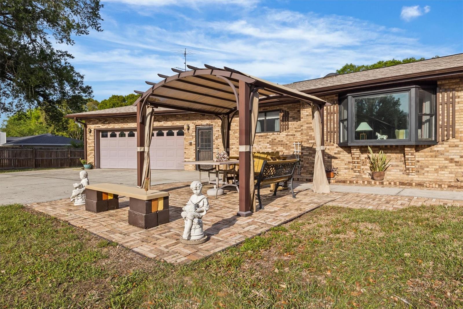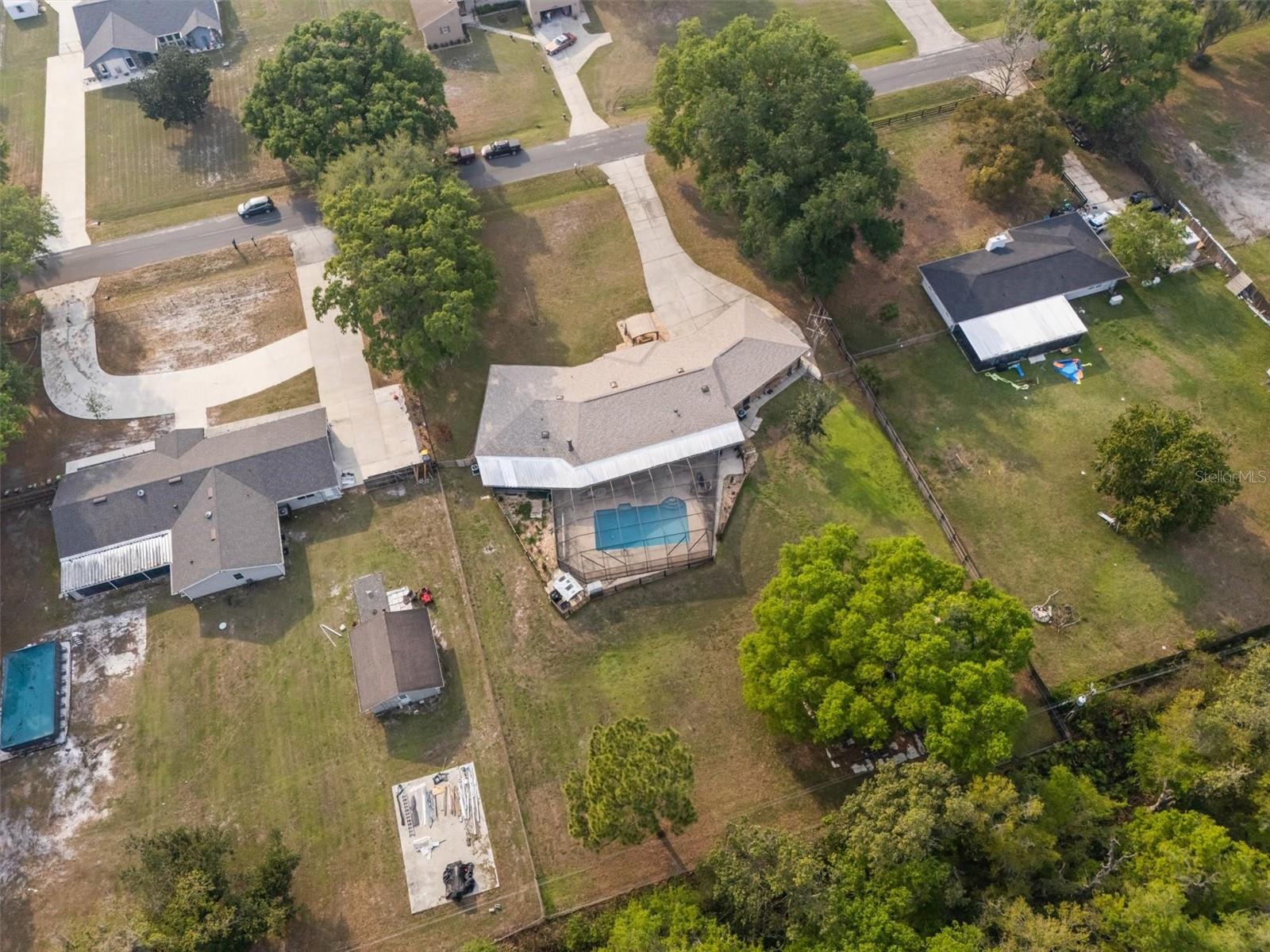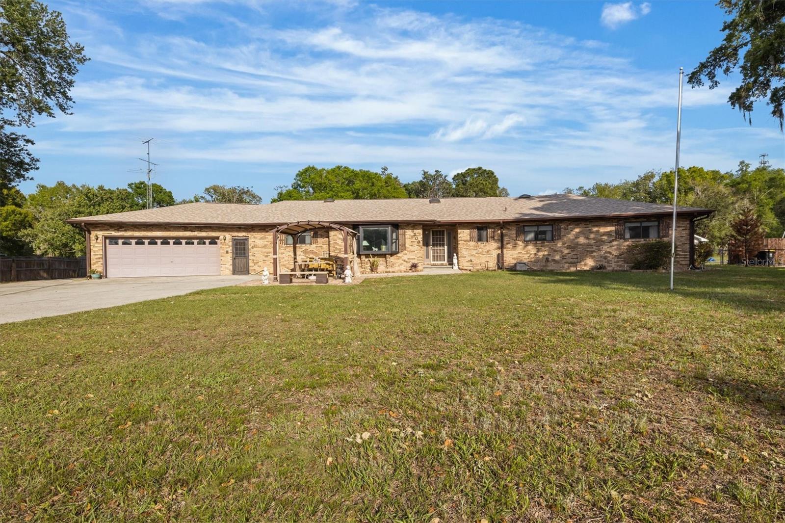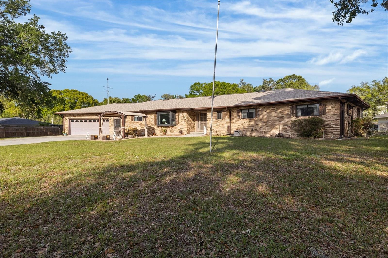 This spacious brick home truly has room for the whole family. Situated on nearly an acre (in a neighborhood with NO HOA), it offers 2,993 sq ft of living space, four bedrooms, and three bathrooms, along with an impressive 16×32 heated pool inside a massive screened enclosure. The oversized attached garage—28 feet deep and 942 square feet, provides exceptional storage and parking flexibility. Inside, newer laminate flooring flows throughout the main living areas. The huge kitchen features an island with built in seating, abundant cabinetry, and an adjoining dining area large enough for a ten foot table. A formal living room with a bay window adds charm, while the spacious family room offers a cozy brick faced wood burning fireplace. The primary suite is generously sized and includes a large walk in closet plus direct access to an enclosed screened room—perfect for extra relaxation space. All additional bedrooms are comfortably sized and easily accommodate queen bedroom sets with room to spare. The large laundry room includes extensive storage and a versatile 7×7 flex area ideal for an office or craft space. Thoughtfully placed closets throughout the home ensure excellent storage. Out back, the expansive screened enclosure provides a nine foot covered area for outdoor enjoyment. The property also includes a 10×20 powered shed, a 5×8 storage shed, and wiring to support an RV and a generator. Major updates include a new roof in 2025 and a recently replaced water heater. This home offers abundant living space, exceptional storage, and a fantastic outdoor setup—everything your family needs to spread out and enjoy.