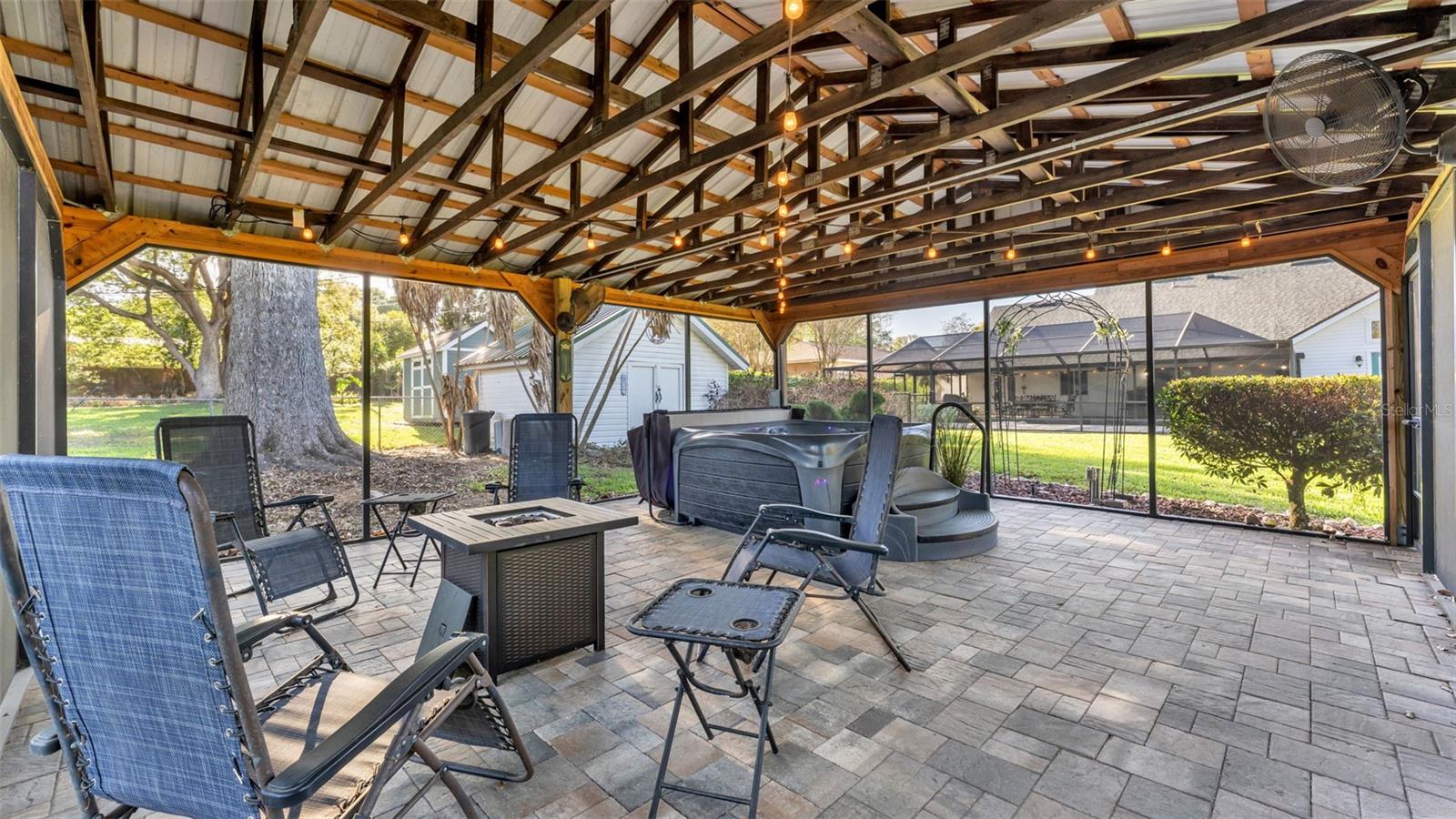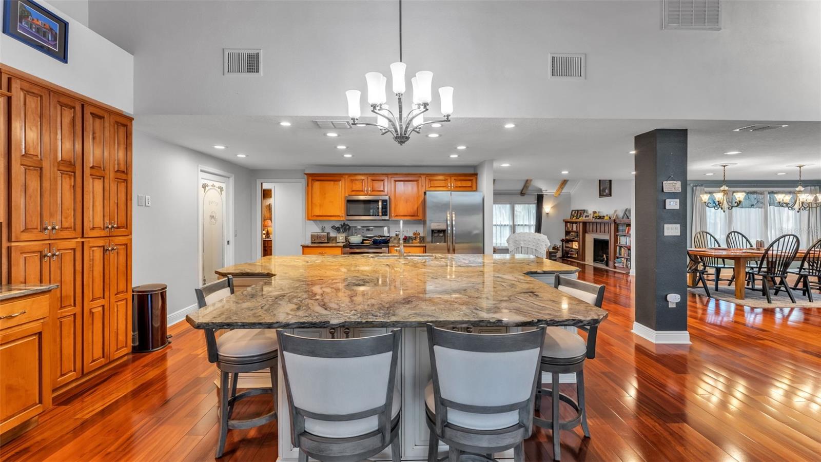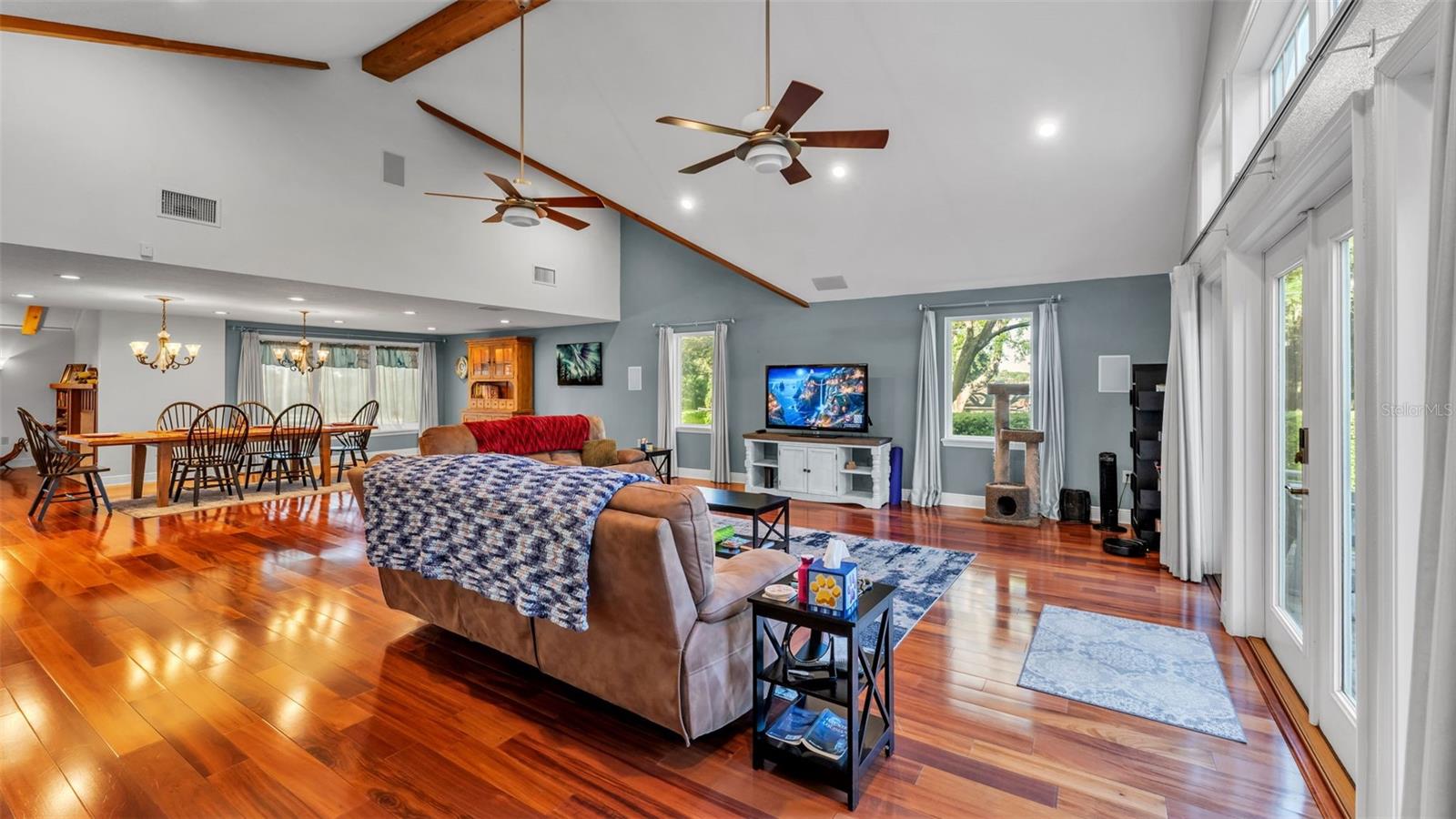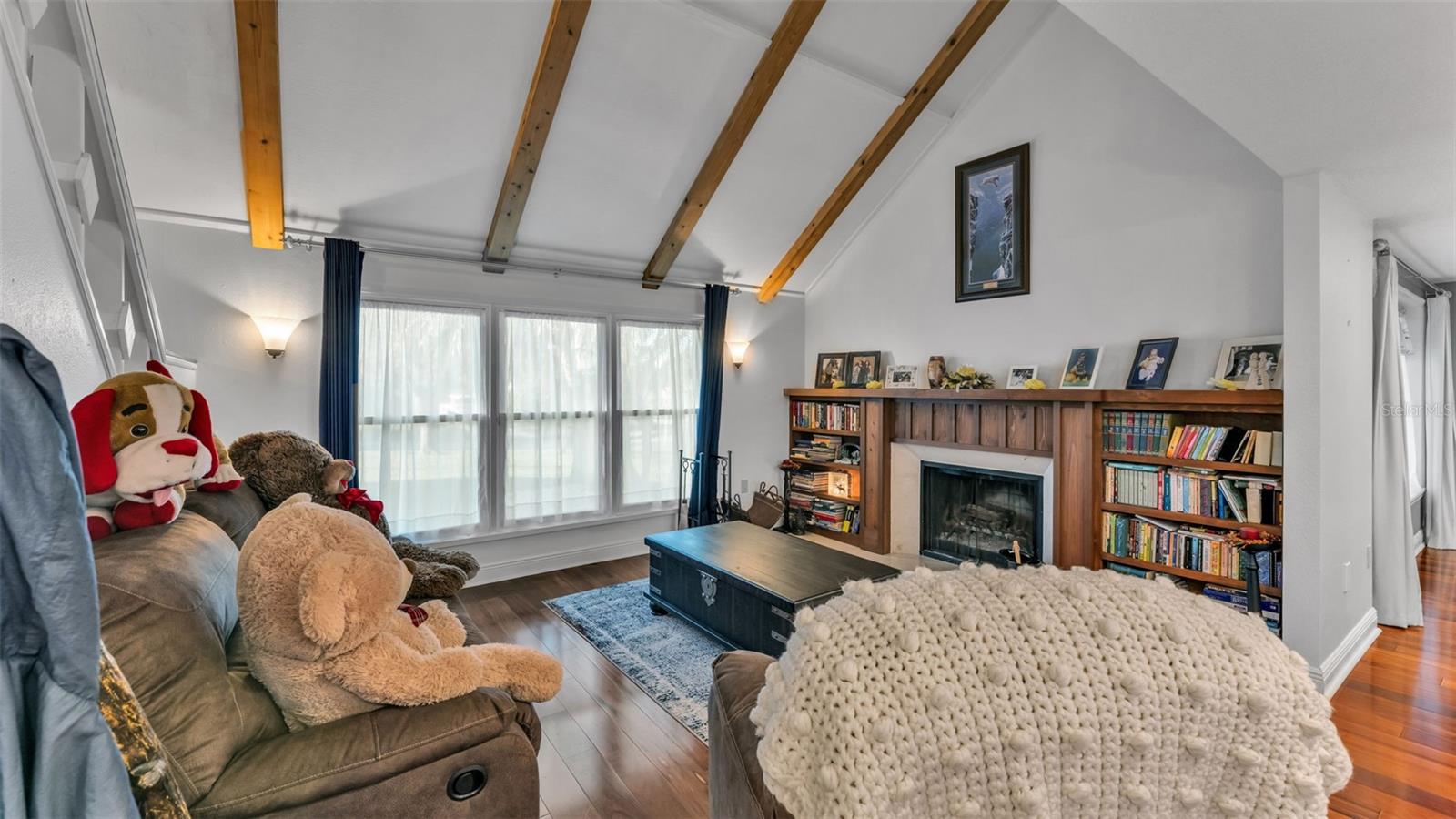 This magnificent home offers an impressive list of premium features and thoughtful recent updates throughout. As soon as you step inside, the quality is evident: gleaming hardwood floors, soaring cathedral ceilings, stunning exposed beams, and a spacious open-concept layout centered around a cozy wood-burning fireplace. The chef’s kitchen is truly a highlight, featuring a double oven, updated high-end energy-efficient appliances, solid wood cabinetry, beautiful granite countertops, a built-in coffee bar, and a large island with seating for seven. The home is bright and welcoming with hurricane- and burglar-resistant windows throughout (equipped with safety coating that will not break). It is listed as a 3-bedroom but can easily function as a 4-bedroom. Two separate staircases offer convenient and private access to the upstairs. All lighting has been upgraded to energy-efficient LED, and motion-detection lighting enhances exterior safety. Additional smart upgrades include an in-duct UV air sterilization system for cleaner indoor air, updated moisture barrier and siding, a solid-core front door with security peephole, a storm door with built-in screen, and a hurricane-rated garage door with automatic deadbolts. A full security system with owned cameras monitors the exterior and select interior areas. A solid-block 180 sq ft hurricane/safe room provides Category 5 storm protection. The home features two master suites, a downstairs master with a refreshed ceiling and a fully updated upstairs master bath, plus a high-efficiency hot water heater. Outside is an entertainer’s dream. The sparkling Pebble-Tek saltwater pool has been completely refreshed with a new pump, cleaning system, directional LED lighting, and upgraded pavers with oversized deck drains. Pop-up and French drains keep the area dry, while efficient roof panels on the pool lanai reduce heat. A fenced dog run with doggie door, full irrigation system in both front and backyard with rain sensors, and a dedicated well for backup water and irrigation complete the outdoor functionality. Additional highlights include a new septic system and leach field, a large pole barn and shed, both with new 220/110 electrical service, ideal for RV and boat storage, plus dusk-to-dawn LED lighting. You’ll also enjoy the spacious screened family pavilion with full electrical service and an above-ground Jacuzzi, perfect for relaxing and entertaining. This property truly has it all, exceptional construction, extensive modern updates, strong storm protection, and outstanding outdoor living spaces. You must see it in person to fully appreciate everything this home has to offer!