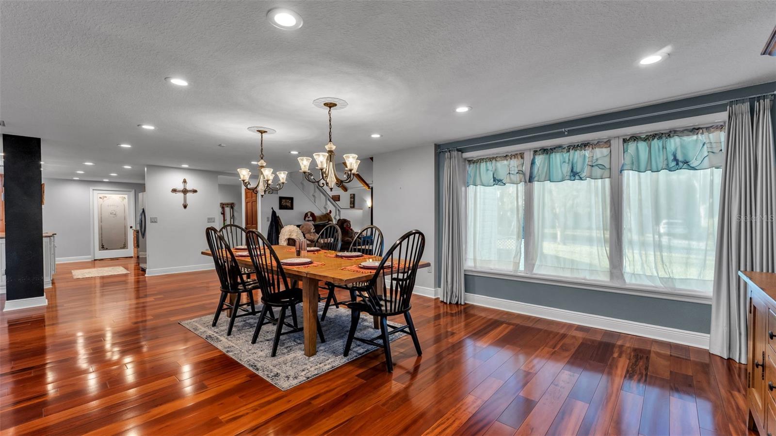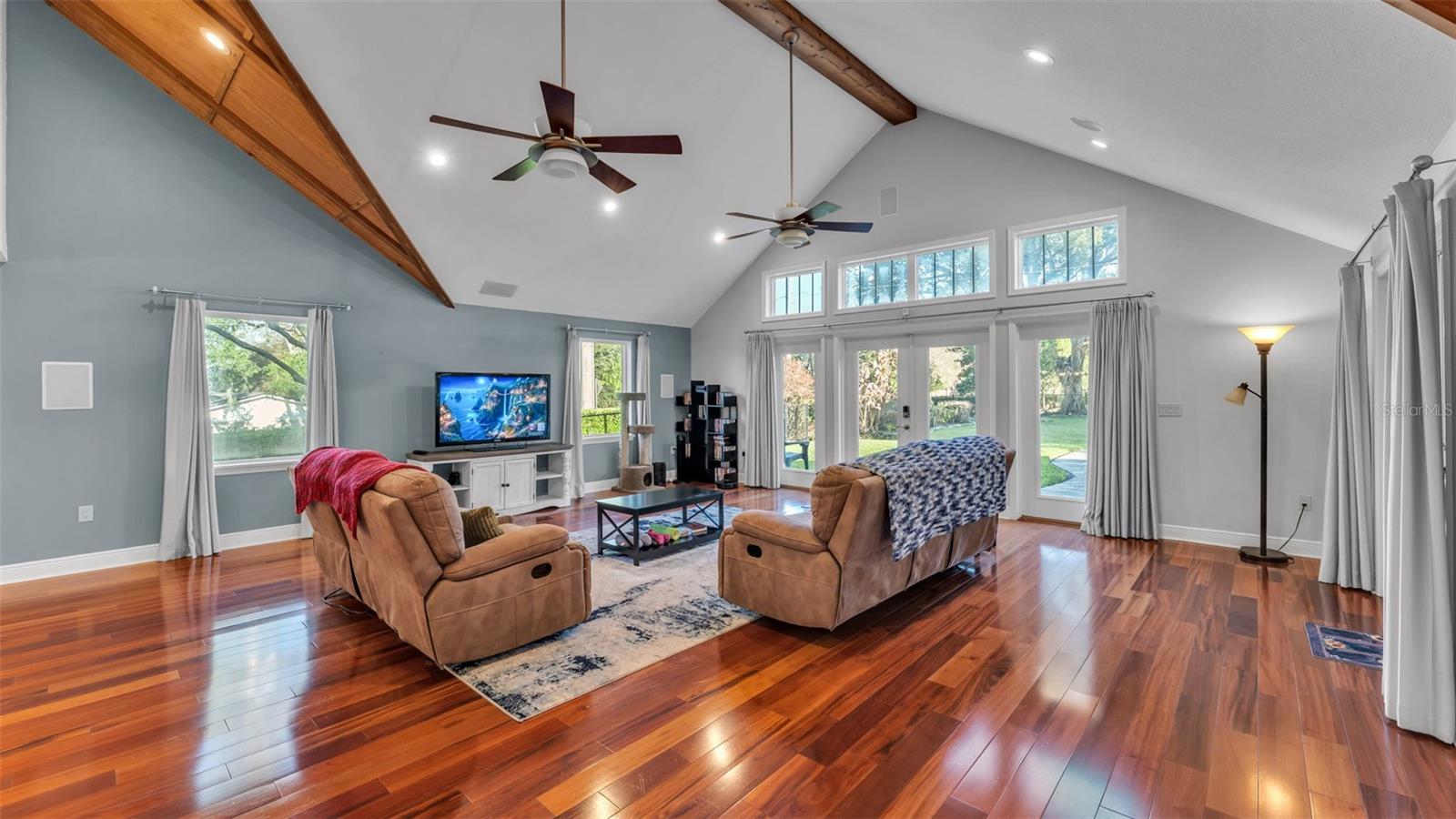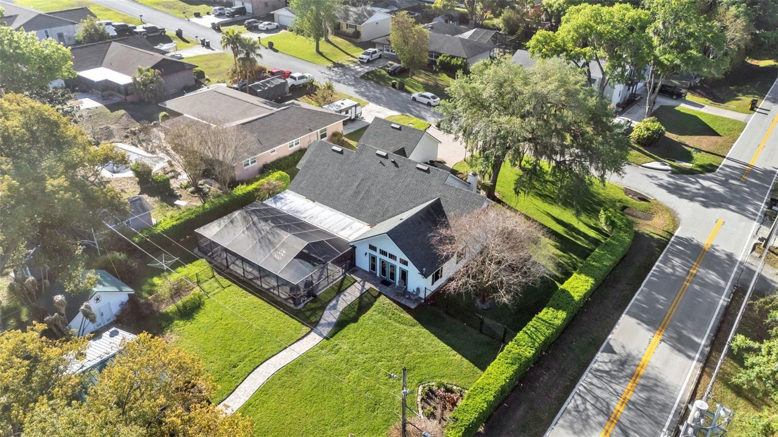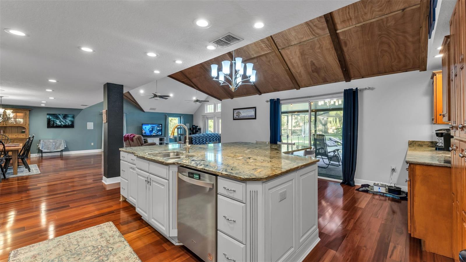 This magnificent home offers an impressive list of premium features and thoughtful recent updates throughout. As soon as you step inside, the quality is evident: gleaming hardwood floors, soaring cathedral ceilings, stunning exposed beams, and a spacious open-concept layout centered around a cozy wood-burning fireplace. The chef’s kitchen is truly a highlight, featuring a double oven, updated high-end energy-efficient appliances, solid wood cabinetry, beautiful granite countertops, a built-in coffee bar, and a large island with seating for seven. The home is bright and welcoming with hurricane- and burglar-resistant windows throughout (equipped with safety coating that will not break). It is listed as a 3-bedroom but can easily function as a 4-bedroom. Two separate staircases offer convenient and private access to the upstairs. All lighting has been upgraded to energy-efficient LED, and motion-detection lighting enhances exterior safety. Additional smart upgrades include an in-duct UV air sterilization system for cleaner indoor air, updated moisture barrier and siding, a solid-core front door with security peephole, a storm door with built-in screen, and a hurricane-rated garage door with automatic deadbolts. A full security system with owned cameras monitors the exterior and select interior areas. A solid-block 180 sq ft hurricane/safe room provides Category 5 storm protection. The home features two master suites, a downstairs master with a refreshed ceiling and a fully updated upstairs master bath, plus a high-efficiency hot water heater. Outside is an entertainer’s dream. The sparkling Pebble-Tek saltwater pool has been completely refreshed with a new pump, cleaning system, directional LED lighting, and upgraded pavers with oversized deck drains. Pop-up and French drains keep the area dry, while efficient roof panels on the pool lanai reduce heat. A fenced dog run with doggie door, full irrigation system in both front and backyard with rain sensors, and a dedicated well for backup water and irrigation complete the outdoor functionality. Additional highlights include a new septic system and leach field, a large pole barn and shed, both with new 220/110 electrical service, ideal for RV and boat storage, plus dusk-to-dawn LED lighting. You’ll also enjoy the spacious screened family pavilion with full electrical service and an above-ground Jacuzzi, perfect for relaxing and entertaining. This property truly has it all, exceptional construction, extensive modern updates, strong storm protection, and outstanding outdoor living spaces. You must see it in person to fully appreciate everything this home has to offer!