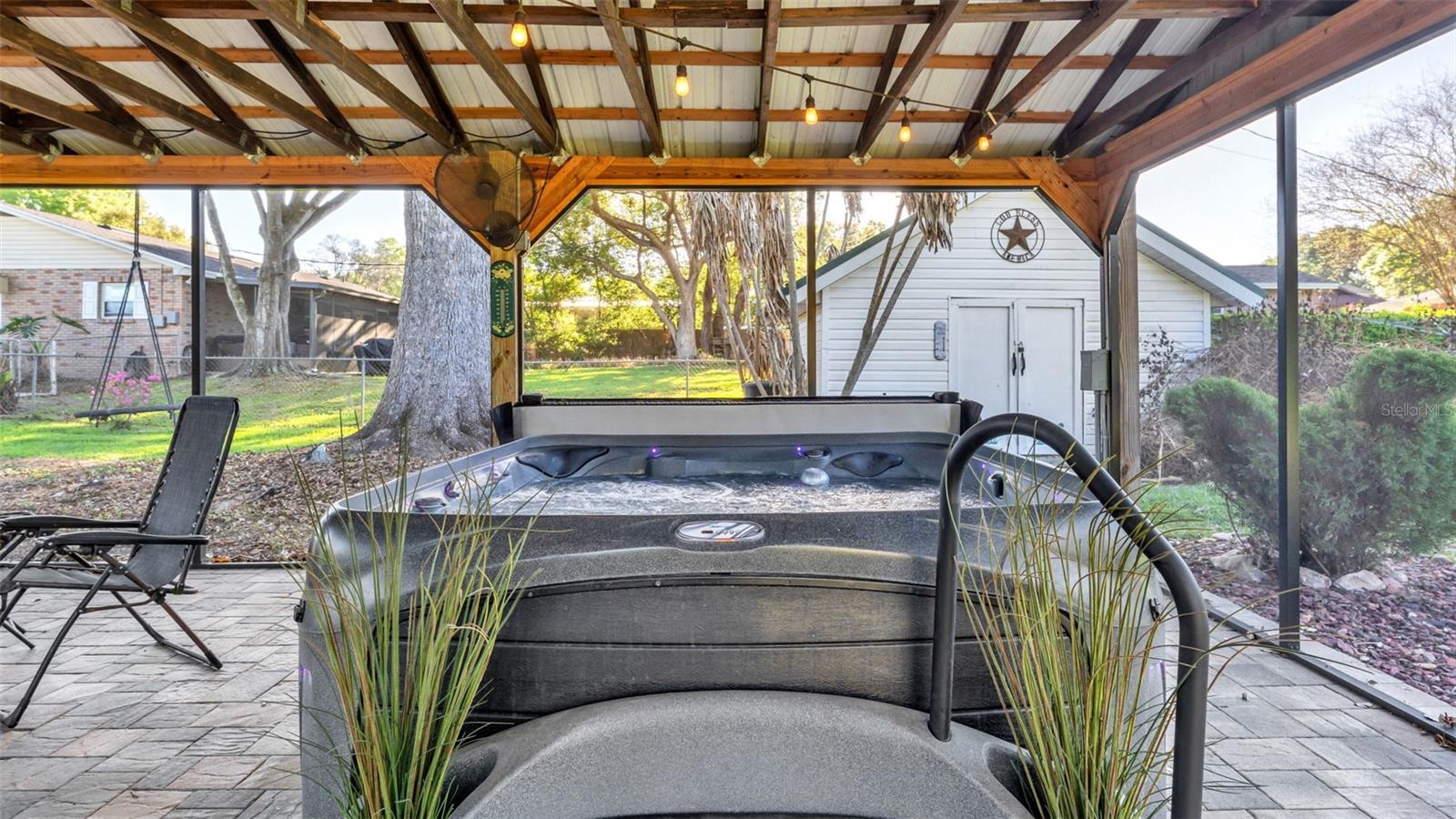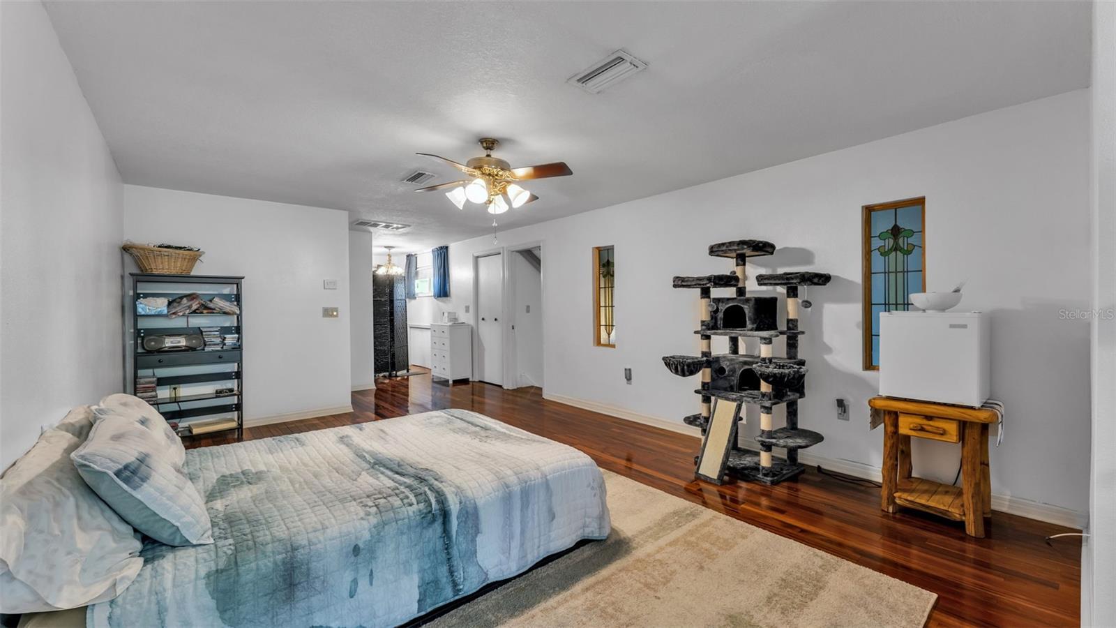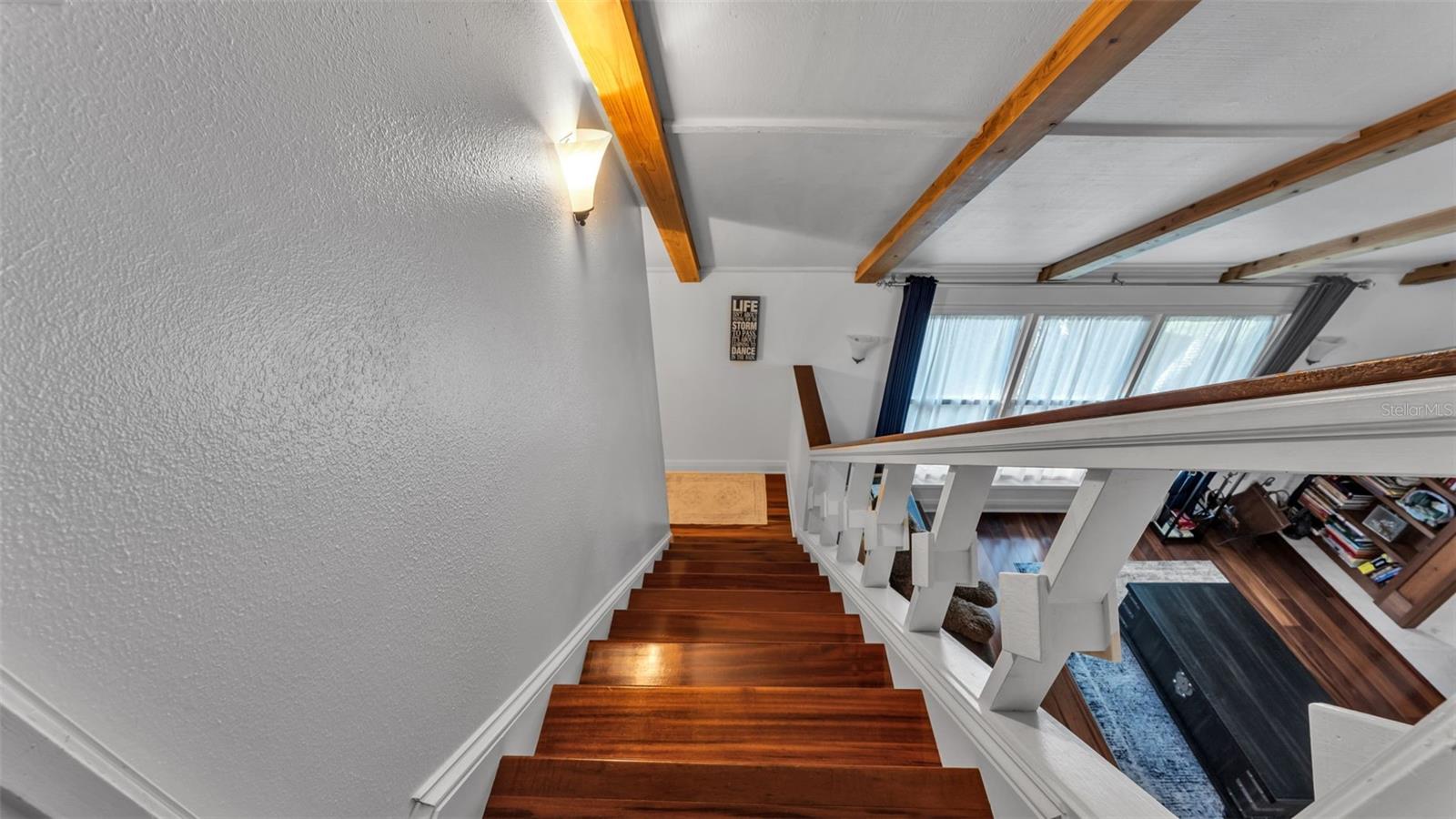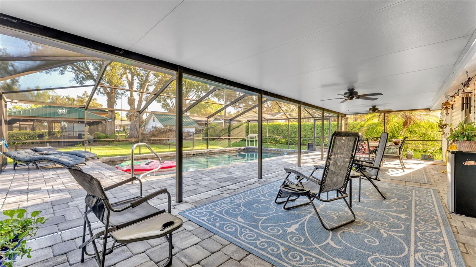 This magnificent home offers an impressive list of premium features and thoughtful recent updates throughout. As soon as you step inside, the quality is evident: gleaming hardwood floors, soaring cathedral ceilings, stunning exposed beams, and a spacious open-concept layout centered around a cozy wood-burning fireplace. The chef’s kitchen is truly a highlight, featuring a double oven, updated high-end energy-efficient appliances, solid wood cabinetry, beautiful granite countertops, a built-in coffee bar, and a large island with seating for seven. The home is bright and welcoming with hurricane- and burglar-resistant windows throughout (equipped with safety coating that will not break). It is listed as a 3-bedroom but can easily function as a 4-bedroom. Two separate staircases offer convenient and private access to the upstairs. All lighting has been upgraded to energy-efficient LED, and motion-detection lighting enhances exterior safety. Additional smart upgrades include an in-duct UV air sterilization system for cleaner indoor air, updated moisture barrier and siding, a solid-core front door with security peephole, a storm door with built-in screen, and a hurricane-rated garage door with automatic deadbolts. A full security system with owned cameras monitors the exterior and select interior areas. A solid-block 180 sq ft hurricane/safe room provides Category 5 storm protection. The home features two master suites, a downstairs master with a refreshed ceiling and a fully updated upstairs master bath, plus a high-efficiency hot water heater. Outside is an entertainer’s dream. The sparkling Pebble-Tek saltwater pool has been completely refreshed with a new pump, cleaning system, directional LED lighting, and upgraded pavers with oversized deck drains. Pop-up and French drains keep the area dry, while efficient roof panels on the pool lanai reduce heat. A fenced dog run with doggie door, full irrigation system in both front and backyard with rain sensors, and a dedicated well for backup water and irrigation complete the outdoor functionality. Additional highlights include a new septic system and leach field, a large pole barn and shed, both with new 220/110 electrical service, ideal for RV and boat storage, plus dusk-to-dawn LED lighting. You’ll also enjoy the spacious screened family pavilion with full electrical service and an above-ground Jacuzzi, perfect for relaxing and entertaining. This property truly has it all, exceptional construction, extensive modern updates, strong storm protection, and outstanding outdoor living spaces. You must see it in person to fully appreciate everything this home has to offer!