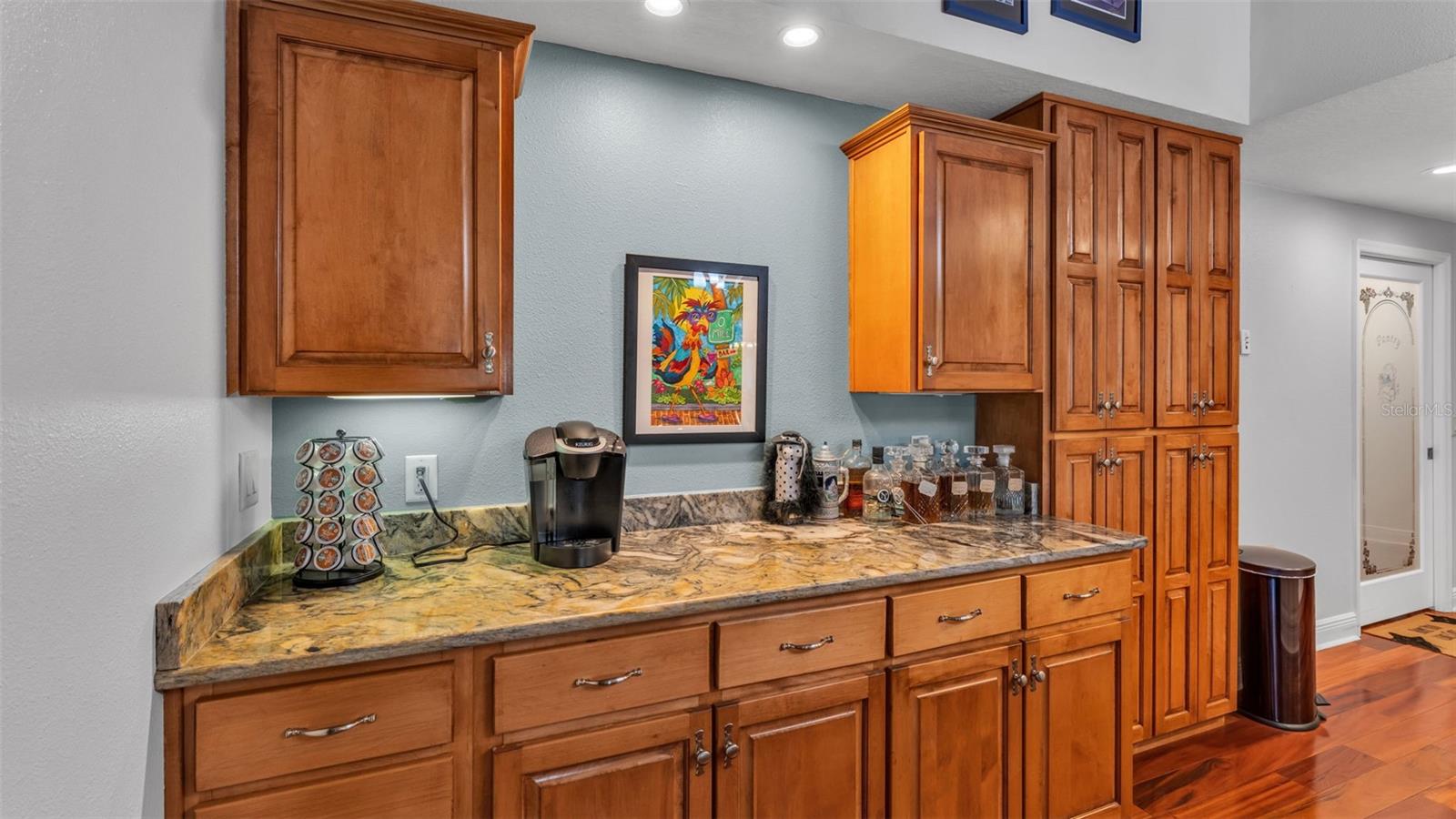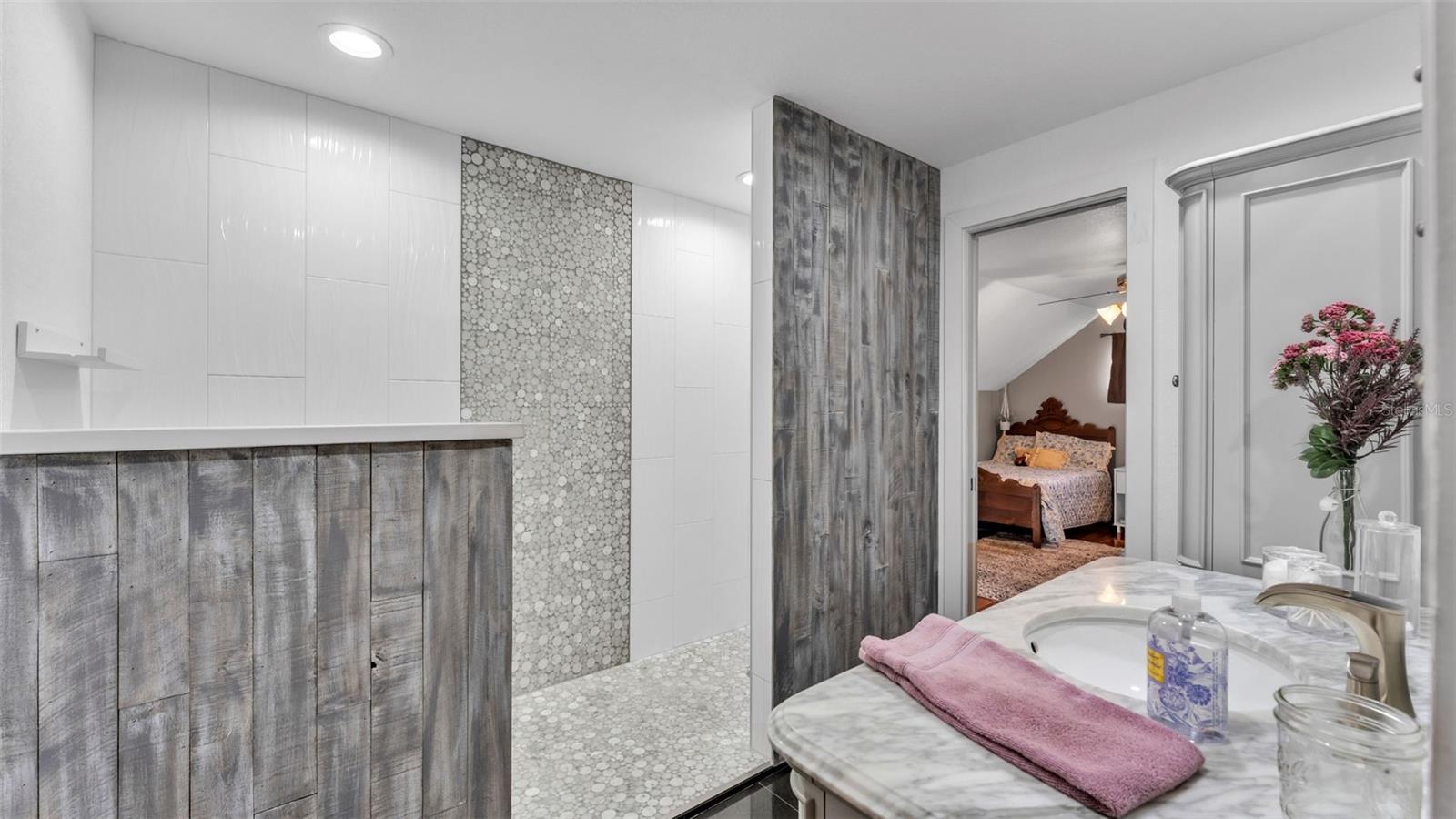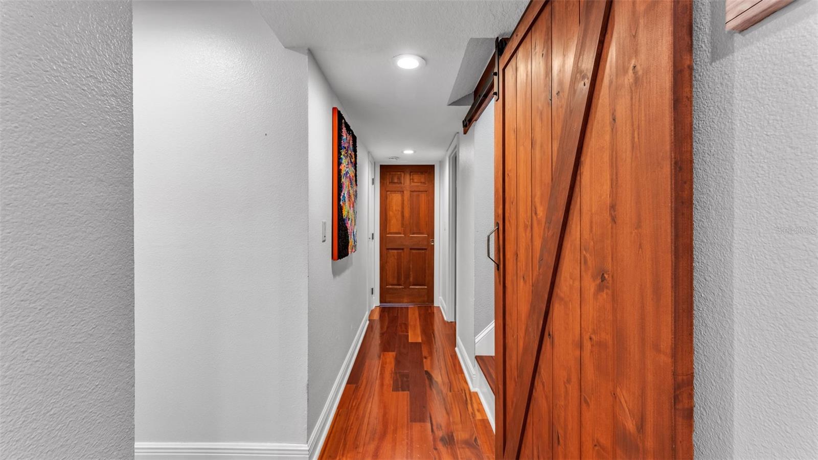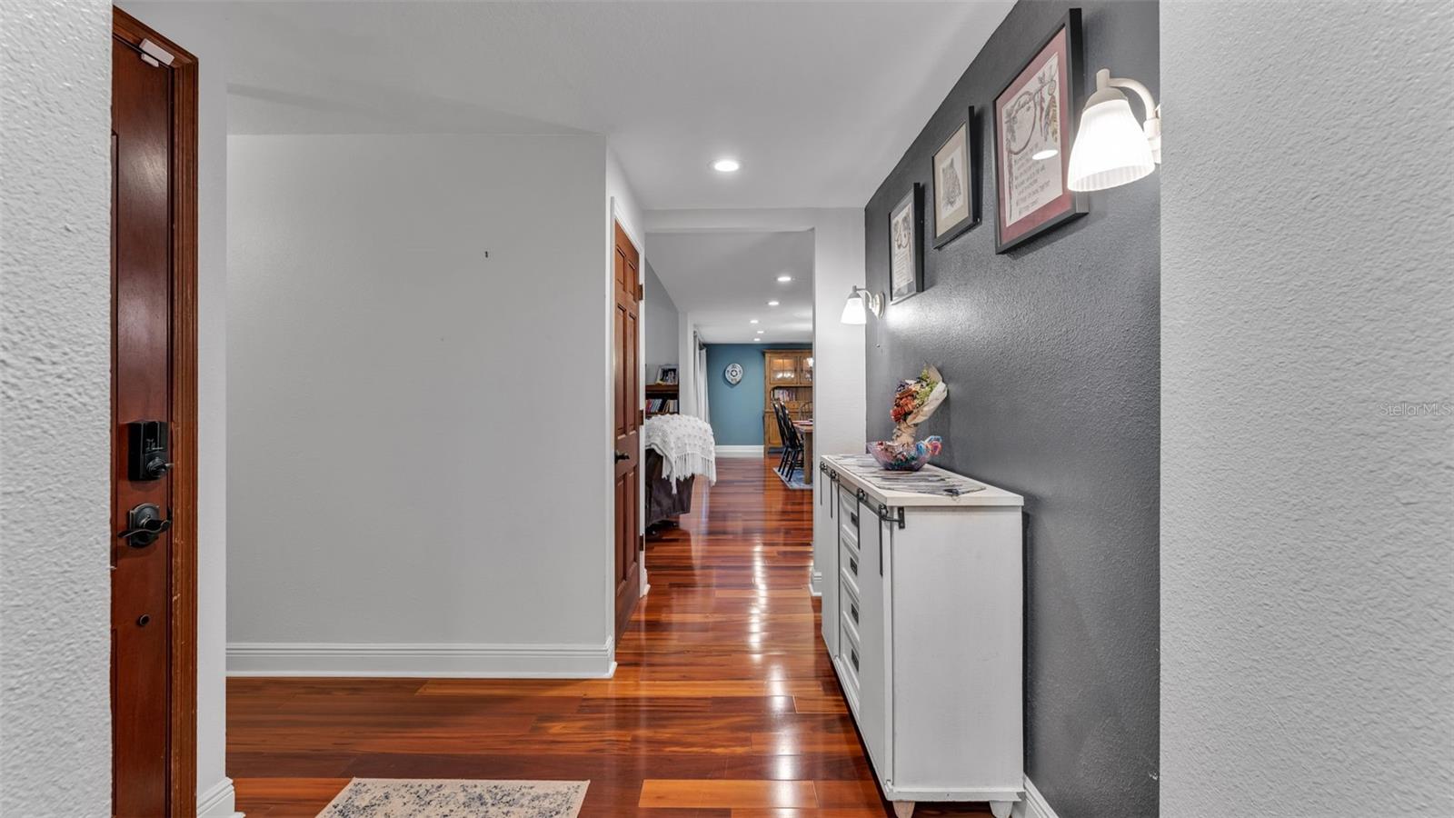 This magnificent home offers an impressive list of premium features and thoughtful recent updates throughout. As soon as you step inside, the quality is evident: gleaming hardwood floors, soaring cathedral ceilings, stunning exposed beams, and a spacious open-concept layout centered around a cozy wood-burning fireplace. The chef’s kitchen is truly a highlight, featuring a double oven, updated high-end energy-efficient appliances, solid wood cabinetry, beautiful granite countertops, a built-in coffee bar, and a large island with seating for seven. The home is bright and welcoming with hurricane- and burglar-resistant windows throughout (equipped with safety coating that will not break). It is listed as a 3-bedroom but can easily function as a 4-bedroom. Two separate staircases offer convenient and private access to the upstairs. All lighting has been upgraded to energy-efficient LED, and motion-detection lighting enhances exterior safety. Additional smart upgrades include an in-duct UV air sterilization system for cleaner indoor air, updated moisture barrier and siding, a solid-core front door with security peephole, a storm door with built-in screen, and a hurricane-rated garage door with automatic deadbolts. A full security system with owned cameras monitors the exterior and select interior areas. A solid-block 180 sq ft hurricane/safe room provides Category 5 storm protection. The home features two master suites, a downstairs master with a refreshed ceiling and a fully updated upstairs master bath, plus a high-efficiency hot water heater. Outside is an entertainer’s dream. The sparkling Pebble-Tek saltwater pool has been completely refreshed with a new pump, cleaning system, directional LED lighting, and upgraded pavers with oversized deck drains. Pop-up and French drains keep the area dry, while efficient roof panels on the pool lanai reduce heat. A fenced dog run with doggie door, full irrigation system in both front and backyard with rain sensors, and a dedicated well for backup water and irrigation complete the outdoor functionality. Additional highlights include a new septic system and leach field, a large pole barn and shed, both with new 220/110 electrical service, ideal for RV and boat storage, plus dusk-to-dawn LED lighting. You’ll also enjoy the spacious screened family pavilion with full electrical service and an above-ground Jacuzzi, perfect for relaxing and entertaining. This property truly has it all, exceptional construction, extensive modern updates, strong storm protection, and outstanding outdoor living spaces. You must see it in person to fully appreciate everything this home has to offer!