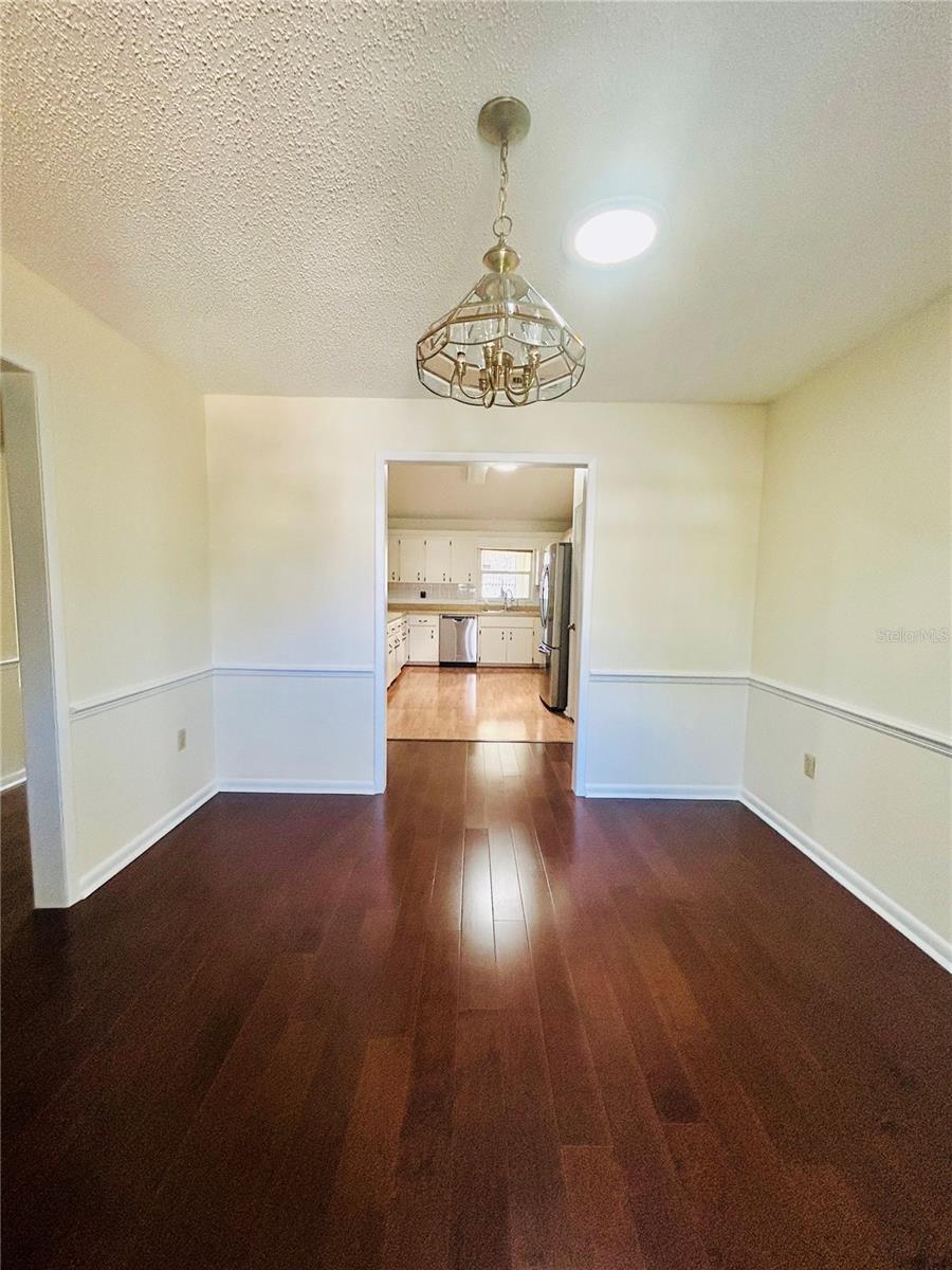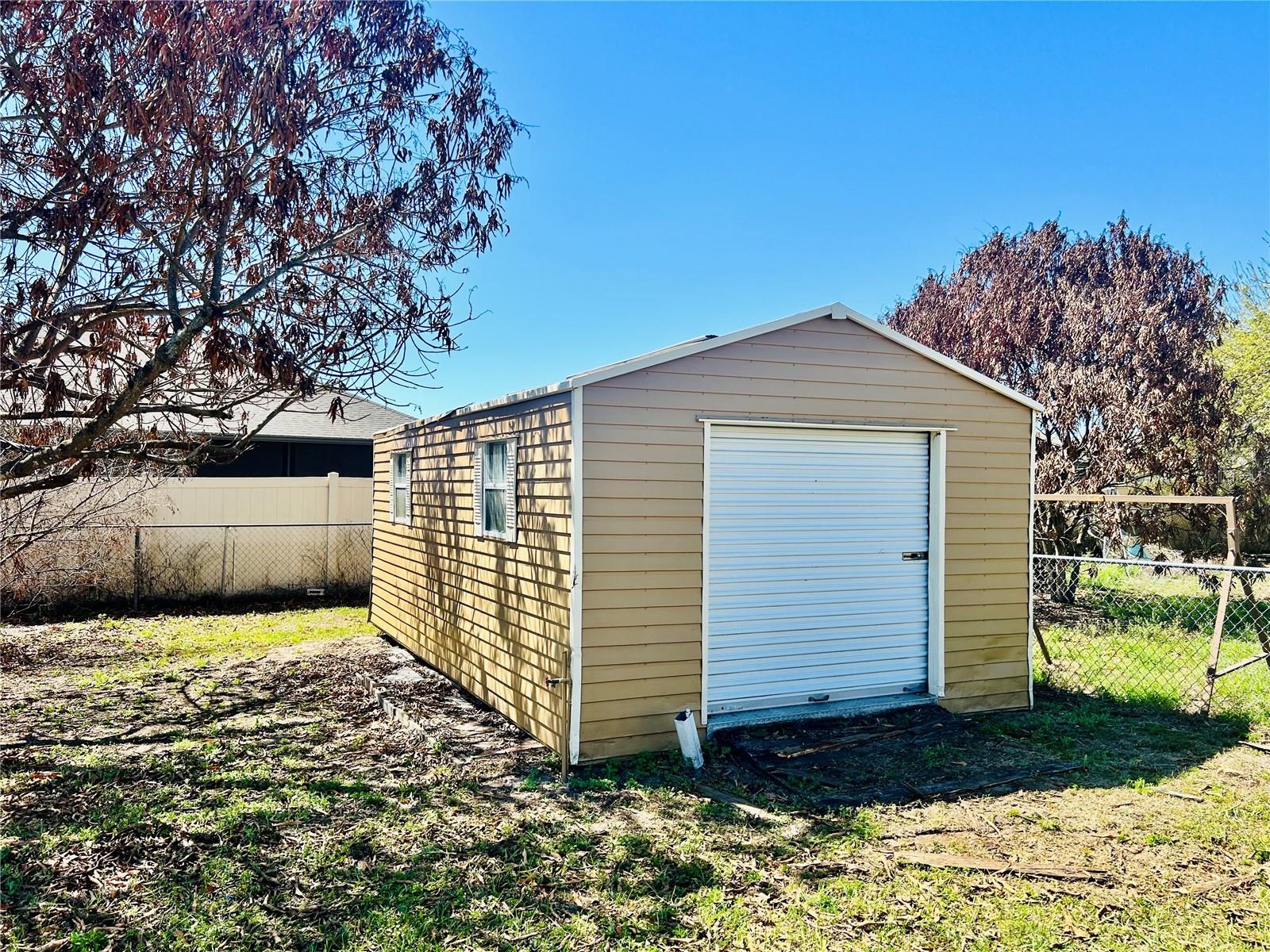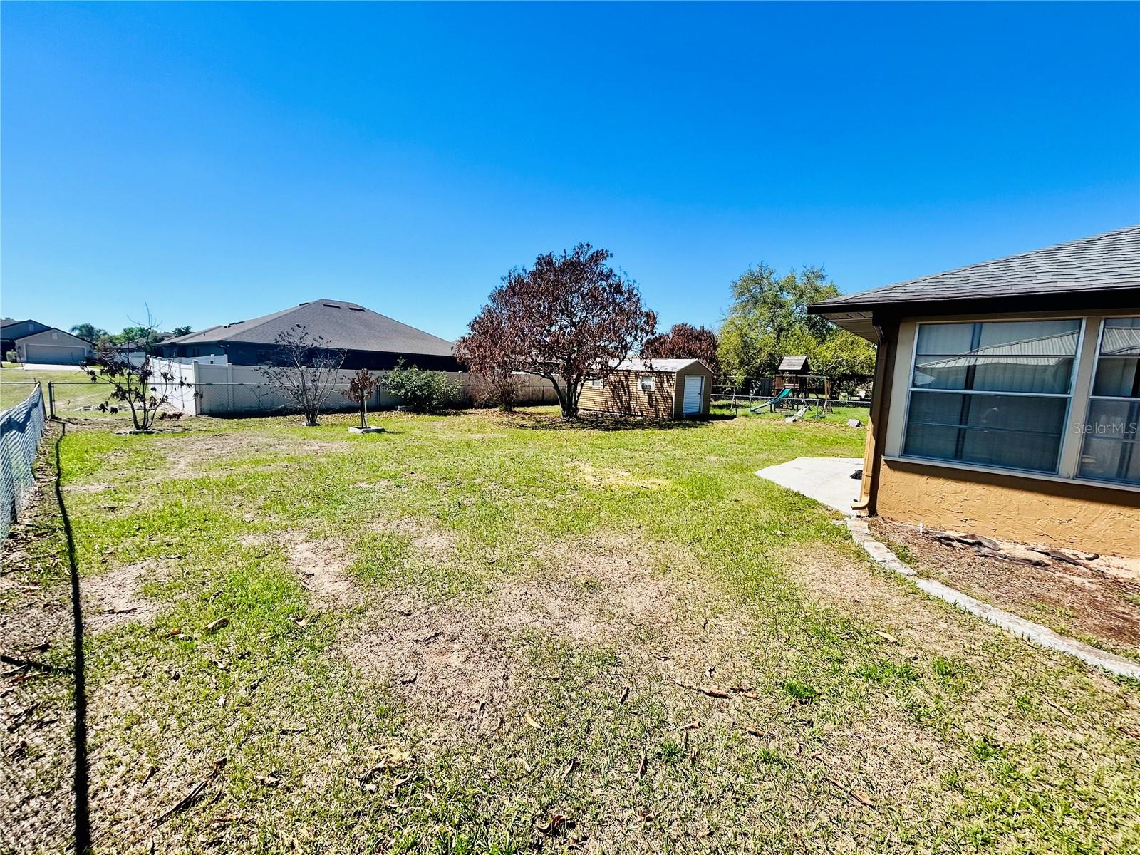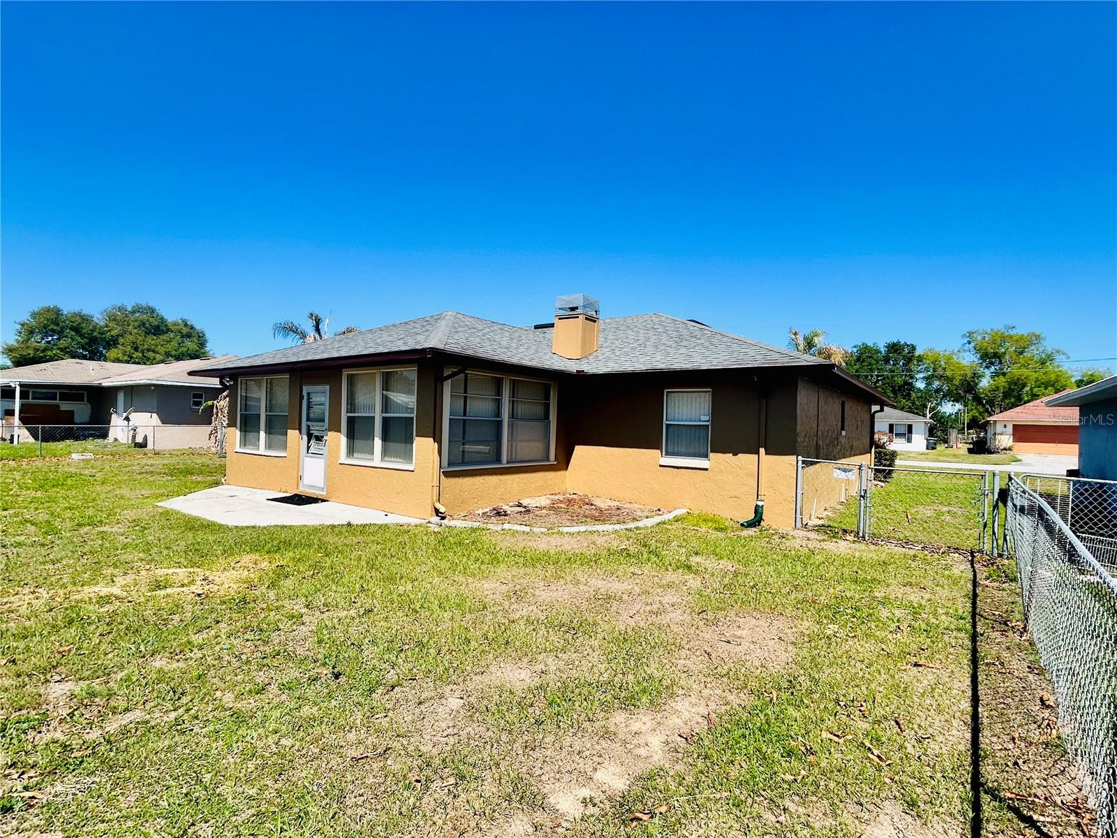 Welcome home! This home is move-in ready with no HOA. It features 3 spacious bedrooms, 2 bathrooms in a split floorplan, open kitchen/great room concept with vaulted ceilings, private dining, private office, interior laundry room and an enclosed Florida room with AC. There are 2 skylights in the kitchen/great room which provide much natural lighting throughout the main area of the home. The kitchen is equipped with all stainless steel appliances, which are included with the home. There is also an oversized kitchen island on wheels with storage which allows for different formations in the space. The great room is adorned with a large stone fireplace. The private dining room is elevated with chair-rails placed along all of the walls and a skylight to bring in natural lighting. The primary bedroom is spacious and includes a built-in vanity with sink along with a large walk-in closet that has built-in shelves. The private office faces the front of the home and is easily accessible to the main entrance. You can enjoy time in the carpeted Florida room with AC surrounded by windows that bring in the Florida sunlight. Bedrooms 2 and 3 share a hallway and a bathroom located right off of the great room area. The yard is enclosed with a metal fence and includes a workshop/shed. The entire home has been freshly painted and updated with hardwood floors throughout.