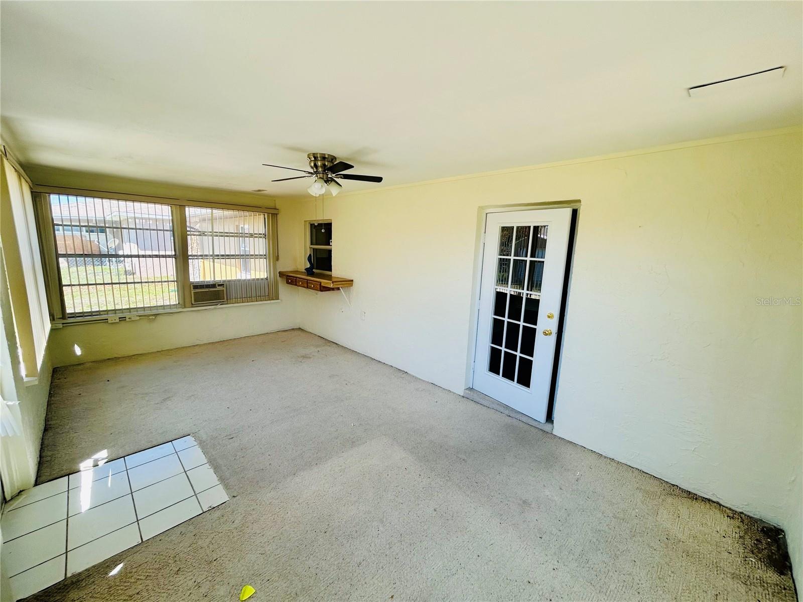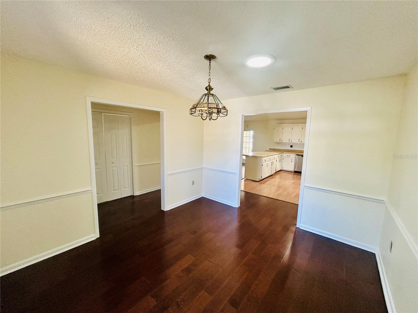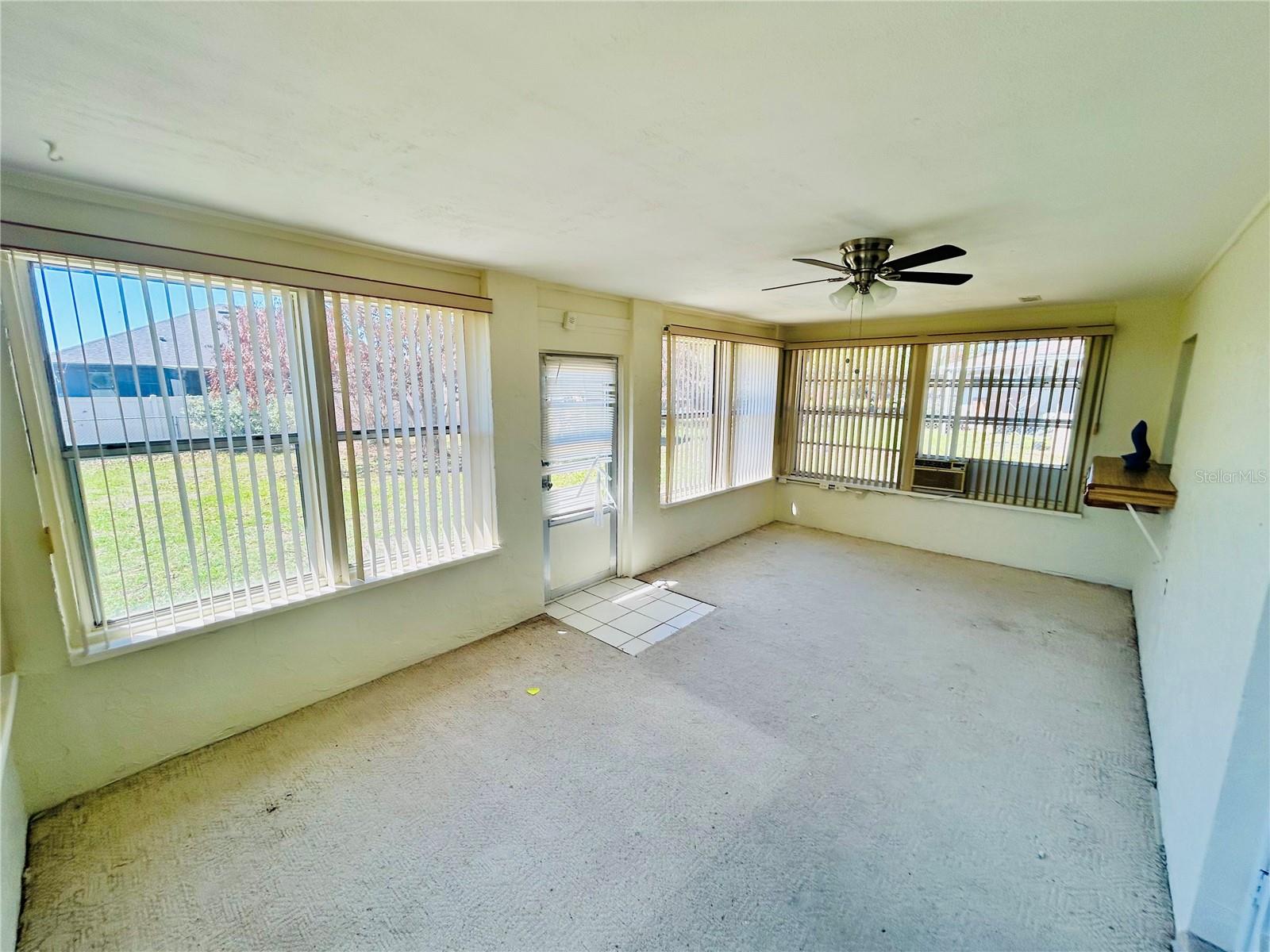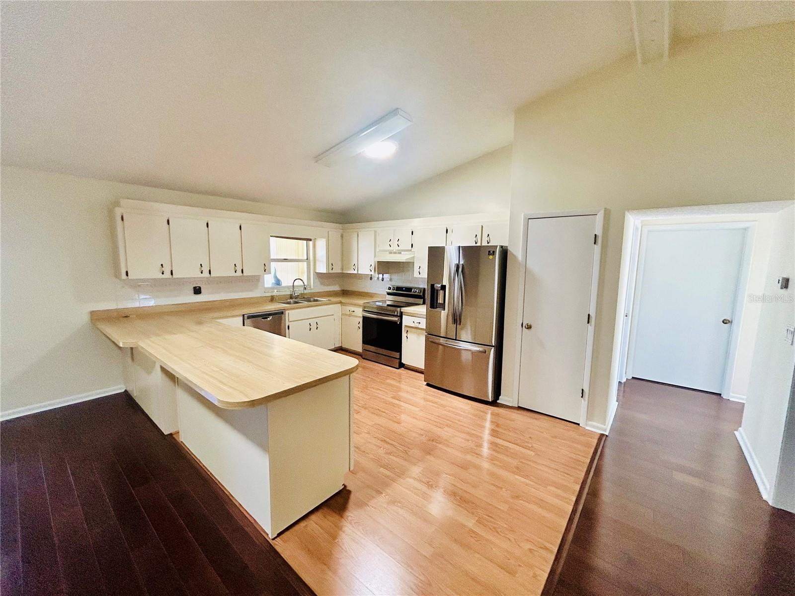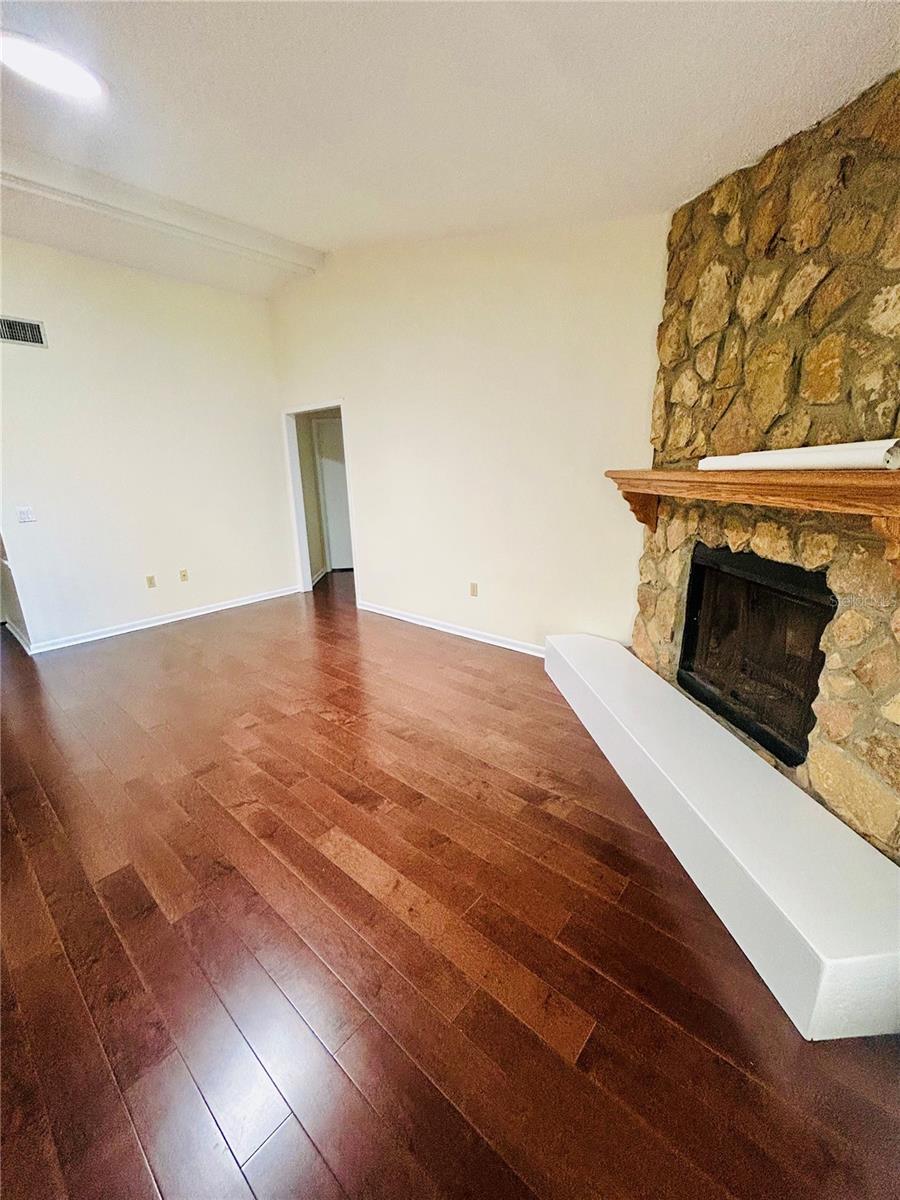 Welcome home! This home is move-in ready with no HOA. It features 3 spacious bedrooms, 2 bathrooms in a split floorplan, open kitchen/great room concept with vaulted ceilings, private dining, private office, interior laundry room and an enclosed Florida room with AC. There are 2 skylights in the kitchen/great room which provide much natural lighting throughout the main area of the home. The kitchen is equipped with all stainless steel appliances, which are included with the home. There is also an oversized kitchen island on wheels with storage which allows for different formations in the space. The great room is adorned with a large stone fireplace. The private dining room is elevated with chair-rails placed along all of the walls and a skylight to bring in natural lighting. The primary bedroom is spacious and includes a built-in vanity with sink along with a large walk-in closet that has built-in shelves. The private office faces the front of the home and is easily accessible to the main entrance. You can enjoy time in the carpeted Florida room with AC surrounded by windows that bring in the Florida sunlight. Bedrooms 2 and 3 share a hallway and a bathroom located right off of the great room area. The yard is enclosed with a metal fence and includes a workshop/shed. The entire home has been freshly painted and updated with hardwood floors throughout.