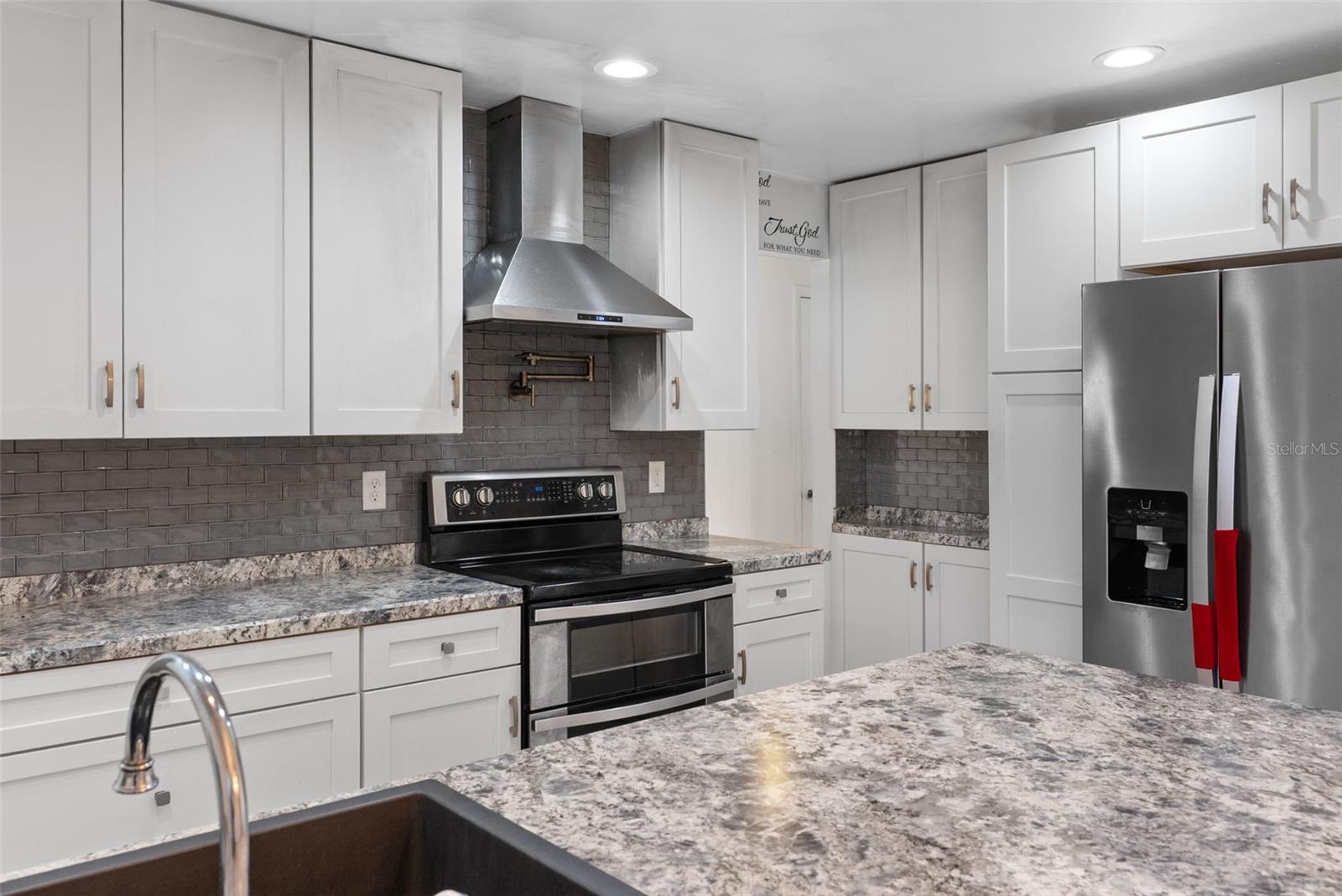 Well-maintained 4-bedroom, 2-bath home featuring a beautifully renovated kitchen with 42-inch cabinetry, stainless steel appliances, a hood ventilation system, and a double oven stove. The kitchen also includes soft-close drawers, a pull-out trash receptacle, and dishwasher hookup. The home offers ample storage throughout and a fireplace that adds warmth and character to the living space. The primary suite includes a custom walk-in closet and an en-suite bathroom with double sinks and a vanity. Additional exterior features include an awning and a detached storage shed. A thoughtfully updated property ready for its next owner.