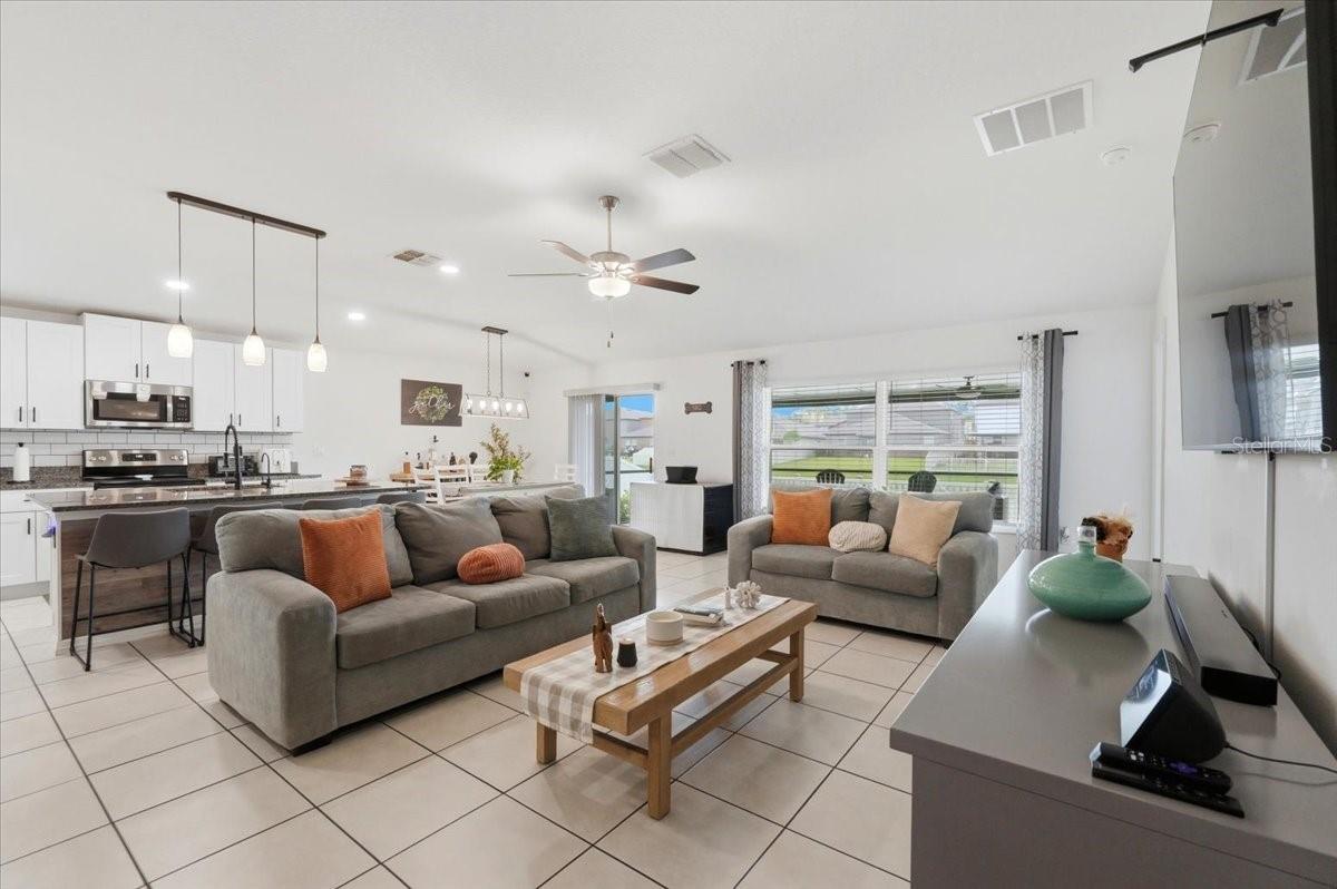 Welcome home to 1923 Red Loop, a stunning, nearly-new residence built in 2024 that perfectly blends modern comfort with peaceful waterfront living. Located in the desirable Saddle Creek Preserve community of Lakeland, this 4-bedroom home offers 1,936 square feet of meticulously upgraded living space designed for comfort and style. As you arrive, you’ll notice the freshly RE-SODDED FRONT YARD and a 2-car garage enhanced with a CAMERA KEYPAD and specialized outdoor lighting. Step through the front door, secured by a 2026 smart lock, and into an inviting open-concept interior featuring durable tile flooring with professionally stained grout completed in 2025. The gourmet kitchen is a true showstopper, featuring extensive 2025 upgrades: Subway tile backsplash paired with sleek all-black sink and cabinet hardware, halo lighting, and an accent light fixture; Modern water fixtures and a high-quality, RO FILTRATION system right at the sink. This space flows seamlessly into the dining room, where you can set the perfect mood with dimming lights and a farmhouse-style light fixture. Throughout the home, upgraded light fixtures and dimmers allow you to customize the ambiance of every room. The master suite serves as a private retreat, featuring a master bathroom upgraded in 2025 with mood lighting above the shower, black grout for a modern look, and new light fixtures above the mirrors. The additional bathrooms have also been refreshed with upgraded water and light fixtures. For peace of mind, the home is equipped with a comprehensive security system, including door and window alarm sensors and a monitored fire sensor. The true "favorite spot" of this home is the expansive outdoor living area, featuring a fully enclosed, screened patio area featuring ceiling fans and lights—the perfect quiet spot to gather with friends or enjoy some peace and quiet with a water view. Beyond the enclosure, you’ll find an additional paved area with a dedicated concrete BBQ slab, and a PVC privacy fence enclosing the yard. The property faces the water, where catch-and-release fishing is allowed right in your own backyard. Around the side, out of view of the backyard, is a concrete slab that holds a newly-installed shed for all your storage needs. Also included is a desirable new WATER SOFTENER system, located inside the garage to avoid weathering. Living in Saddle Creek Preserve means access to a community pool, dog park, walking paths, and hiking trails, all for a very low HOA fee of $225 annually. You are within walking distance of the local high school and minutes from shopping and major highways, providing easy access to both Tampa and Orlando. Only 15 minute drive away is downtown Lakeland, which hosts a farmer's market every weekend and features beautiful water views, delicious foodie offerings, and local charm. This move-in-ready home is still under warranty for major appliances, offering the security of a new build with the custom upgrades of a forever home.