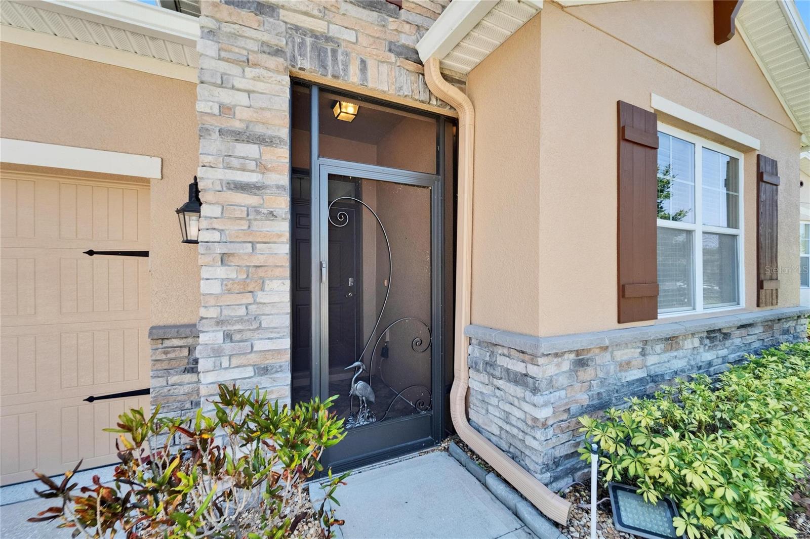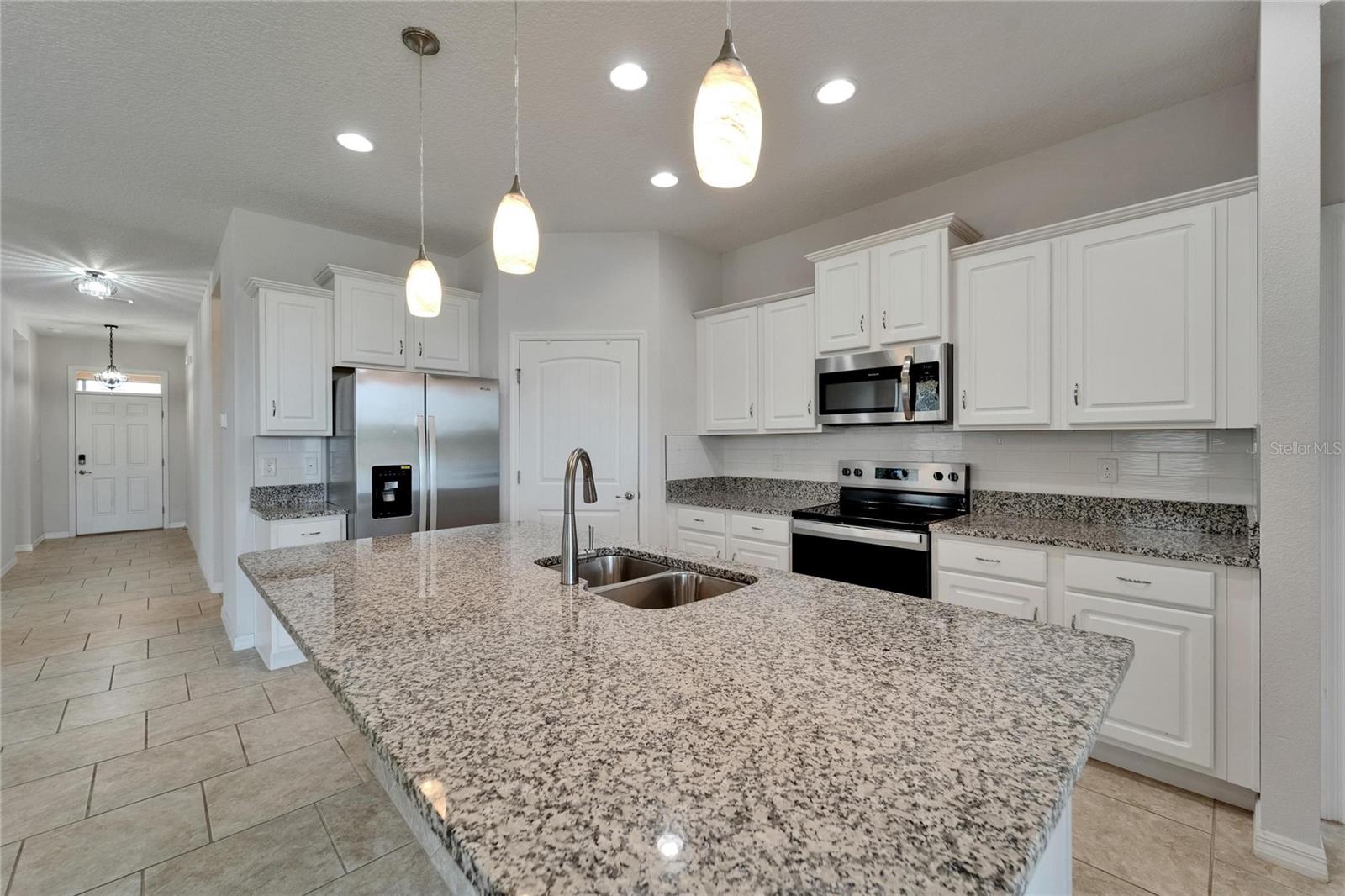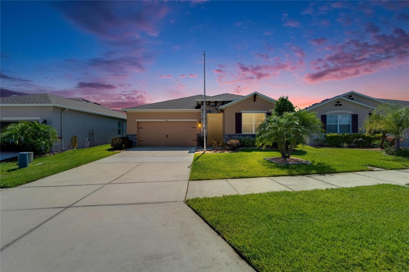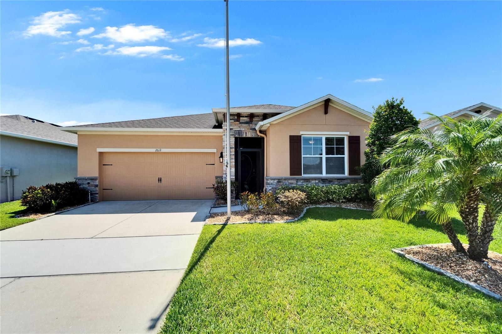 Welcome to your new Florida home in the beautiful, gated 55+ community of Heritage Landings in South Lakeland! This well-maintained residence offers easy access to the Polk Parkway, making it convenient for commuting to Tampa, Orlando, and nearby beaches. The home boasts stunning curb appeal with its stone-front exterior and meticulously landscaped yard. Inside, the open floor plan is bright and welcoming, featuring tile flooring throughout — no carpet for easy maintenance and a sleek, modern look. The updated kitchen includes white cabinetry, granite countertops, and stainless steel appliances. The refrigerator and range are brand new, while the remaining appliances are also stainless steel. The walk-in pantry offers custom shelving, and the peninsula wall is beautifully tiled, enhancing the overall aesthetic and functionality. The great room design provides relaxing views of the pond and conservation area, with sliders leading to a 12x9 screened-in lanai with brick pavers, perfect for enjoying the outdoors in privacy with no rear neighbors. The master suite is located at the back of the home and features two walk-in closets, a spacious master bath with dual sinks, a glass-enclosed shower, and a separate water closet. The secondary bedroom is situated at the front of the home, and there is also a flex space/den/third bedroom enclosed with double glass doors. Additional features include a laundry room with extra cabinetry and tile accents, an epoxy-coated garage floor, and a drop station by the garage entrance for convenience. Residents of Heritage Landings enjoy a resort-style pool, pickleball courts, clubhouse, and fitness center, with lawn maintenance included in the gated section. Located close to doctors’ offices, shopping, theaters, and restaurants, this home offers comfort, convenience, and luxury living in a desirable community.