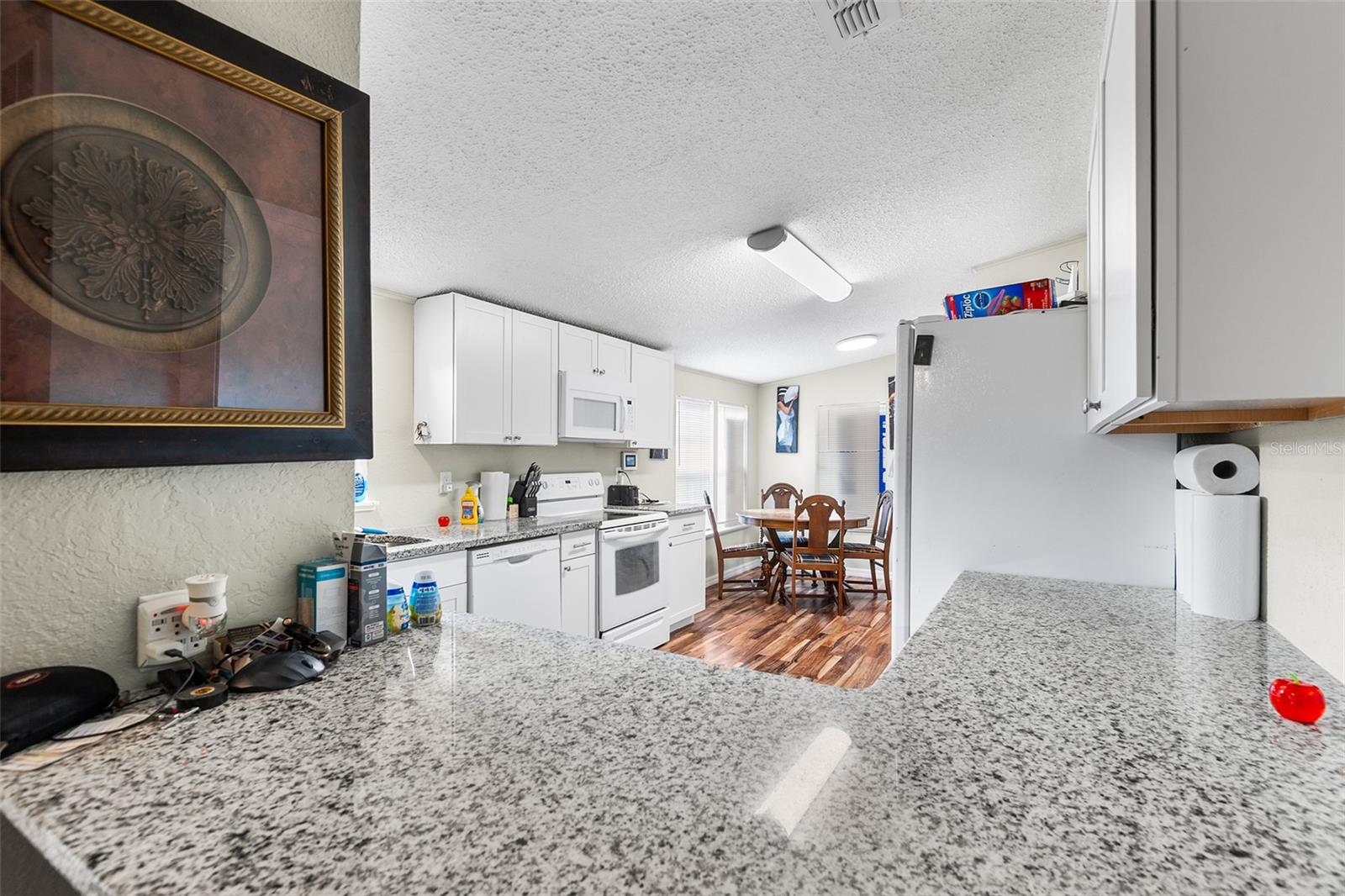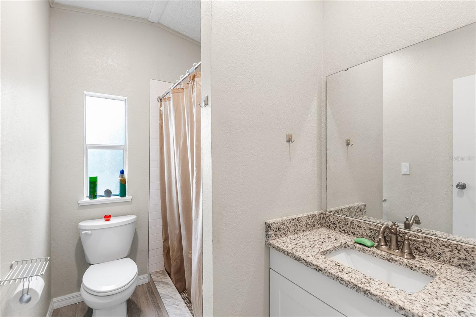 Check out this move-in ready 3-bedroom, 2-bath manufactured home, situated on an oversized lot with a detached garage and convenient parking pad. Inside, vaulted ceilings create a bright and airy atmosphere, while wood-look vinyl flooring adds warmth and durability throughout. The galley-style kitchen offers both function and style, featuring granite countertops, shaker-style cabinets, ample storage, an eating area, and a breakfast bar—perfect for casual dining. The open-concept living and dining spaces are ideal for entertaining and everyday comfort. The spacious primary bedroom includes an updated en suite bathroom with granite counters and porcelain tile, offering a relaxing retreat. The additional bedrooms and bath are equally well-appointed with matching finishes. Enjoy your mornings on the covered side porch overlooking the shady yard and mature landscaping—an ideal spot to unwind with a cup of coffee. Don’t miss the opportunity to make this home your own. Schedule your private showing today!