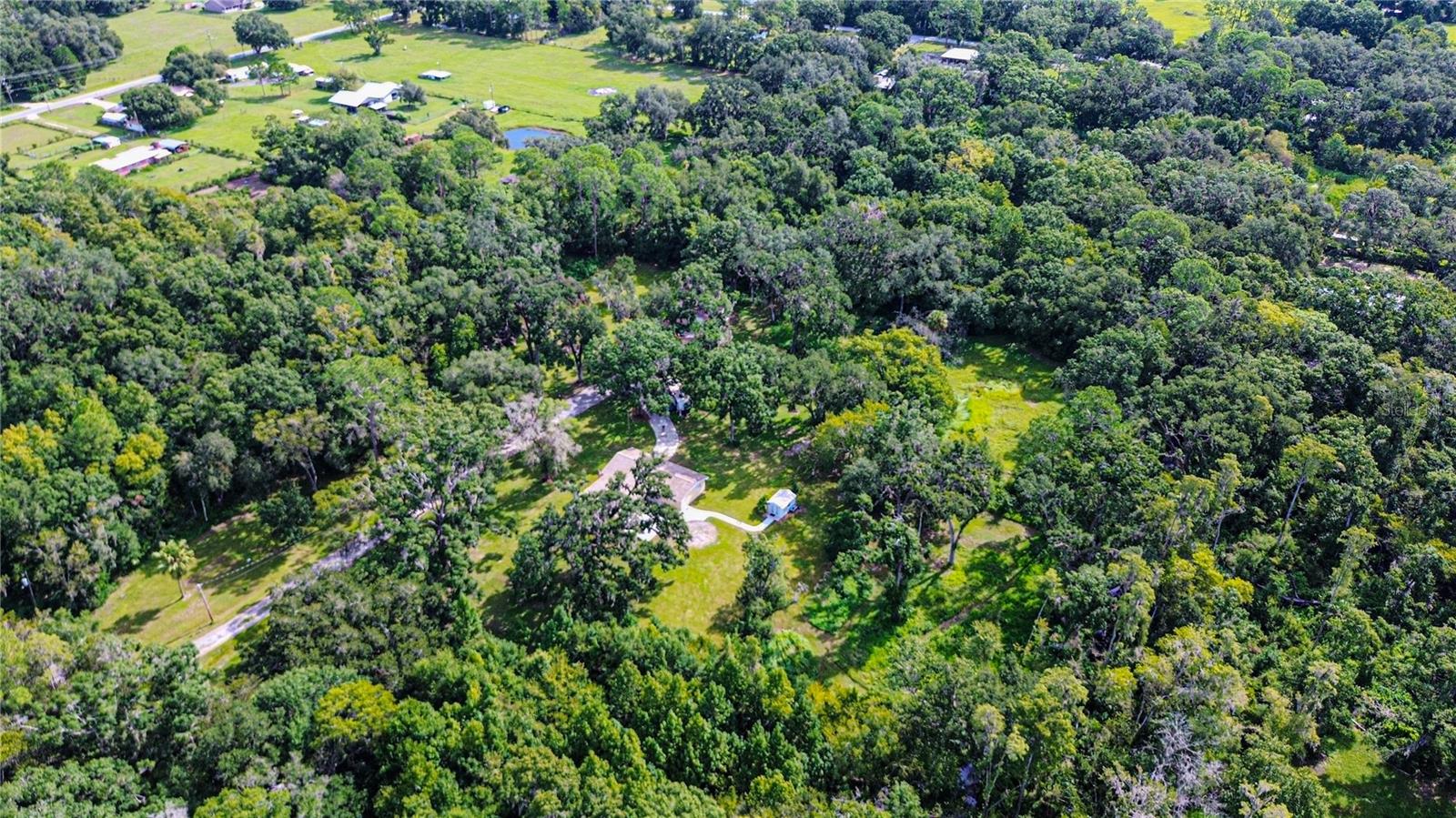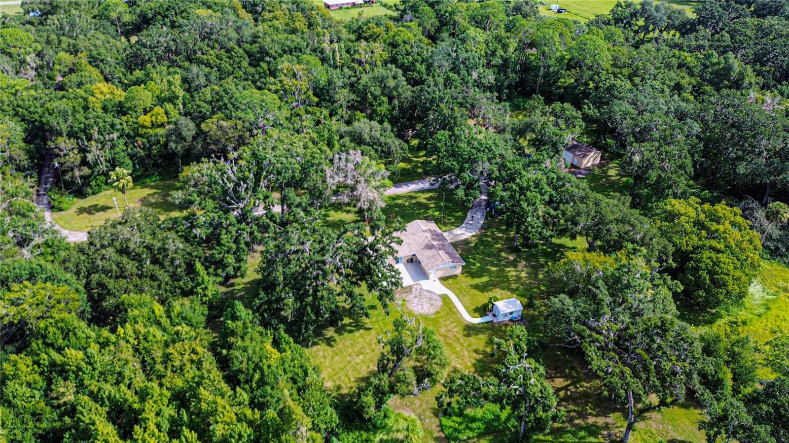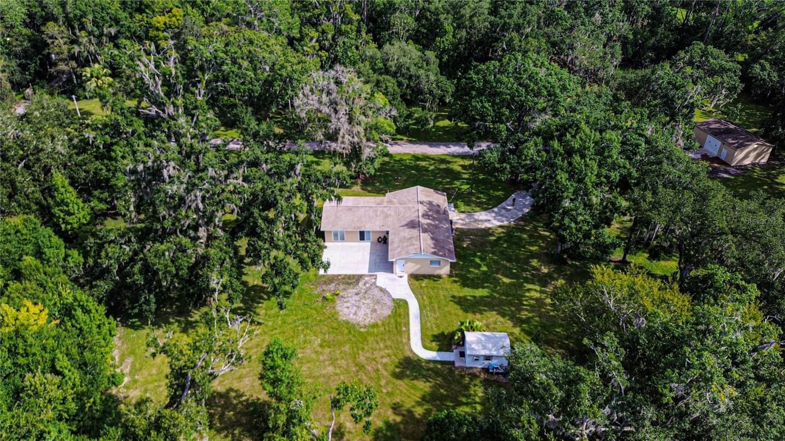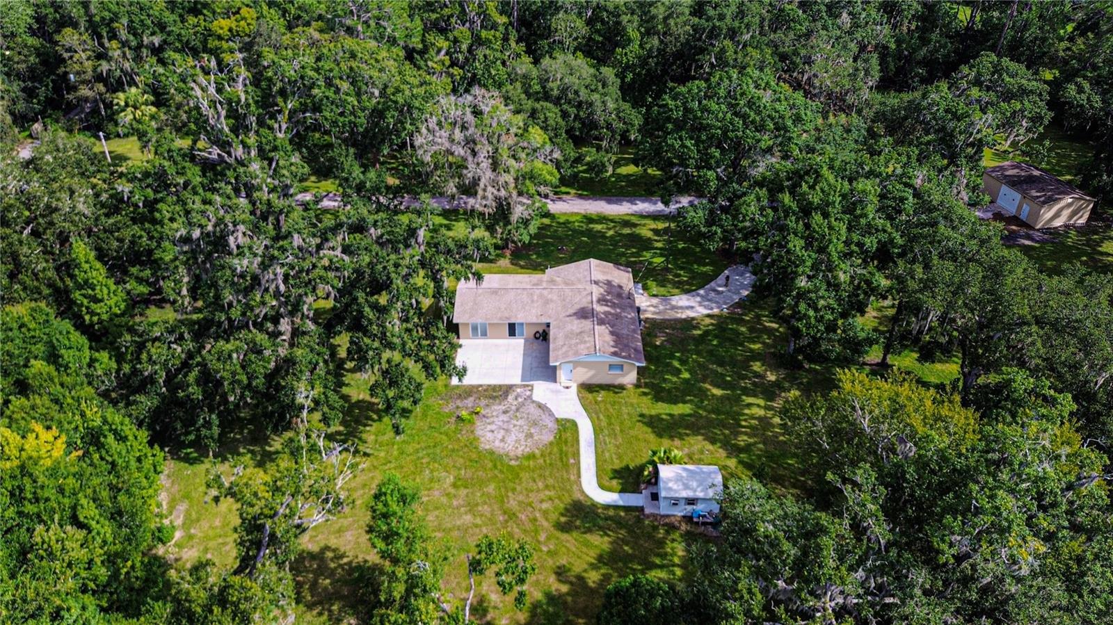 Discover the perfect balance of peace and convenience with this one-of-a-kind property! Nestled on 5.43 acres of stunning land, this home offers the tranquility of country living while keeping you just minutes from major highways, shopping centers, and everyday essentials. This exceptional property is framed by towering oak trees, including a magnificent centuries-old oak that greets you at the entrance—a living landmark that sets the tone for the peace and history found here. Inside, the home shines with brand-new porcelain tile floors (2025) throughout and a designer-updated kitchen boasting black stainless appliances, generous counter space, and plenty of storage. The formal dining room is spacious and inviting, with sliding glass doors that open to tranquil backyard views. The primary suite offers a peaceful escape with its en-suite bath and large walk-in closet, while two additional bedrooms and a full bath sit privately on the opposite side of the home. Recent updates provide comfort and peace of mind: the A/C units for both the home and mancave were replaced in 2025, along with the water heater (2025), ensuring efficient, worry-free living. Outside, the property is full of surprises. The insulated “man cave” workshop is fully equipped with new AC (2025), a dehumidifier, abundant storage, and workspace, plus a double-door entry measuring 9 ft tall by 10 ft wide—perfect for projects big or small. A cozy “she shed” offers another private escape, while the expansive outdoor patio is the perfect place to relax and take in the sights and sounds of nature. Deer, wild turkey, and owls often wander the property, adding to its serene charm. And the best part? No HOA! With 5.43 acres of usable land, you’re free to bring your RV, horses, toys, and animals. A 1hp submersible well pump ensures you’ll always have more than enough water—truly, “enough to service a small village.” You’ll also find many old-growth camphor trees, long leaf pines, camphor, cypress, and native (wild) FL orange trees, and an abundance of large shade trees, which not only add beauty and character but also naturally help keep mosquitoes at bay. This property is a rare find—a home, a retreat, and a piece of history all in one. Here, every oak and camphor tree has a story, and now it’s ready to be part of yours.