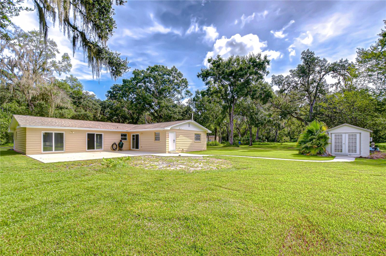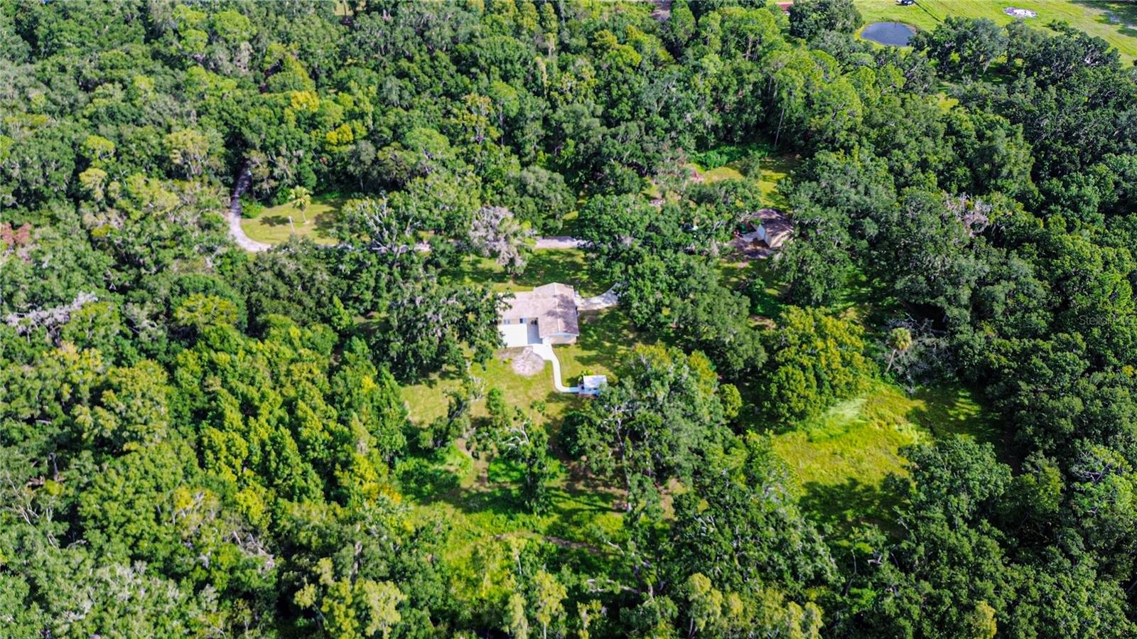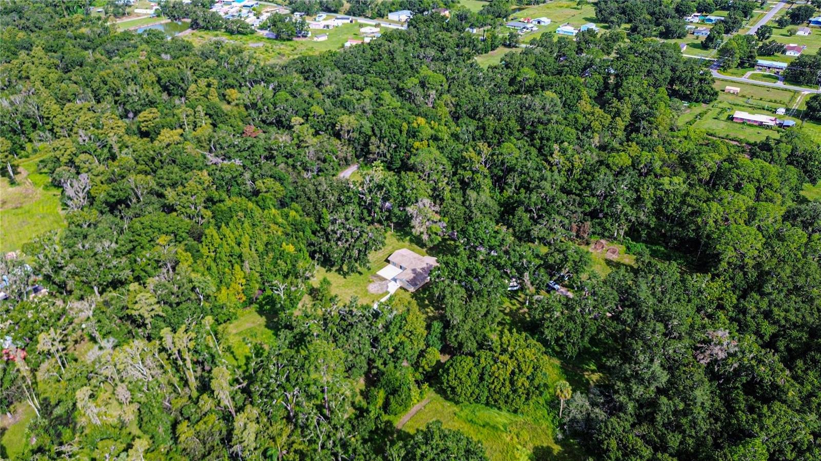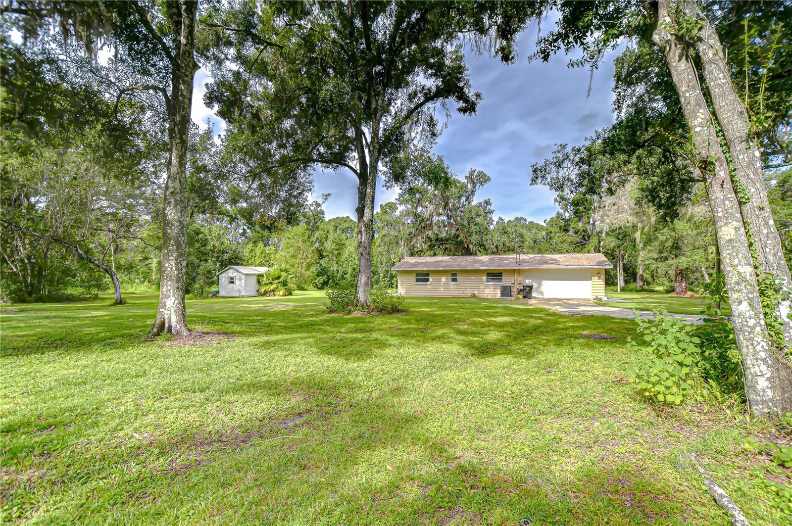 Discover the perfect balance of peace and convenience with this one-of-a-kind property! Nestled on 5.43 acres of stunning land, this home offers the tranquility of country living while keeping you just minutes from major highways, shopping centers, and everyday essentials. This exceptional property is framed by towering oak trees, including a magnificent centuries-old oak that greets you at the entrance—a living landmark that sets the tone for the peace and history found here. Inside, the home shines with brand-new porcelain tile floors (2025) throughout and a designer-updated kitchen boasting black stainless appliances, generous counter space, and plenty of storage. The formal dining room is spacious and inviting, with sliding glass doors that open to tranquil backyard views. The primary suite offers a peaceful escape with its en-suite bath and large walk-in closet, while two additional bedrooms and a full bath sit privately on the opposite side of the home. Recent updates provide comfort and peace of mind: the A/C units for both the home and mancave were replaced in 2025, along with the water heater (2025), ensuring efficient, worry-free living. Outside, the property is full of surprises. The insulated “man cave” workshop is fully equipped with new AC (2025), a dehumidifier, abundant storage, and workspace, plus a double-door entry measuring 9 ft tall by 10 ft wide—perfect for projects big or small. A cozy “she shed” offers another private escape, while the expansive outdoor patio is the perfect place to relax and take in the sights and sounds of nature. Deer, wild turkey, and owls often wander the property, adding to its serene charm. And the best part? No HOA! With 5.43 acres of usable land, you’re free to bring your RV, horses, toys, and animals. A 1hp submersible well pump ensures you’ll always have more than enough water—truly, “enough to service a small village.” You’ll also find many old-growth camphor trees, long leaf pines, camphor, cypress, and native (wild) FL orange trees, and an abundance of large shade trees, which not only add beauty and character but also naturally help keep mosquitoes at bay. This property is a rare find—a home, a retreat, and a piece of history all in one. Here, every oak and camphor tree has a story, and now it’s ready to be part of yours.