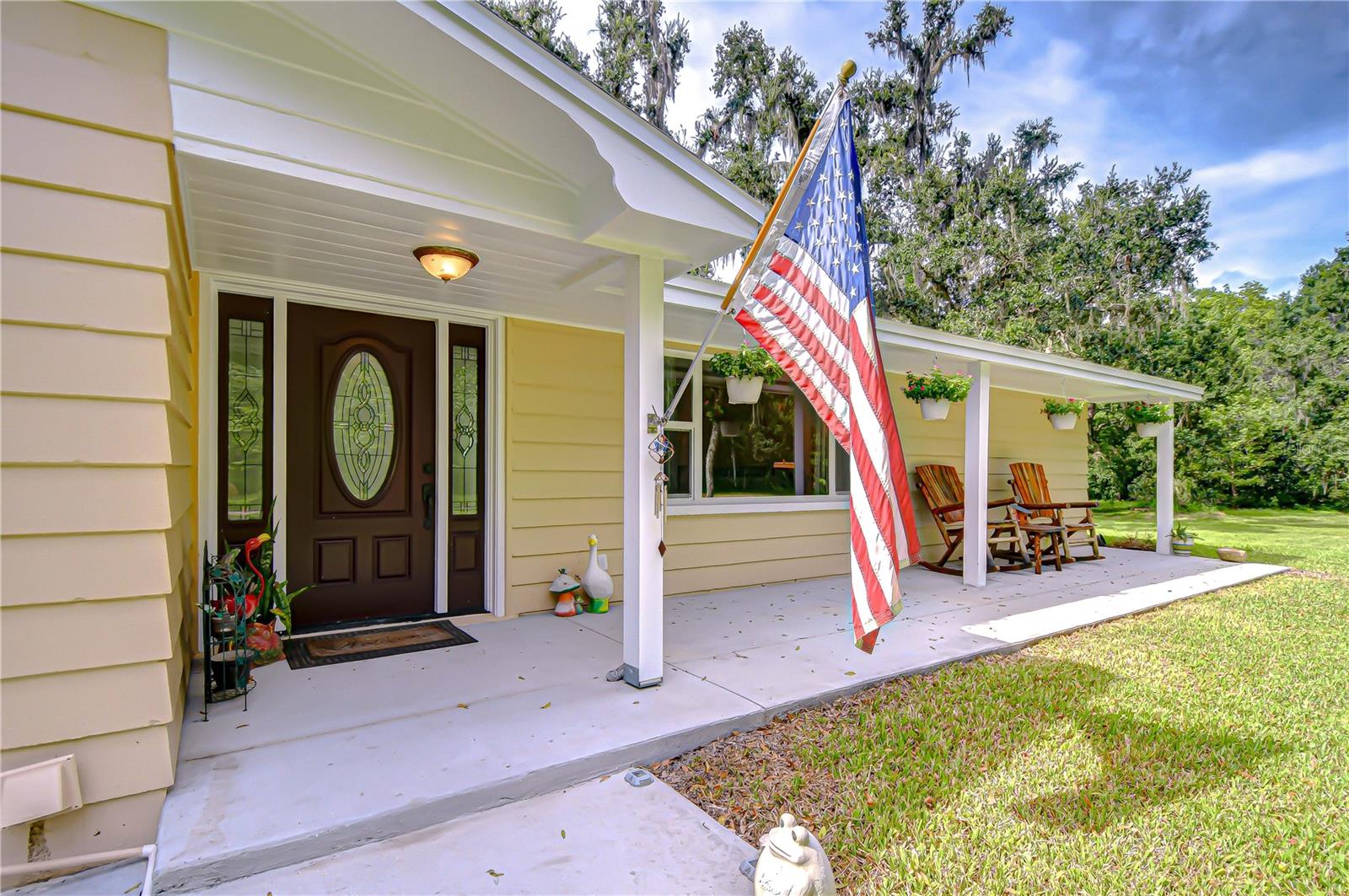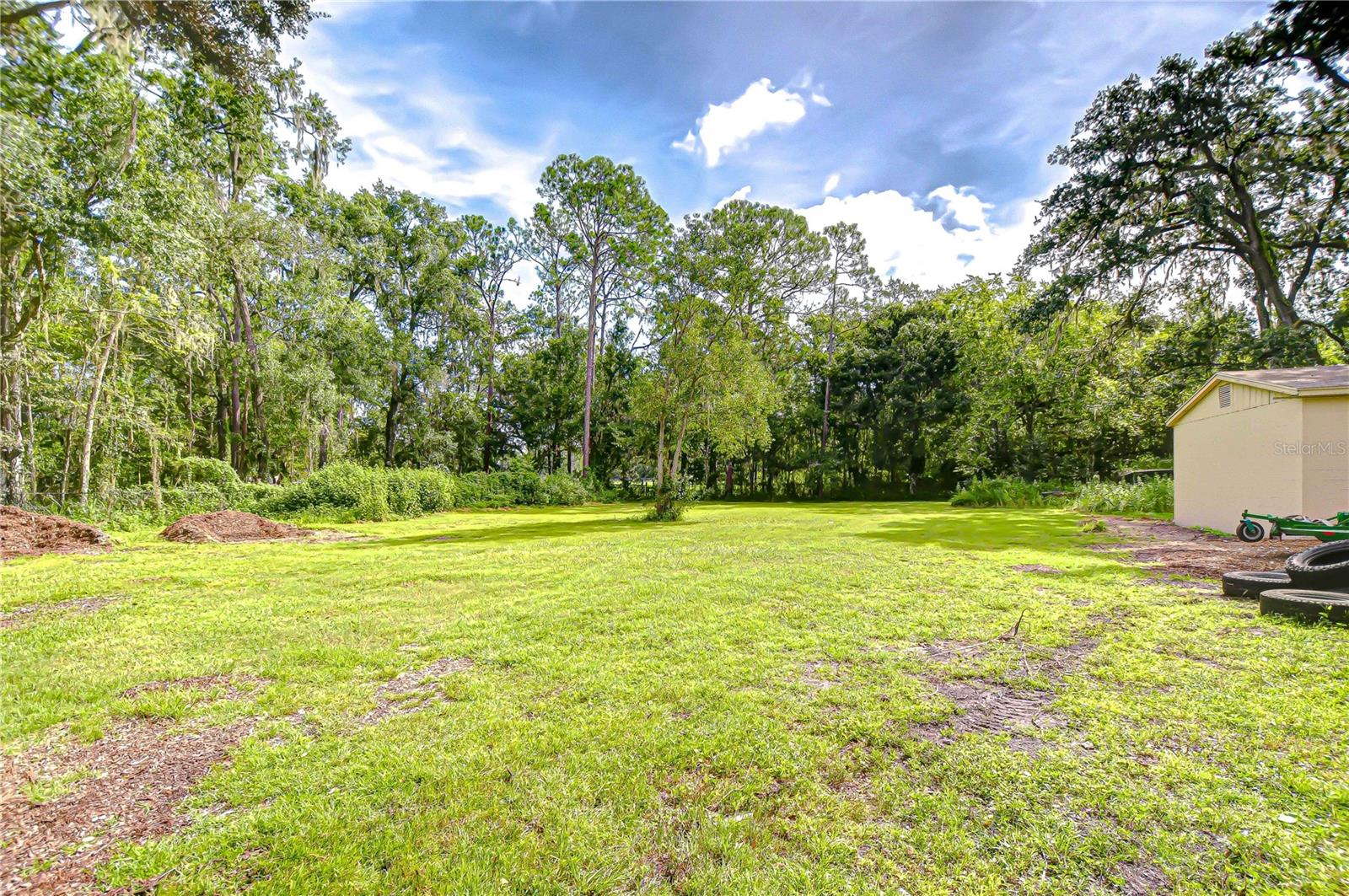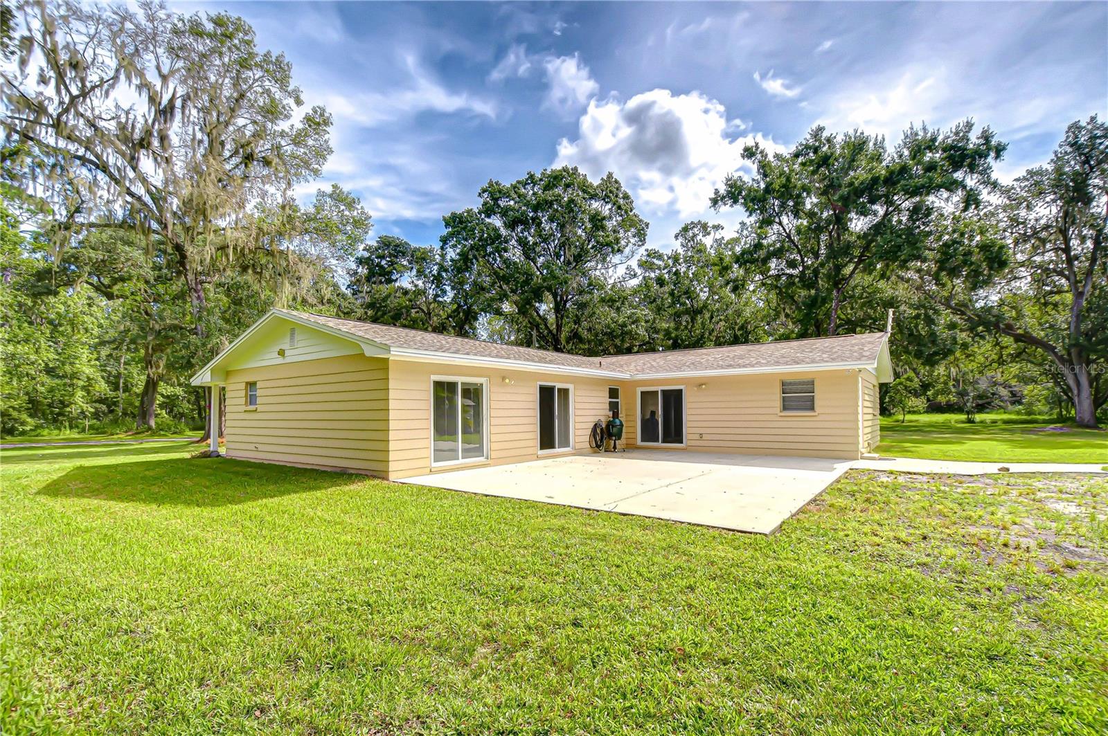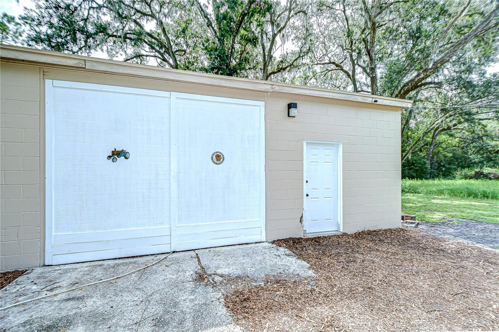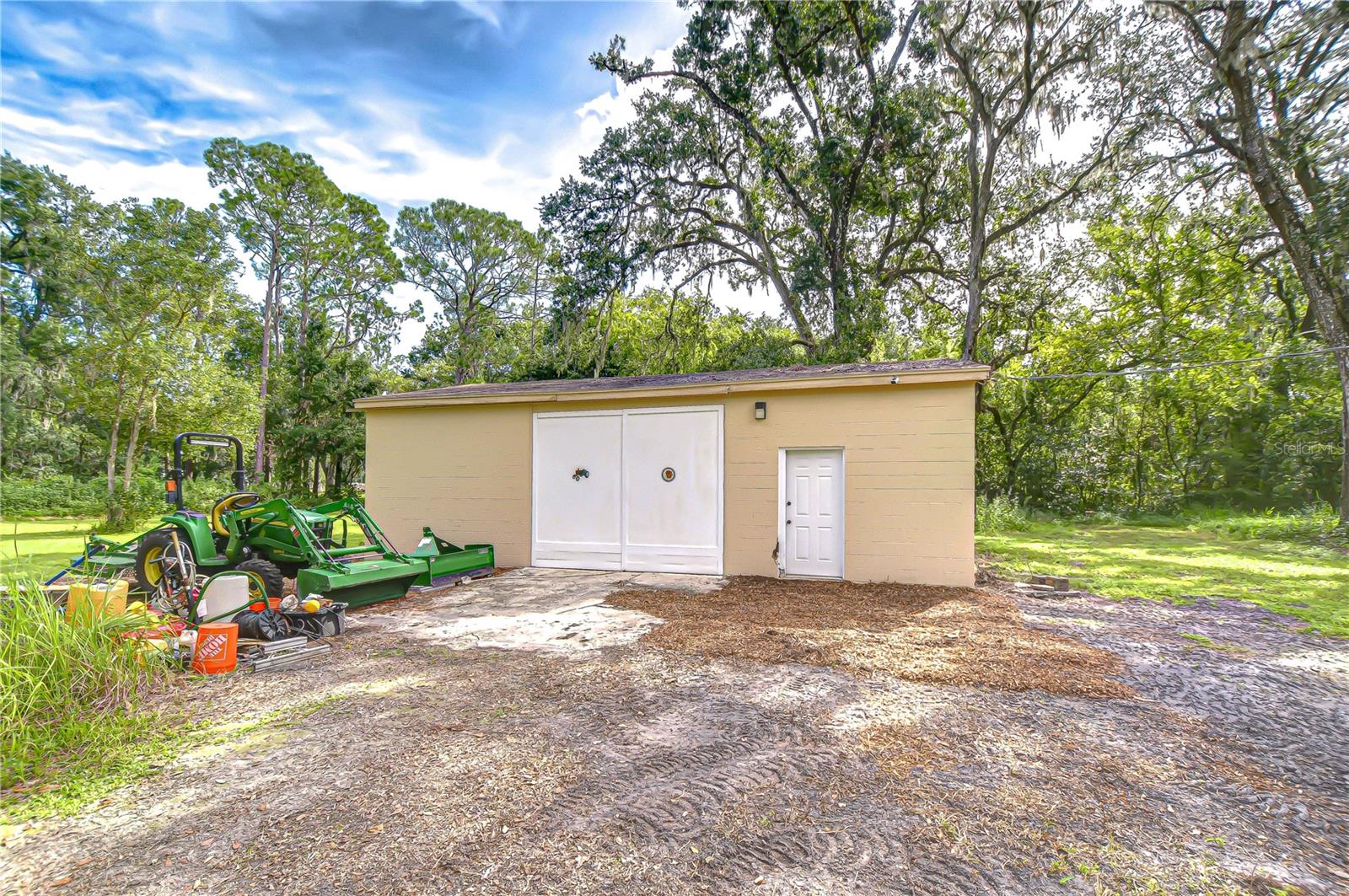 Discover the perfect balance of peace and convenience with this one-of-a-kind property! Nestled on 5.43 acres of stunning land, this home offers the tranquility of country living while keeping you just minutes from major highways, shopping centers, and everyday essentials. This exceptional property is framed by towering oak trees, including a magnificent centuries-old oak that greets you at the entrance—a living landmark that sets the tone for the peace and history found here. Inside, the home shines with brand-new porcelain tile floors (2025) throughout and a designer-updated kitchen boasting black stainless appliances, generous counter space, and plenty of storage. The formal dining room is spacious and inviting, with sliding glass doors that open to tranquil backyard views. The primary suite offers a peaceful escape with its en-suite bath and large walk-in closet, while two additional bedrooms and a full bath sit privately on the opposite side of the home. Recent updates provide comfort and peace of mind: the A/C units for both the home and mancave were replaced in 2025, along with the water heater (2025), ensuring efficient, worry-free living. Outside, the property is full of surprises. The insulated “man cave” workshop is fully equipped with new AC (2025), a dehumidifier, abundant storage, and workspace, plus a double-door entry measuring 9 ft tall by 10 ft wide—perfect for projects big or small. A cozy “she shed” offers another private escape, while the expansive outdoor patio is the perfect place to relax and take in the sights and sounds of nature. Deer, wild turkey, and owls often wander the property, adding to its serene charm. And the best part? No HOA! With 5.43 acres of usable land, you’re free to bring your RV, horses, toys, and animals. A 1hp submersible well pump ensures you’ll always have more than enough water—truly, “enough to service a small village.” You’ll also find many old-growth camphor trees, long leaf pines, camphor, cypress, and native (wild) FL orange trees, and an abundance of large shade trees, which not only add beauty and character but also naturally help keep mosquitoes at bay. This property is a rare find—a home, a retreat, and a piece of history all in one. Here, every oak and camphor tree has a story, and now it’s ready to be part of yours.